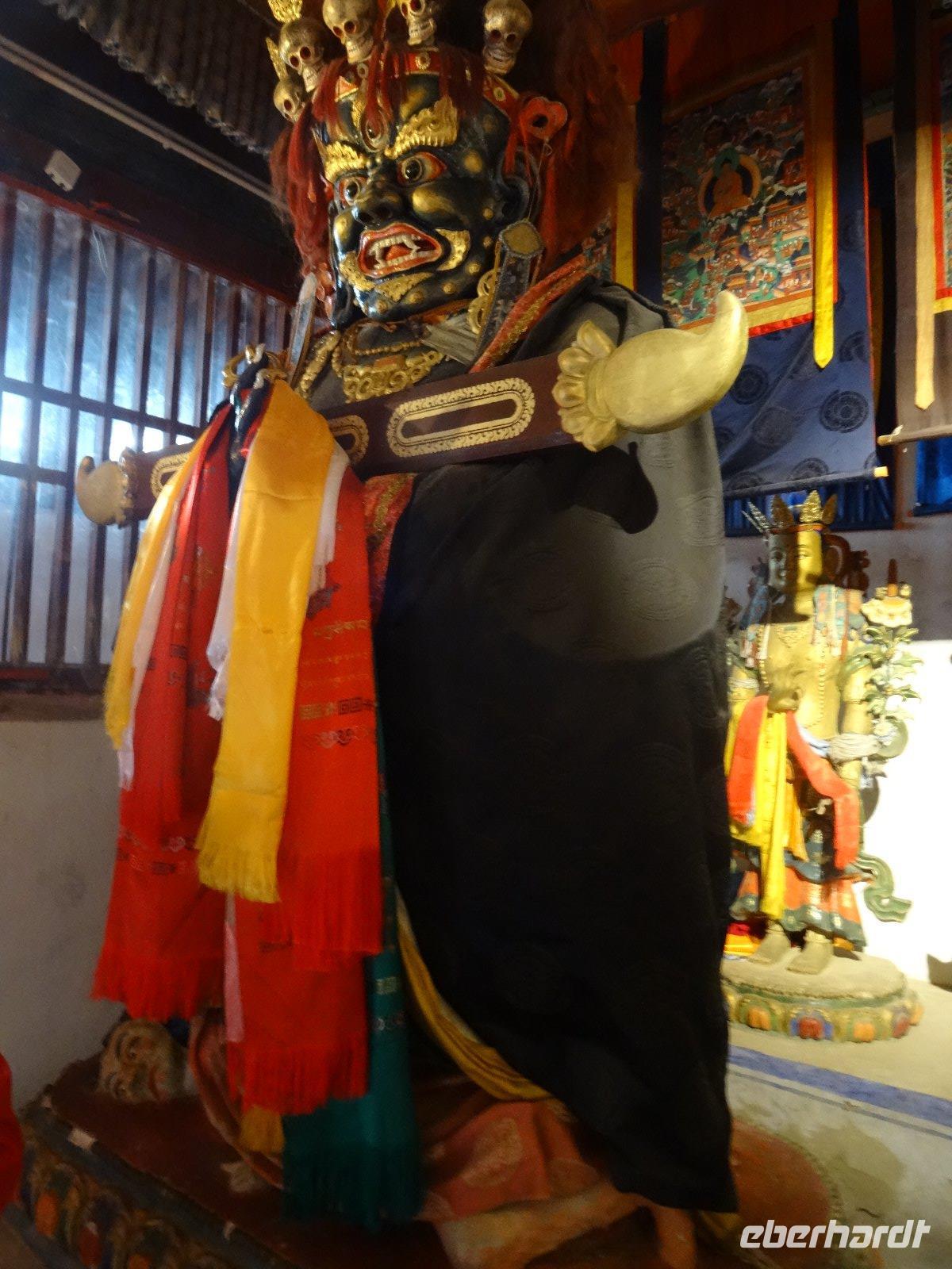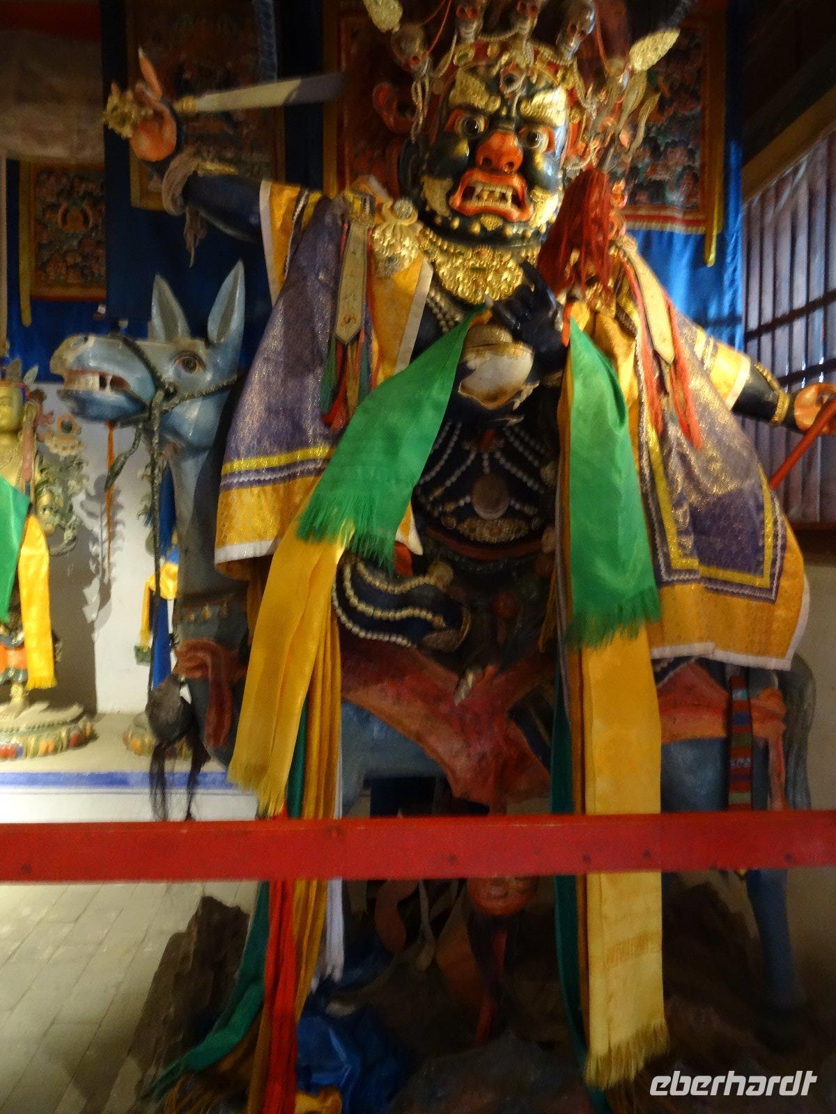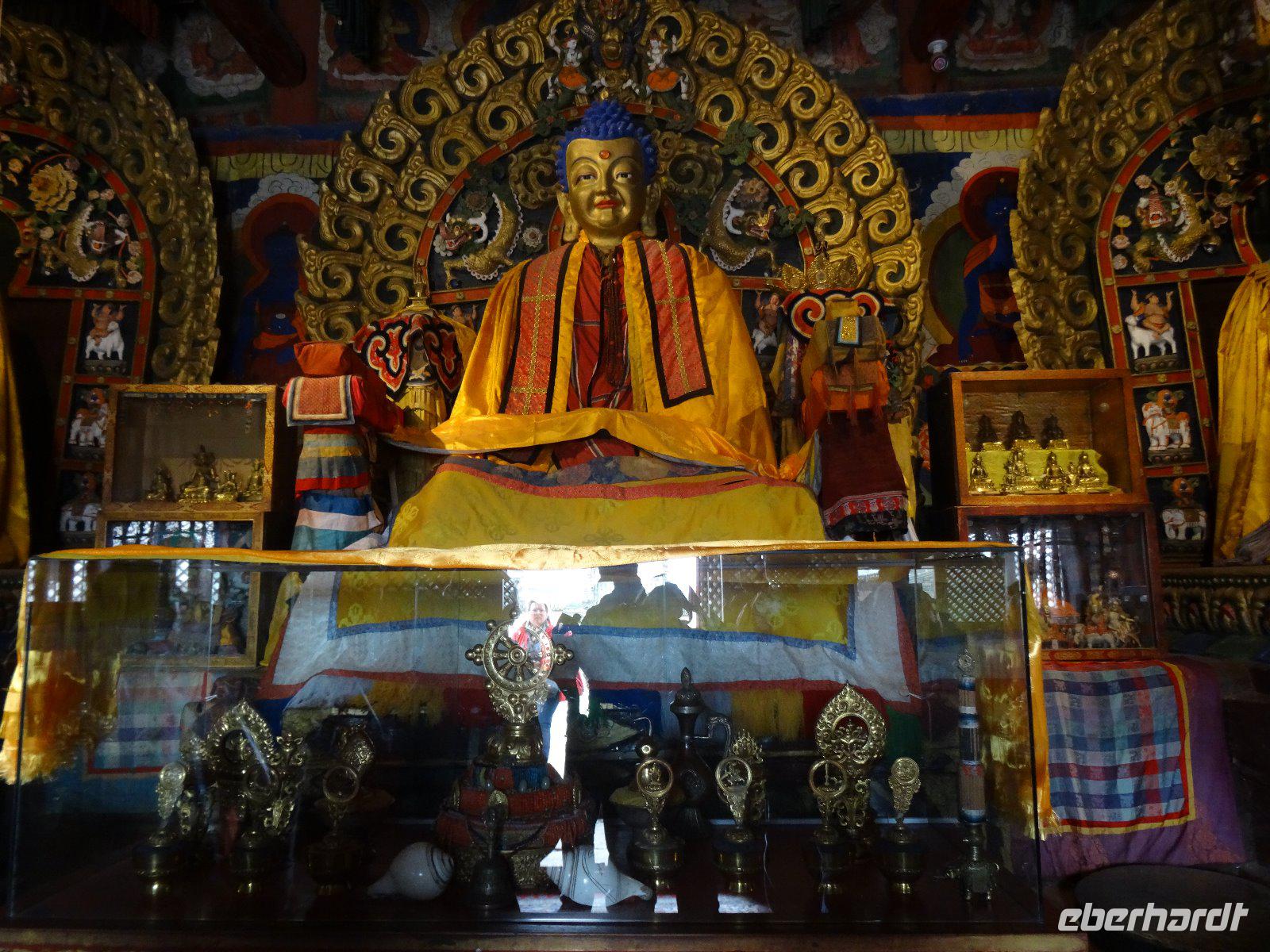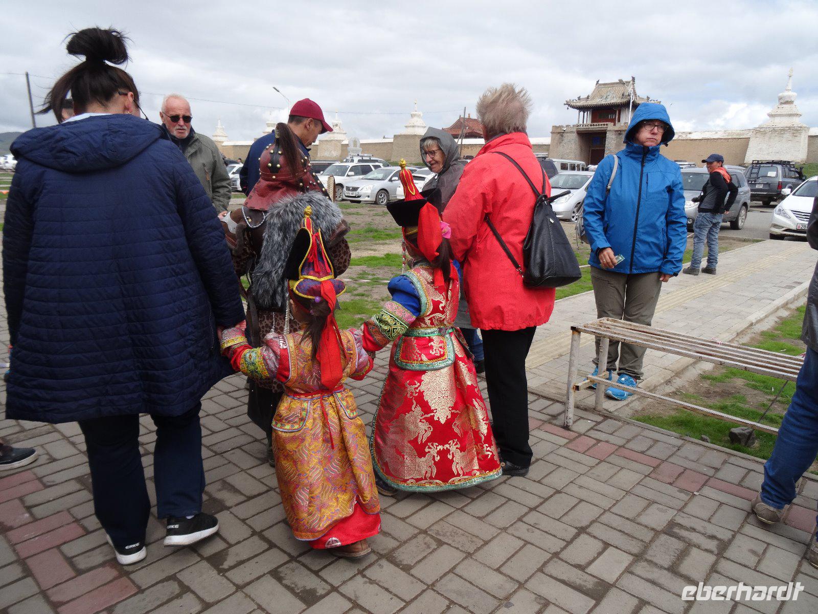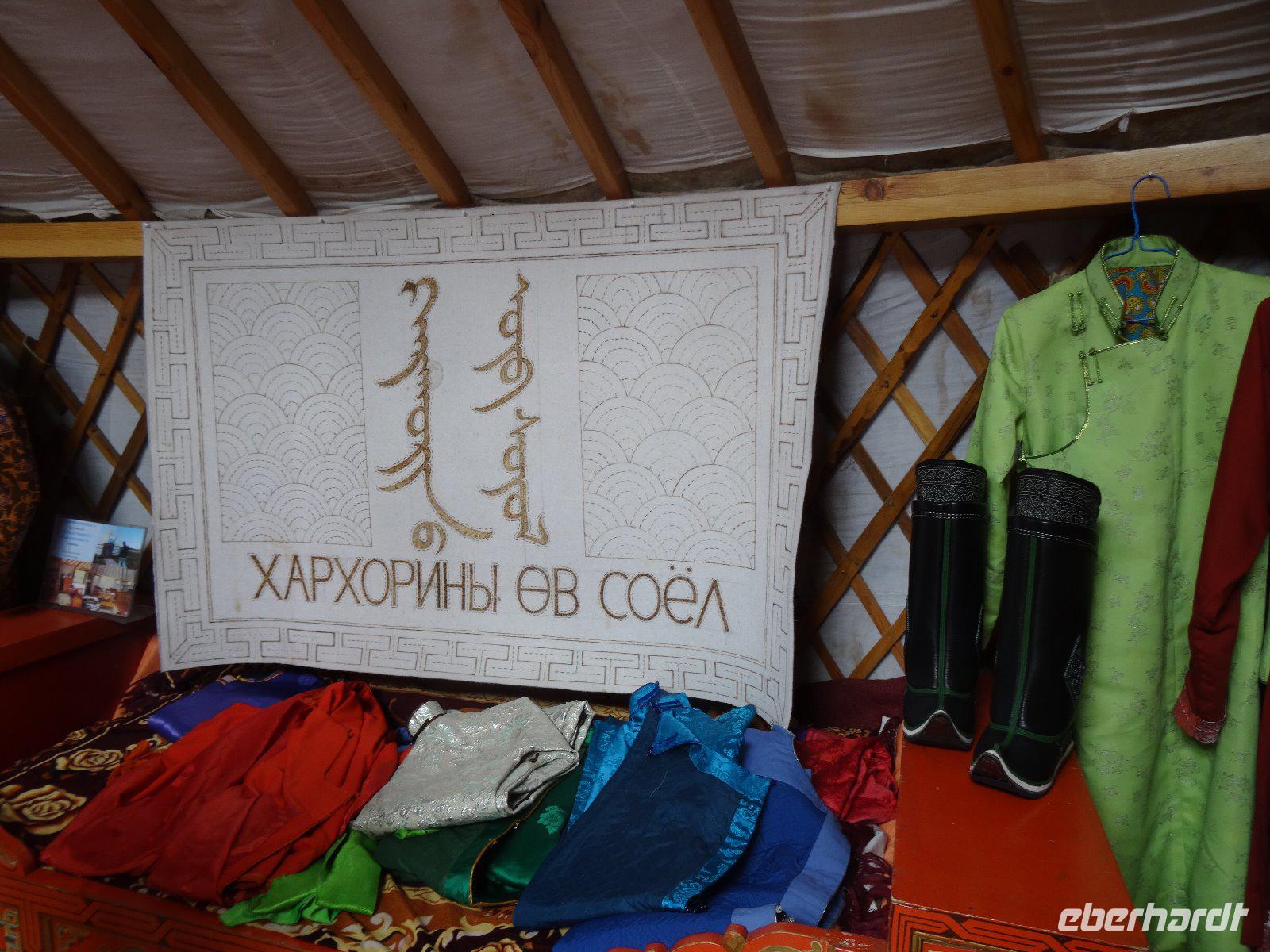 Da wir zwei Nächte in diesem Camp bleiben, starten wir heute ganz unbeschwert ohne Gepäck zur Fahrt in die nahegelegene Stadt Charchorin. Sie befindet sich neben der Stelle, an der zwischen 1235 und 1260 die Hauptstadt Karakorum von Dschingis Khans Mongolenreich lag. Die Stadt stand am Fluss Orchon, der Lebensader der ansonsten sehr wasserarmen Region. Für die Mongolen ist hier die Keimzelle ihres Landes und im Museum können wir das auch sehen. Es gibt hier Informationen zur Enwicklung des Mongolenreiches unter den Enkeln Dschingis Khans und die Einführung des Buddhismus als Staatsreligion. Archäologische Ausgrabungen belegen die Existenz eines Handwerkerviertels und eines großen Palastes für den Khan. Bewässerungsanlagen stellten sicher, dass Getreide und andere Kulturen angebaut werden konnten, um die Bevölkerung zu versorgen. Vom Museum gehen wir nun noch zum Kloster Erdene Zuu, welches zum Teil ein Museum und zum Teil aktives buddhistisches Kloster ist. Es findet gerade eine religiöse Zeremonie statt und viele Menschen sind im Tempel. Das Kloster wurde 1586 von Abtei Sain Khan errichtet und gehörte mit seinen 62 Tempeln zu den größten Klöstern jener Zeit. Während der kommunistischen Herrschaft wurden viele Tempel zerstört, aber einiges blieb glücklicherweise erhalten. Nun leben hier wieder Mönche und die Gebäude werden gepflegt.
