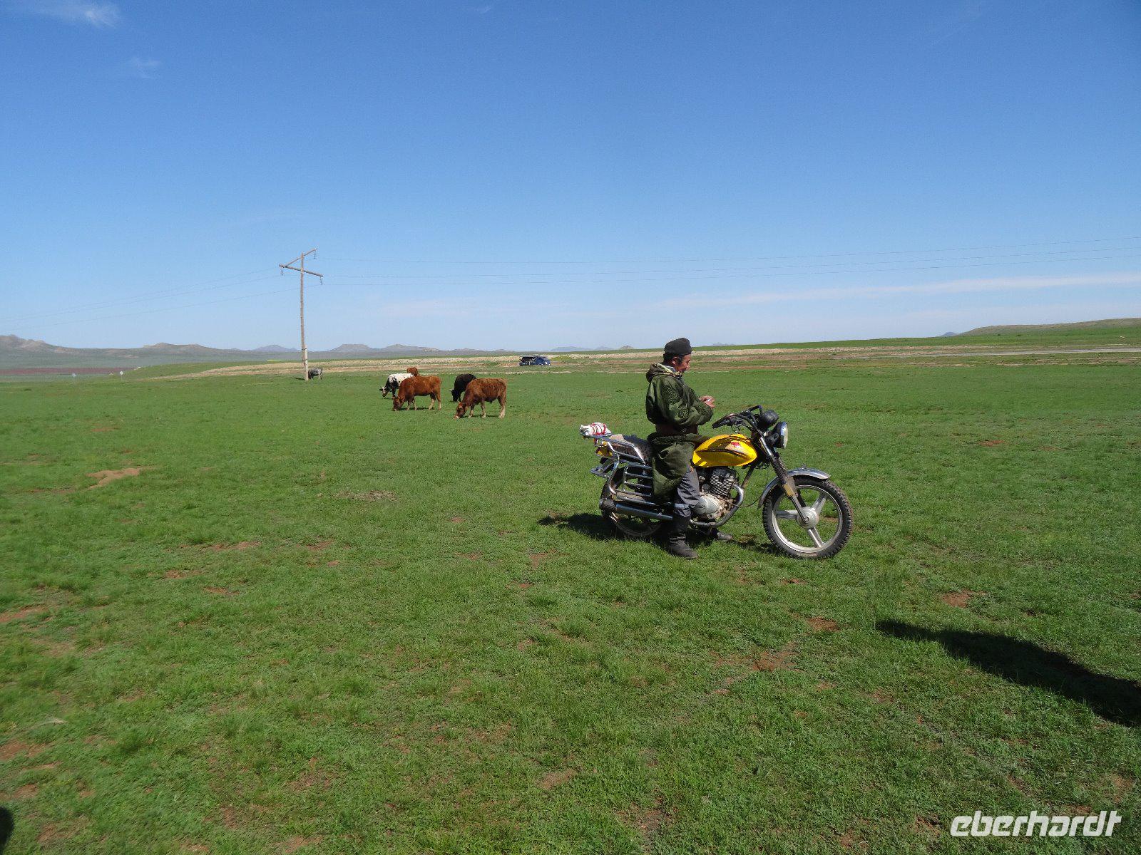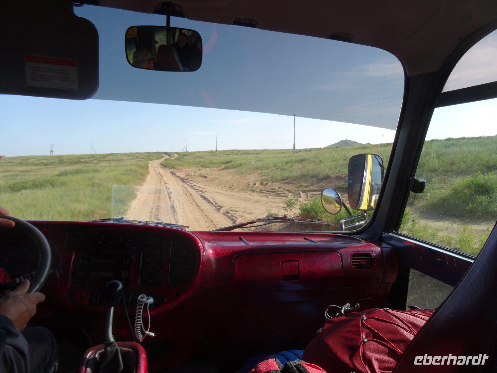 Mit einigen Informationen zur Hauptstadt, in der fast die Hälfte der Einwohner der Mongolei (1,5 Mio.) lebt, geht es in Richtung Reiterstandbild Dschingis Khans. Unterwegs halten wir in der Steppe für eine Kaffeepause und essen unser restliches Gebäck aus Sibirien.