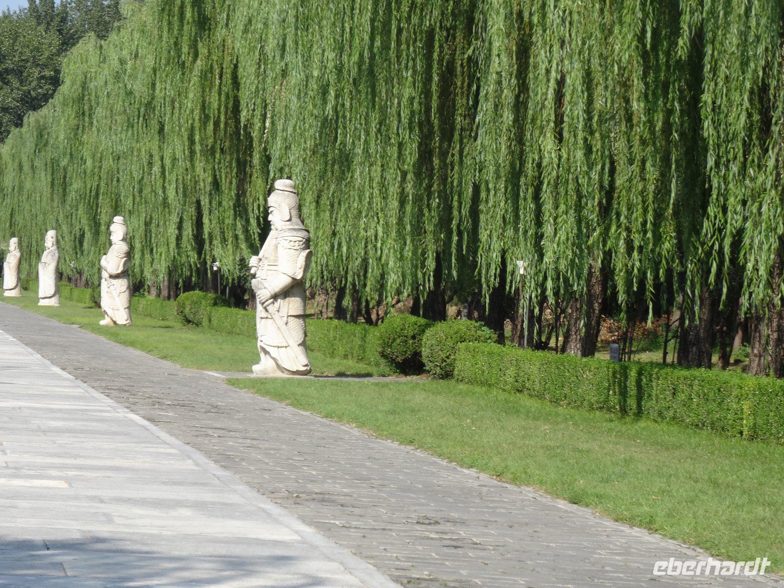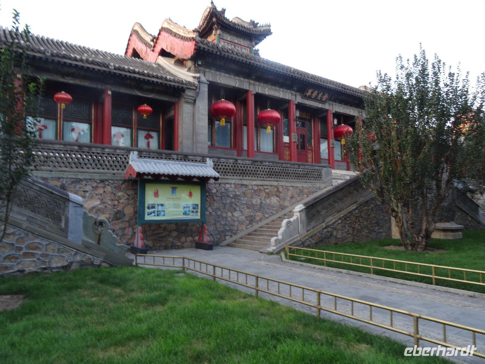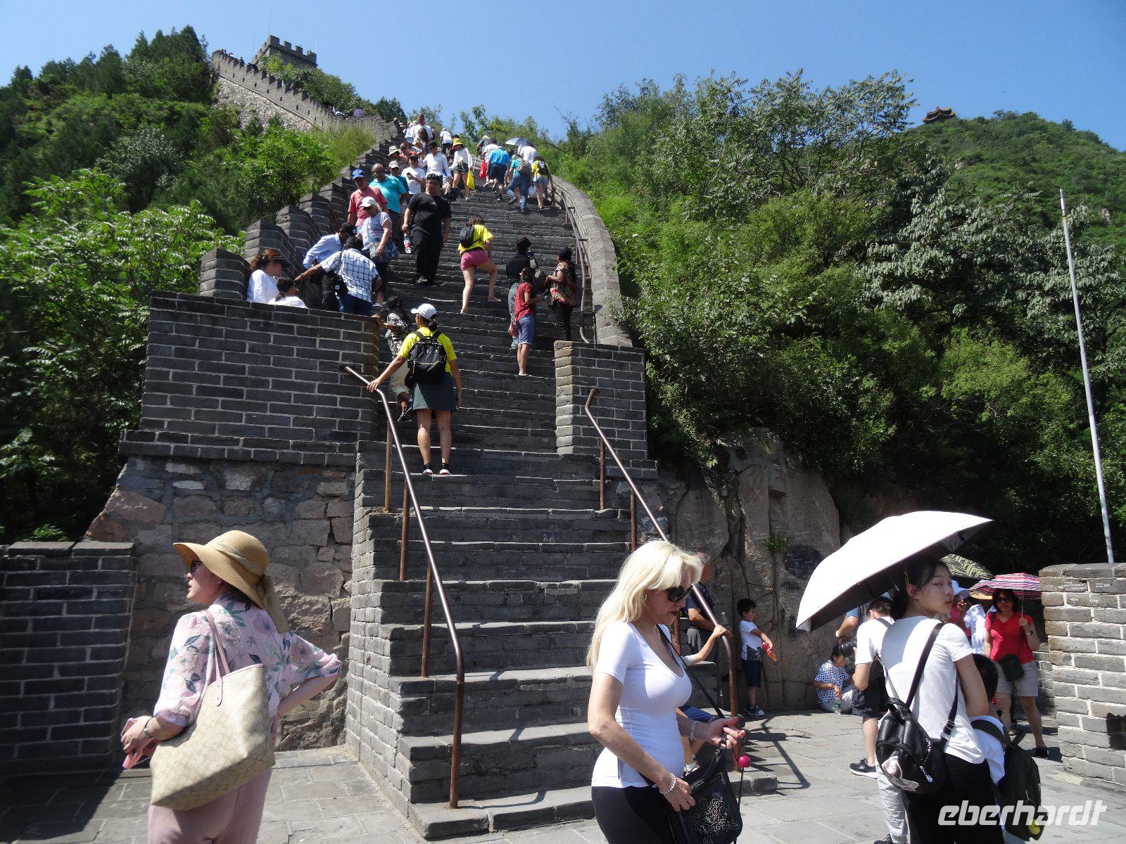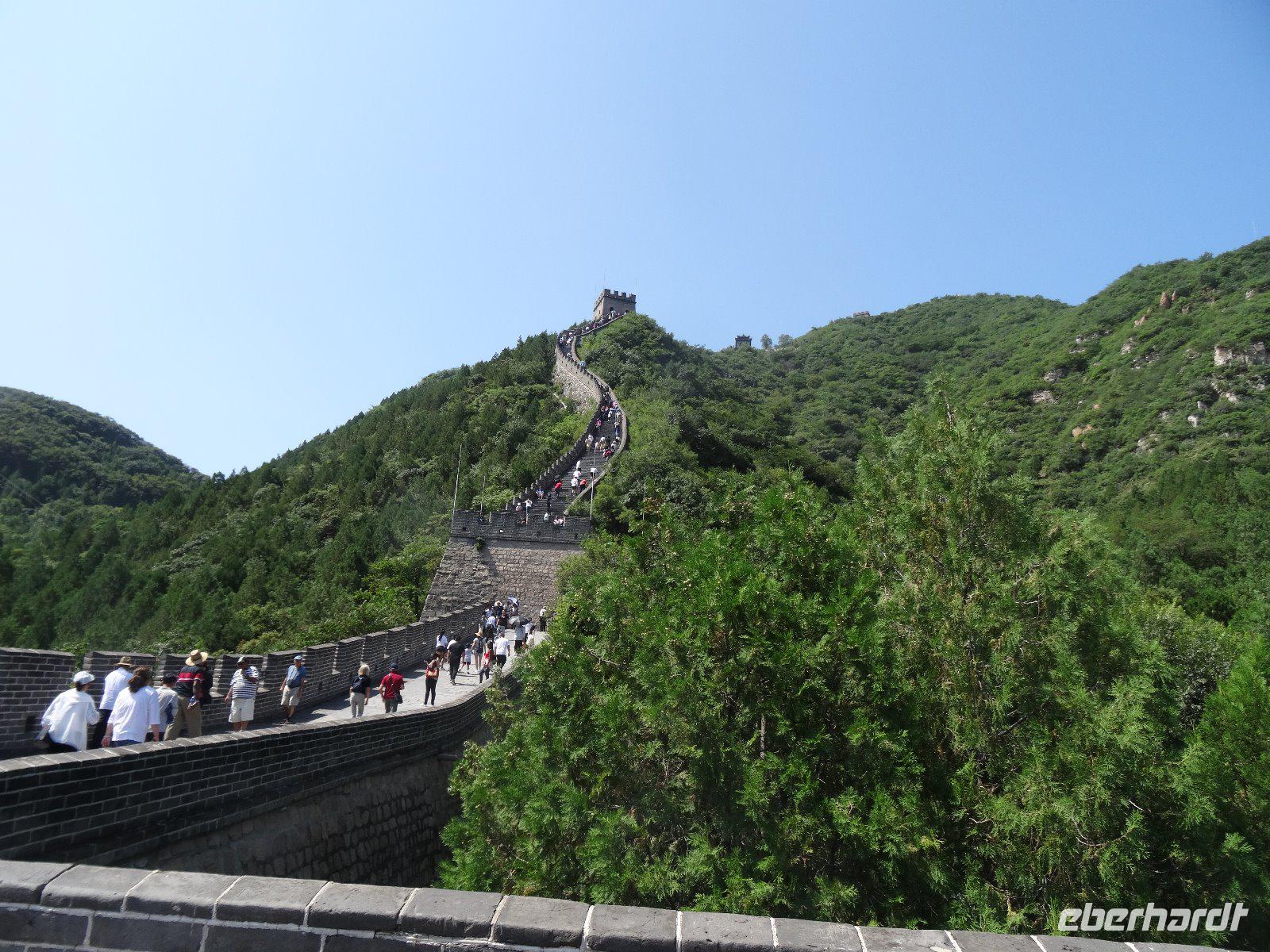 Frisch gestärkt nehmen wir am Morgen Kurs auf die Große Mauer. Nach der Weite der mongolischen Steppe kommt uns der Verkehrsstau in Peking besonders befremdlich vor. Langsam nur kommt der Bus voran und als wir endlich am Ziel sind, tummeln sich bereits zahlreiche aus- und inländische Touristen auf der Mauer. Wir reihen uns ein und erklimmen ein Stück von den 6000 km. Die Umgebung ist hügelig und sehr reizvoll, immer neue Ausblicke eröffnen sich. Nachdem wir die gewünschten Fotos im Schweiße unseres Angesichts geschossen haben, fahren wir schon zum nächsten Ziel, zu den Ming-Gräbern. Hier herrscht nicht so viel Betrieb und so können wir ganz entspannt den 2 km langen Seelenweg entlanggehen. Er wird von 24 Tierfiguren und 12 Beamtenfiguren gesäumt. In der zentralen Grablege des Kaisers Yongle steht eine Halle mit 12 m hohen Holzsäulen auf einer Marmorterrasse.