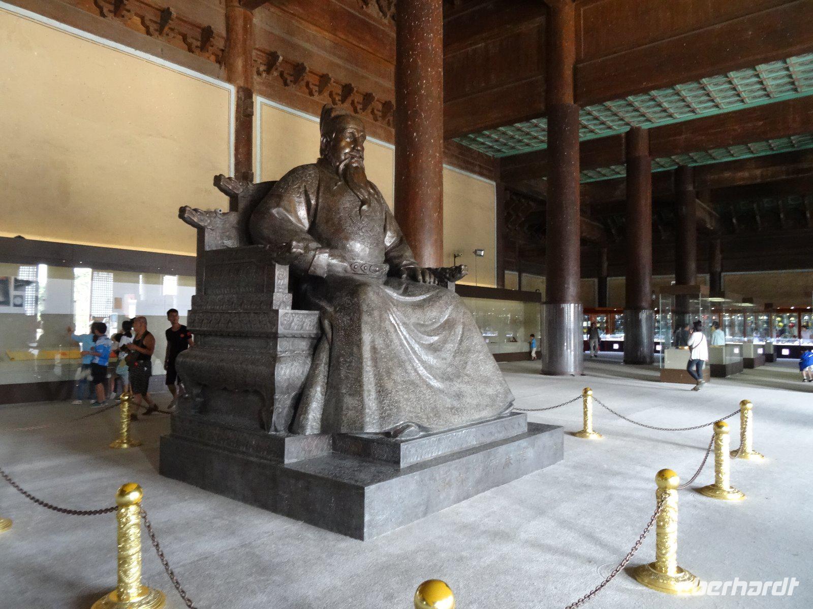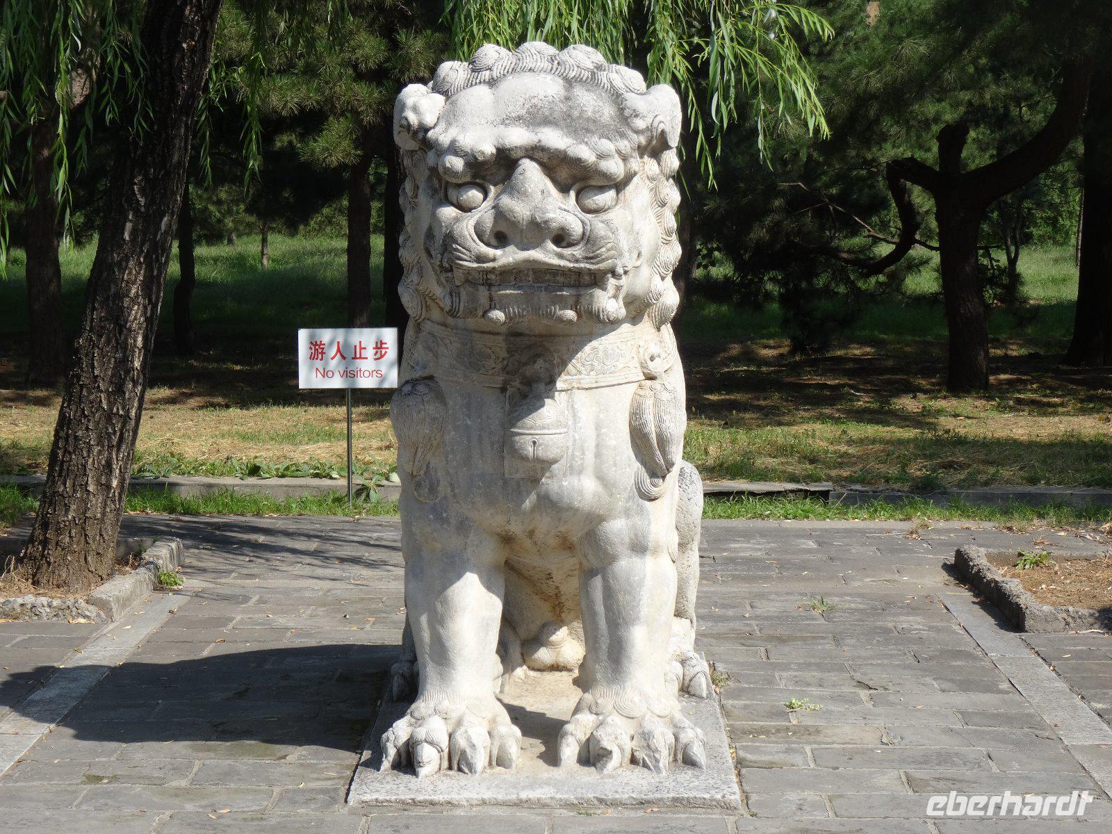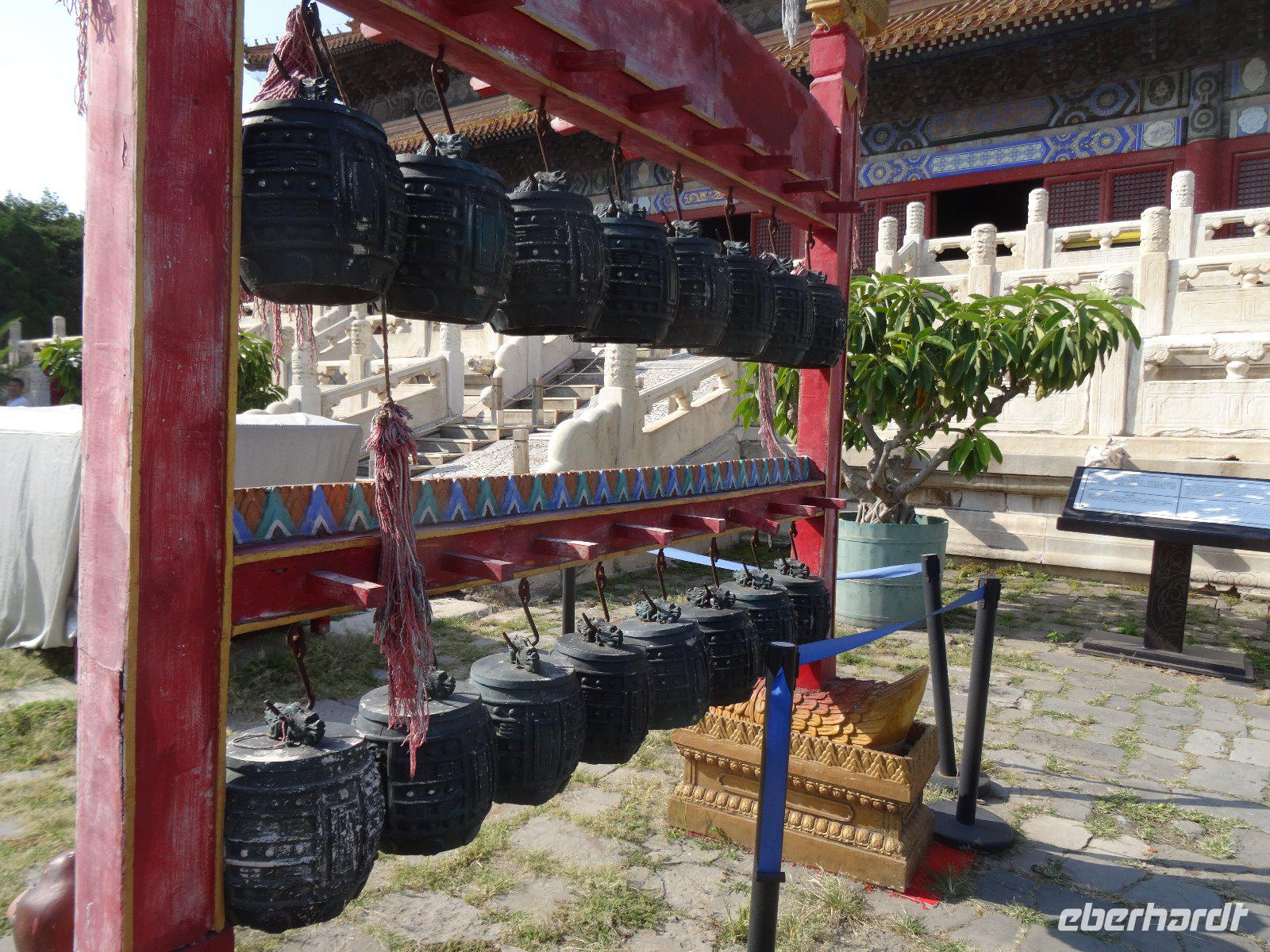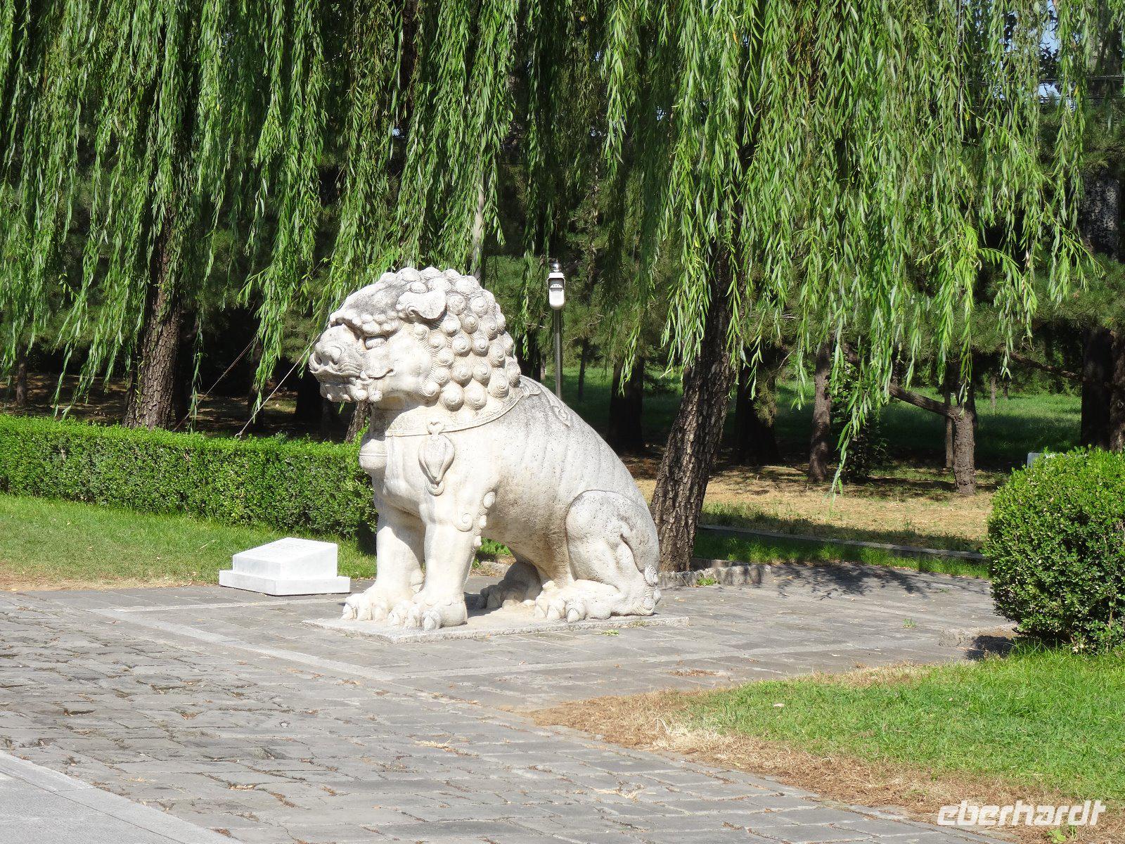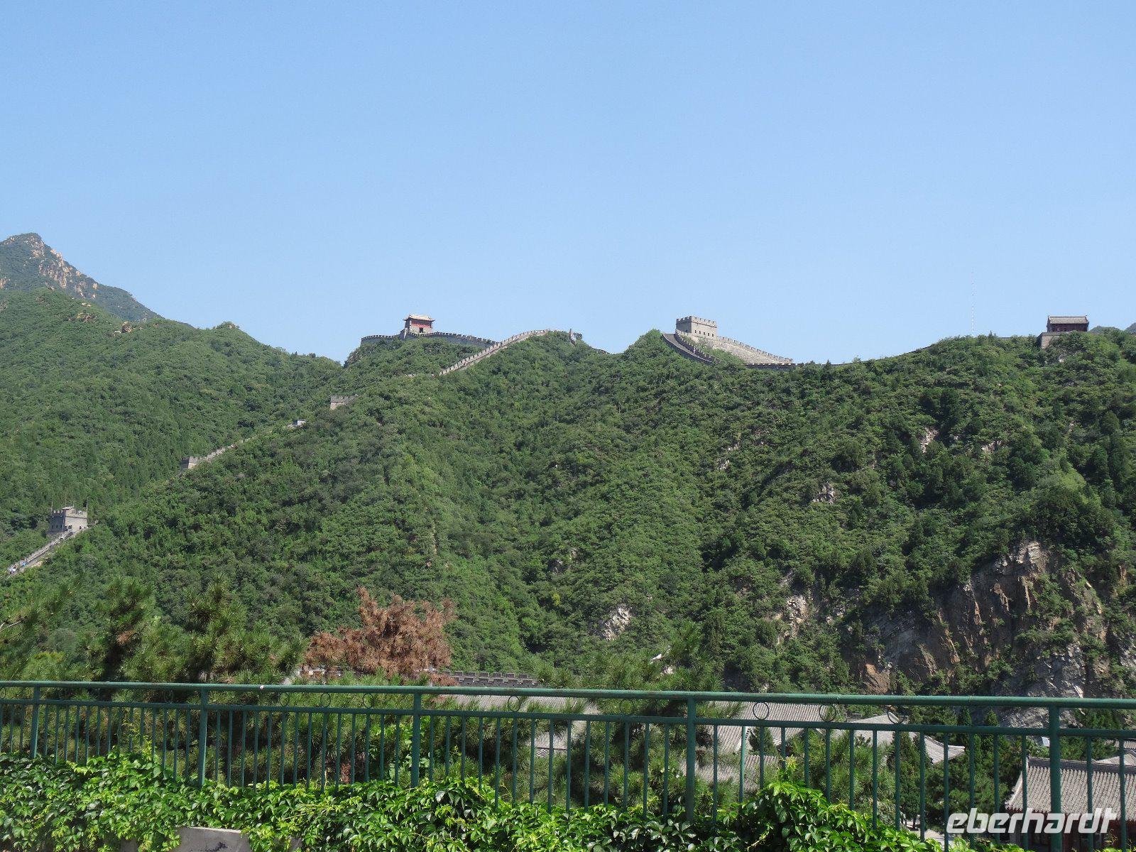 Frisch gestärkt nehmen wir am Morgen Kurs auf die Große Mauer. Nach der Weite der mongolischen Steppe kommt uns der Verkehrsstau in Peking besonders befremdlich vor. Langsam nur kommt der Bus voran und als wir endlich am Ziel sind, tummeln sich bereits zahlreiche aus- und inländische Touristen auf der Mauer. Wir reihen uns ein und erklimmen ein Stück von den 6000 km. Die Umgebung ist hügelig und sehr reizvoll, immer neue Ausblicke eröffnen sich. Nachdem wir die gewünschten Fotos im Schweiße unseres Angesichts geschossen haben, fahren wir schon zum nächsten Ziel, zu den Ming-Gräbern. Hier herrscht nicht so viel Betrieb und so können wir ganz entspannt den 2 km langen Seelenweg entlanggehen. Er wird von 24 Tierfiguren und 12 Beamtenfiguren gesäumt. In der zentralen Grablege des Kaisers Yongle steht eine Halle mit 12 m hohen Holzsäulen auf einer Marmorterrasse.