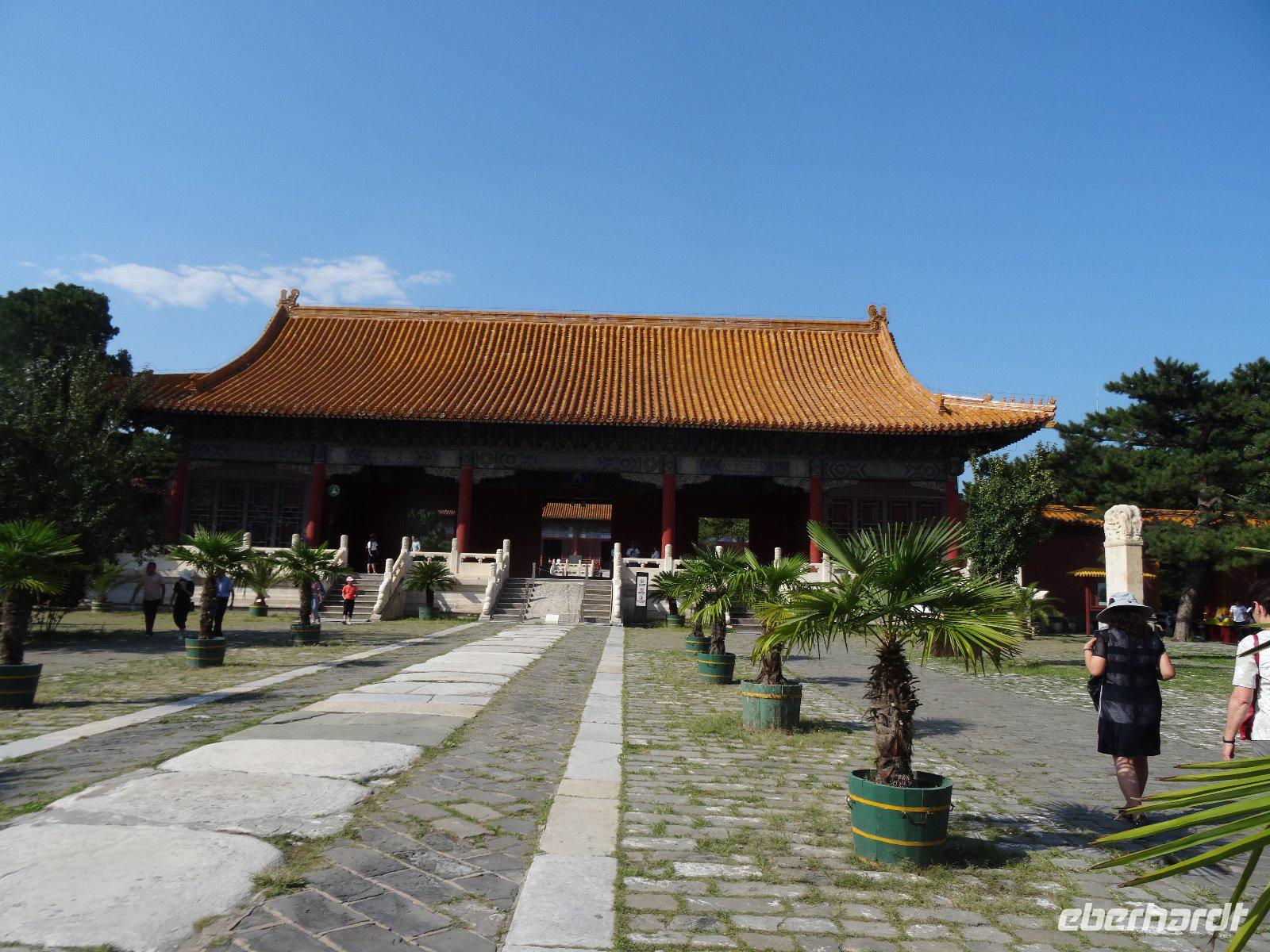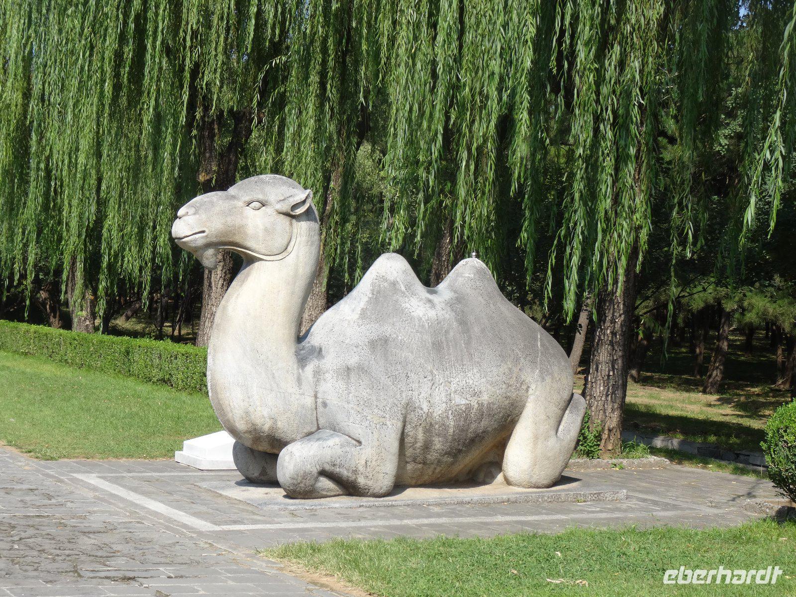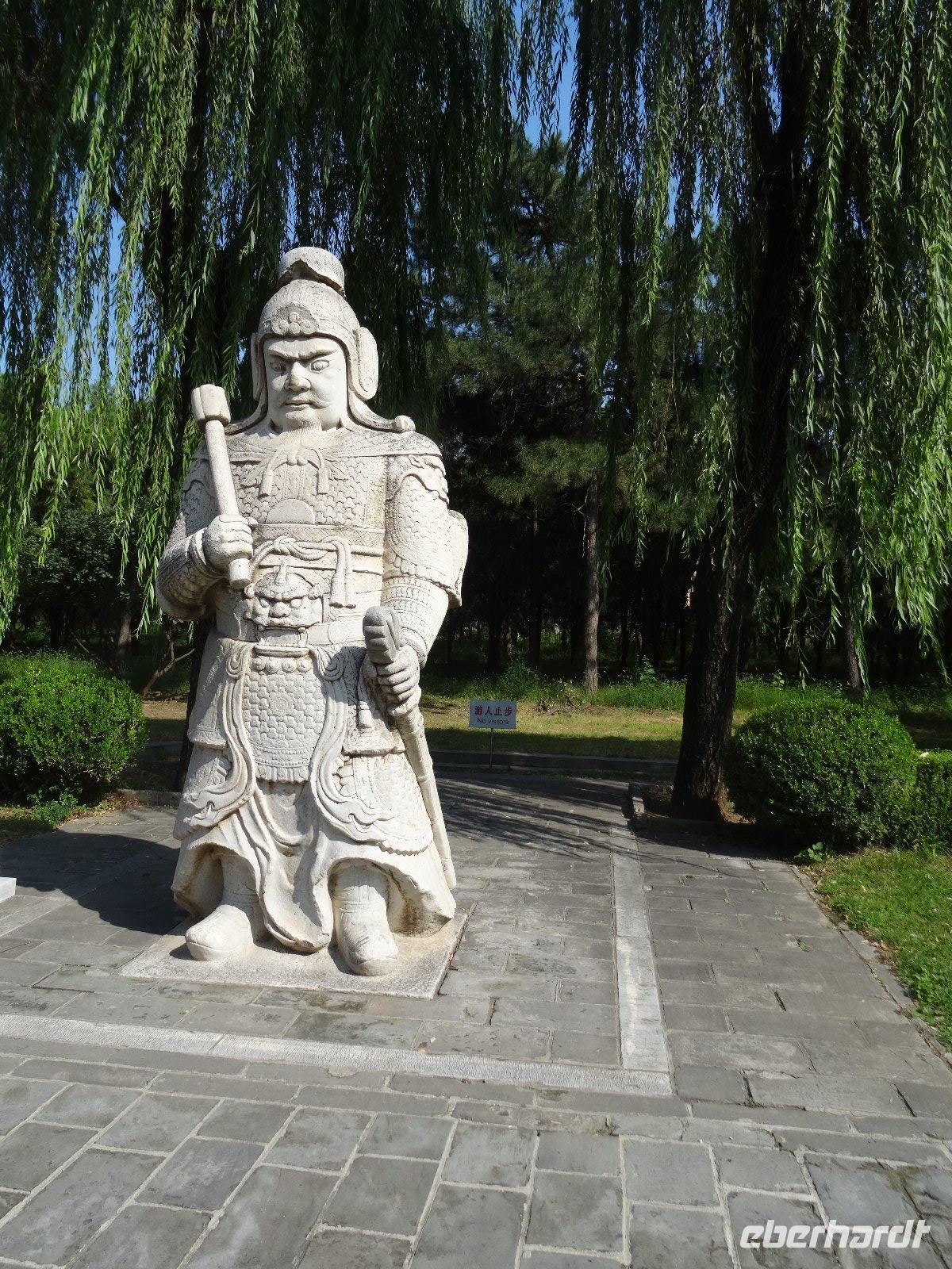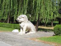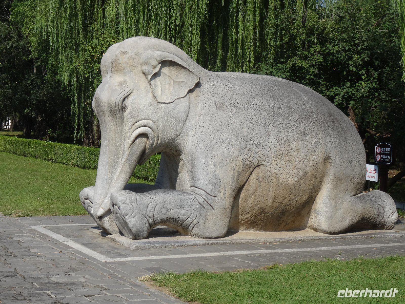 Frisch gestärkt nehmen wir am Morgen Kurs auf die Große Mauer. Nach der Weite der mongolischen Steppe kommt uns der Verkehrsstau in Peking besonders befremdlich vor. Langsam nur kommt der Bus voran und als wir endlich am Ziel sind, tummeln sich bereits zahlreiche aus- und inländische Touristen auf der Mauer. Wir reihen uns ein und erklimmen ein Stück von den 6000 km. Die Umgebung ist hügelig und sehr reizvoll, immer neue Ausblicke eröffnen sich. Nachdem wir die gewünschten Fotos im Schweiße unseres Angesichts geschossen haben, fahren wir schon zum nächsten Ziel, zu den Ming-Gräbern. Hier herrscht nicht so viel Betrieb und so können wir ganz entspannt den 2 km langen Seelenweg entlanggehen. Er wird von 24 Tierfiguren und 12 Beamtenfiguren gesäumt. In der zentralen Grablege des Kaisers Yongle steht eine Halle mit 12 m hohen Holzsäulen auf einer Marmorterrasse.