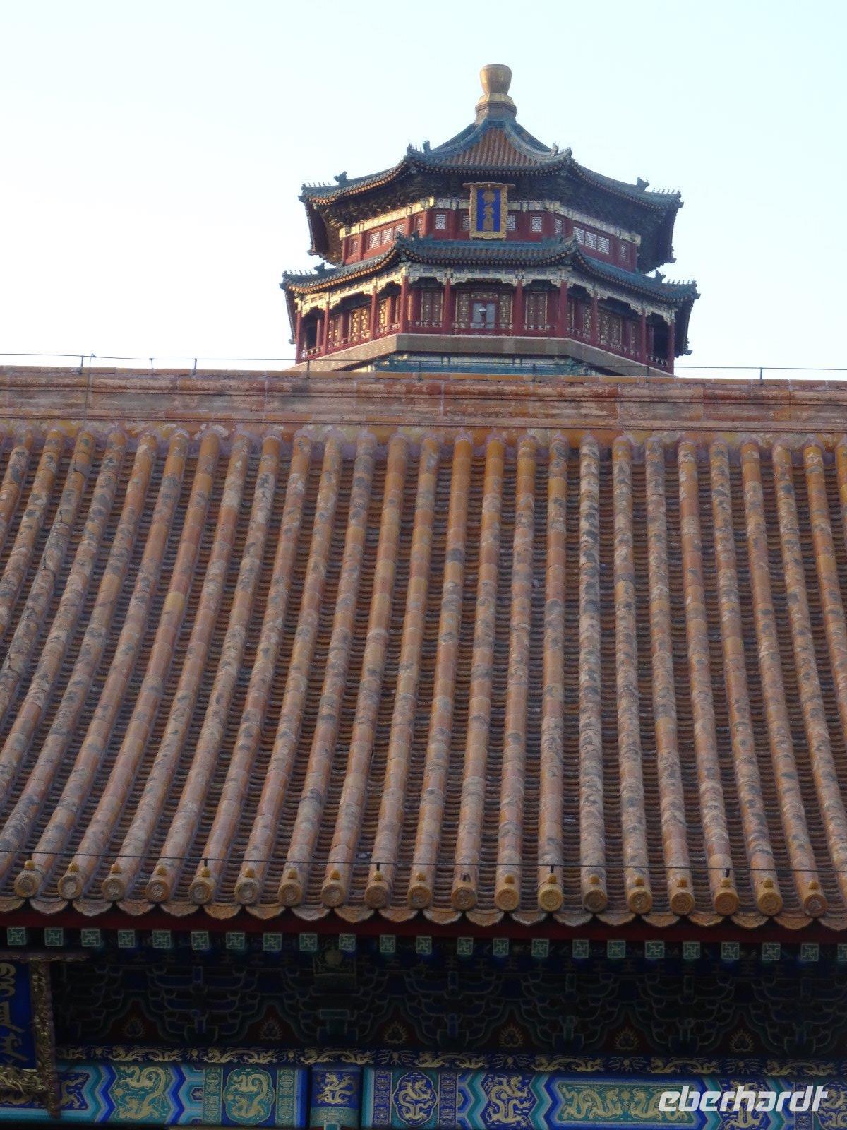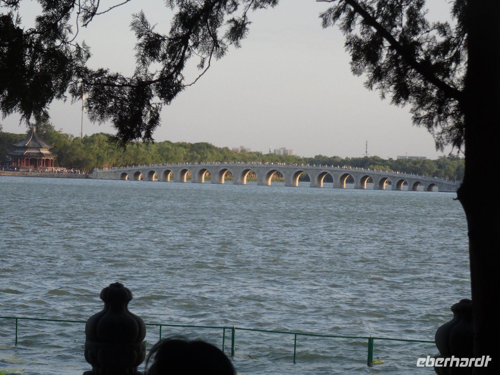 Nach einem schnellen Mittagessen in einem der vielen Touristenlokale haben wir noch eine interessante Besichtigung - wir fahren zum Sommerpalast. Wieder ist viel Stau und wieder geht es nur sehr langsam voran, aber unser Fahrer Som erträgt es mit Gleichmut. Schließlich kommen wir doch an und wir betreten das weitläufige Gelände durch ein schönes Tor. Die Nachmittagssonne beleuchtet sehr effektvoll die 17-Bogen-Brücke über den Kunming-See. In der Halle der Freude und der Langlebigkeit sieht man ein Bild der Kaiserin Cixi, welche das Gelände nach seiner Zerstörung durch britische Kolonialtruppen wieder herrichten ließ.