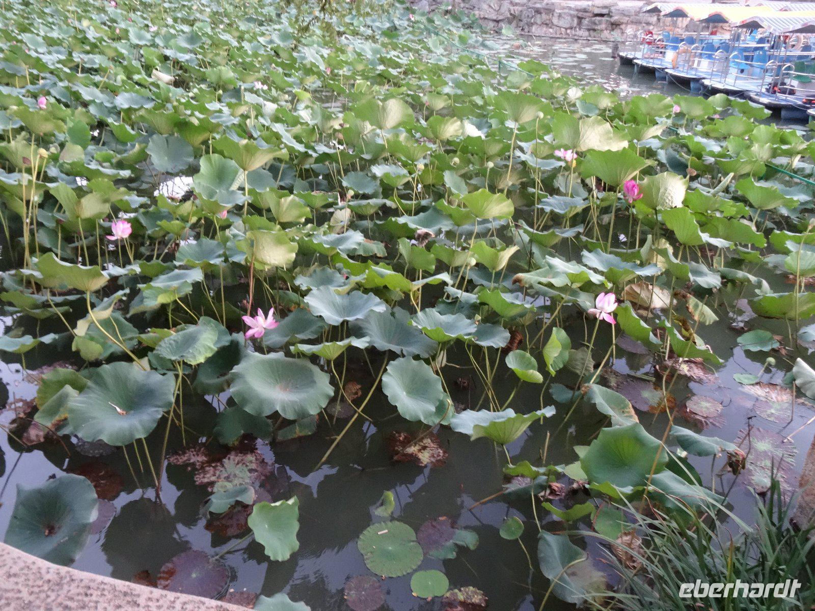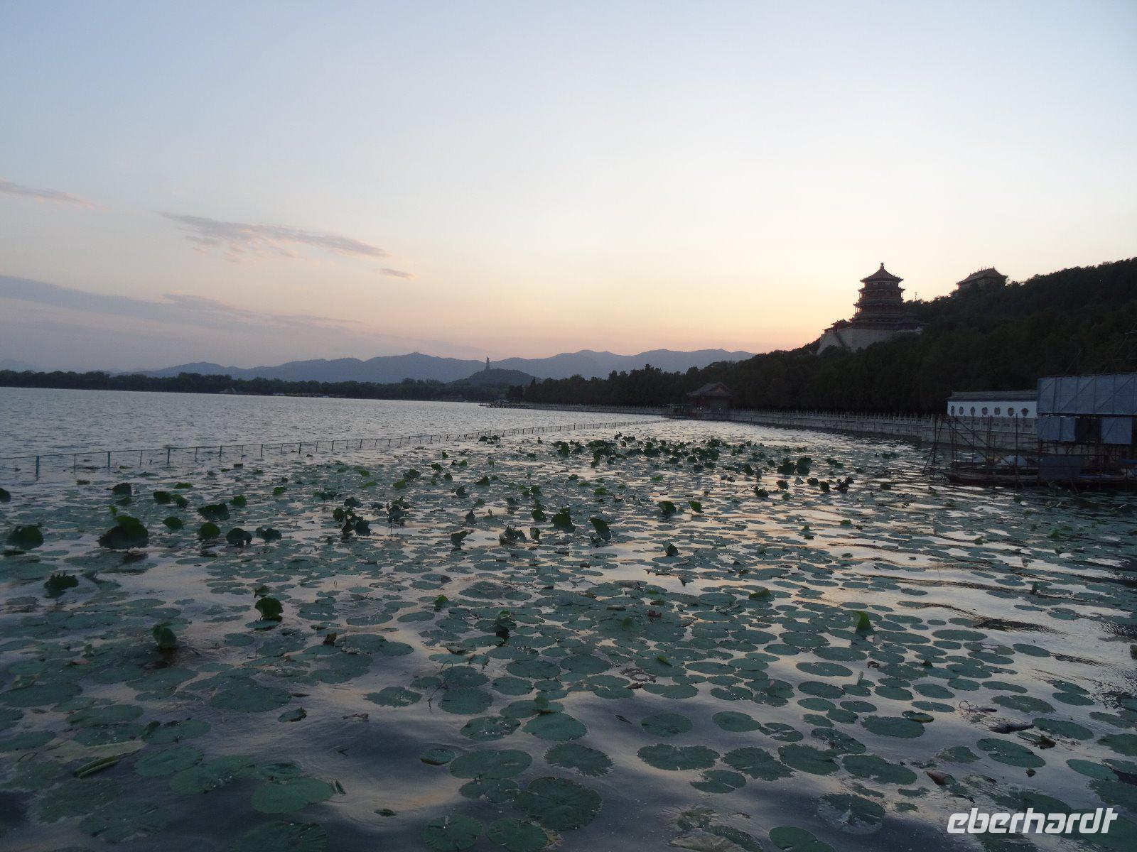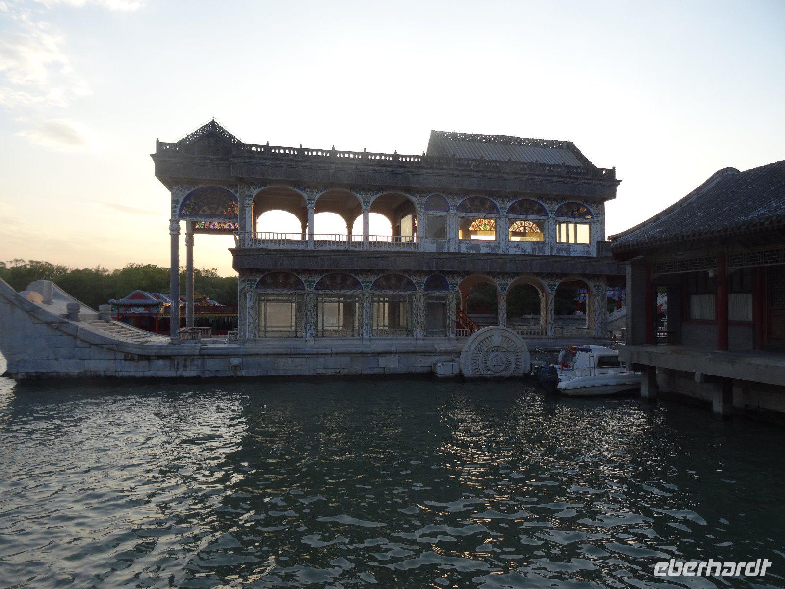 Ein Glanzpunkt ist sicher der 720 m lange Wandelgang parallel zum Seeufer, da konnte man vom Wetter unbehelligt entlangspazieren. Das prunkvolle Marmorschiff wird von uns ebenfalls noch gebührend bewundert, dann verlassen wir den fast schon abendlichen Garten und fahren in ein schönes Restaurant zum typisch chinesischen Abendessen.