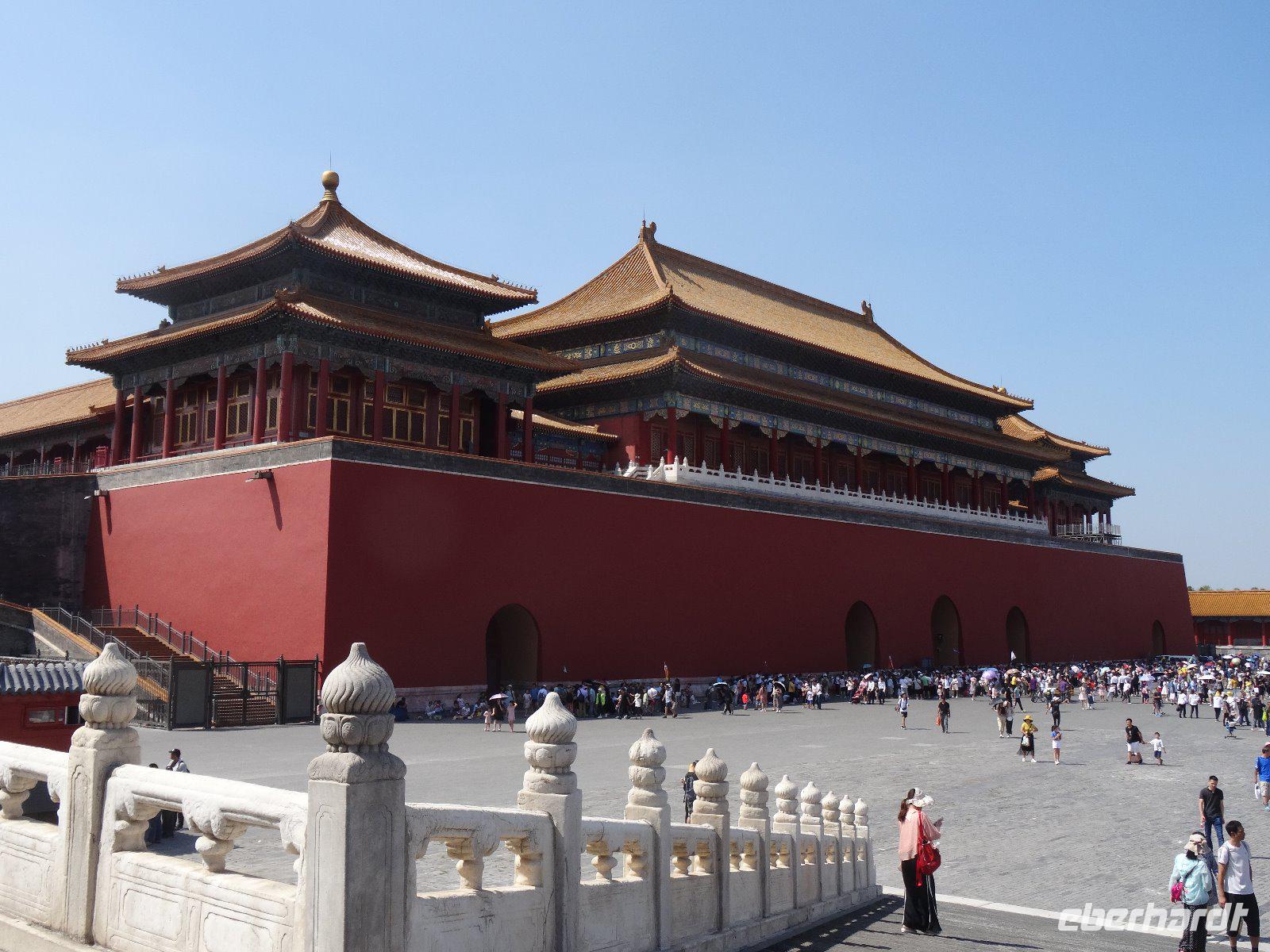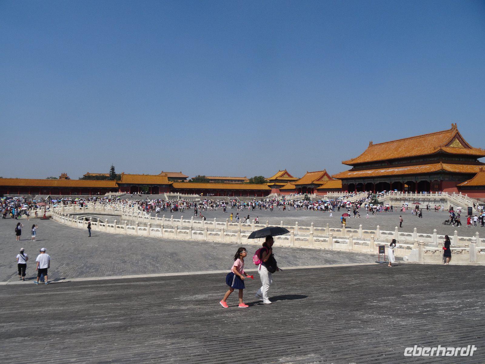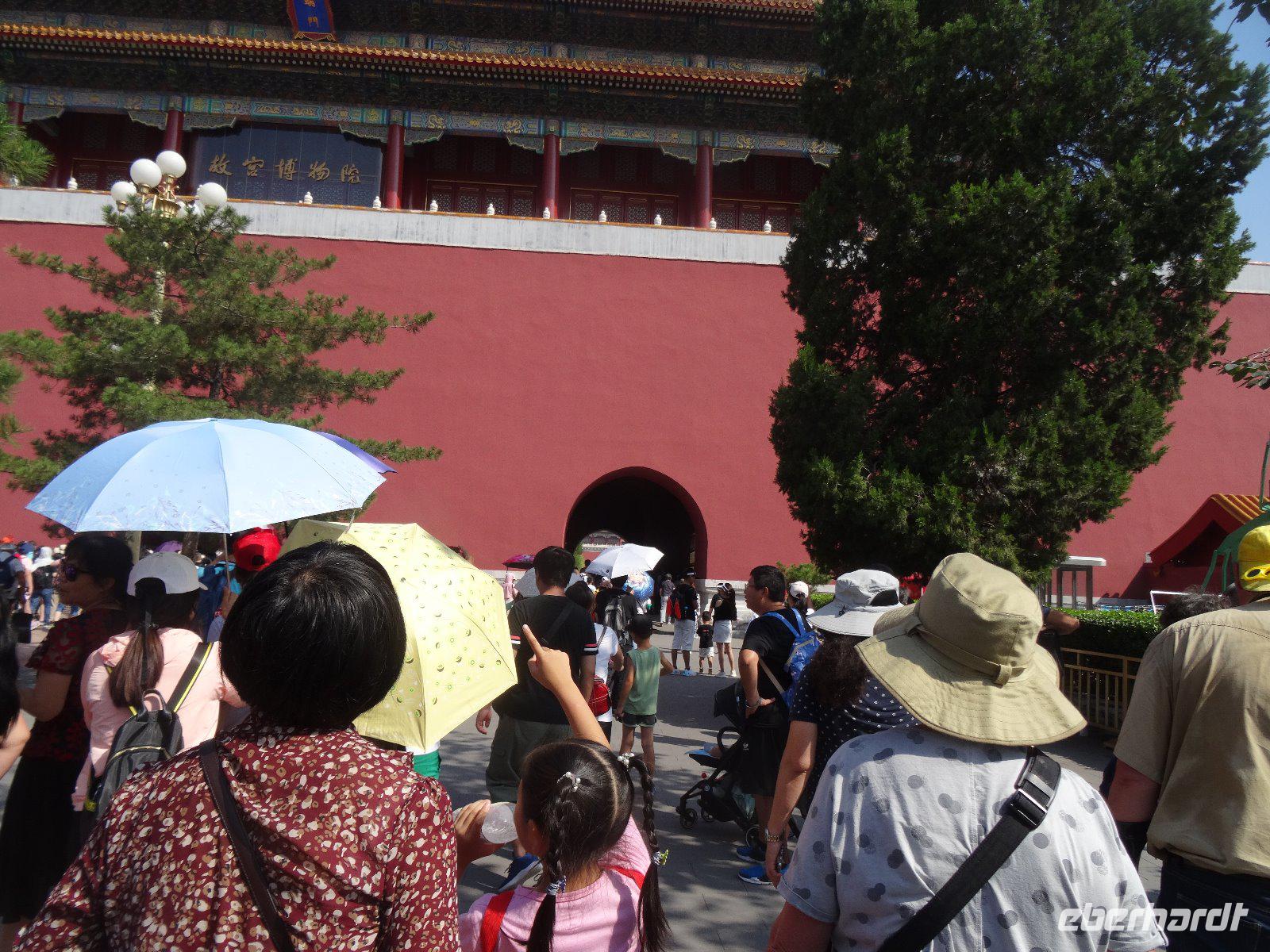 Wie am Vortag geht das Busfahren auch heute nicht so schnell, unsere Ziele sind der Kaiserpalast, die verbotene Stadt und der Platz des Himmlischen Friedens. Letzteren überqueren wir gemeinsam mit ganz vielen Menschen und gelangen schließlich an die Begrenzung der verbotenen Stadt. Durch ein großes Mittagstor betritt man die verbotene Stadt. Auf dem zentralen Hof erblckt man die drei großen Zeremonienhallen und noch weitere Gebäude mit einer strengen Zuordnung ihrer Bestimmung. Auf dem Gelände wurde ja nicht nur regiert, sondern die ganze kaiserliche Familie lebte hier mit dem dazugehörigen Hofstaat.Beeindruckt von der Größe und Pracht der Palastanlage und den vielen Besuchern (80.000 pro Tag) laufen wir durch die Höfe und Tore und veruchen, nicht verloren zu gehen. Vollzählig am Nordtor, dem Tor des Göttlichen Kriegers angekommen, verlassen wir die verbotene Stadt schon etwas erschöpft.