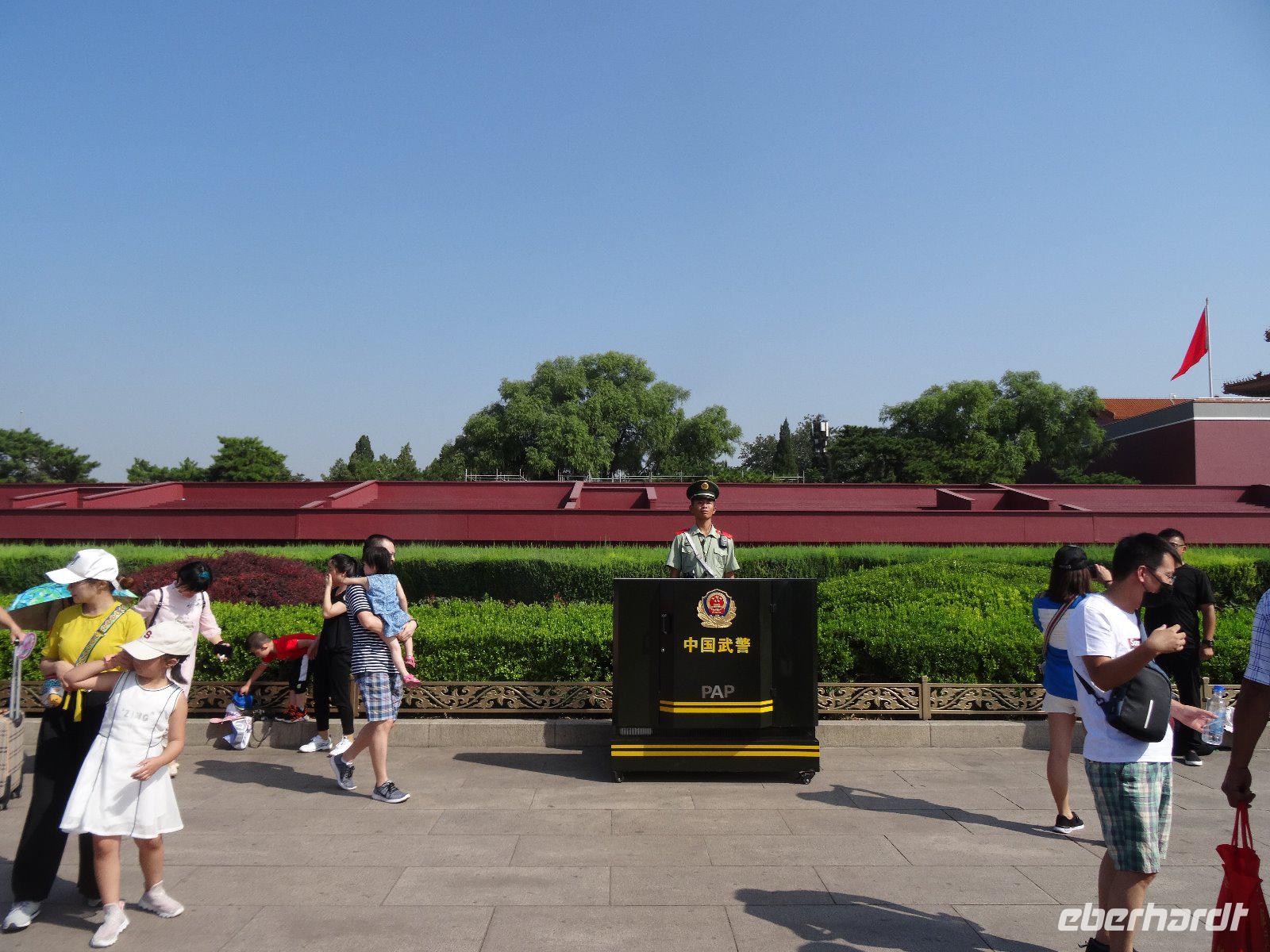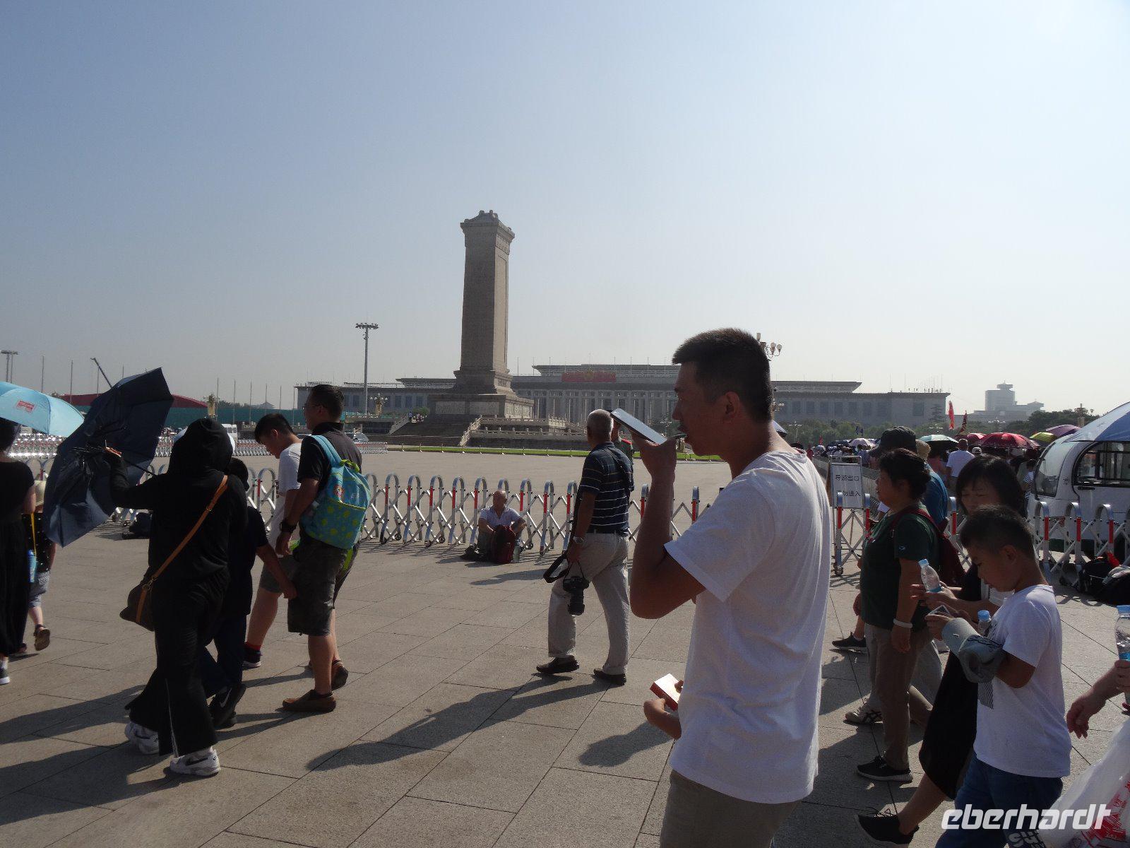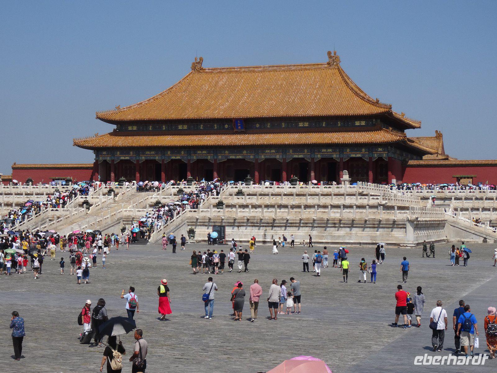 Wie am Vortag geht das Busfahren auch heute nicht so schnell, unsere Ziele sind der Kaiserpalast, die verbotene Stadt und der Platz des Himmlischen Friedens. Letzteren überqueren wir gemeinsam mit ganz vielen Menschen und gelangen schließlich an die Begrenzung der verbotenen Stadt. Durch ein großes Mittagstor betritt man die verbotene Stadt. Auf dem zentralen Hof erblckt man die drei großen Zeremonienhallen und noch weitere Gebäude mit einer strengen Zuordnung ihrer Bestimmung. Auf dem Gelände wurde ja nicht nur regiert, sondern die ganze kaiserliche Familie lebte hier mit dem dazugehörigen Hofstaat.Beeindruckt von der Größe und Pracht der Palastanlage und den vielen Besuchern (80.000 pro Tag) laufen wir durch die Höfe und Tore und veruchen, nicht verloren zu gehen. Vollzählig am Nordtor, dem Tor des Göttlichen Kriegers angekommen, verlassen wir die verbotene Stadt schon etwas erschöpft.