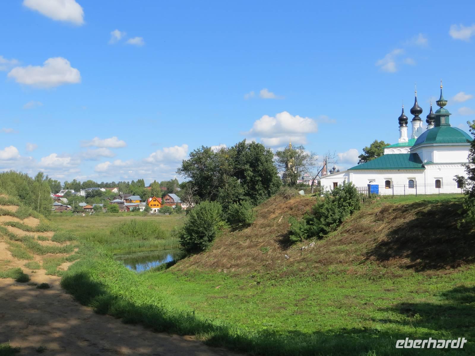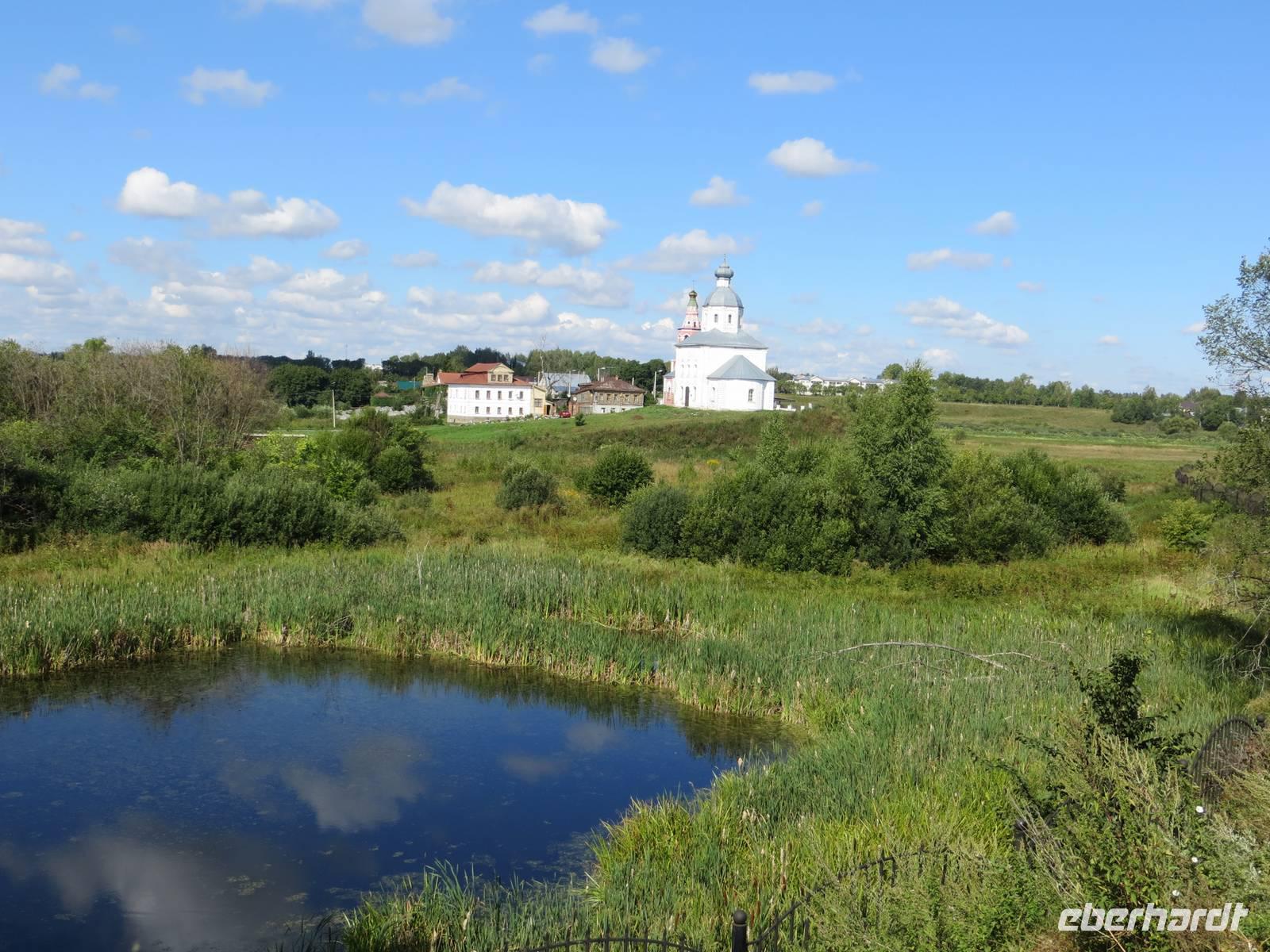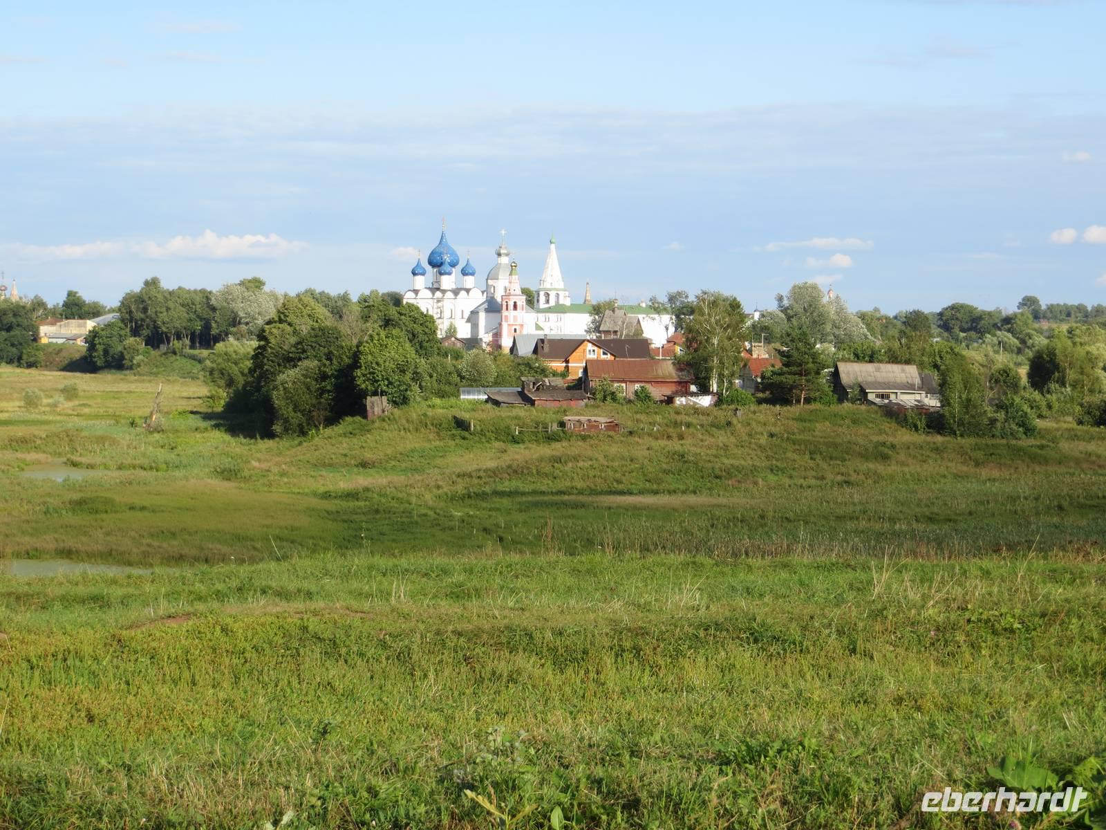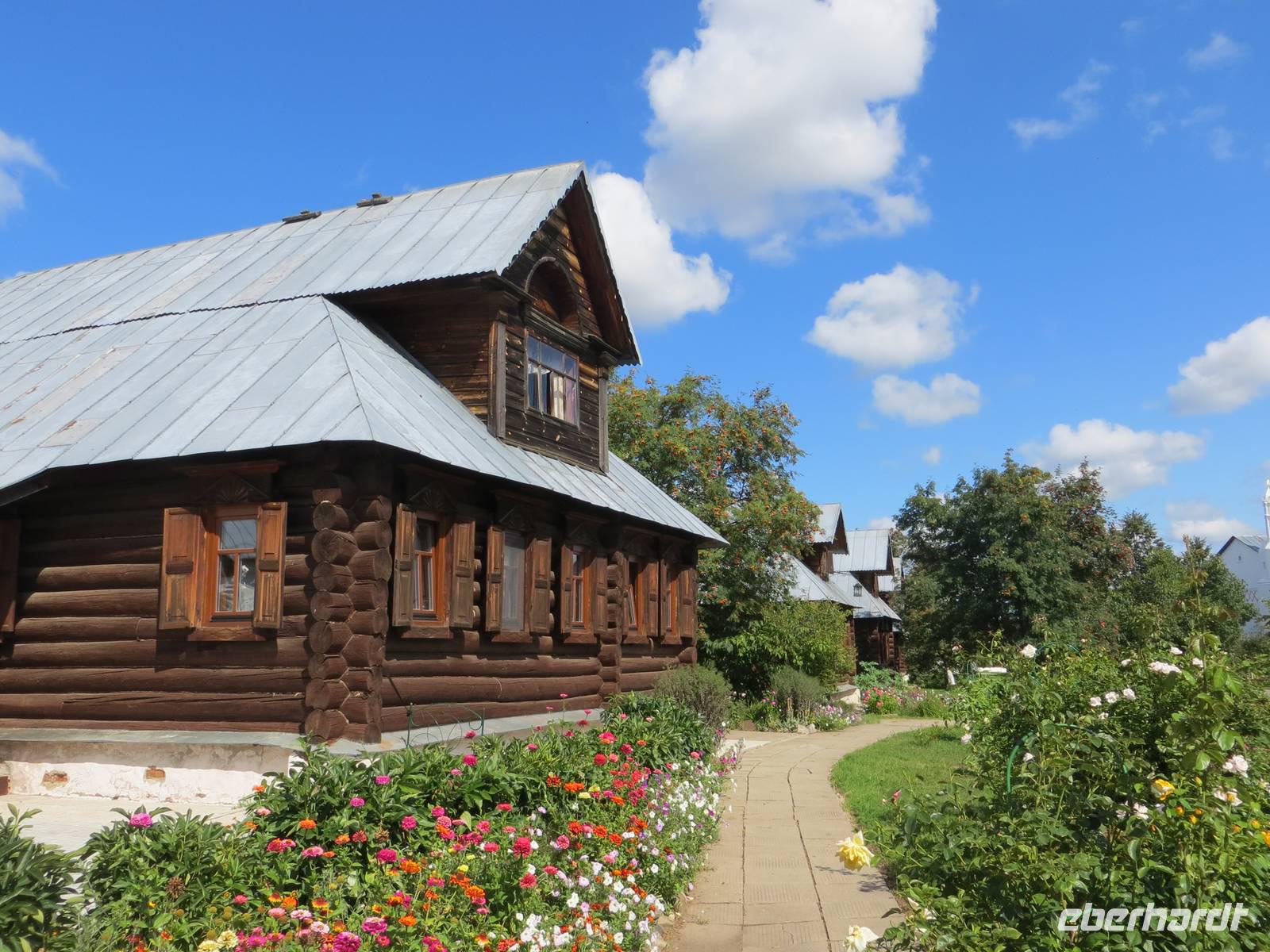 Das Moskaus Straßen auch an einem Montagvormittag voll sind, merkten wir recht bald als wir auf dem MKAD Moskau von Süd nach Nordost umrundeten. Dann ging es etwas zügiger in Richtung Wladimir, Stadt 200 km nordöstlich von Moskau mit immerhin 350.000 Einwohnern. Uns interessierten jedoch vorrangig die Maria-Himmelfahrts-Kirche, das Dimitrius-Kloster und das Goldene Tor; Zeitzeugen der Entwicklung der Rus aus dem 12. Jahrhundert mit Unesco-Welterbestatus. Wenige Kilometer von Wladimir entfernt liegt Boguljubovo mit seinem weiß strahlendem Kloster mit blauen Kuppeln; ein aktives, sehr religiöses und monarchistisch orientiertes Kloster mit wohl achtzig Nonnen und einem perfekt geführten Klostergarten zur Eigenversorgung. Ein Stück unterhalb des Klosters am Zusammenfluss von Kljasma und Nerl liegt die Pokrov-Kirche, die als schönste Kirche des Wladimirer Gebiets gilt. Ein Spaziergang von zwei Kilometern durch Wiesen führte uns zur Kirche aus dem Jahr 1162. Auf unserem Weg zum Hotel in Susdal hielten wir am Hofe einer Künstlerfamilie zum Abendessen. Salzgurken, eingelegte Tomaten und Kapusta, russischer Gemüsesalat und eine mit Kraut gefüllte Pirogge, Hähnchenbrust, Ebereschenkonfitüre zum Tee und süße Piroggen, herrliches Brot mit Koriander waren ein typisch russisches Mahl. Nun angekommen in Russland krönten wir dies mit einem Vodka, Moosbeeren oder Ebereschenschnaps nach Wahl. Gegen acht, dann Einzug in unser Hoteldorf am Rand von Susdal, einst Gorjatschie Klutschi genannt, nun Heliopark. Die Abendsonne verwandelte die Banja-Häuschen am Wasser in ein schönes Abendflair.