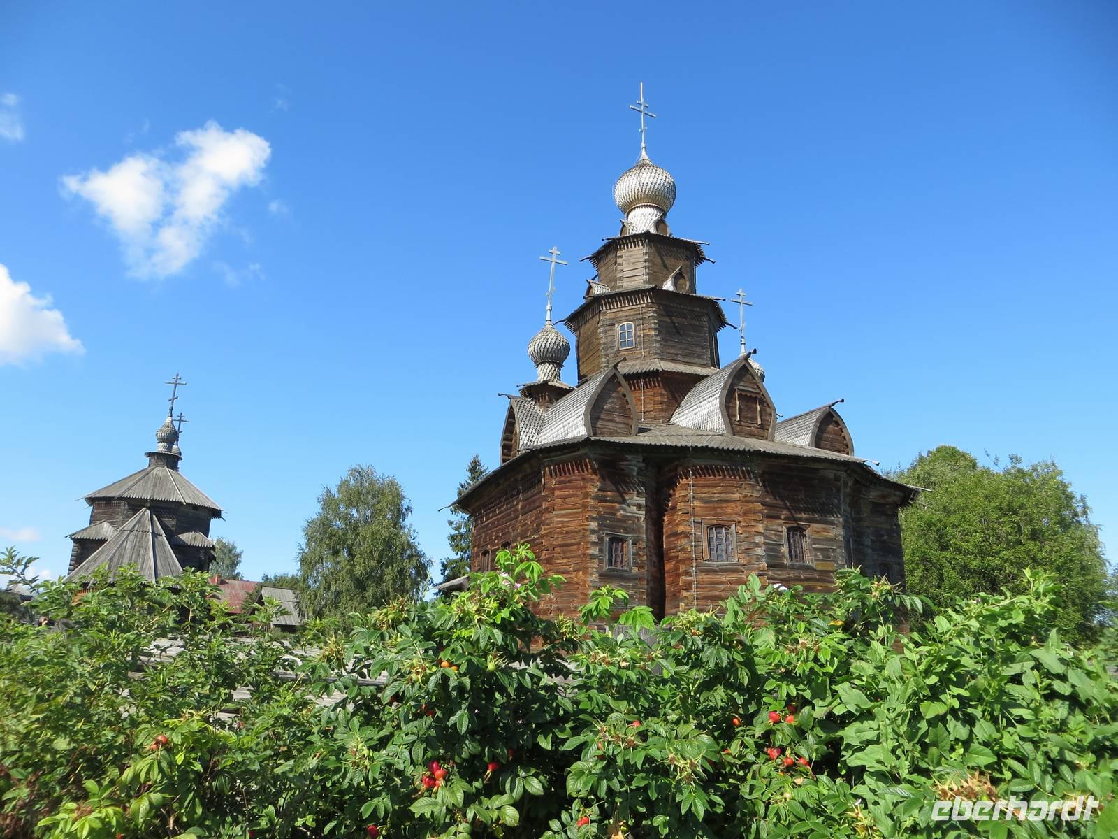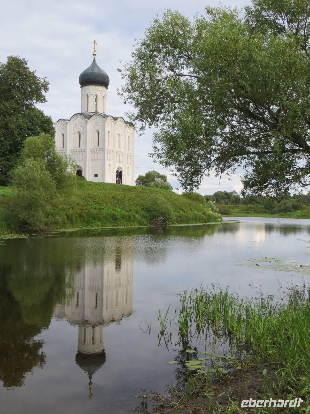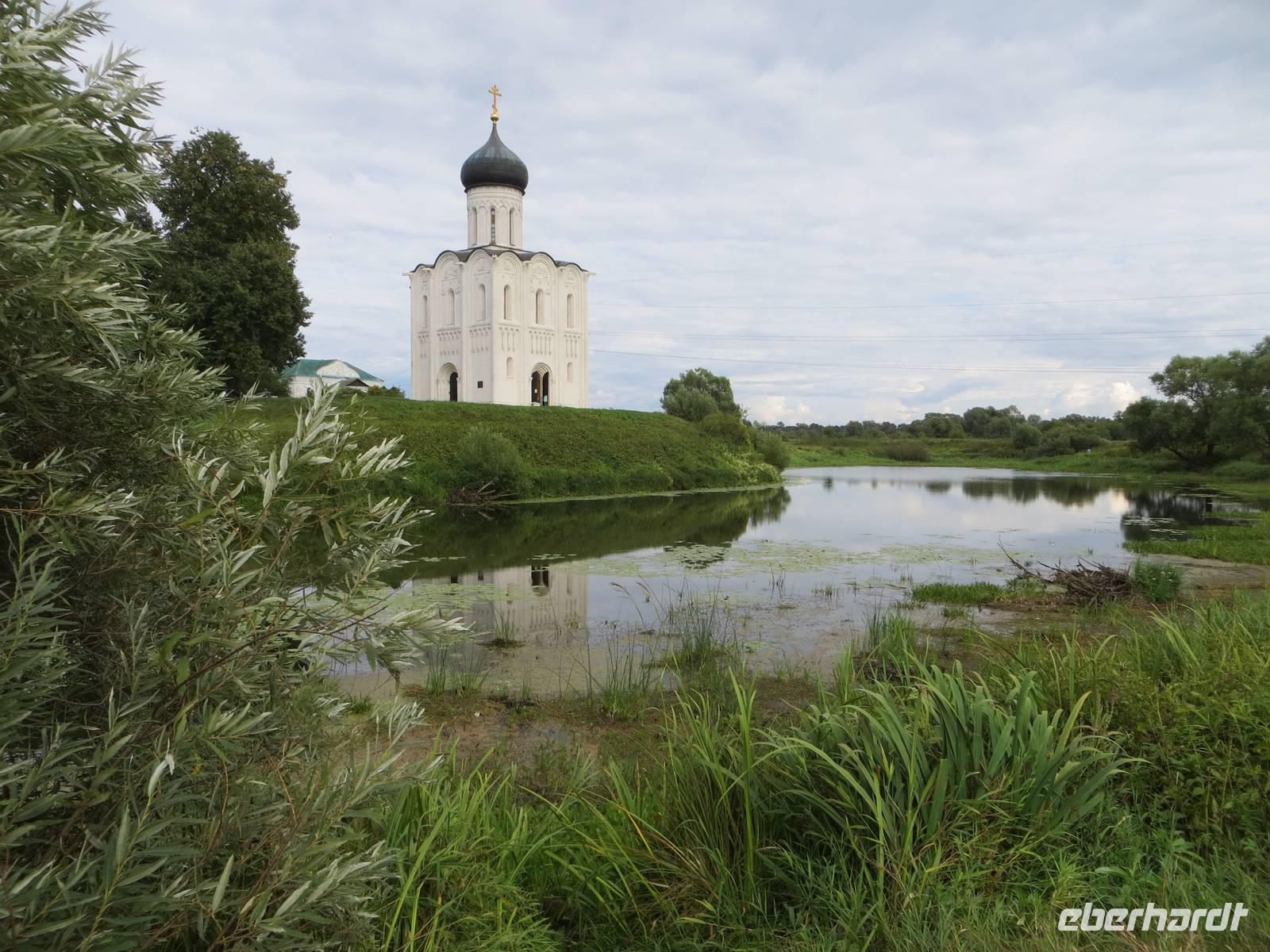 Das Moskaus Straßen auch an einem Montagvormittag voll sind, merkten wir recht bald als wir auf dem MKAD Moskau von Süd nach Nordost umrundeten. Dann ging es etwas zügiger in Richtung Wladimir, Stadt 200 km nordöstlich von Moskau mit immerhin 350.000 Einwohnern. Uns interessierten jedoch vorrangig die Maria-Himmelfahrts-Kirche, das Dimitrius-Kloster und das Goldene Tor; Zeitzeugen der Entwicklung der Rus aus dem 12. Jahrhundert mit Unesco-Welterbestatus. Wenige Kilometer von Wladimir entfernt liegt Boguljubovo mit seinem weiß strahlendem Kloster mit blauen Kuppeln; ein aktives, sehr religiöses und monarchistisch orientiertes Kloster mit wohl achtzig Nonnen und einem perfekt geführten Klostergarten zur Eigenversorgung. Ein Stück unterhalb des Klosters am Zusammenfluss von Kljasma und Nerl liegt die Pokrov-Kirche, die als schönste Kirche des Wladimirer Gebiets gilt. Ein Spaziergang von zwei Kilometern durch Wiesen führte uns zur Kirche aus dem Jahr 1162. Auf unserem Weg zum Hotel in Susdal hielten wir am Hofe einer Künstlerfamilie zum Abendessen. Salzgurken, eingelegte Tomaten und Kapusta, russischer Gemüsesalat und eine mit Kraut gefüllte Pirogge, Hähnchenbrust, Ebereschenkonfitüre zum Tee und süße Piroggen, herrliches Brot mit Koriander waren ein typisch russisches Mahl. Nun angekommen in Russland krönten wir dies mit einem Vodka, Moosbeeren oder Ebereschenschnaps nach Wahl. Gegen acht, dann Einzug in unser Hoteldorf am Rand von Susdal, einst Gorjatschie Klutschi genannt, nun Heliopark. Die Abendsonne verwandelte die Banja-Häuschen am Wasser in ein schönes Abendflair.