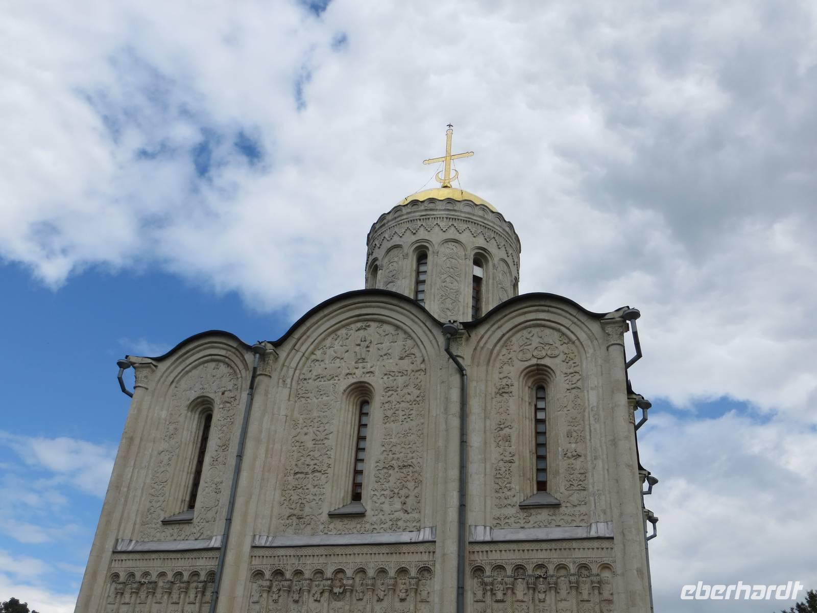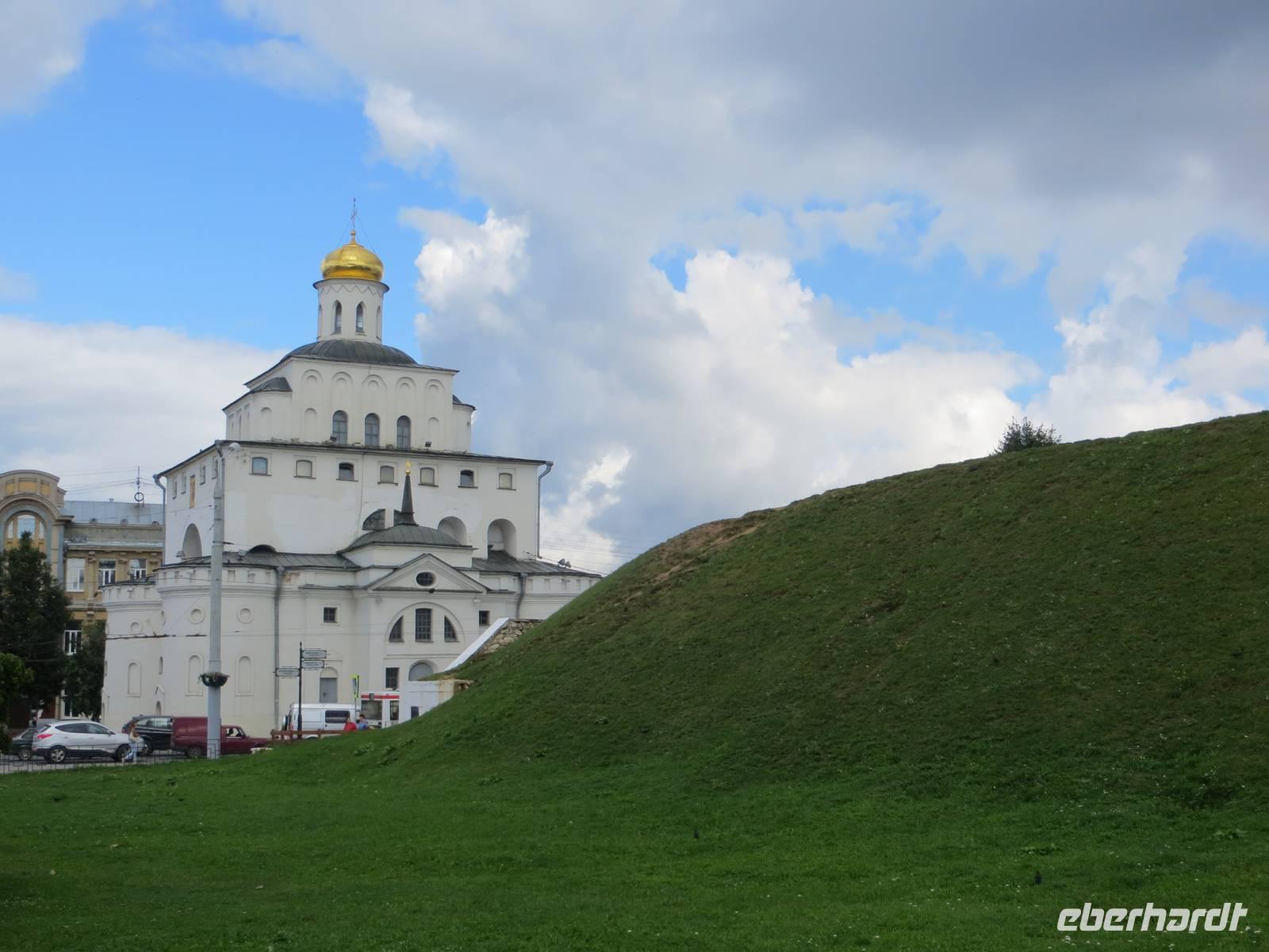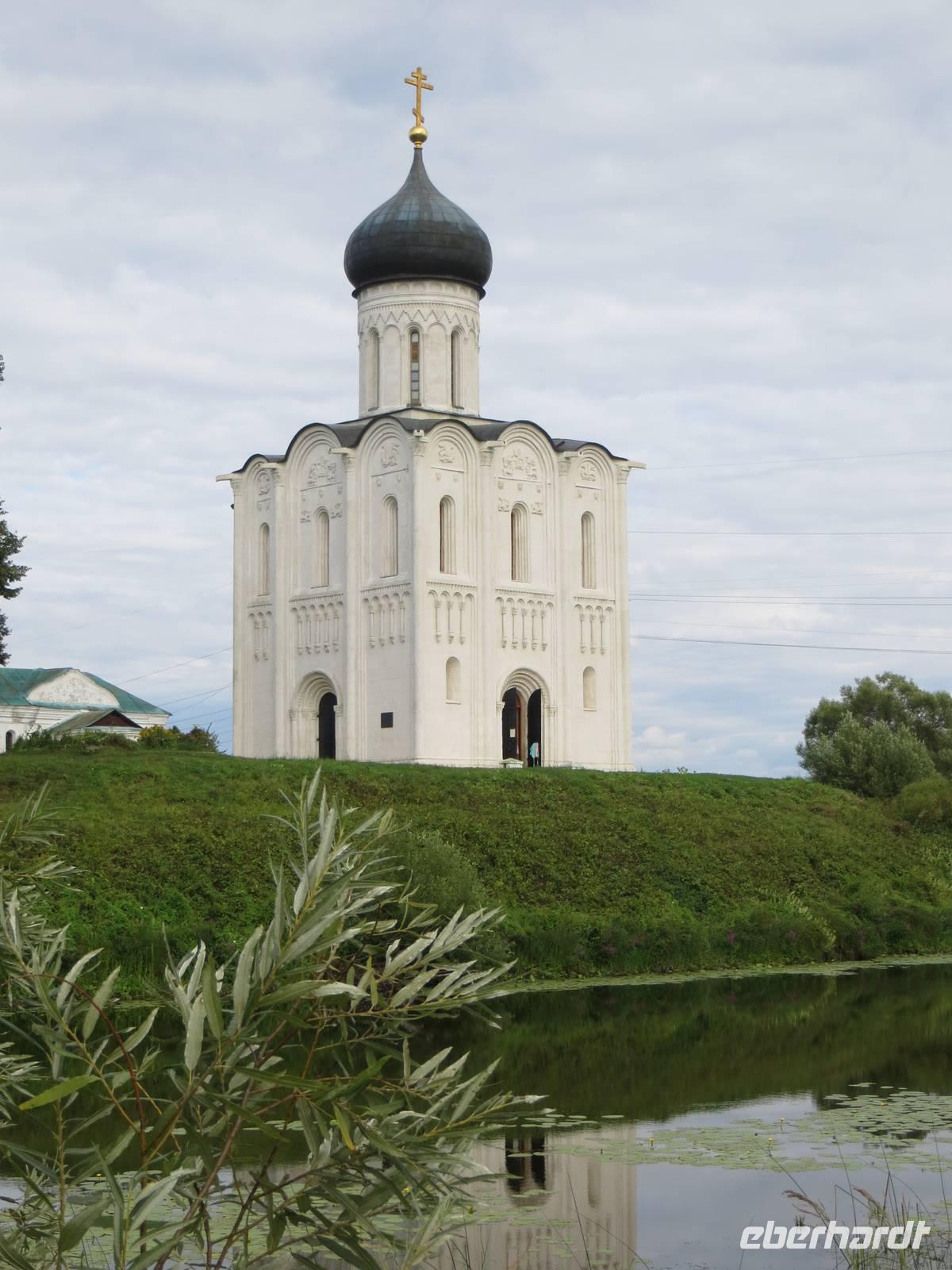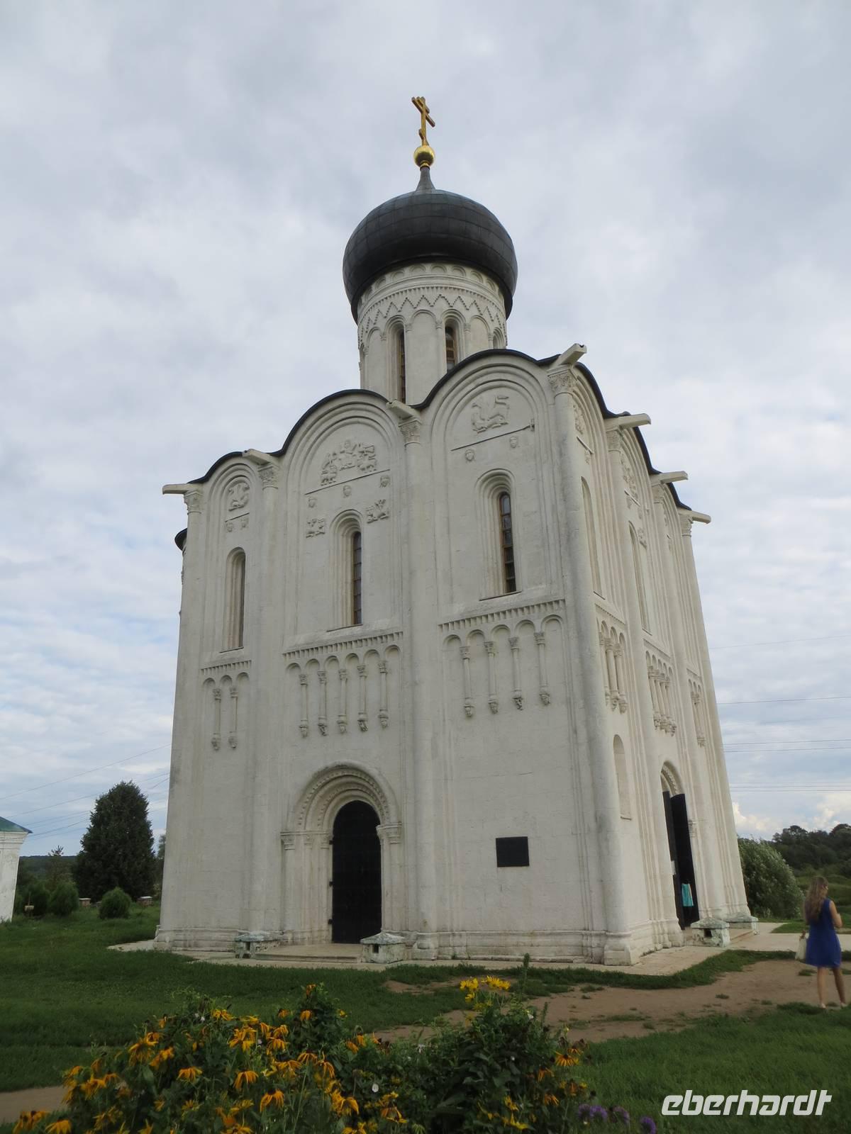 Das Moskaus Straßen auch an einem Montagvormittag voll sind, merkten wir recht bald als wir auf dem MKAD Moskau von Süd nach Nordost umrundeten. Dann ging es etwas zügiger in Richtung Wladimir, Stadt 200 km nordöstlich von Moskau mit immerhin 350.000 Einwohnern. Uns interessierten jedoch vorrangig die Maria-Himmelfahrts-Kirche, das Dimitrius-Kloster und das Goldene Tor; Zeitzeugen der Entwicklung der Rus aus dem 12. Jahrhundert mit Unesco-Welterbestatus. Wenige Kilometer von Wladimir entfernt liegt Boguljubovo mit seinem weiß strahlendem Kloster mit blauen Kuppeln; ein aktives, sehr religiöses und monarchistisch orientiertes Kloster mit wohl achtzig Nonnen und einem perfekt geführten Klostergarten zur Eigenversorgung. Ein Stück unterhalb des Klosters am Zusammenfluss von Kljasma und Nerl liegt die Pokrov-Kirche, die als schönste Kirche des Wladimirer Gebiets gilt. Ein Spaziergang von zwei Kilometern durch Wiesen führte uns zur Kirche aus dem Jahr 1162. Auf unserem Weg zum Hotel in Susdal hielten wir am Hofe einer Künstlerfamilie zum Abendessen. Salzgurken, eingelegte Tomaten und Kapusta, russischer Gemüsesalat und eine mit Kraut gefüllte Pirogge, Hähnchenbrust, Ebereschenkonfitüre zum Tee und süße Piroggen, herrliches Brot mit Koriander waren ein typisch russisches Mahl. Nun angekommen in Russland krönten wir dies mit einem Vodka, Moosbeeren oder Ebereschenschnaps nach Wahl. Gegen acht, dann Einzug in unser Hoteldorf am Rand von Susdal, einst Gorjatschie Klutschi genannt, nun Heliopark. Die Abendsonne verwandelte die Banja-Häuschen am Wasser in ein schönes Abendflair.