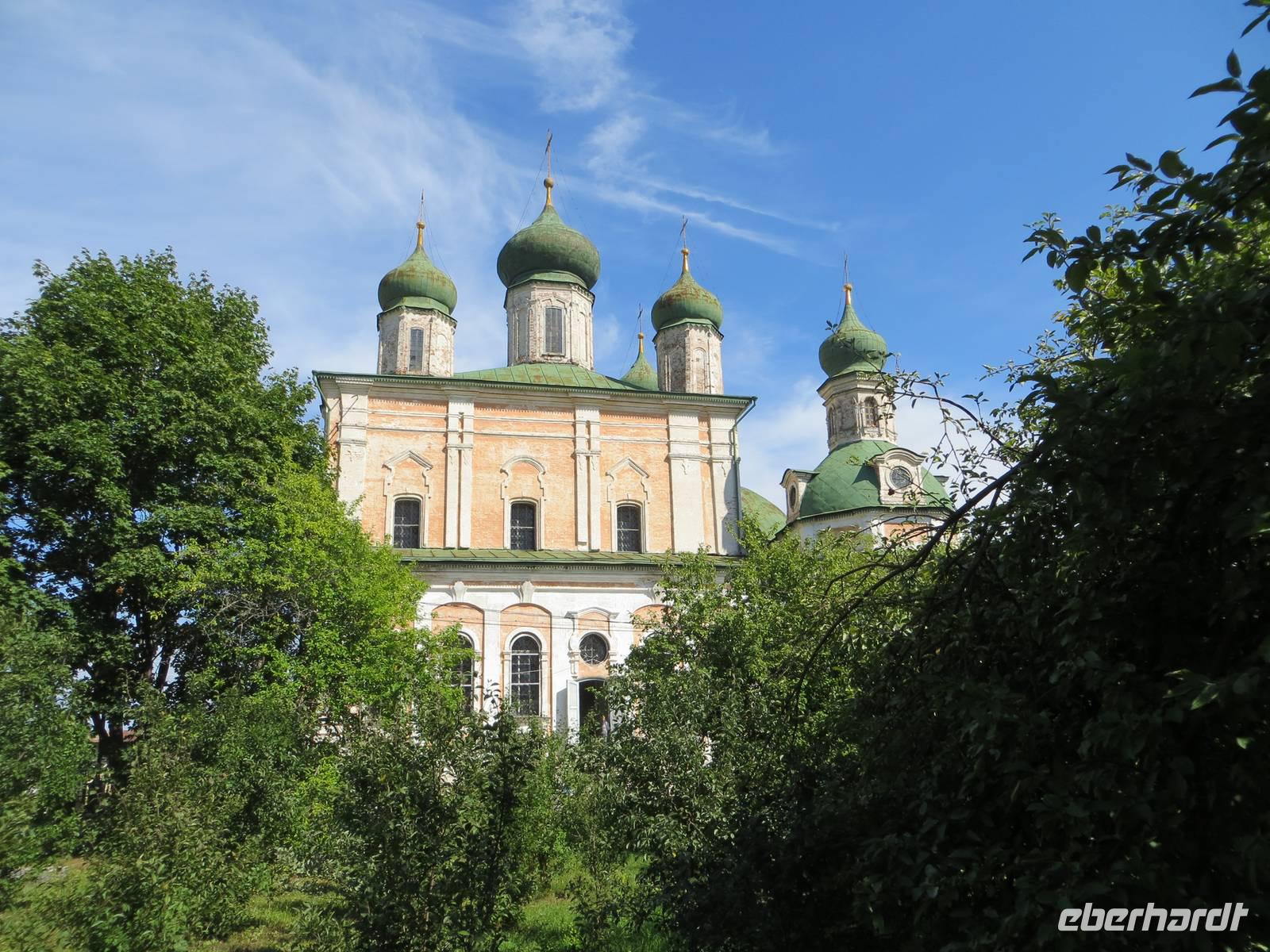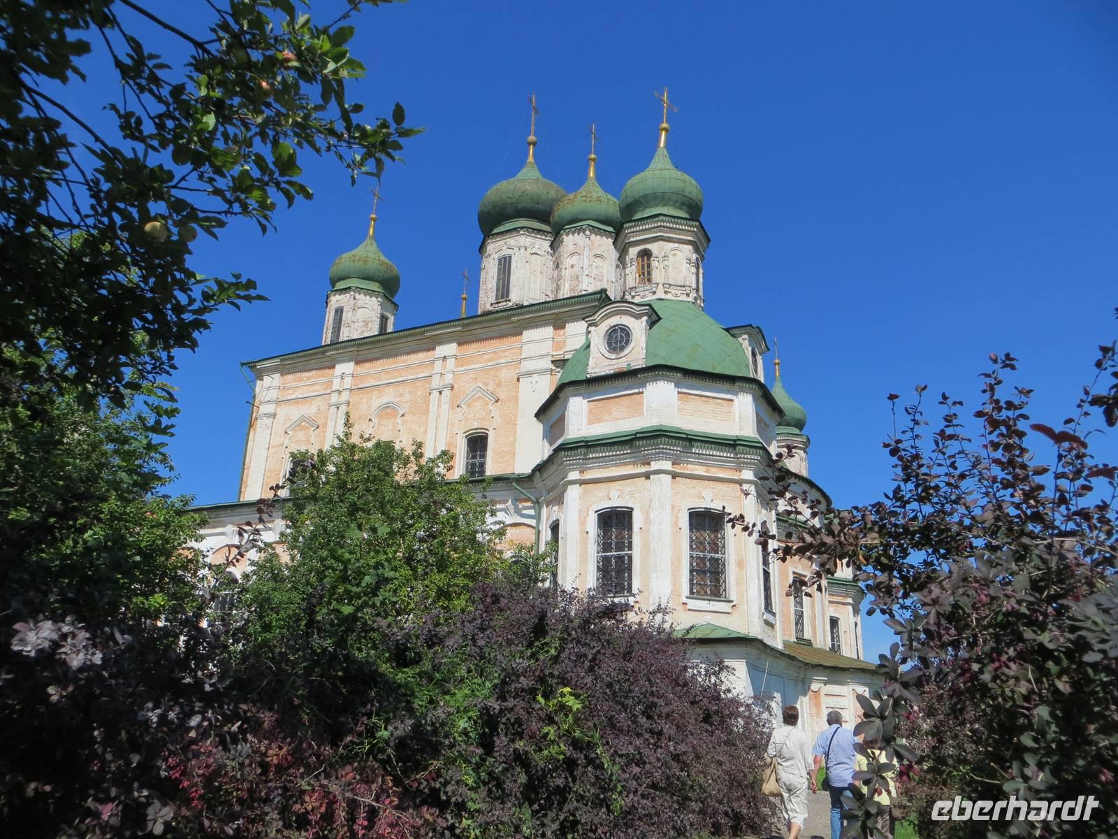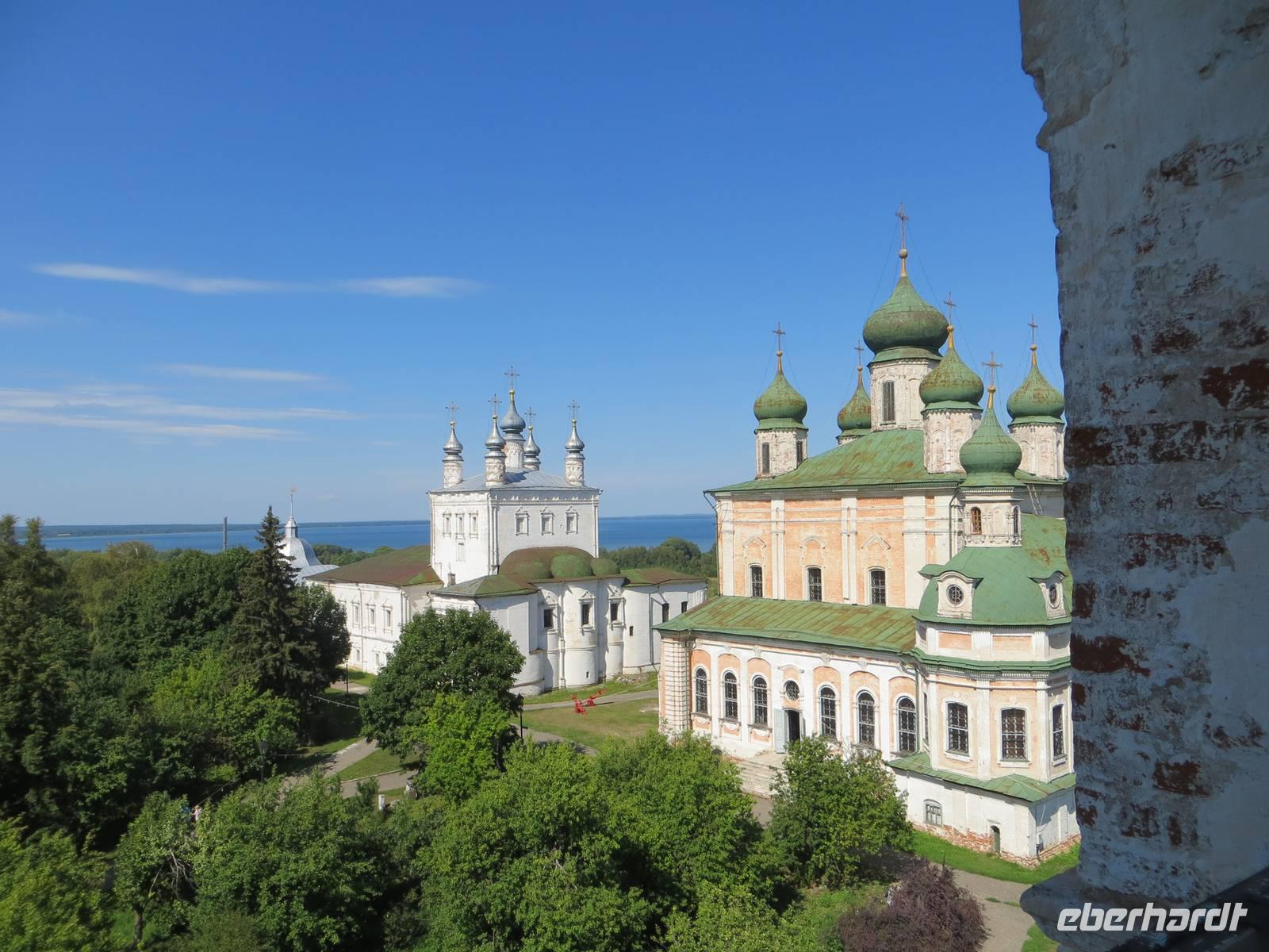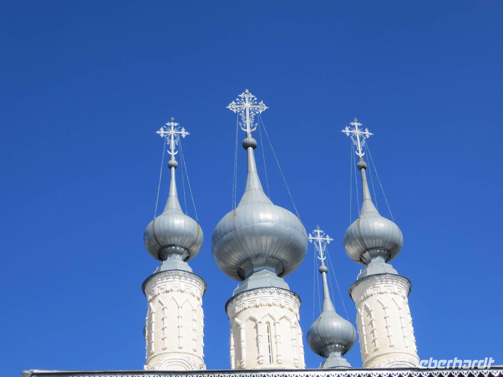 Durch touristisch völlig unerschlossenes Gebiet ging es nördlich Moskaus durch Felder, Wiesen und Wälder; vorbei an meist einstöckigen Holzhäusern, riesigen Pflanzen Bärenklau und über manche Welle im Straßenbelag. Erkenntnis: Russland beginnt bereits vor den Toren Moskaus. Zur Mittagszeit trafen wir in Pereslawl Salesski ein, einer Stadt, die 1152 durch Juri Dolguruki gegründet wurde. Ein erster Fotostopp an der Christi-Verklärungs-Kathedrale am hiesigen Roten Platz. Besichtigung dann des Bergklosters. Vom gewaltigen Bauwerk auf einem Hügel besteht ein prächtiger Blick auf den Ort mit zahlreichen glitzernden Kirchtürmen bis hinüber zum Plewtschejewo-See. Hier plante einst Peter I. den Aufbau einer russischen Marine.