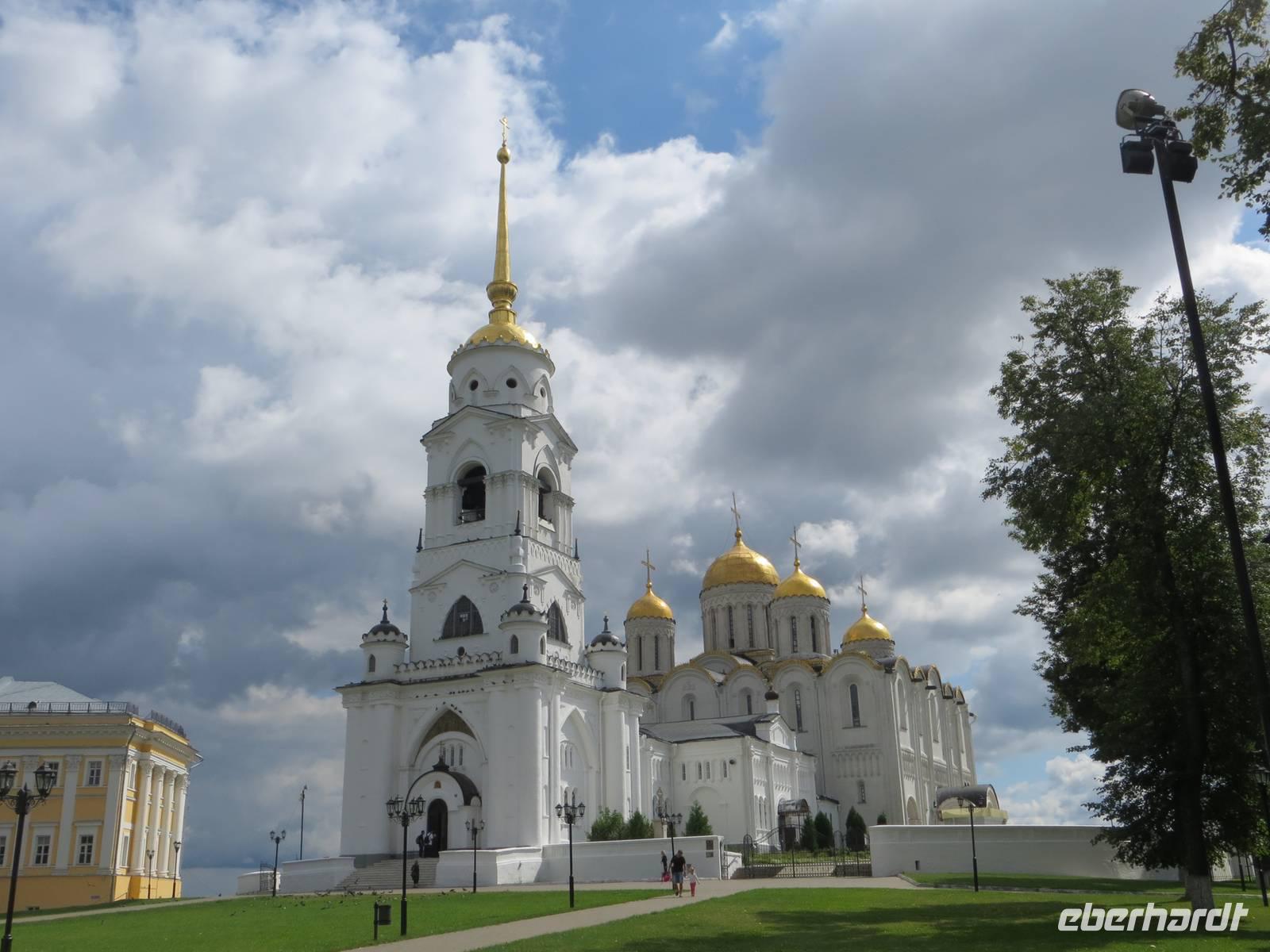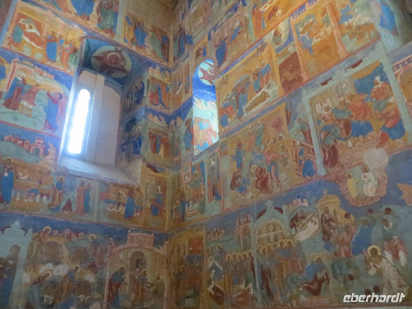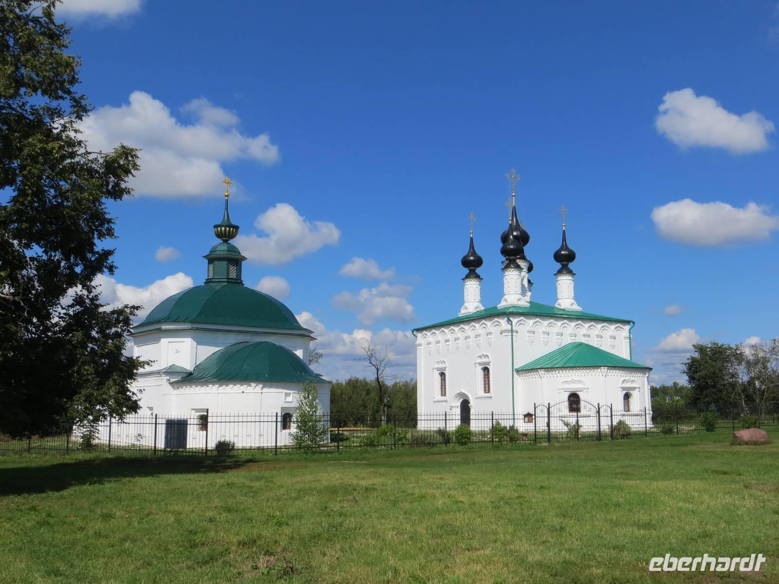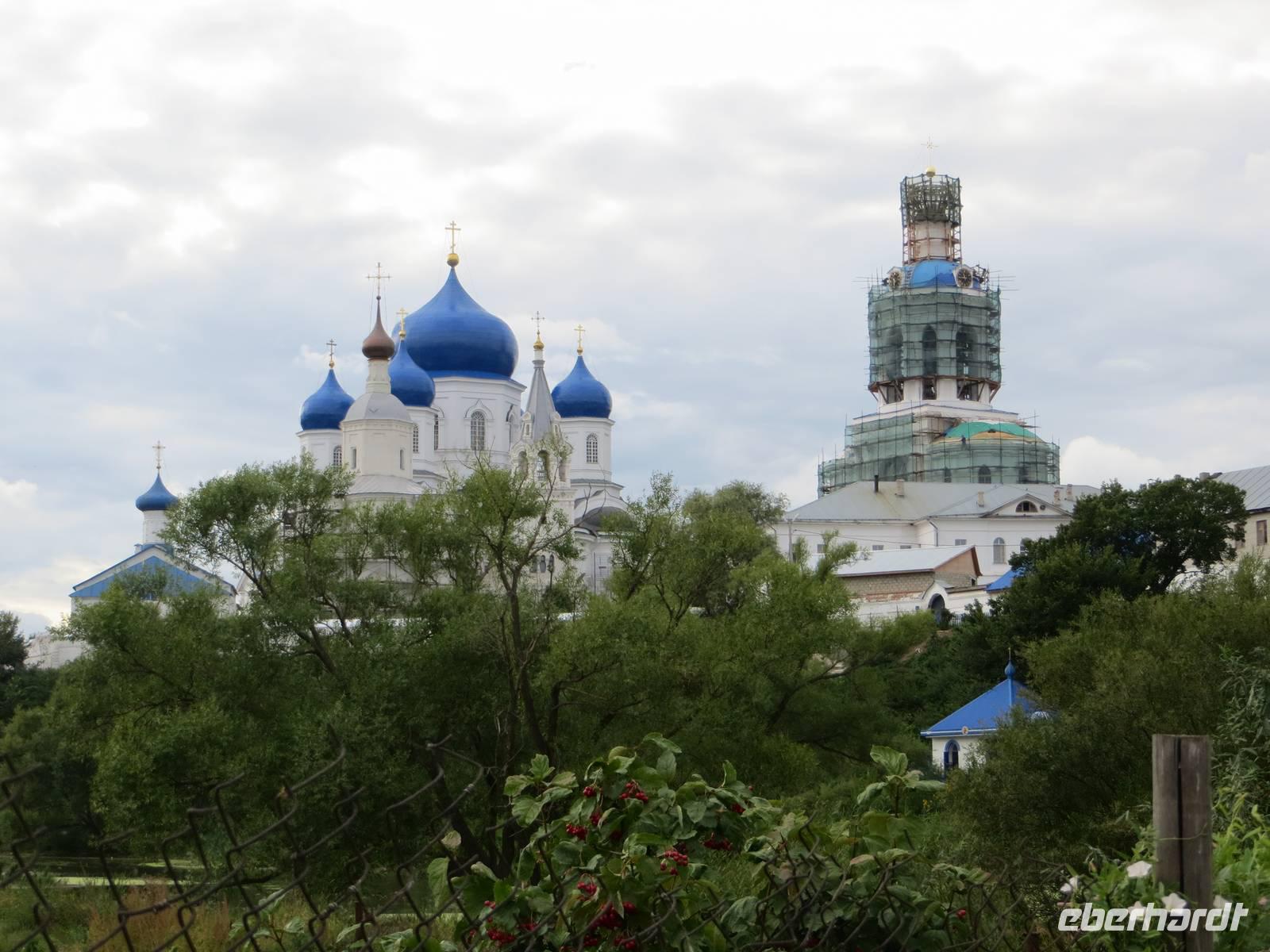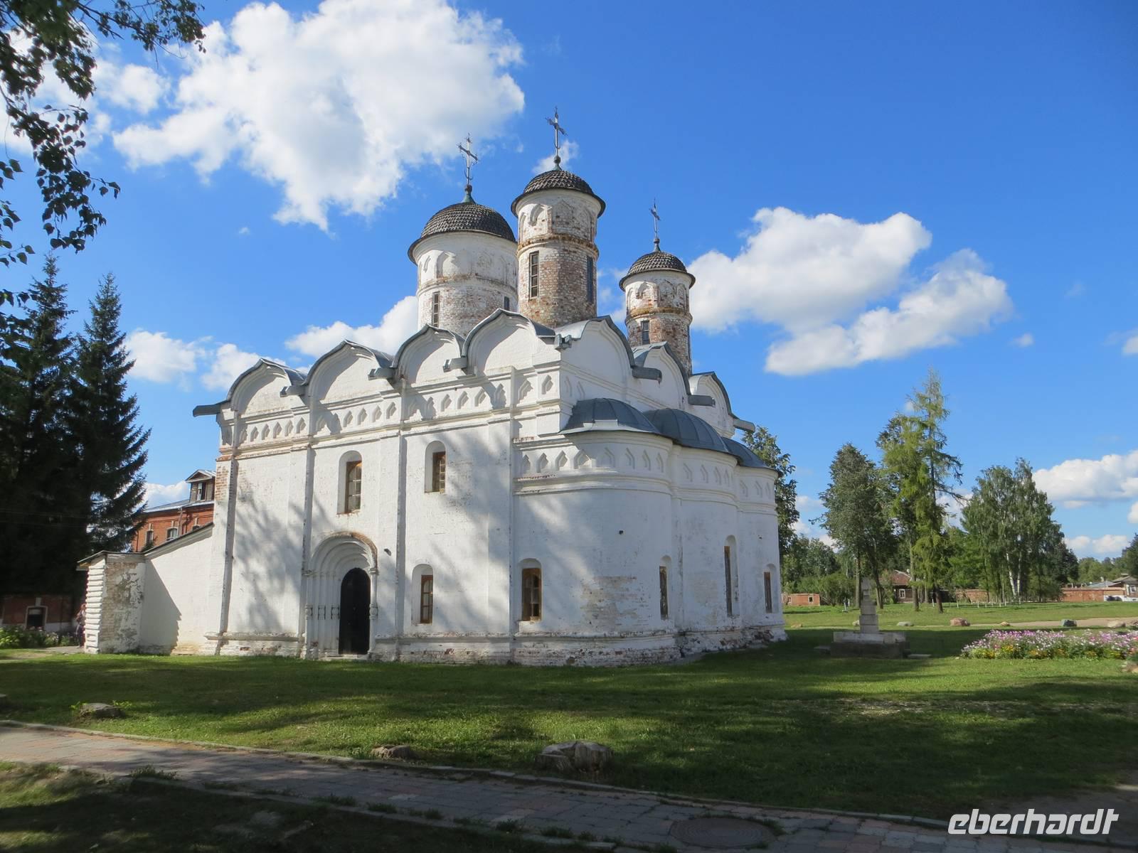 Durch touristisch völlig unerschlossenes Gebiet ging es nördlich Moskaus durch Felder, Wiesen und Wälder; vorbei an meist einstöckigen Holzhäusern, riesigen Pflanzen Bärenklau und über manche Welle im Straßenbelag. Erkenntnis: Russland beginnt bereits vor den Toren Moskaus. Zur Mittagszeit trafen wir in Pereslawl Salesski ein, einer Stadt, die 1152 durch Juri Dolguruki gegründet wurde. Ein erster Fotostopp an der Christi-Verklärungs-Kathedrale am hiesigen Roten Platz. Besichtigung dann des Bergklosters. Vom gewaltigen Bauwerk auf einem Hügel besteht ein prächtiger Blick auf den Ort mit zahlreichen glitzernden Kirchtürmen bis hinüber zum Plewtschejewo-See. Hier plante einst Peter I. den Aufbau einer russischen Marine.