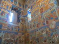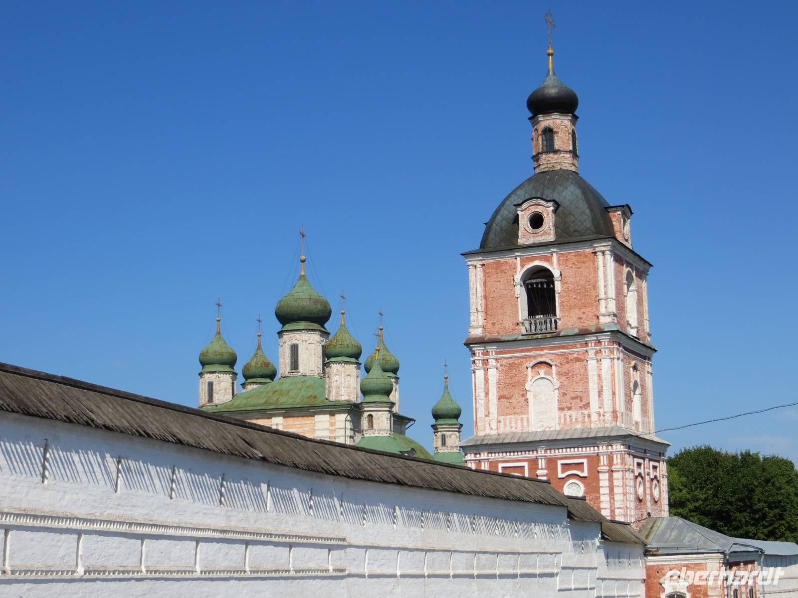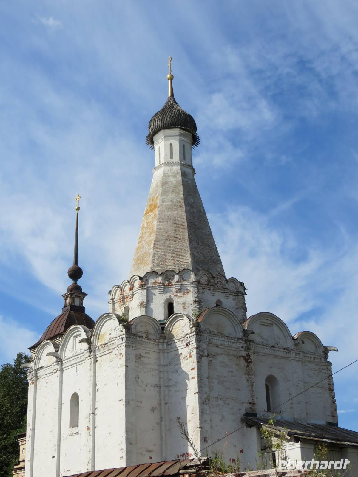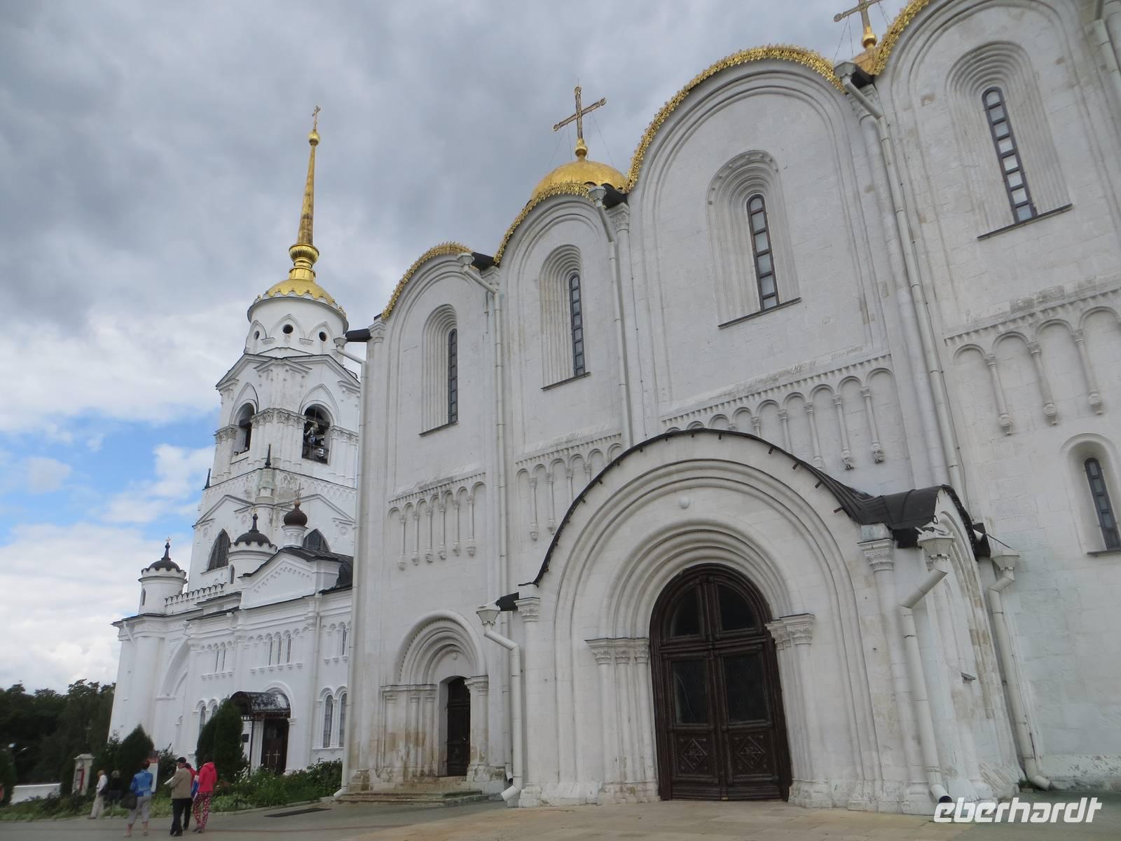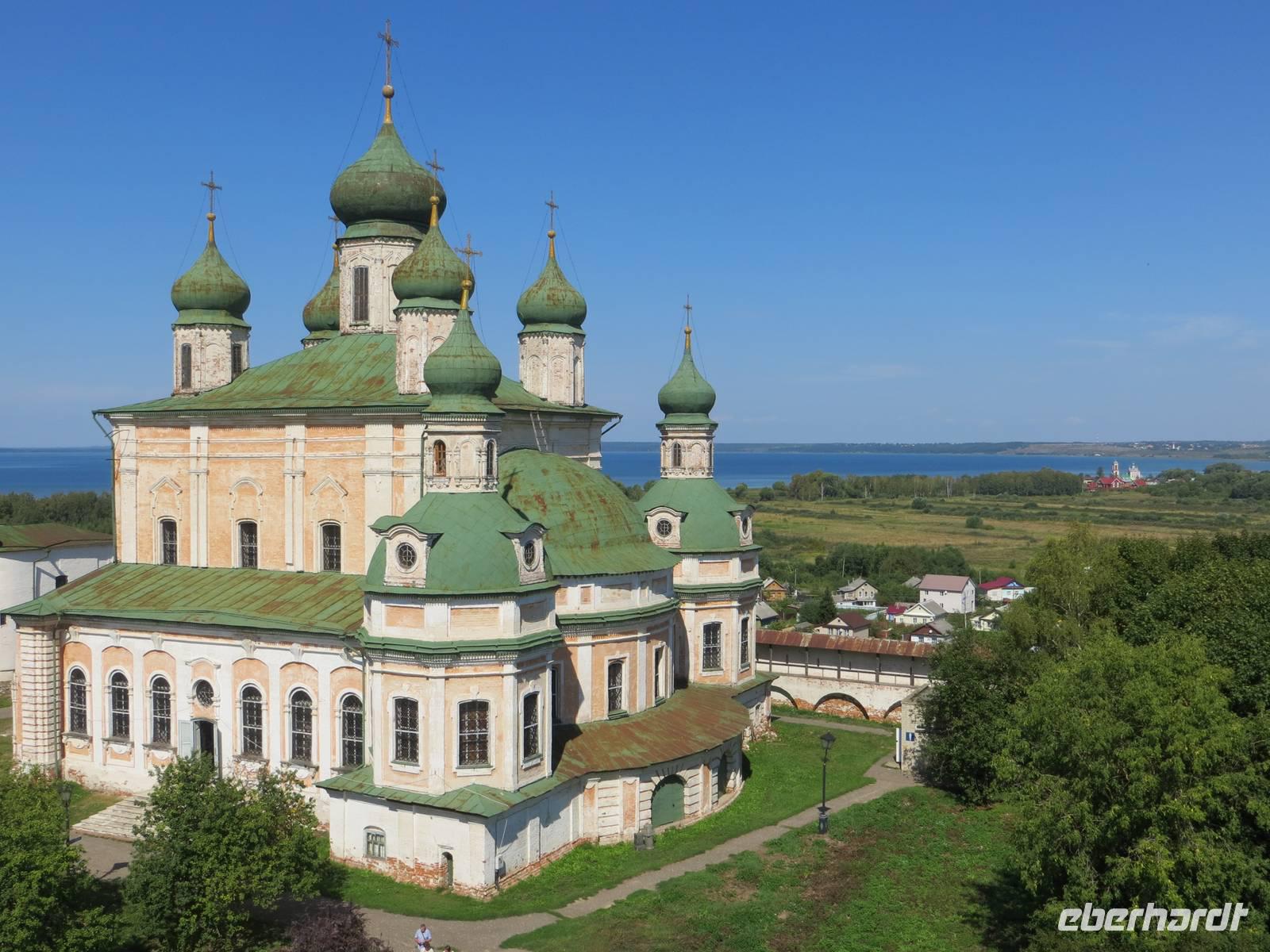 Durch touristisch völlig unerschlossenes Gebiet ging es nördlich Moskaus durch Felder, Wiesen und Wälder; vorbei an meist einstöckigen Holzhäusern, riesigen Pflanzen Bärenklau und über manche Welle im Straßenbelag. Erkenntnis: Russland beginnt bereits vor den Toren Moskaus. Zur Mittagszeit trafen wir in Pereslawl Salesski ein, einer Stadt, die 1152 durch Juri Dolguruki gegründet wurde. Ein erster Fotostopp an der Christi-Verklärungs-Kathedrale am hiesigen Roten Platz. Besichtigung dann des Bergklosters. Vom gewaltigen Bauwerk auf einem Hügel besteht ein prächtiger Blick auf den Ort mit zahlreichen glitzernden Kirchtürmen bis hinüber zum Plewtschejewo-See. Hier plante einst Peter I. den Aufbau einer russischen Marine.