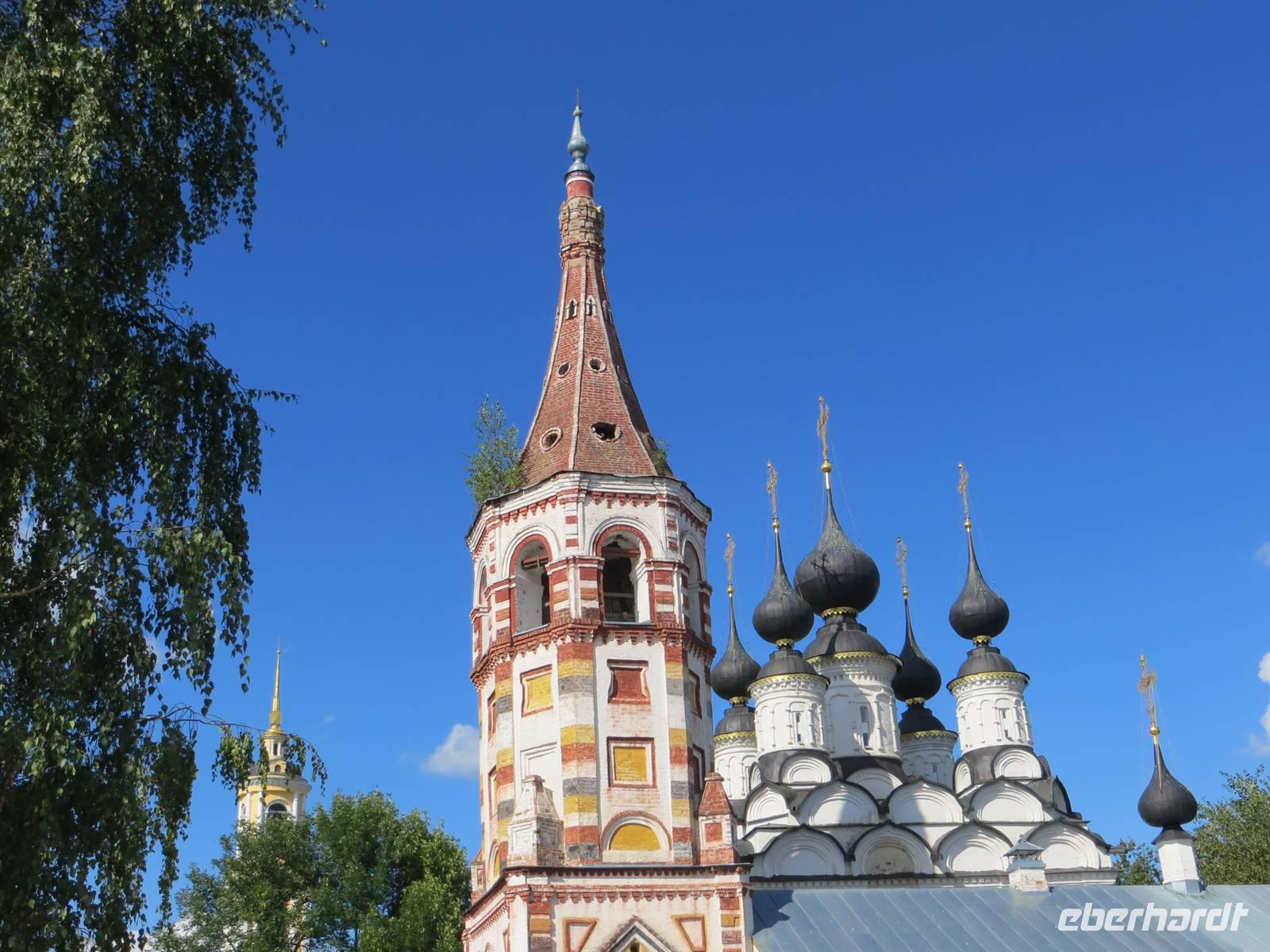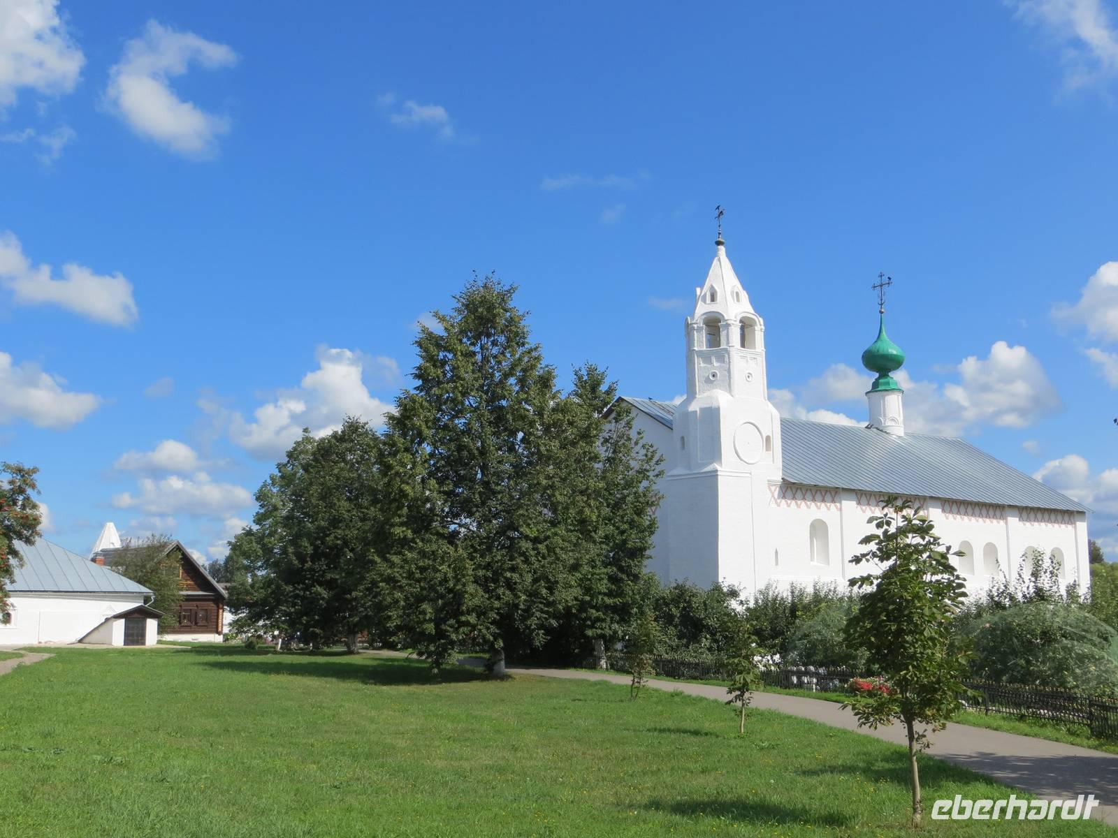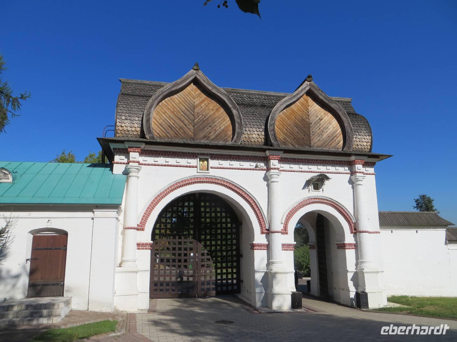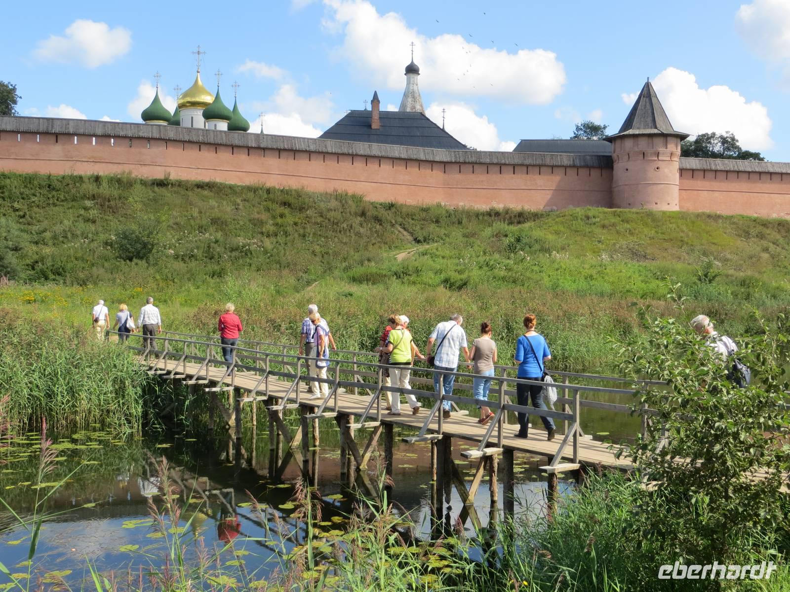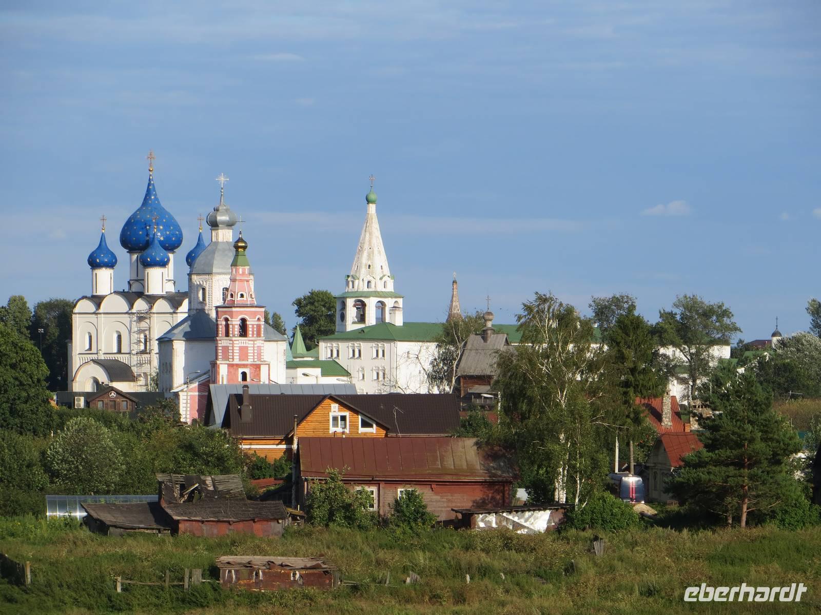 Zum gut ausgeschlafenen Vormittagsstart ging es mit einer kurzen Busfahrt zum Freilichtmuseum für ländliche Kultur zu einem Spaziergang durch Bauernhäuser, in die alte Holzkirche und zum Lauschen russischer Melodien. Zu Fuß überquerten wir dann das Flüsschen Kaminka, um nun leicht auf den alten Wall zum Kreml mit der Kathedrale der Geburt der Gottesmutter zu steigen. Besonders beeindruckend hier die siebenhundert Jahre alten vergoldeten Türen. Im Westen von Susdal am gegenüberliegenden Flusslauf liegt das Maria-Schutz-Kloster, seit einigen Jahren wieder aktives Kloster mit Nonnen. Einst war dies auch „Alterssitz" von Gattinnen russischer Großfürsten und Zaren, so sich die Herren eine neue Auserwählte gesucht hatten. Vom Kloster bummelten wir erneut über den Fluss und stiegen hinauf zum Erlöser-Euthymios-Kloster, einem Wehrkloster aus dem 14. Jahrhundert. Hier begrüßte uns das Glockenspiel von 19 Glocken. In der Erlöser-Verklärungs-Kirche selbst mit strahlend blauen Wandbildern - quasi die gemalte Geschichte der Bibel - lauschten wir dem Gesang eines Männergesangsquartetts in beeindruckender Akustik.