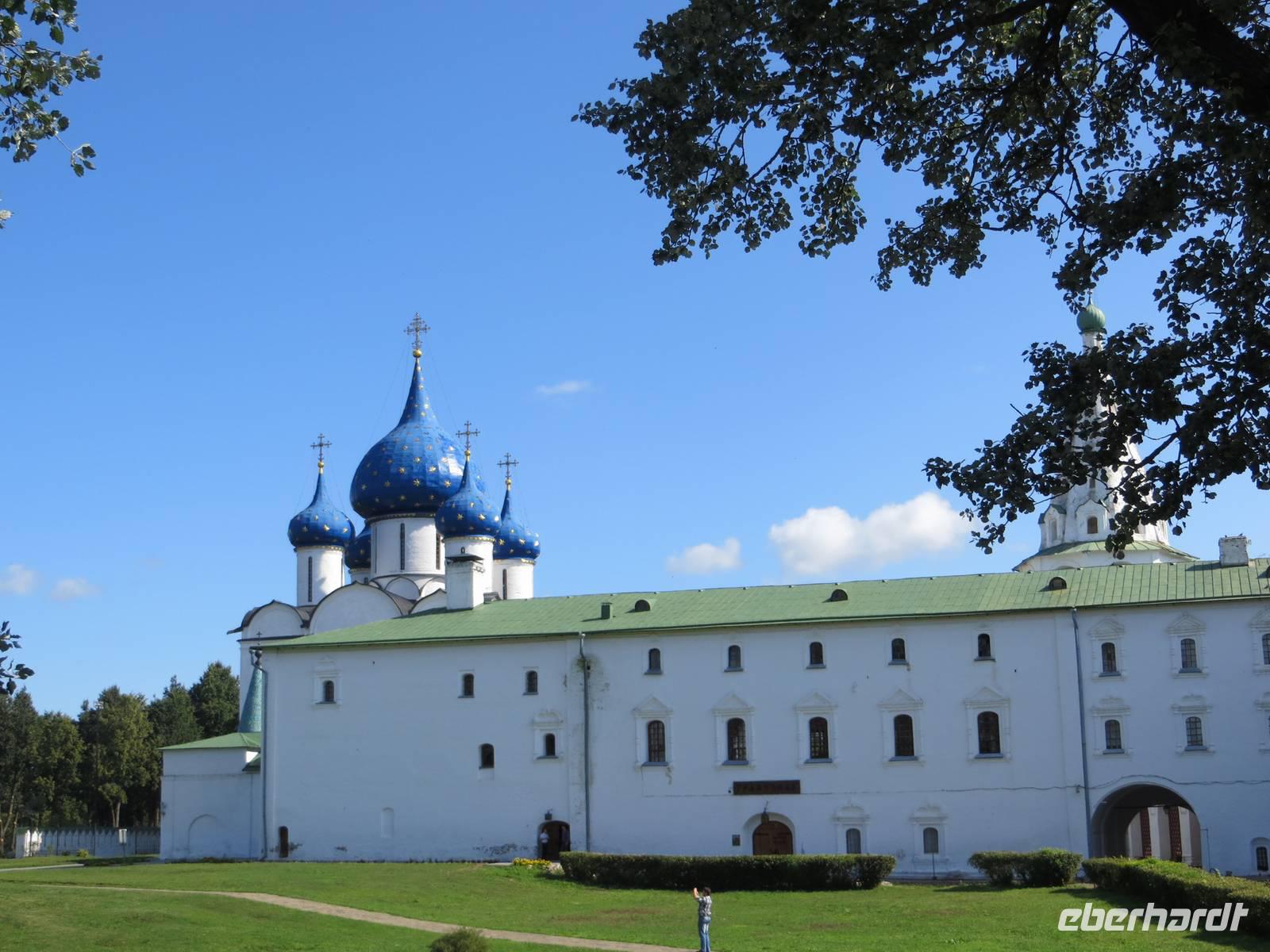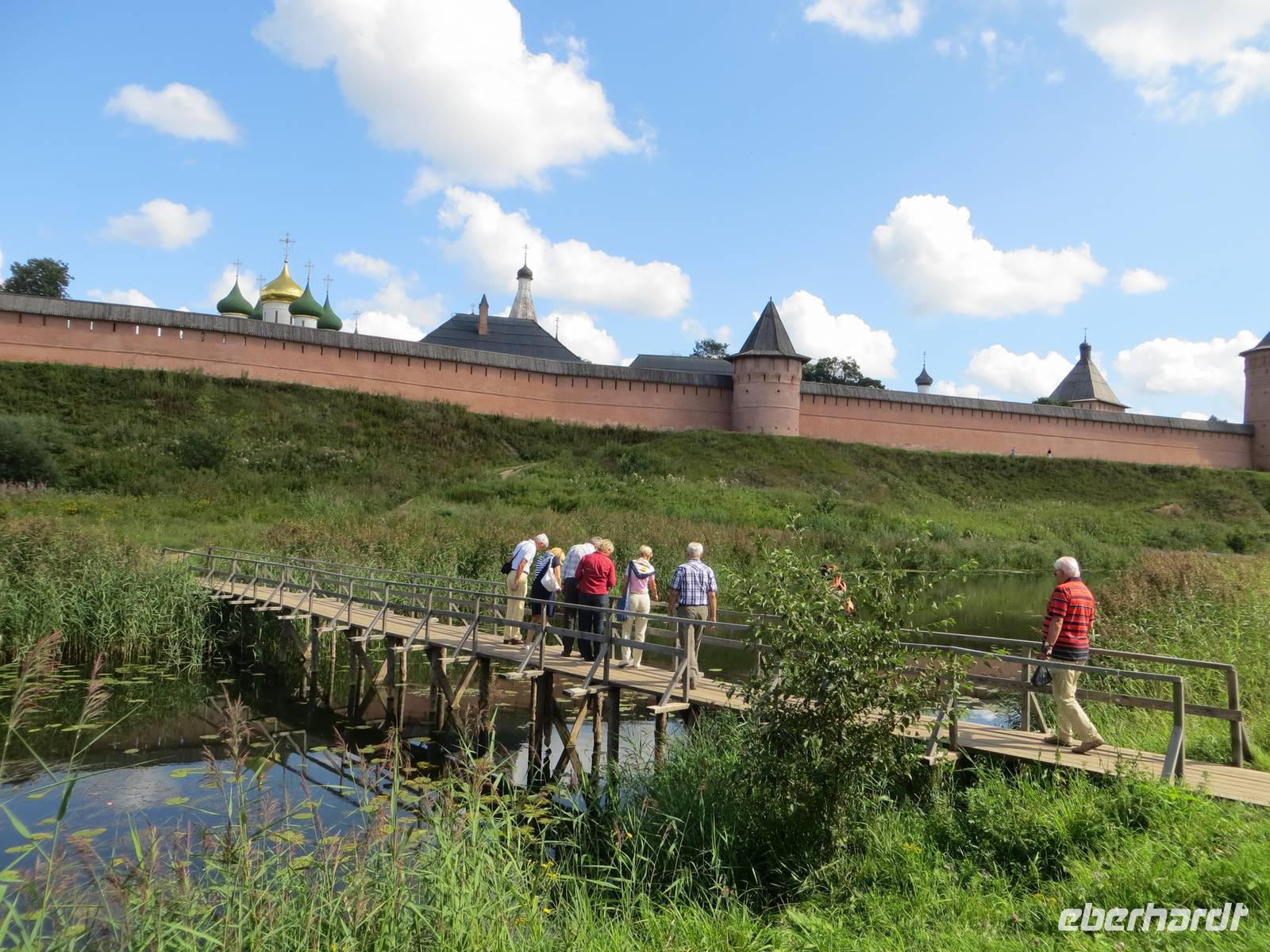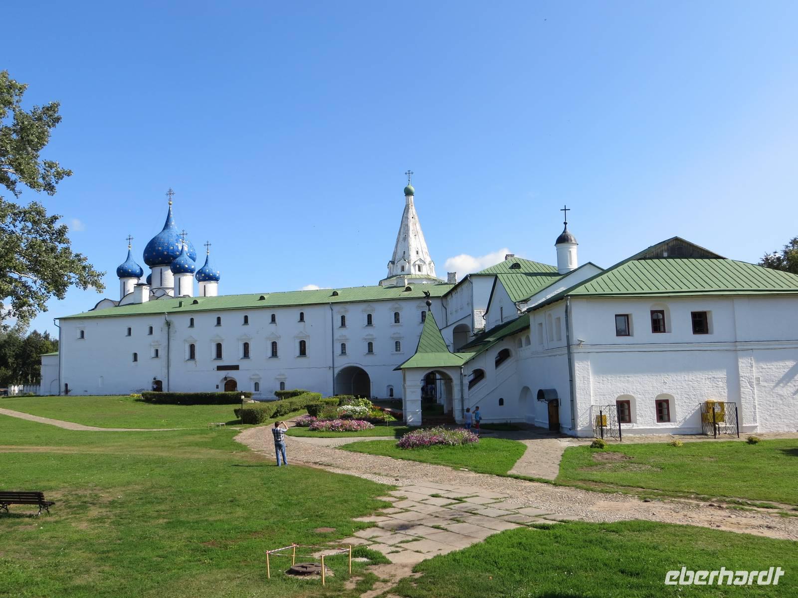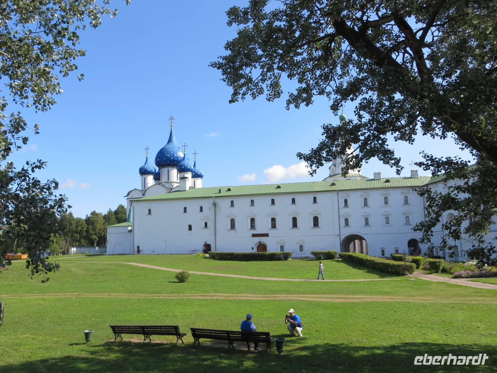 Zum gut ausgeschlafenen Vormittagsstart ging es mit einer kurzen Busfahrt zum Freilichtmuseum für ländliche Kultur zu einem Spaziergang durch Bauernhäuser, in die alte Holzkirche und zum Lauschen russischer Melodien. Zu Fuß überquerten wir dann das Flüsschen Kaminka, um nun leicht auf den alten Wall zum Kreml mit der Kathedrale der Geburt der Gottesmutter zu steigen. Besonders beeindruckend hier die siebenhundert Jahre alten vergoldeten Türen. Im Westen von Susdal am gegenüberliegenden Flusslauf liegt das Maria-Schutz-Kloster, seit einigen Jahren wieder aktives Kloster mit Nonnen. Einst war dies auch „Alterssitz" von Gattinnen russischer Großfürsten und Zaren, so sich die Herren eine neue Auserwählte gesucht hatten. Vom Kloster bummelten wir erneut über den Fluss und stiegen hinauf zum Erlöser-Euthymios-Kloster, einem Wehrkloster aus dem 14. Jahrhundert. Hier begrüßte uns das Glockenspiel von 19 Glocken. In der Erlöser-Verklärungs-Kirche selbst mit strahlend blauen Wandbildern - quasi die gemalte Geschichte der Bibel - lauschten wir dem Gesang eines Männergesangsquartetts in beeindruckender Akustik.