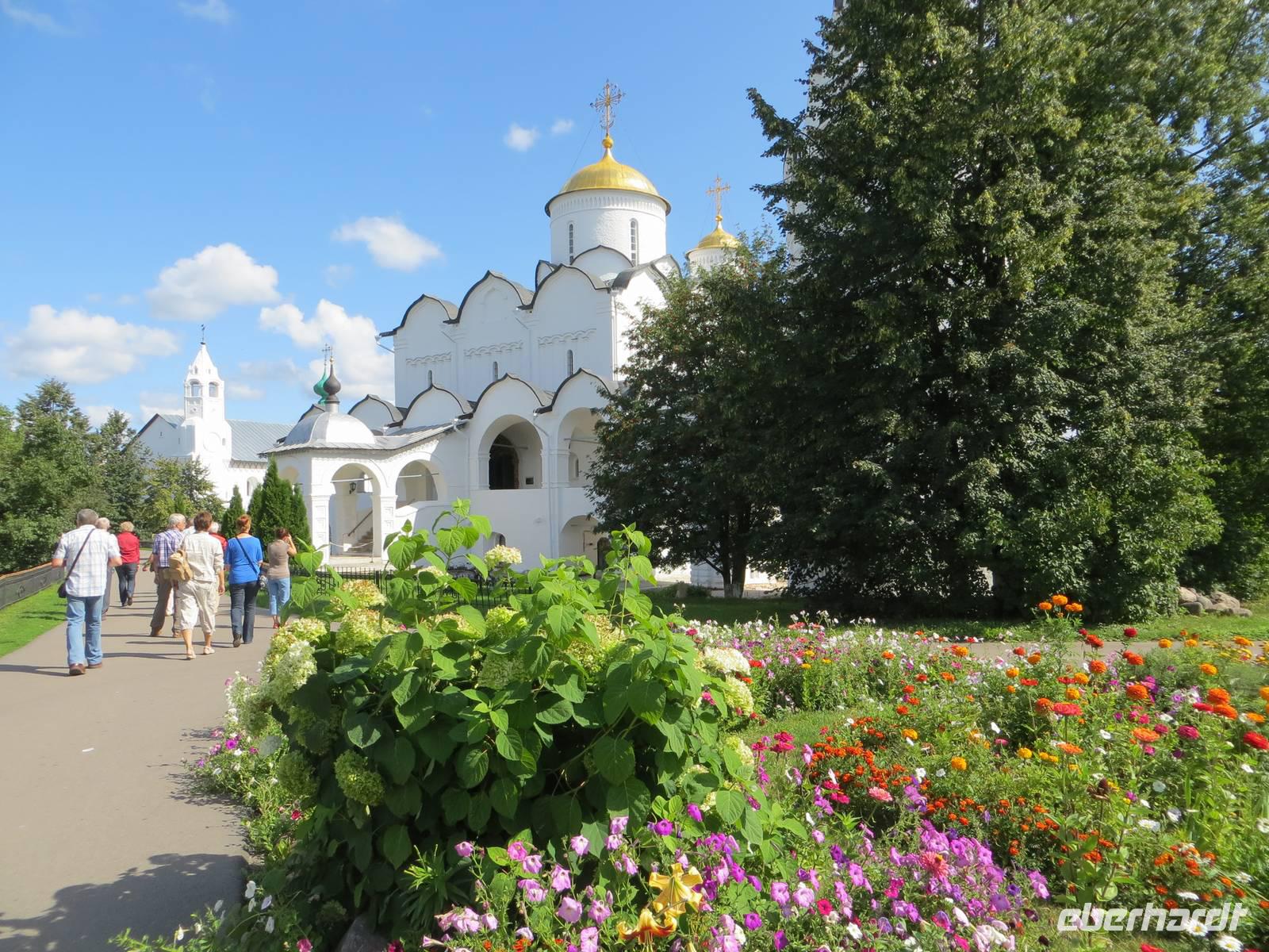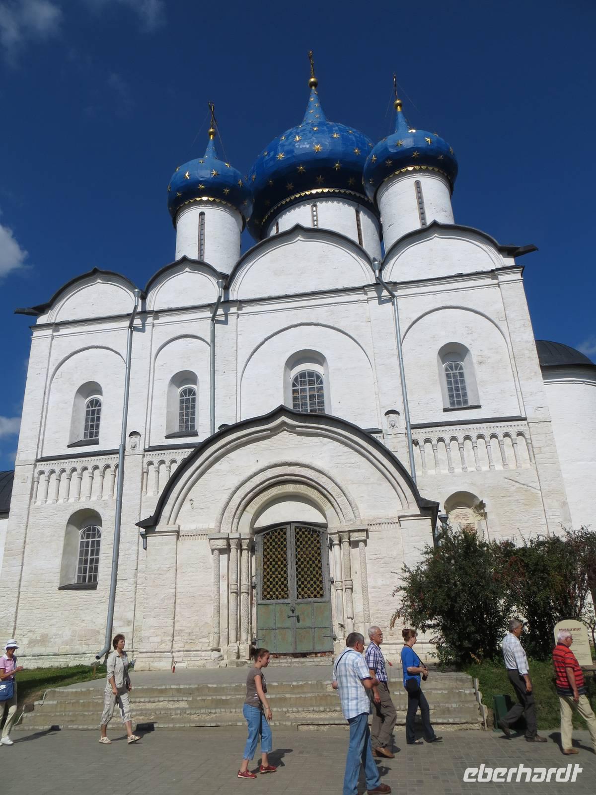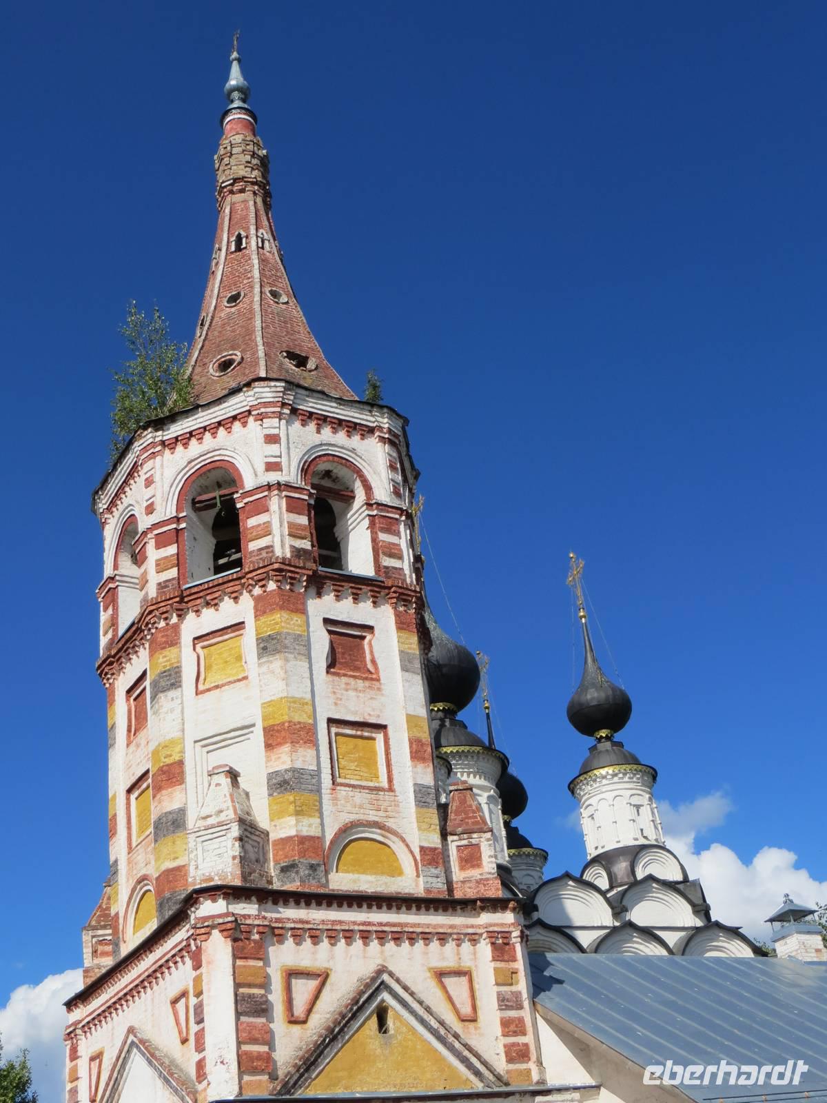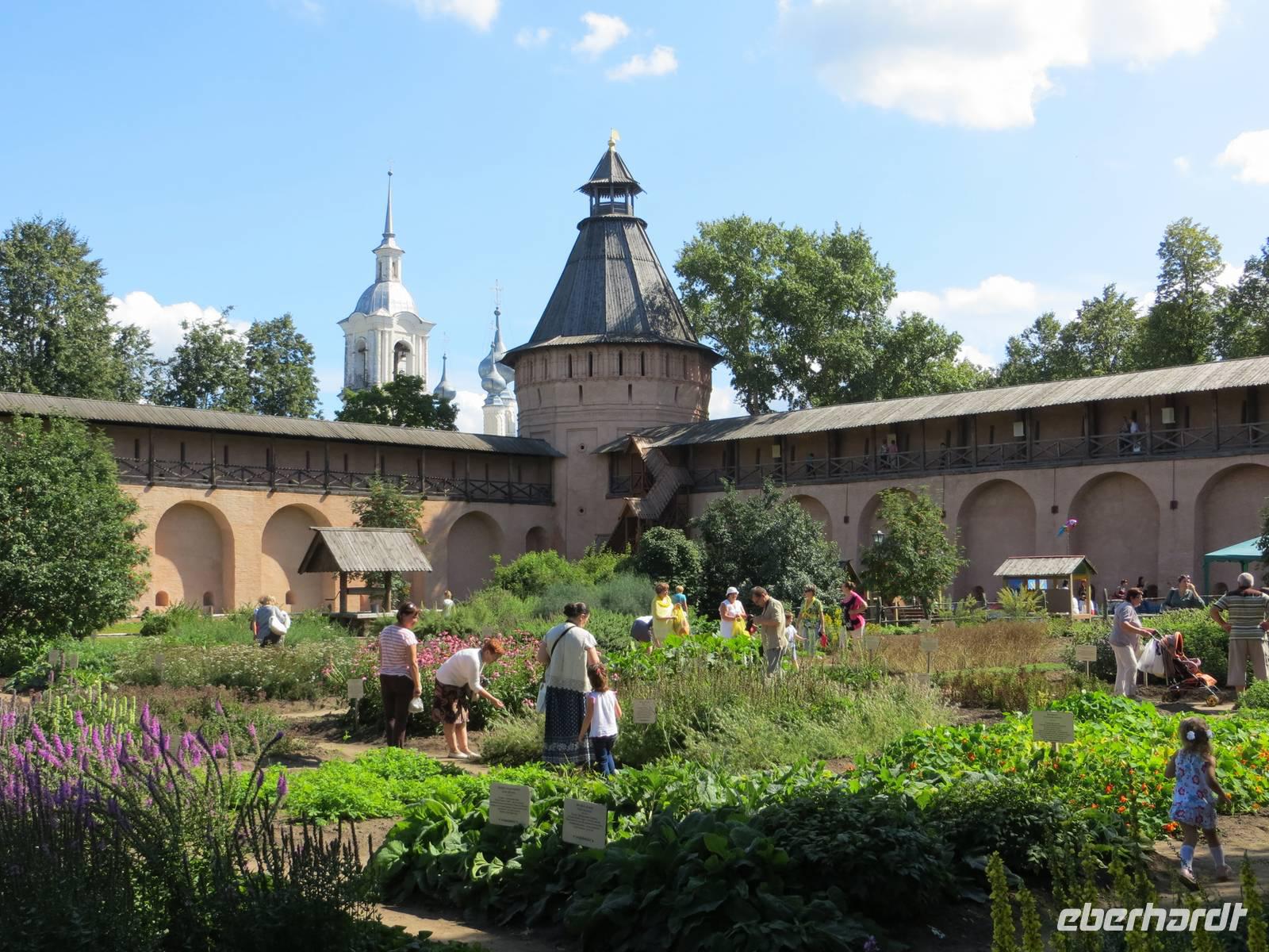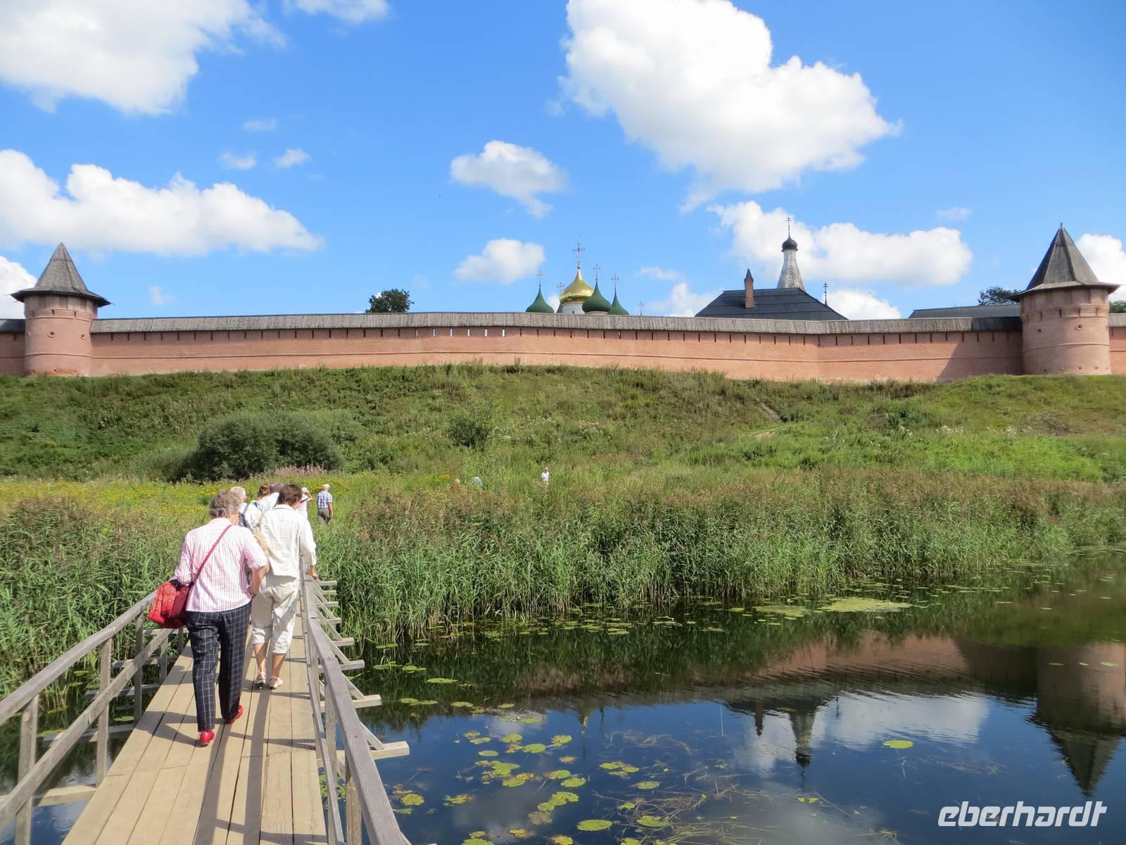 Zum gut ausgeschlafenen Vormittagsstart ging es mit einer kurzen Busfahrt zum Freilichtmuseum für ländliche Kultur zu einem Spaziergang durch Bauernhäuser, in die alte Holzkirche und zum Lauschen russischer Melodien. Zu Fuß überquerten wir dann das Flüsschen Kaminka, um nun leicht auf den alten Wall zum Kreml mit der Kathedrale der Geburt der Gottesmutter zu steigen. Besonders beeindruckend hier die siebenhundert Jahre alten vergoldeten Türen. Im Westen von Susdal am gegenüberliegenden Flusslauf liegt das Maria-Schutz-Kloster, seit einigen Jahren wieder aktives Kloster mit Nonnen. Einst war dies auch „Alterssitz" von Gattinnen russischer Großfürsten und Zaren, so sich die Herren eine neue Auserwählte gesucht hatten. Vom Kloster bummelten wir erneut über den Fluss und stiegen hinauf zum Erlöser-Euthymios-Kloster, einem Wehrkloster aus dem 14. Jahrhundert. Hier begrüßte uns das Glockenspiel von 19 Glocken. In der Erlöser-Verklärungs-Kirche selbst mit strahlend blauen Wandbildern - quasi die gemalte Geschichte der Bibel - lauschten wir dem Gesang eines Männergesangsquartetts in beeindruckender Akustik.