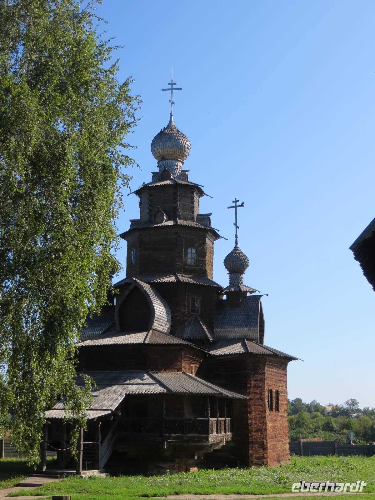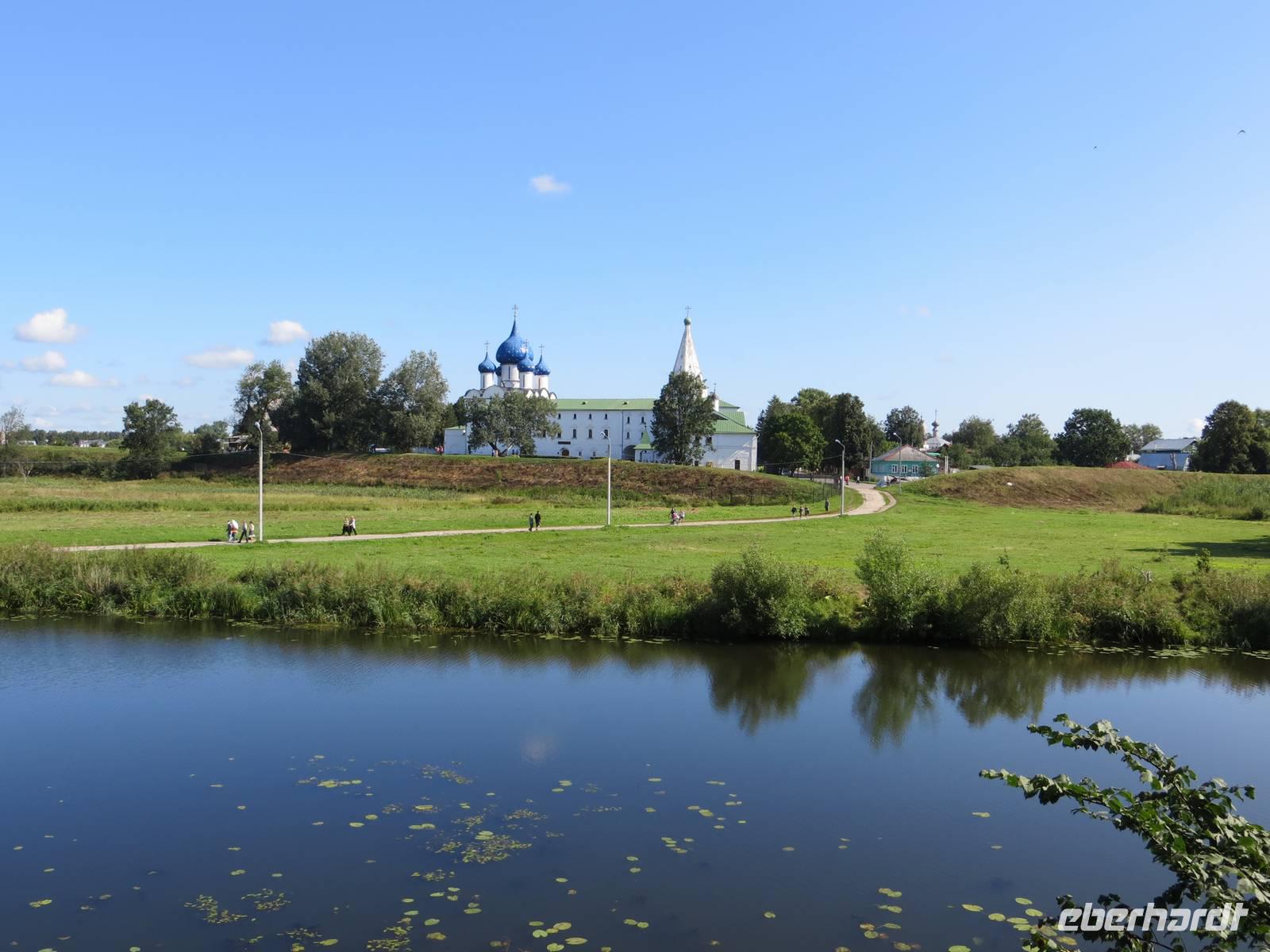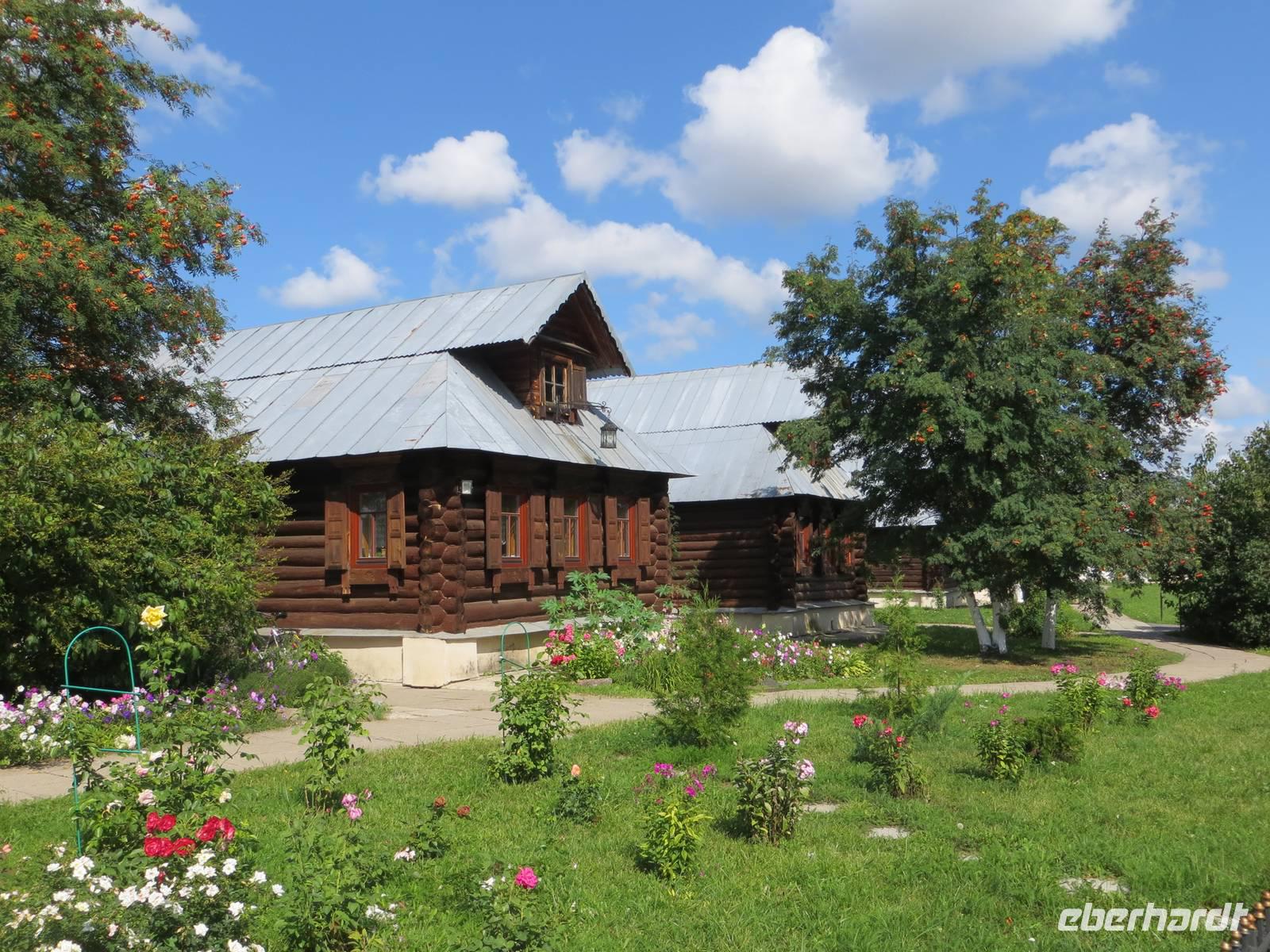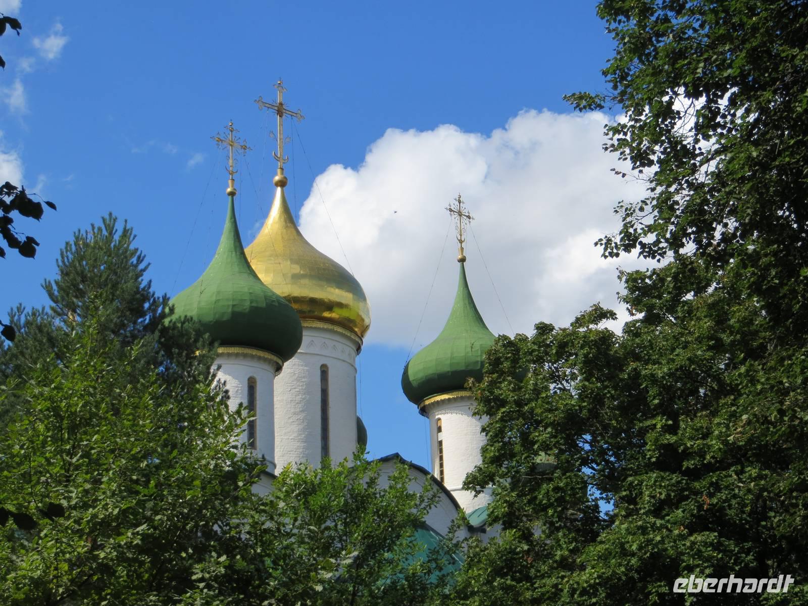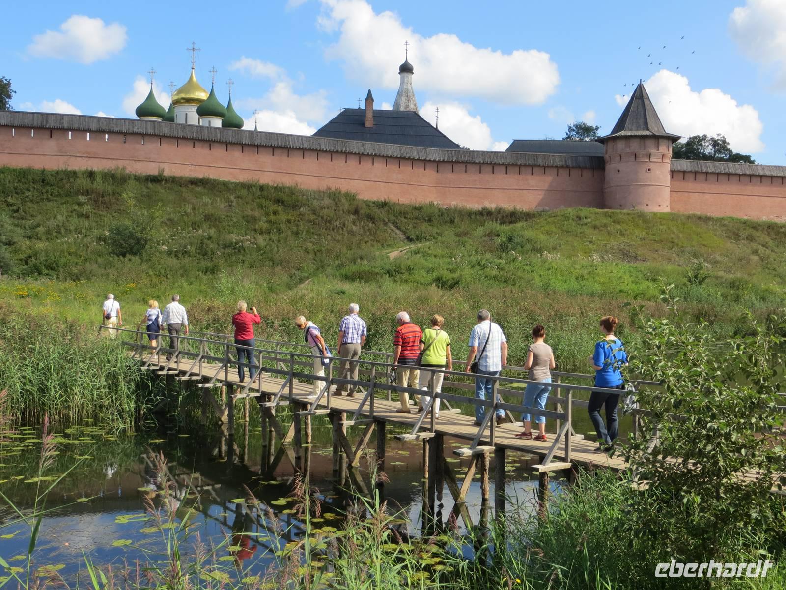 Zum gut ausgeschlafenen Vormittagsstart ging es mit einer kurzen Busfahrt zum Freilichtmuseum für ländliche Kultur zu einem Spaziergang durch Bauernhäuser, in die alte Holzkirche und zum Lauschen russischer Melodien. Zu Fuß überquerten wir dann das Flüsschen Kaminka, um nun leicht auf den alten Wall zum Kreml mit der Kathedrale der Geburt der Gottesmutter zu steigen. Besonders beeindruckend hier die siebenhundert Jahre alten vergoldeten Türen. Im Westen von Susdal am gegenüberliegenden Flusslauf liegt das Maria-Schutz-Kloster, seit einigen Jahren wieder aktives Kloster mit Nonnen. Einst war dies auch „Alterssitz" von Gattinnen russischer Großfürsten und Zaren, so sich die Herren eine neue Auserwählte gesucht hatten. Vom Kloster bummelten wir erneut über den Fluss und stiegen hinauf zum Erlöser-Euthymios-Kloster, einem Wehrkloster aus dem 14. Jahrhundert. Hier begrüßte uns das Glockenspiel von 19 Glocken. In der Erlöser-Verklärungs-Kirche selbst mit strahlend blauen Wandbildern - quasi die gemalte Geschichte der Bibel - lauschten wir dem Gesang eines Männergesangsquartetts in beeindruckender Akustik.