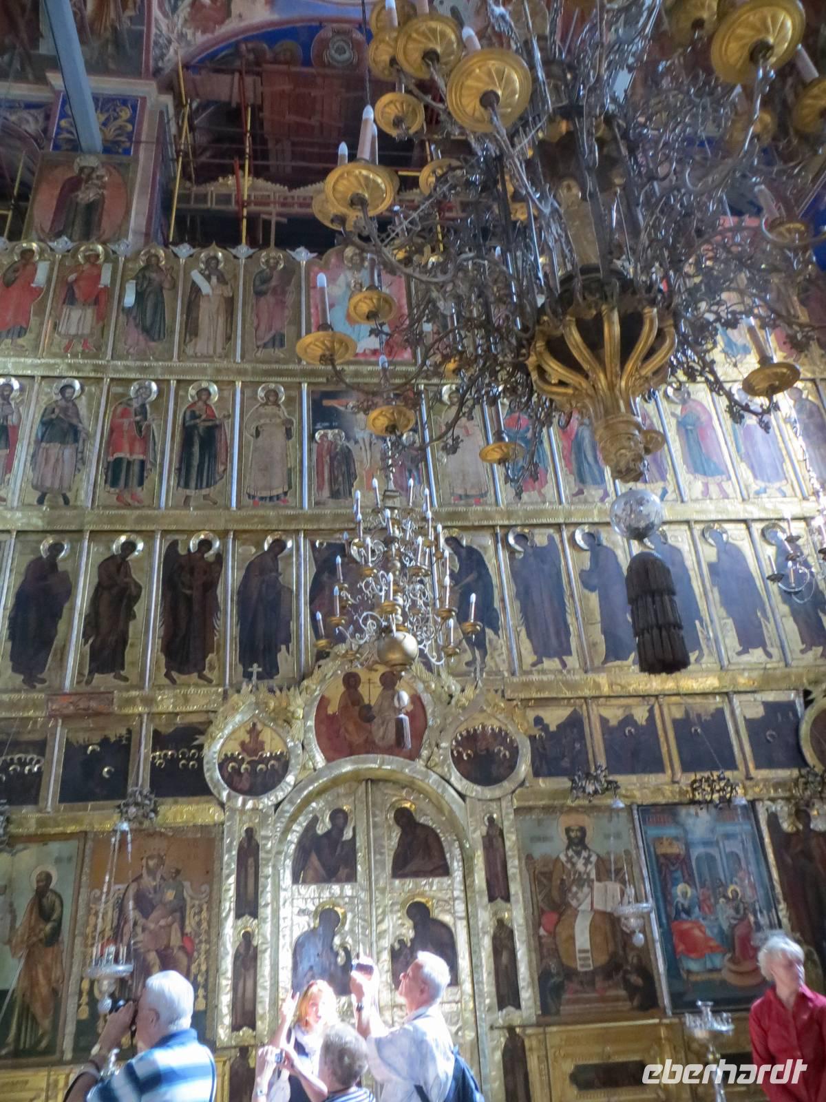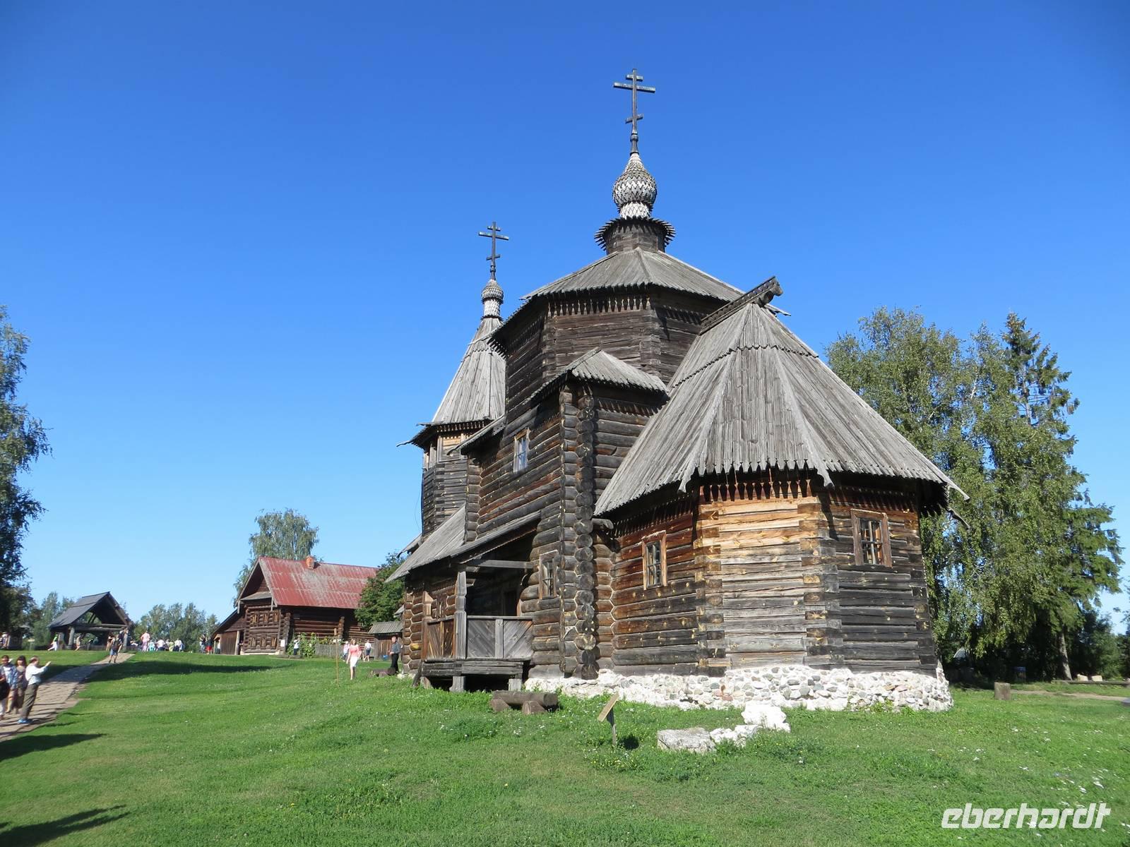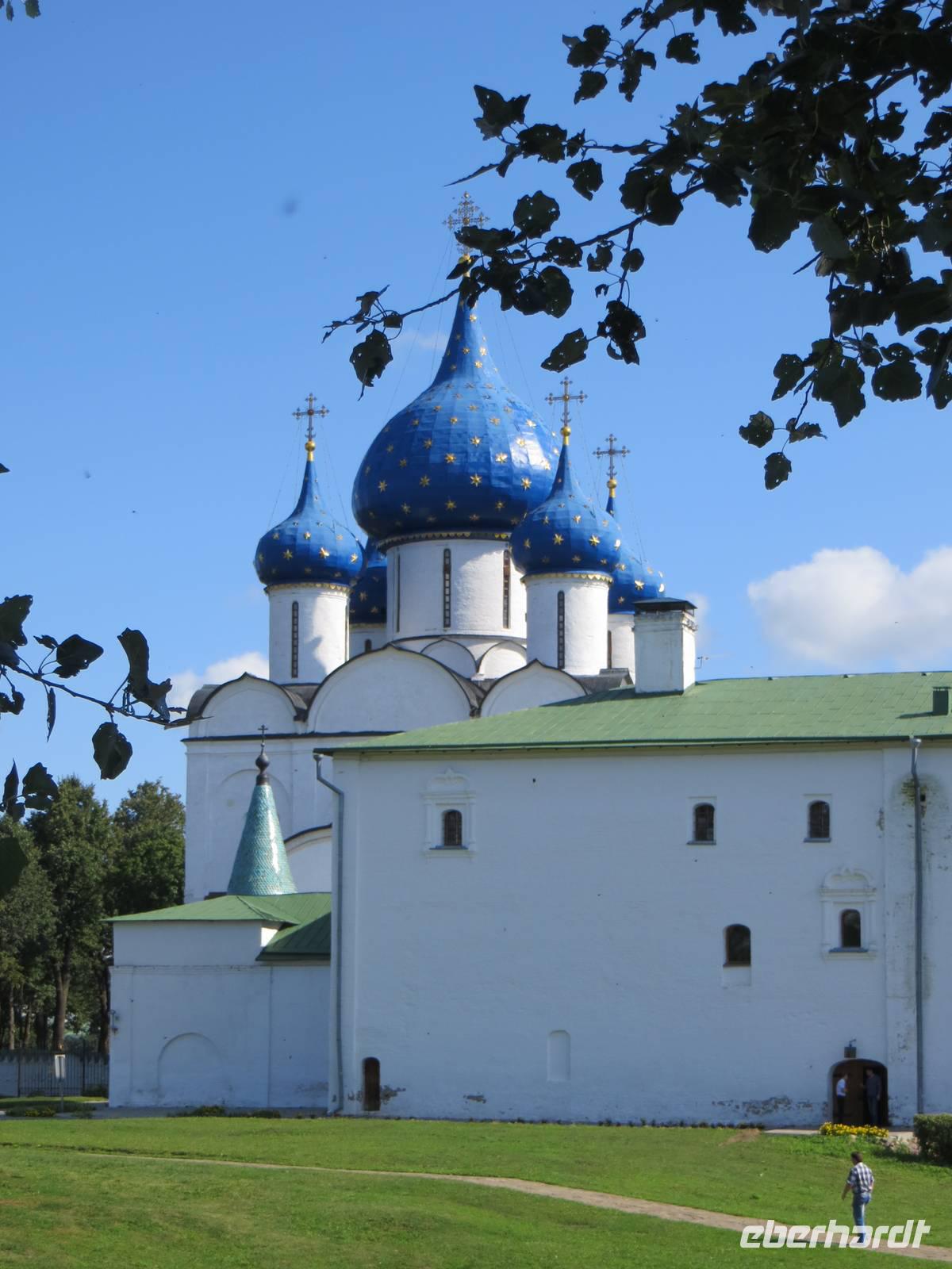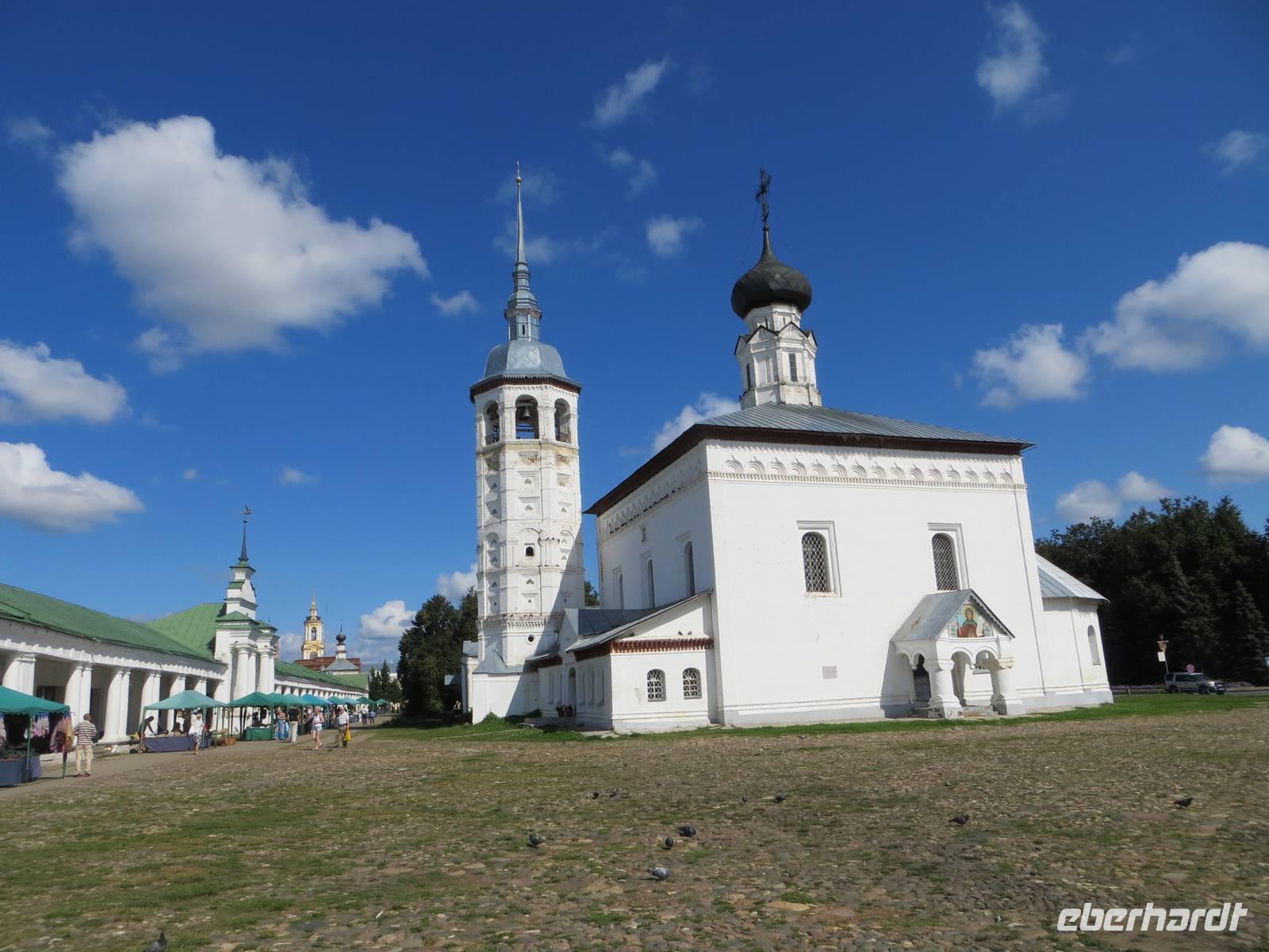 Zum gut ausgeschlafenen Vormittagsstart ging es mit einer kurzen Busfahrt zum Freilichtmuseum für ländliche Kultur zu einem Spaziergang durch Bauernhäuser, in die alte Holzkirche und zum Lauschen russischer Melodien. Zu Fuß überquerten wir dann das Flüsschen Kaminka, um nun leicht auf den alten Wall zum Kreml mit der Kathedrale der Geburt der Gottesmutter zu steigen. Besonders beeindruckend hier die siebenhundert Jahre alten vergoldeten Türen. Im Westen von Susdal am gegenüberliegenden Flusslauf liegt das Maria-Schutz-Kloster, seit einigen Jahren wieder aktives Kloster mit Nonnen. Einst war dies auch „Alterssitz" von Gattinnen russischer Großfürsten und Zaren, so sich die Herren eine neue Auserwählte gesucht hatten. Vom Kloster bummelten wir erneut über den Fluss und stiegen hinauf zum Erlöser-Euthymios-Kloster, einem Wehrkloster aus dem 14. Jahrhundert. Hier begrüßte uns das Glockenspiel von 19 Glocken. In der Erlöser-Verklärungs-Kirche selbst mit strahlend blauen Wandbildern - quasi die gemalte Geschichte der Bibel - lauschten wir dem Gesang eines Männergesangsquartetts in beeindruckender Akustik.