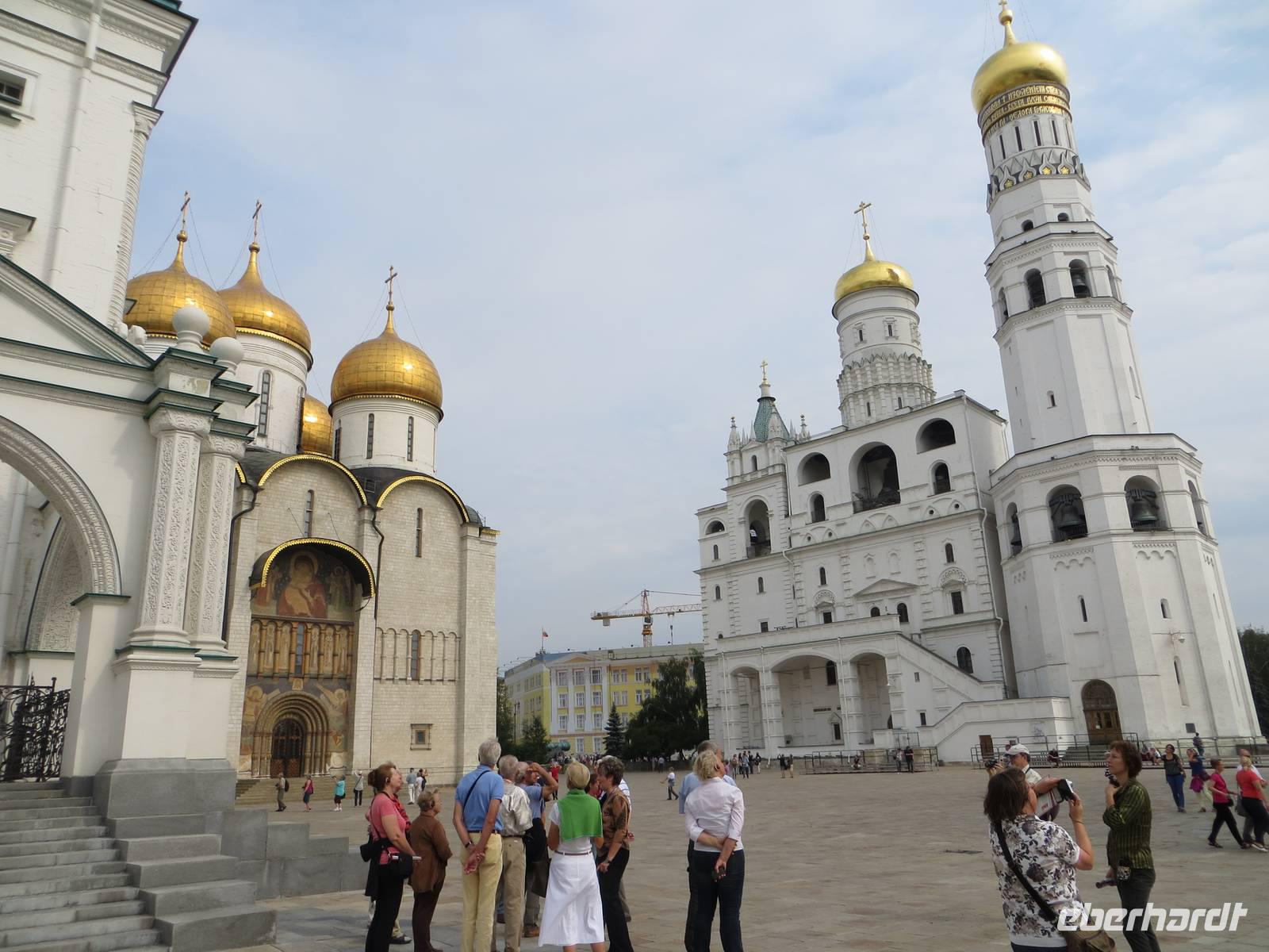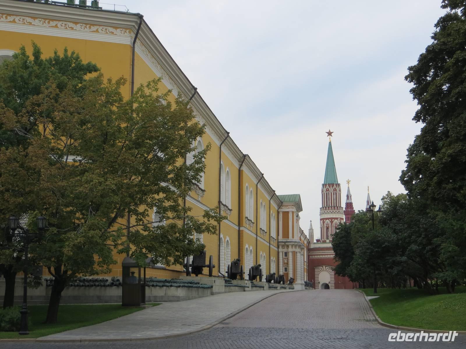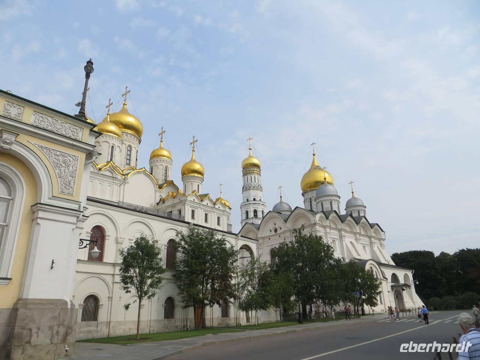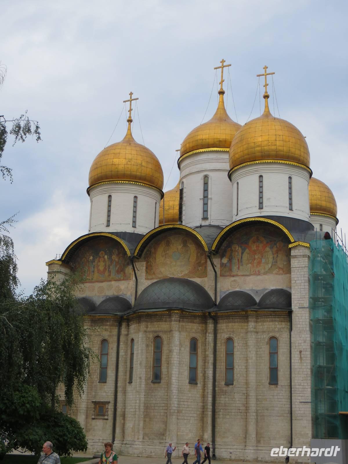 Das Zentrum des geistlichen und weltlichen Zentrums Russland war über Jahrhunderte und ist es seit 1919 wieder: der Moskauer Kreml. Mittlerweile gut gesteuert - oder es gibt nicht mehr so viele Touristen wie einst ? - kommt man recht organisiert in den Kreml. Ein erster Stopp am ehemaligen Konresspalasts, insbesondere aber um den Aufbau der Anlage, einst mit 27 Kirchen und Klöstern, zu erklären. So stehen heute Arsenalgebäude und aktive Regierungsgebäude im Norden des Geländes.