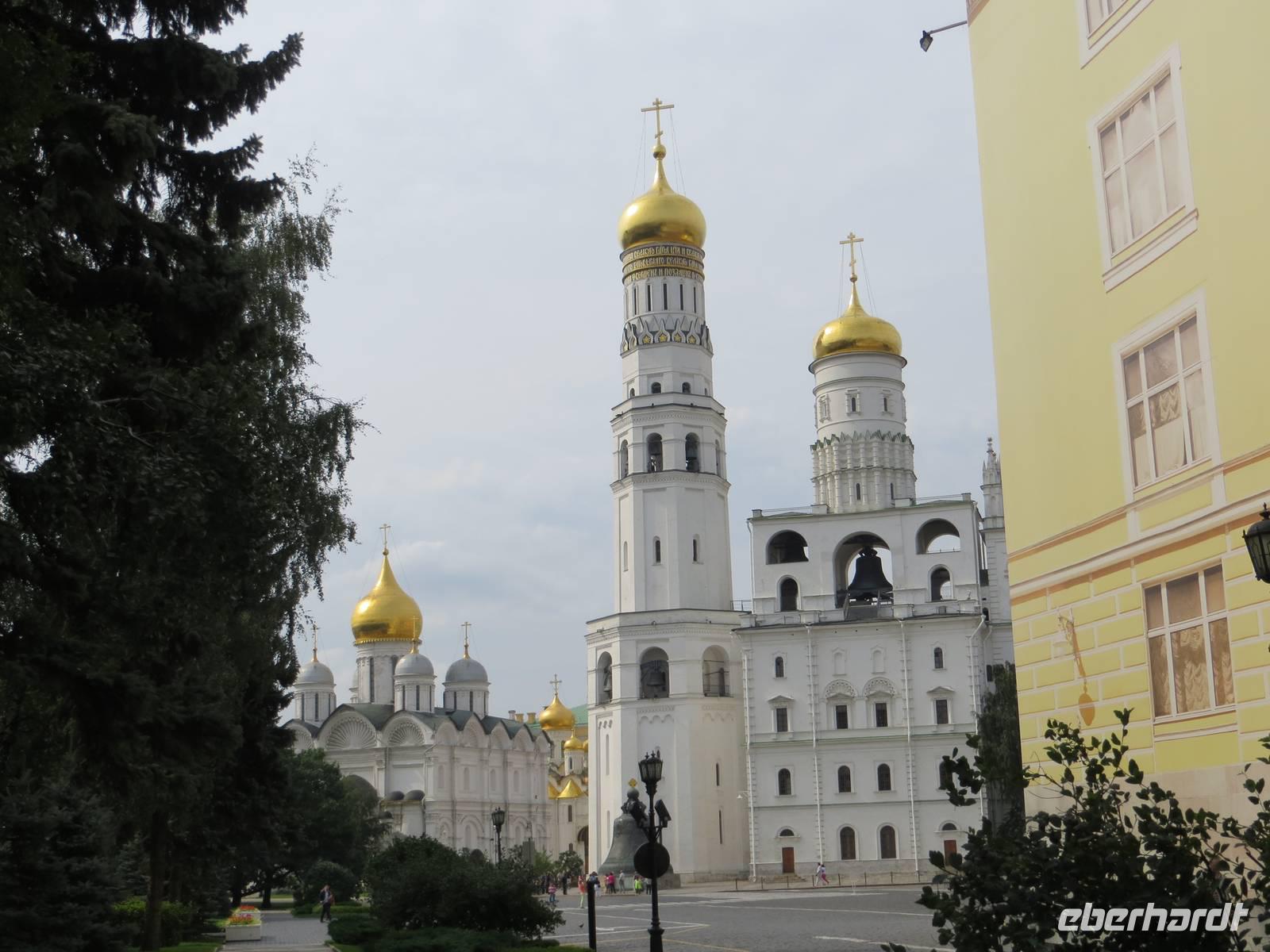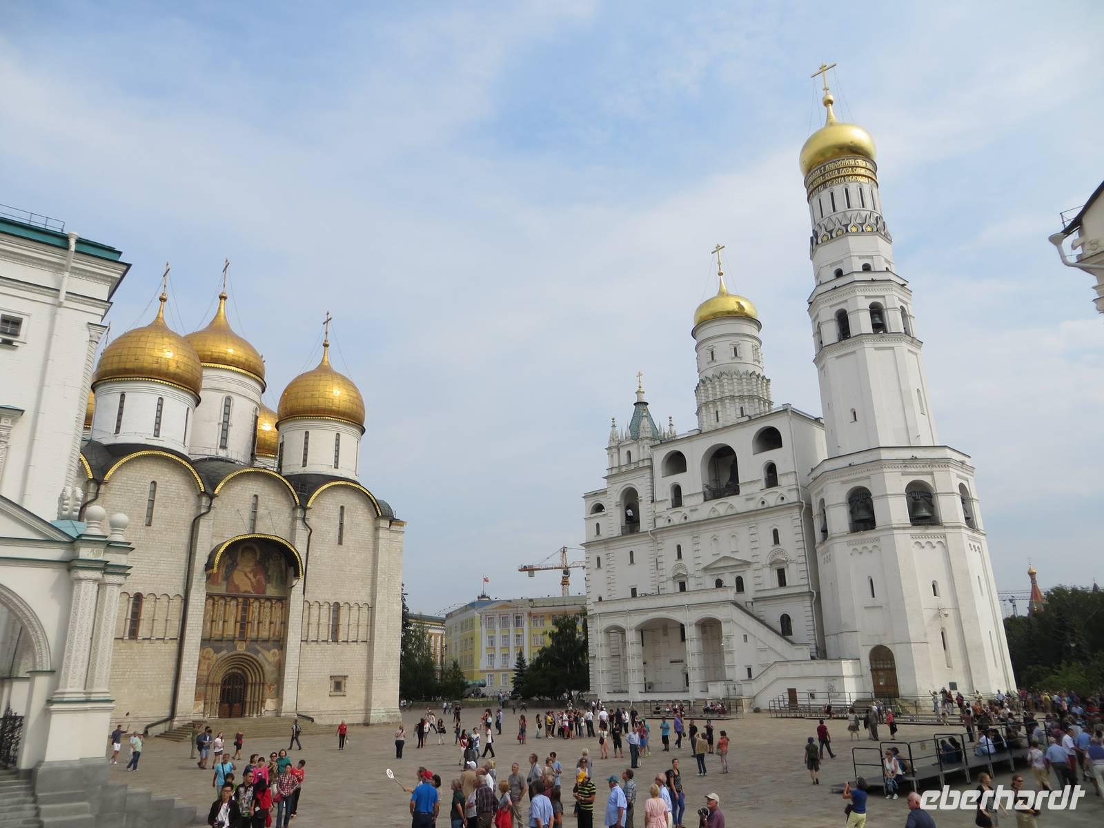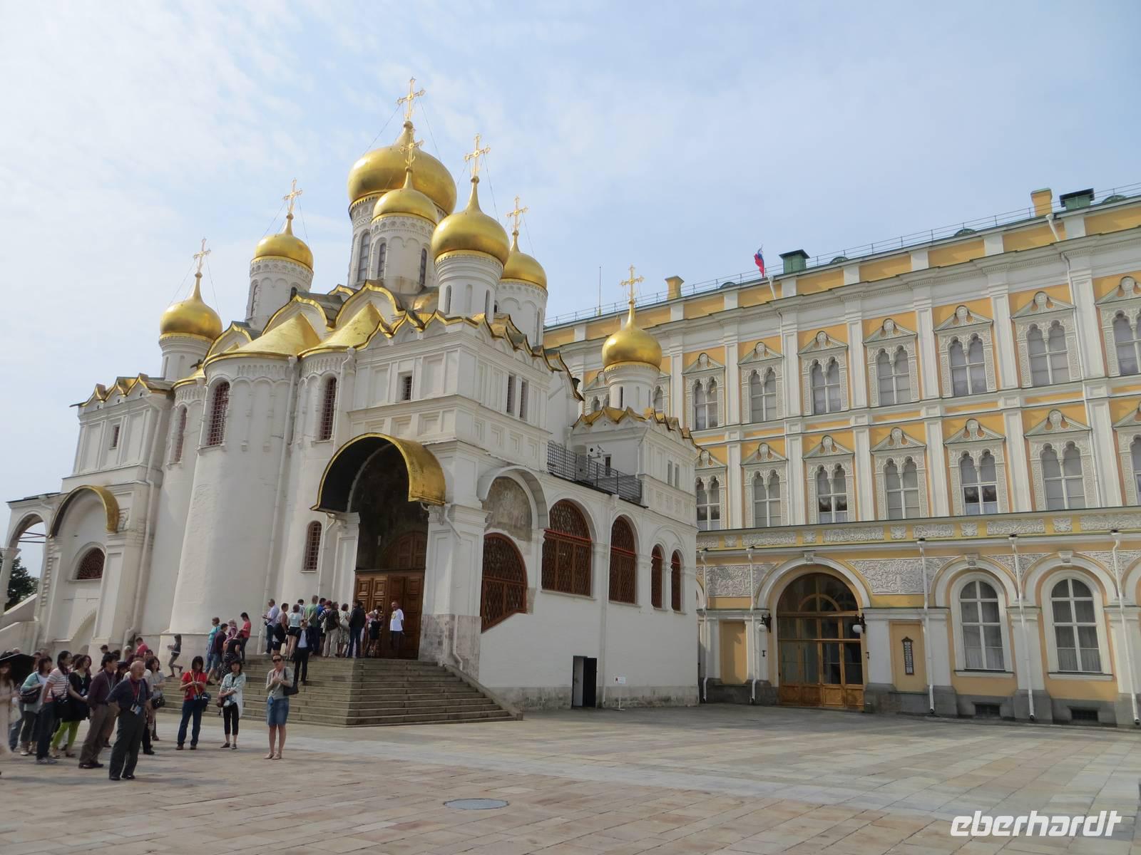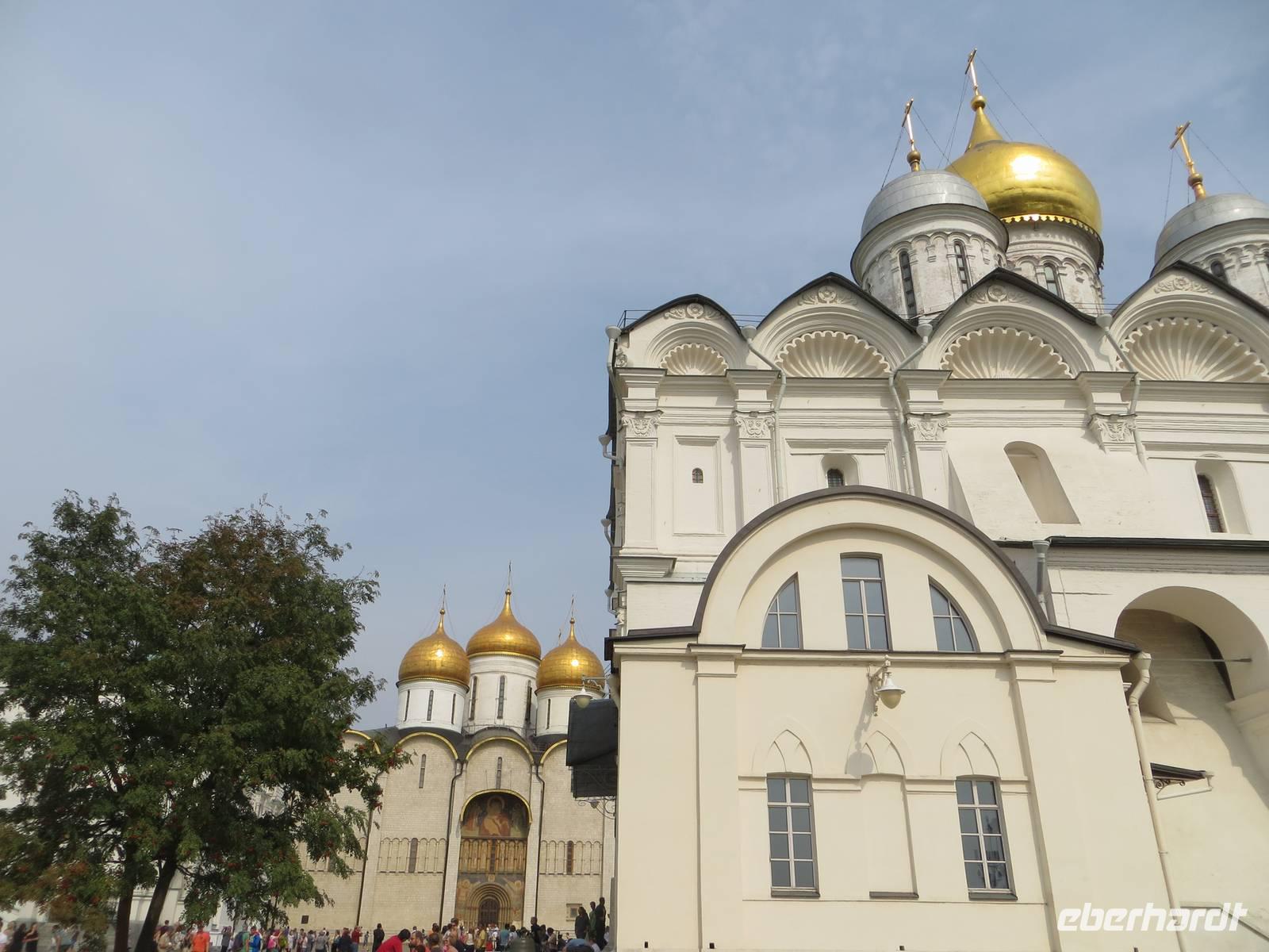 Das Zentrum des geistlichen und weltlichen Zentrums Russland war über Jahrhunderte und ist es seit 1919 wieder: der Moskauer Kreml. Mittlerweile gut gesteuert - oder es gibt nicht mehr so viele Touristen wie einst ? - kommt man recht organisiert in den Kreml. Ein erster Stopp am ehemaligen Konresspalasts, insbesondere aber um den Aufbau der Anlage, einst mit 27 Kirchen und Klöstern, zu erklären. So stehen heute Arsenalgebäude und aktive Regierungsgebäude im Norden des Geländes.