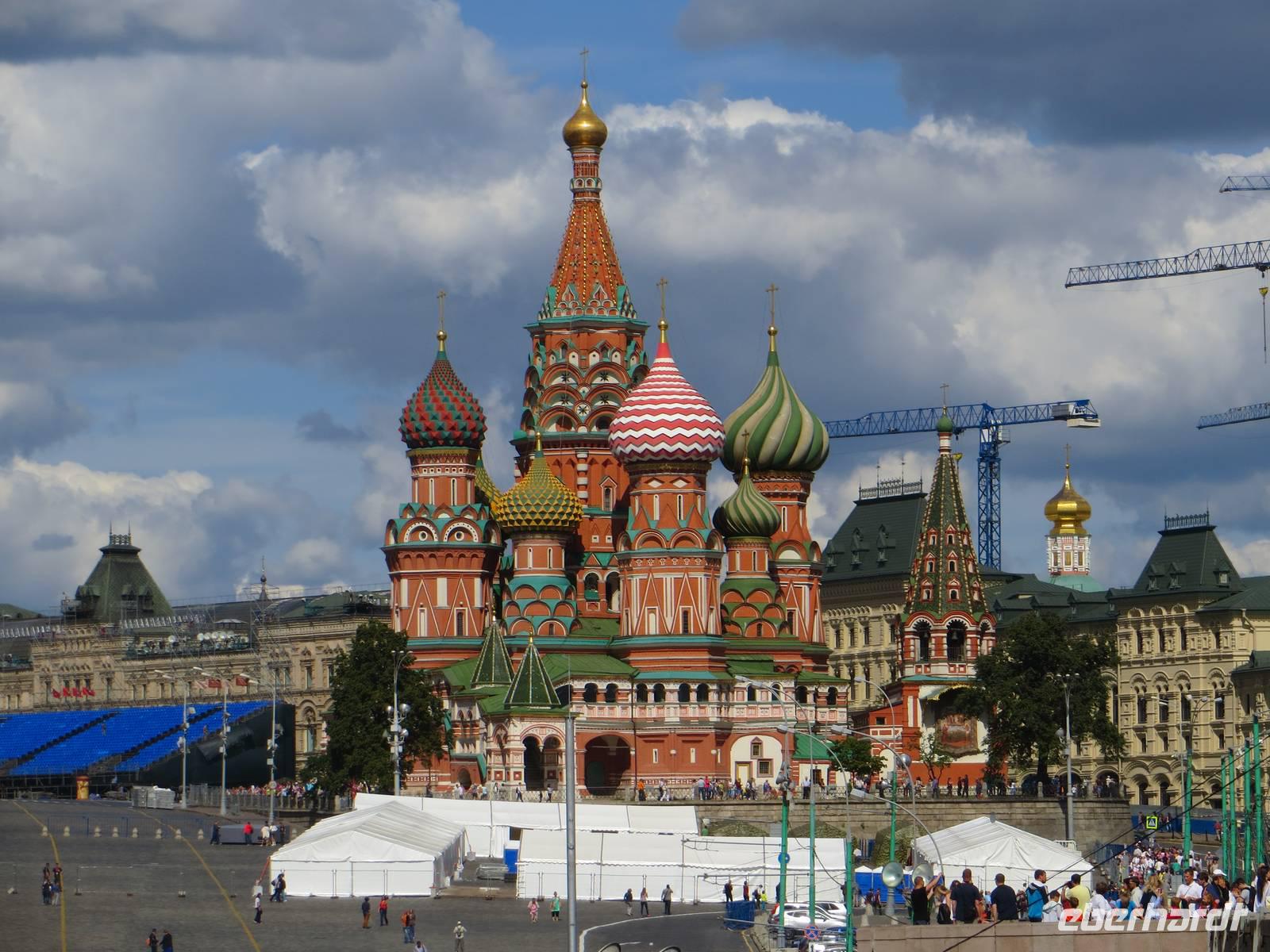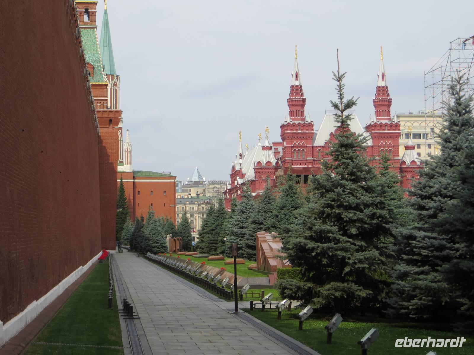Zar Wladimir der Jetzige war wohl an diesem Tage auch im Hause, was uns die Flagge verriet. Rund um den Kathedralenplatz natürlich die Höhepunkte des Moskauer Kremls mit Glockenturm, Maria-Himmelfahrtskirche, natürlich auch die von Fotos bekannte Riesenglocke und Kanone. Schnell verging die Zeit. Zum Schluss hatten wir die bisher unmögliche Gelegenheit durch den großen Kreml-Park zu spazieren und durch den Spasski-Turm den Kreml zu verlassen. Das gestattete uns nach links sogar einen Blick entlang der Kremlmauer. Der Rote Platz indes war größtenteils gesperrt für den Aufbau von Tribünen zu Gunsten eines Festes der Militärmusikkapellen. Das Fluidum des ja eigentlich „Schöner Platz" sich nennenden Ortes, war damit nun wirklich nicht schön zu nennen. Die Herren in den Gräbern und der große Führer des werktätigen Volkes im Mausoleum würden sich wohl im Grabe umdrehen, wenn sie das durch Kapitalisten gesponserte Unternehmen auf ihrem Friedhofsvorplatz erleben müssten.