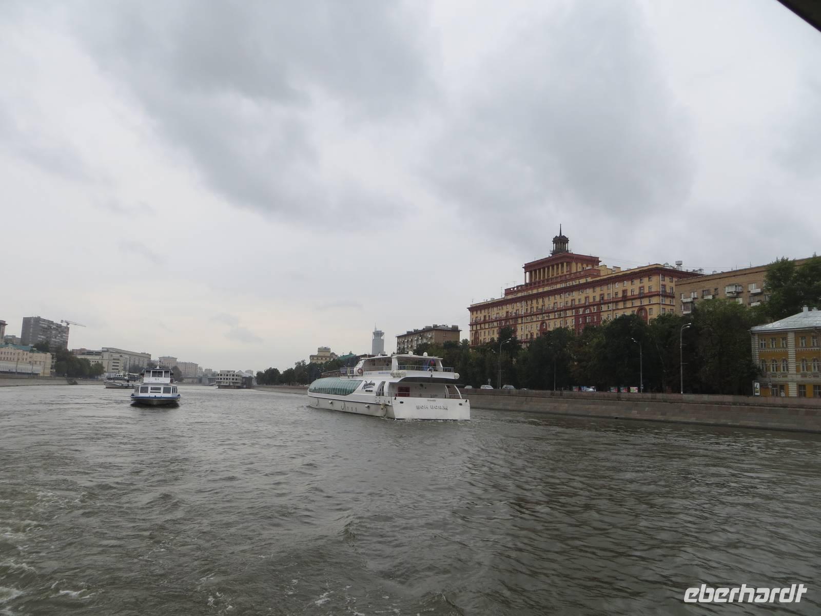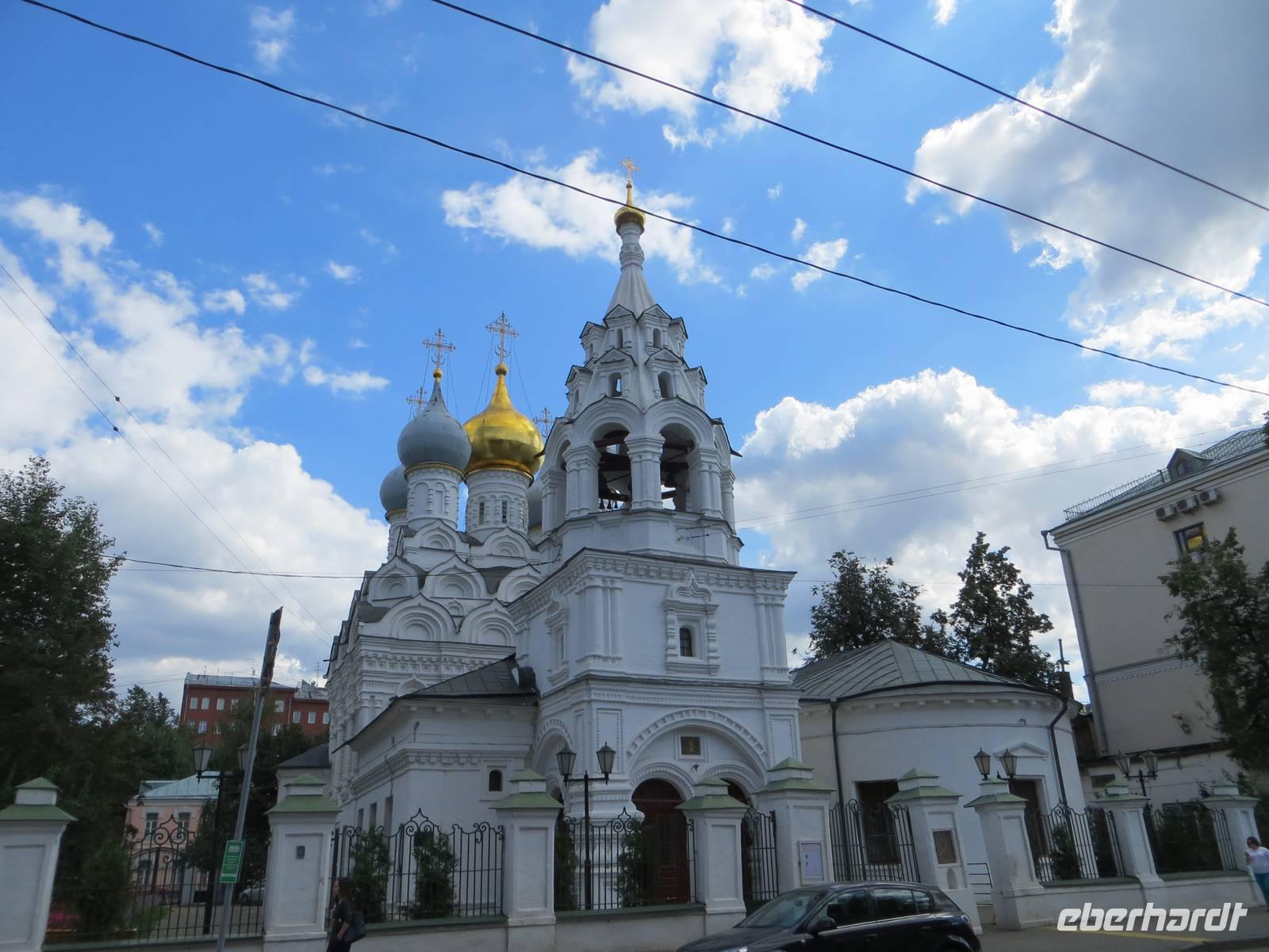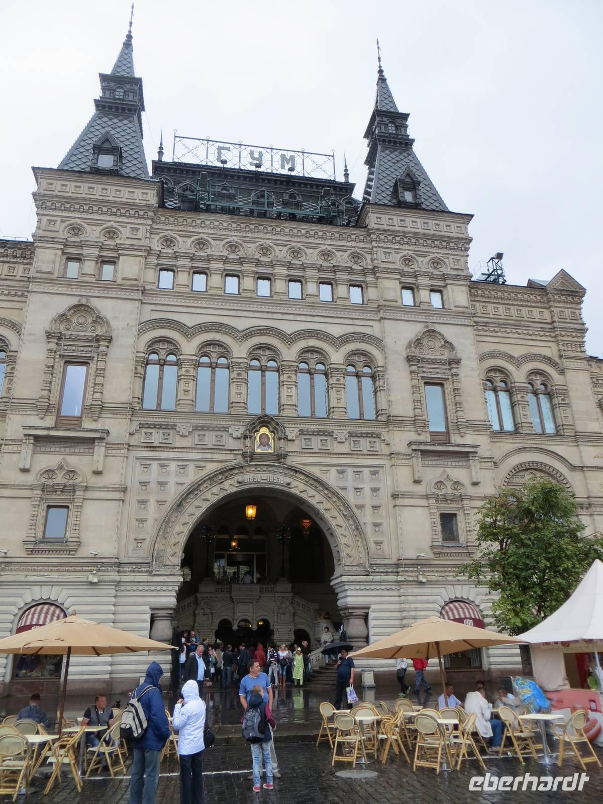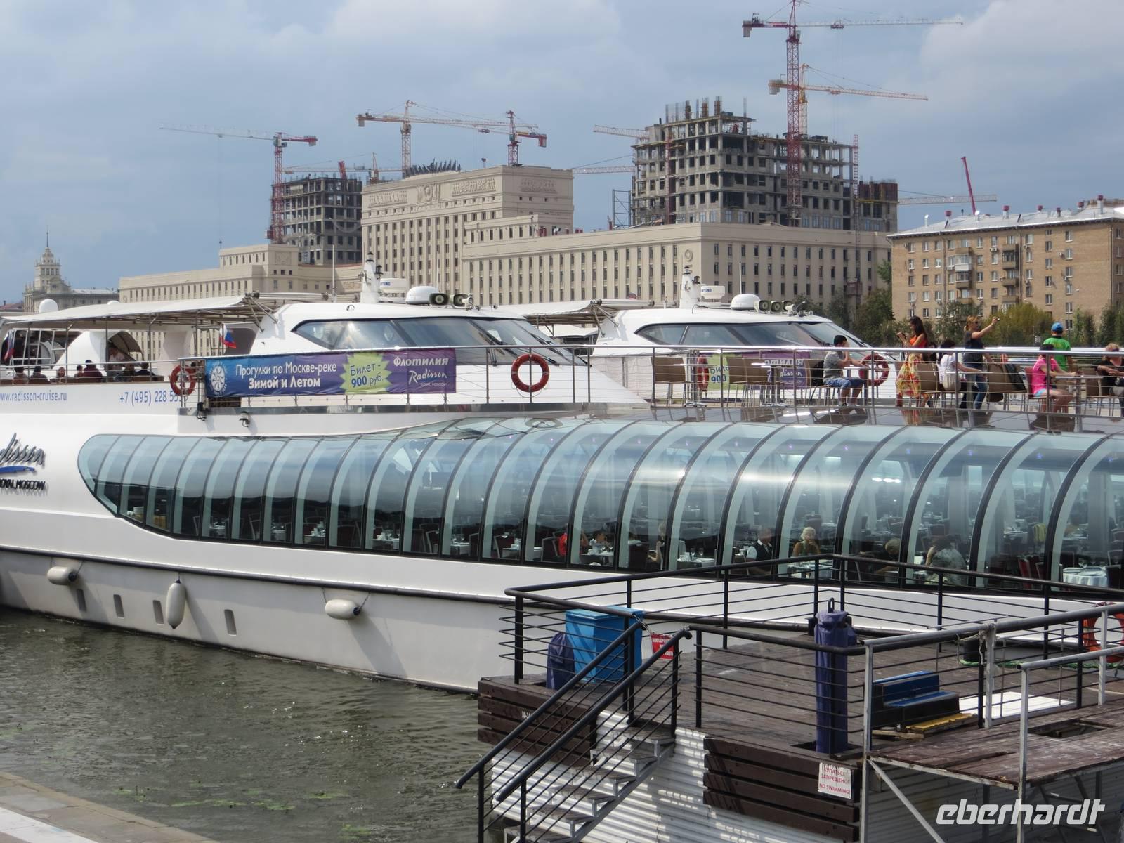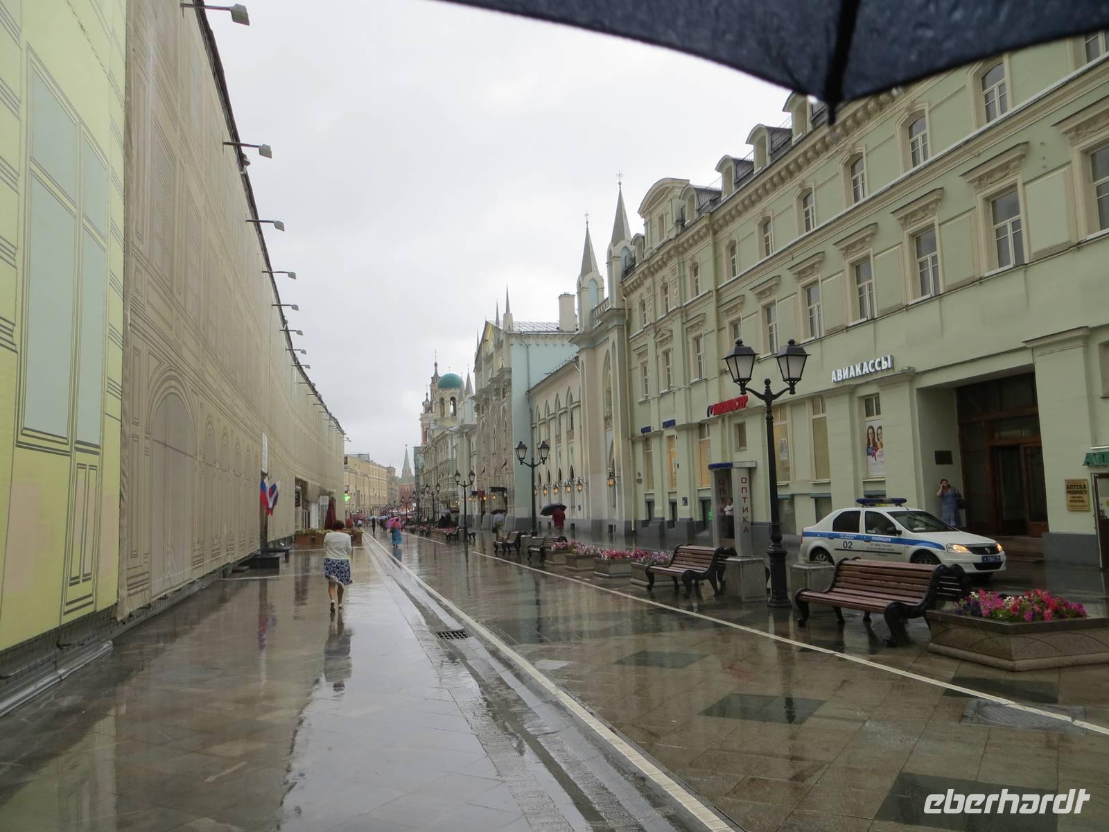 Im Gorki-Park unterhält die Radisson-Hotelgruppe eine Anlegestelle für ihre Armada von großzügigen Ausflugsschiffen mit Restauration. Speisend, schauend, fotografierend bei Regen ging es nun die Moskwa flussabwärts durch das Zentrum der Stadt. Als wir das Schiff nach eineinhalb Stunden verließen, hatte der Regen zunächst nachgelassen. Am Karl-Marx-Denkmal gegenüber des Bolschoi Theaters stiegen wir später aus dem Bus, um ein wenig durch Kitai Gorod zu bummeln. Viel hat sich hier getan; das große Kinderkaufhaus „Detski Mir" und das Ljubljanka-Gebäude sind eingerüstet aber die Tretjakowstraße und insbesondere die Nikolausstraße sind phantastische Gebiete zum Bummeln geworden. Als der Regen kam, nutzten wir das GUM zum individuellen Bummeln und Schauen. Unser weiterer Weg führte durch Gostinniy Dvor zur Warwarka mit ihren alten Kirchen und der riesigen Abrissfläche des einstigen Hotels Rossija.