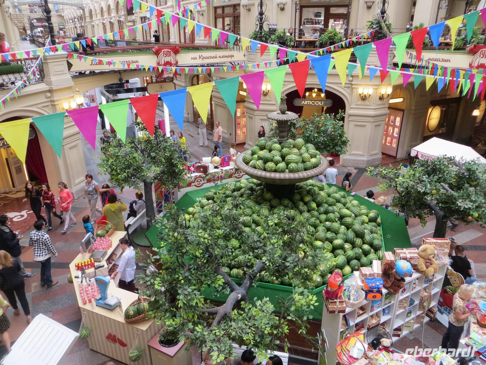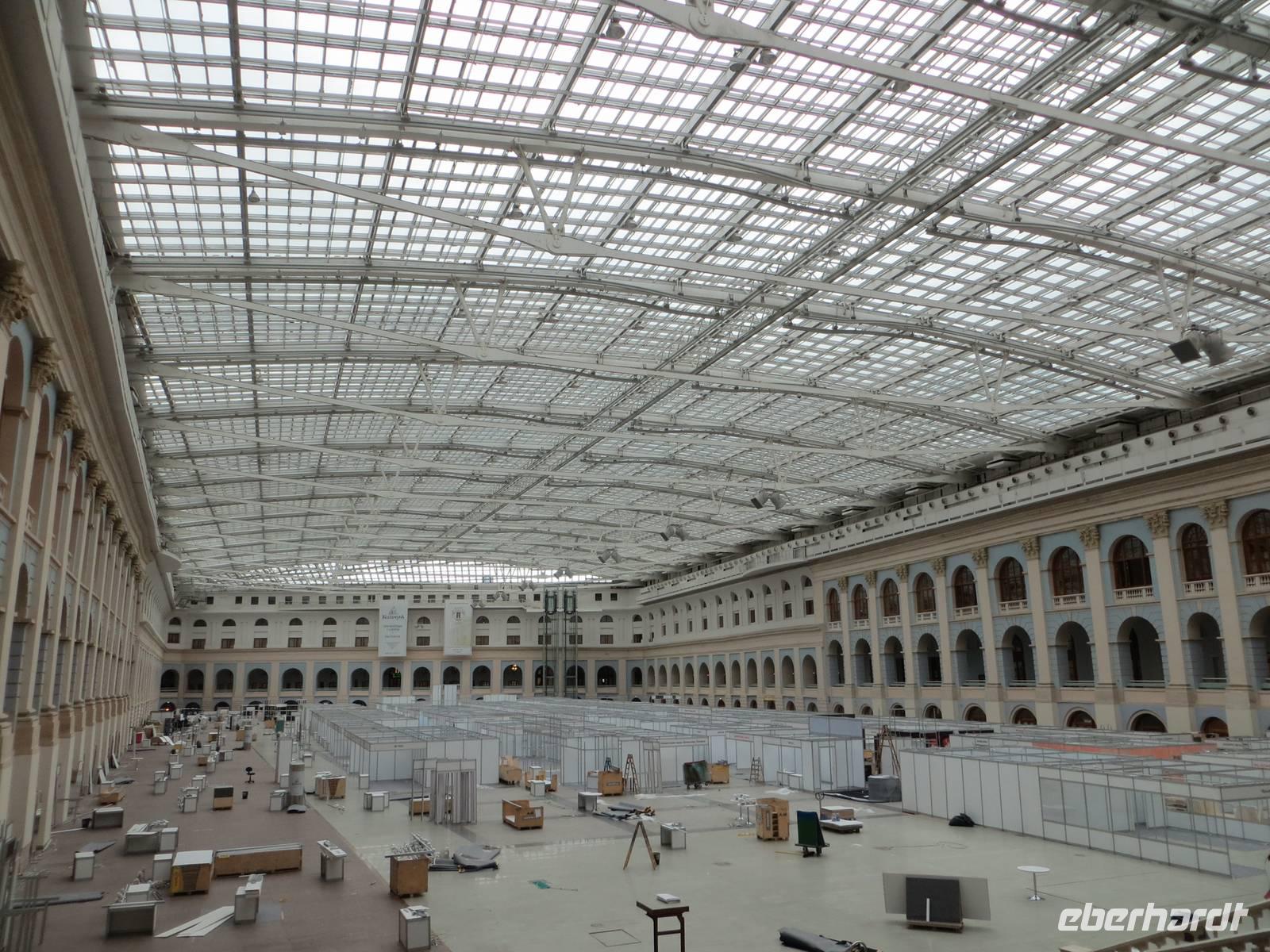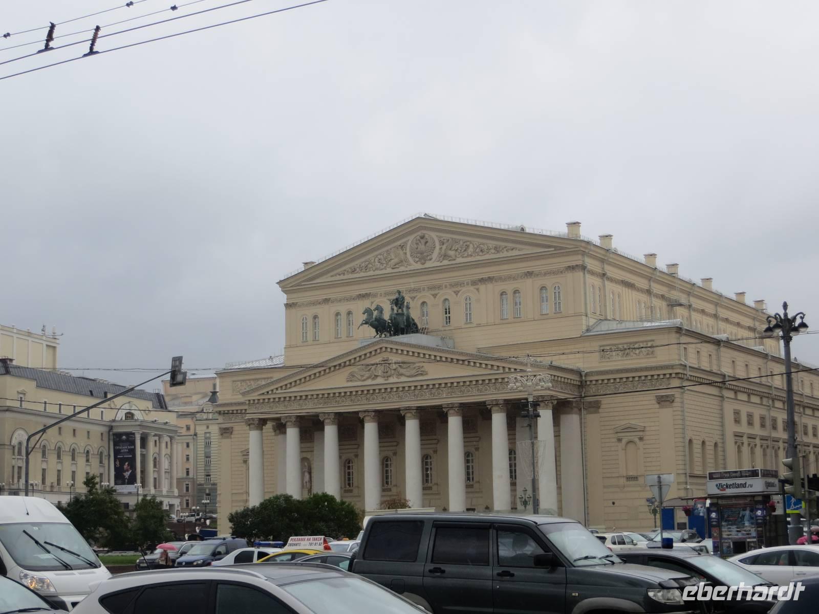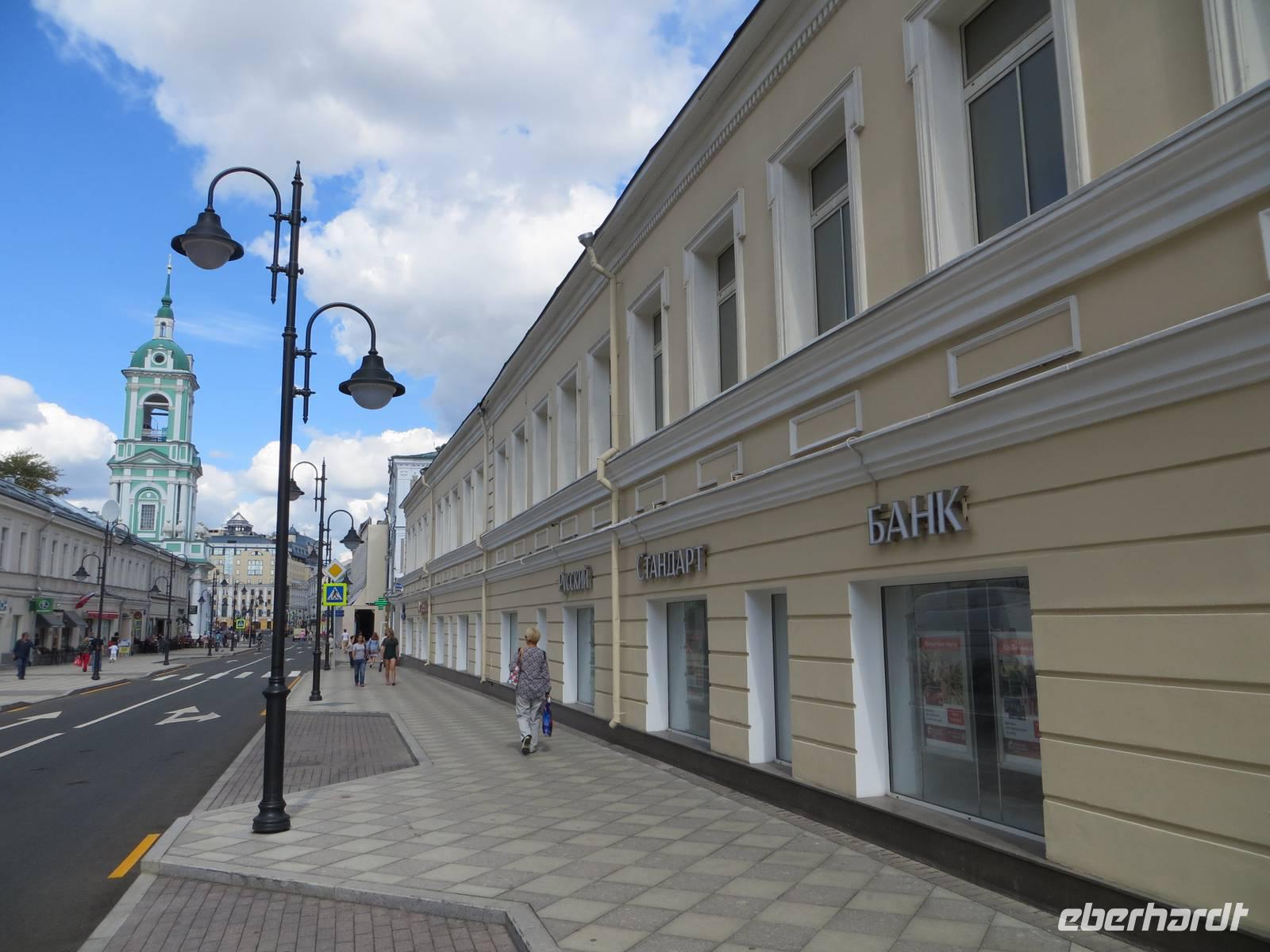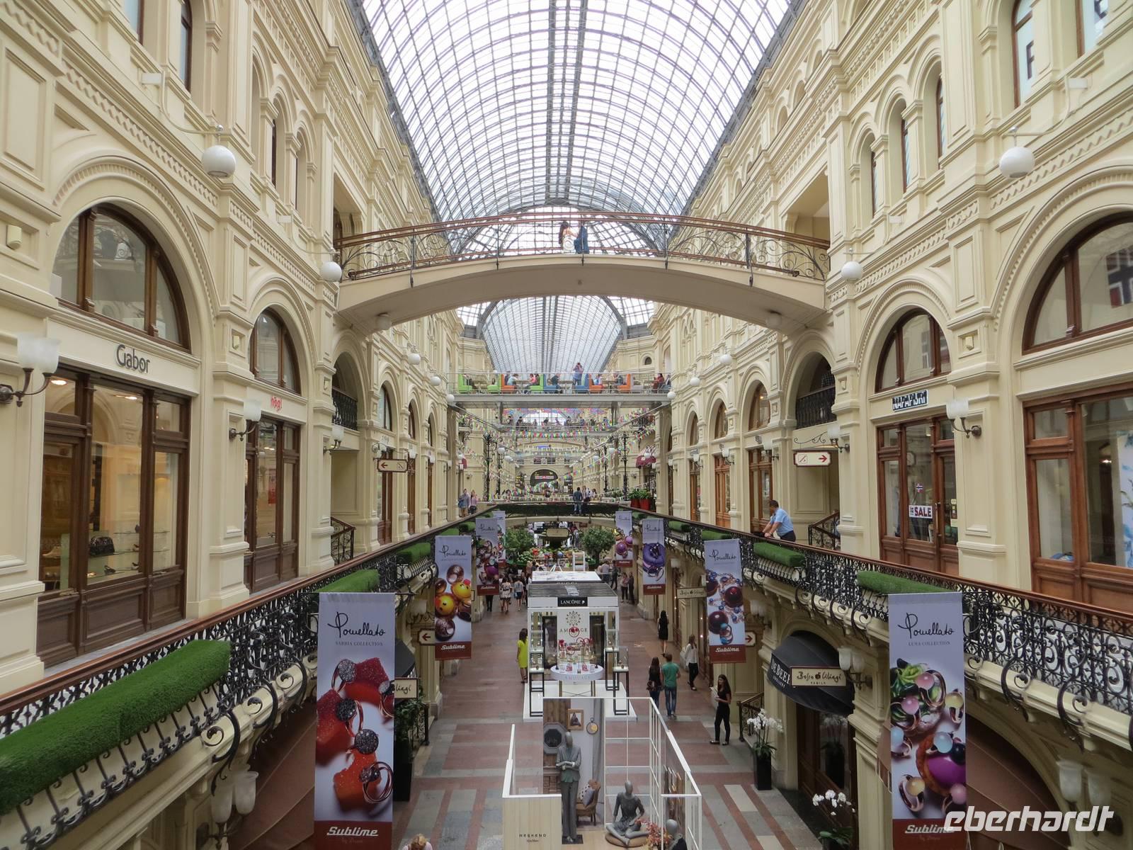 Im Gorki-Park unterhält die Radisson-Hotelgruppe eine Anlegestelle für ihre Armada von großzügigen Ausflugsschiffen mit Restauration. Speisend, schauend, fotografierend bei Regen ging es nun die Moskwa flussabwärts durch das Zentrum der Stadt. Als wir das Schiff nach eineinhalb Stunden verließen, hatte der Regen zunächst nachgelassen. Am Karl-Marx-Denkmal gegenüber des Bolschoi Theaters stiegen wir später aus dem Bus, um ein wenig durch Kitai Gorod zu bummeln. Viel hat sich hier getan; das große Kinderkaufhaus „Detski Mir" und das Ljubljanka-Gebäude sind eingerüstet aber die Tretjakowstraße und insbesondere die Nikolausstraße sind phantastische Gebiete zum Bummeln geworden. Als der Regen kam, nutzten wir das GUM zum individuellen Bummeln und Schauen. Unser weiterer Weg führte durch Gostinniy Dvor zur Warwarka mit ihren alten Kirchen und der riesigen Abrissfläche des einstigen Hotels Rossija.