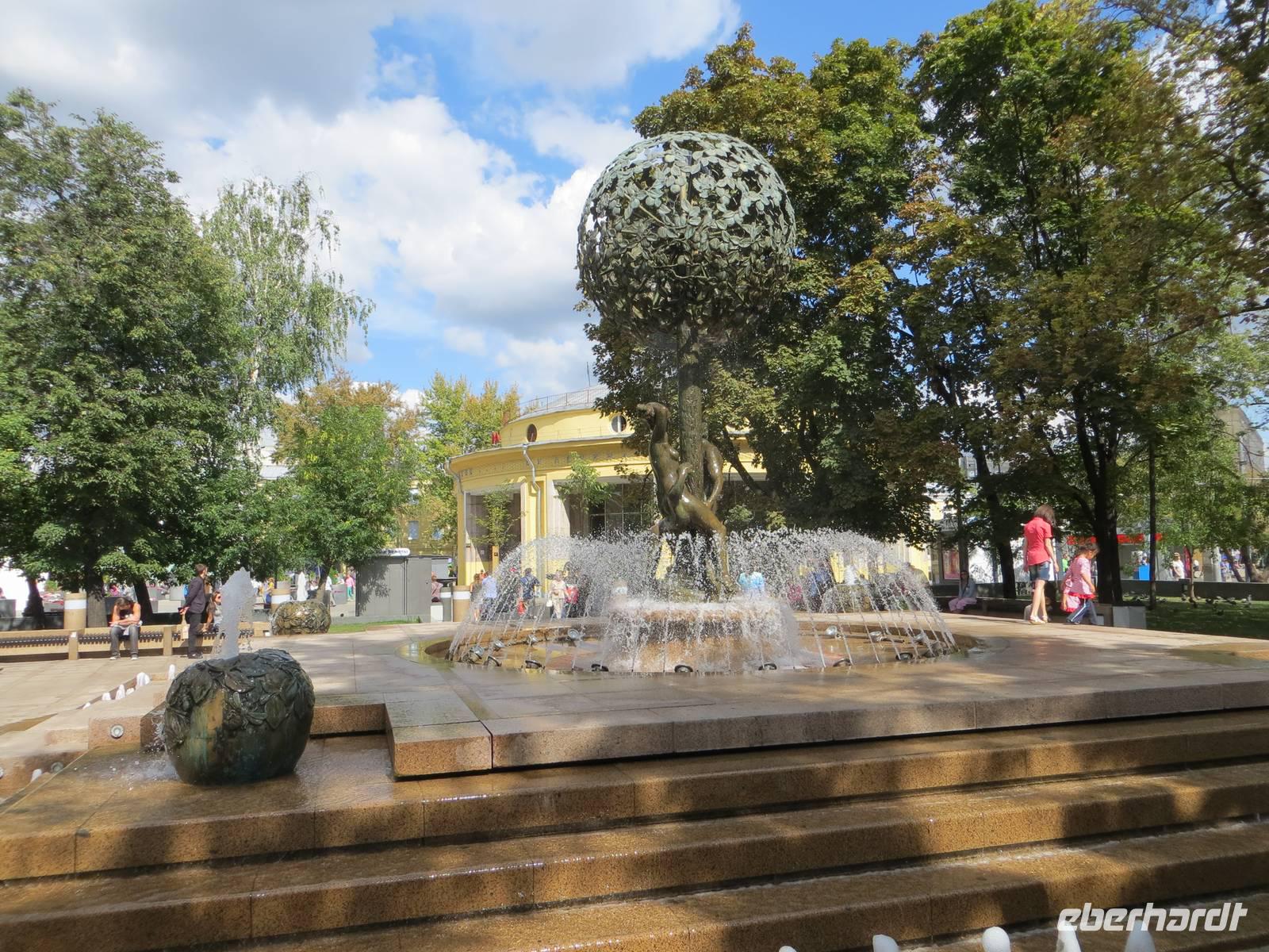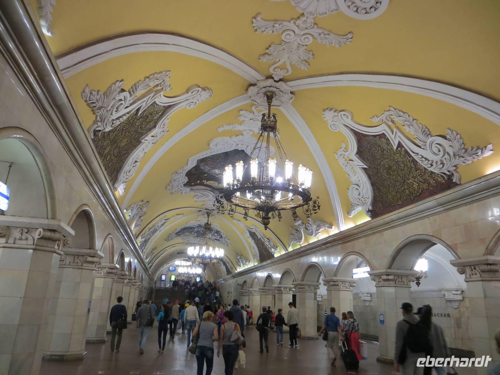 Zum Abendessen brachte uns der Bus in das Haus der Schauspieler auf dem Alten Arbat. Vom Außenministerium bummelten wir an Puschkins Haus und Denkmal vorbei; nach dem Abendessen dann weiter zur Metrostation Arbatskaya. Nun war Zeit für eine kleine Kreuzfahrt im Underground zur Besichtigung einiger der Paläste: die Stationen Kiewskaya, Bjelorusskaya, Novoslobodskaya, Komsomolskaya und zum Schluss ging es über die Majakowskaya und Tschechowskaya in den Süden der Stadt zum Hotel.