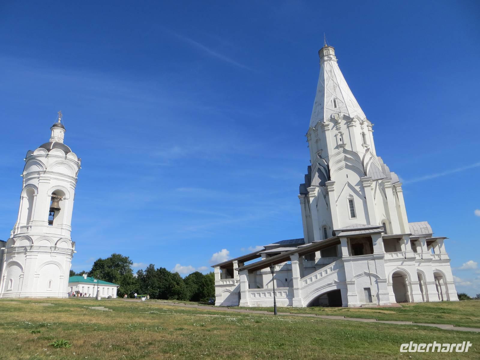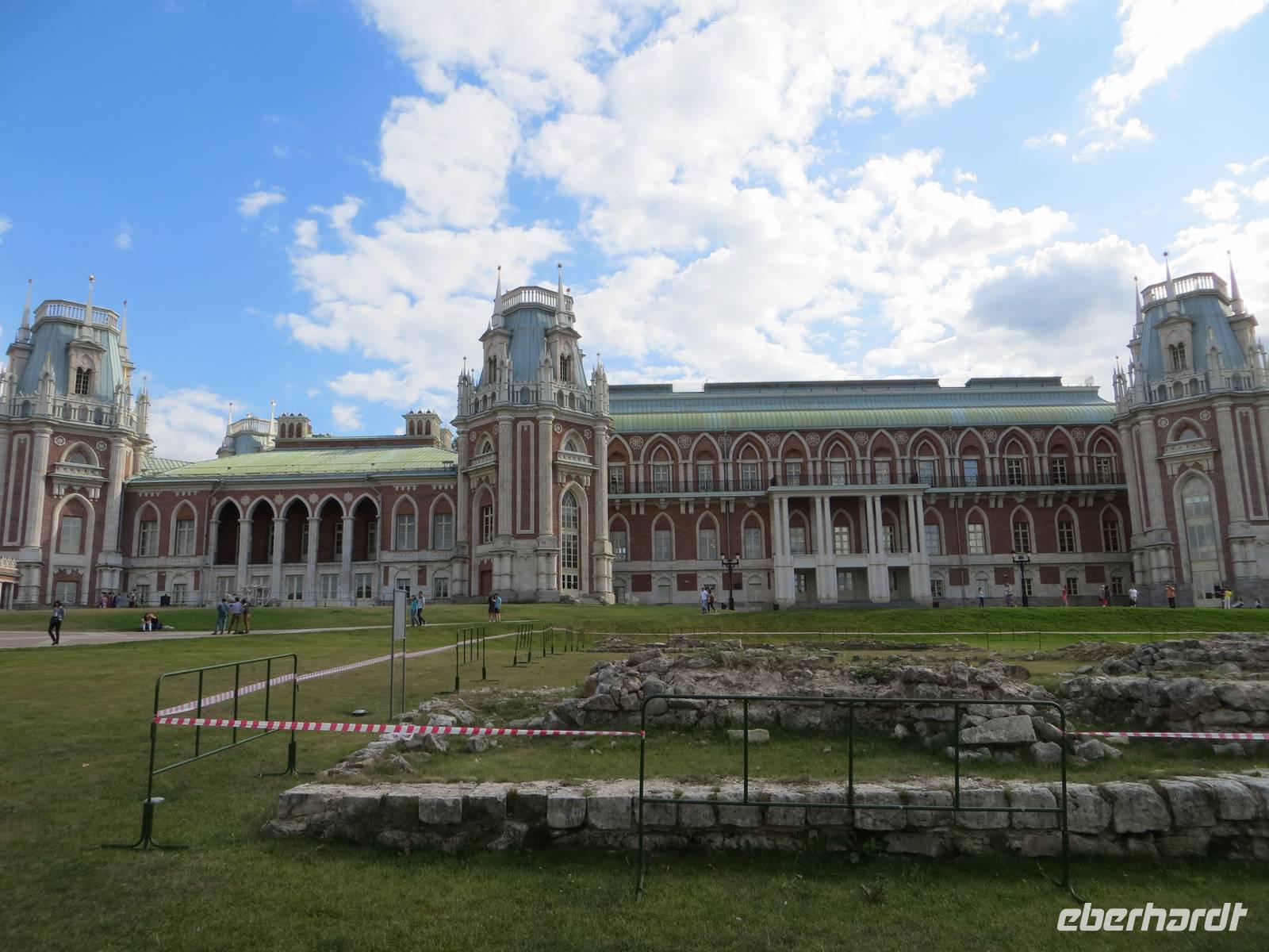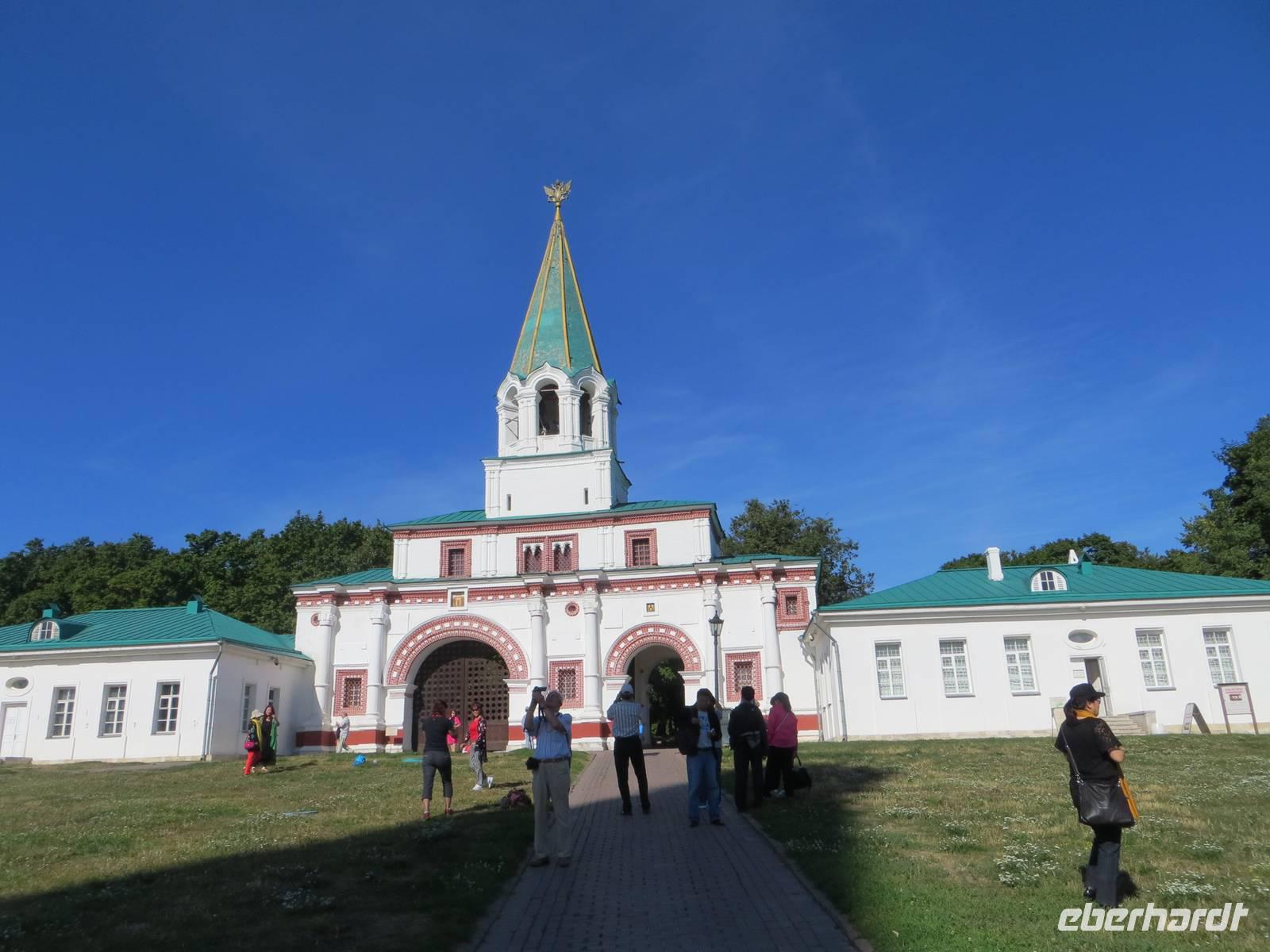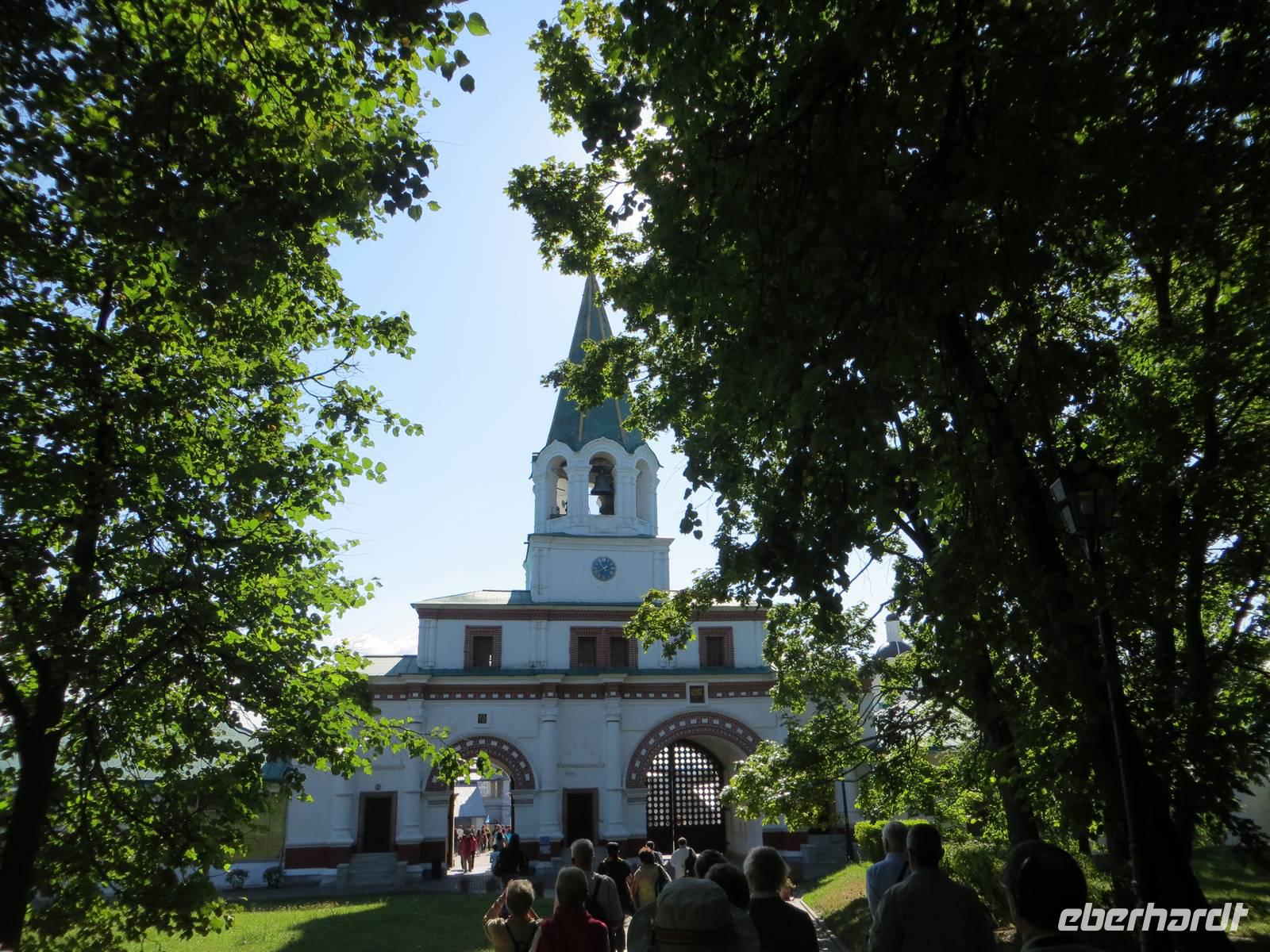 Am Sonnabend sind die meisten Moskauer bereits auf Ihren Datschen im Umland oder bleiben in der Wohnung; so war die Busfahrt nach Kolomenskoje recht zügig. Im alten Museumsteil, inmitten von Eichenbäumen befinden sich Relikte der Zarenanwesens aus dem 17. Jahrhundert, darunter eine der bedeutendsten weißen Zeltdachkirchen Russlands. Inmitten von Wiesen leuchten die Gebäude heute in der Sonne. Auch Zar Peter der Große weilte hier und wohnte in einem kleinen Holzhäuschen. Dies besuchten wir mit eingezogenen Köpfen. Das alte Areal von Kolomenskoje ist tatsächlich mit historischer Bebauung - weshalb wir uns dies anschauten. An anderer Stelle im Park befindet sich der Nachbau eines Holzpalastes des Zarenvaters von Peter I.: dies mutet ein wenig wie Disneyland an - wir fuhren nur mit Abstand daran vorbei. Zur individuellen Mittagspause fuhren wir in den Stadtteil Samoskworetschie (also: vor Moskau oder logistisch besser - unterhalb des Kreml). Am Vortage wurde hier die rekonstruierte Straße Pjatnitza übergeben. Überwiegend sind es Häuser des 19. Jahrhunderts, die diese Gegend prägen. Auch Lew Tolstoi wohnte hier. Viele rekonstruierte Kirchen prägen das Gebiet; für einfachere Bedürfnisse ist es eine Vielzahl von Cafes und Restaurant, die das Gebiet bestimmen - also Zeit für die Mittagspause. Zur Nachmittagszeit fuhren wir in den Stadtteil Zaryzino, also den Ort der Zarin. In einst grüner Landschaft lies Katarina II. ein Schloss errichten, das sie selbst nie bewohnte. Deren Nachfolger rissen es teilweise ab, weitere Mächtige ließen die Reste verkommen. Im ersten Jahrzehnt des 21. Jahrhunderts wurde das Schloss neu aufgebaut. Zwei prächtige Säle und zahlreiche Ausstellungsräume vermitteln nun ein Bild vom zaristischen Leben im 18. Jahrhundert. Der umliegende Park mit Fontänen war an diesem Sonnensonnabend voller Paare, die als frisch Verheiratete mit ihren Freunden durch den Park bummelten - das war nun typisches zeitgenössisches Moskau. Abendessen dann im Hotel Kolomenskoje und letzte Fahrt in Richtung Hotel: mit den Besichtigungen in Kolomenskoje , auf der Pjatnitza und in Zaryzino hatte sich nun der geschichtliche Weg unserer Reise vom 11. bis zum 19. Jahrhundert geschlossen.