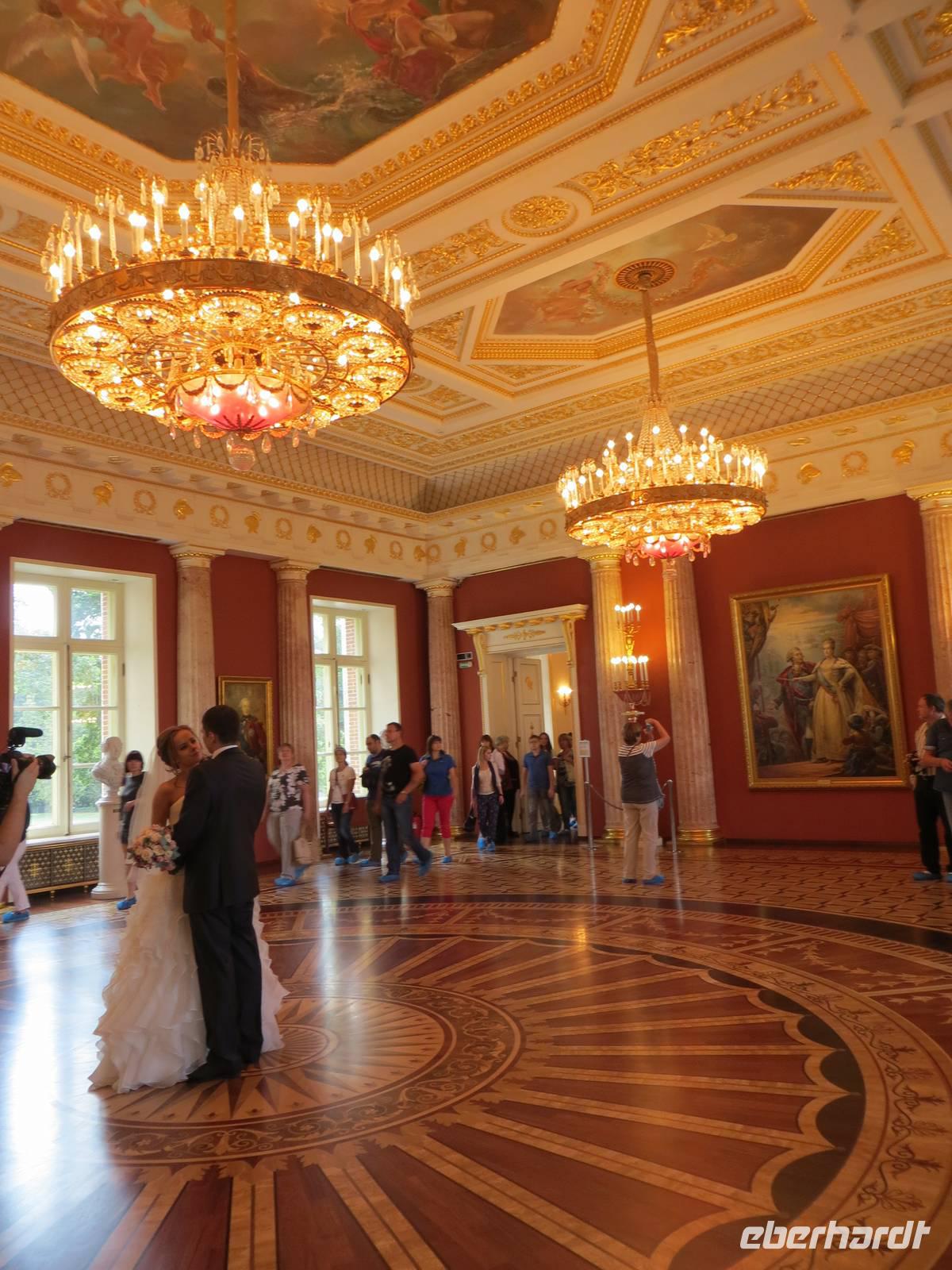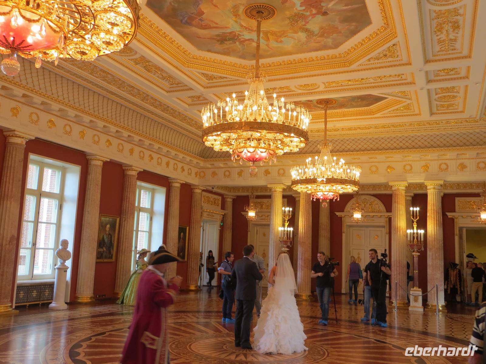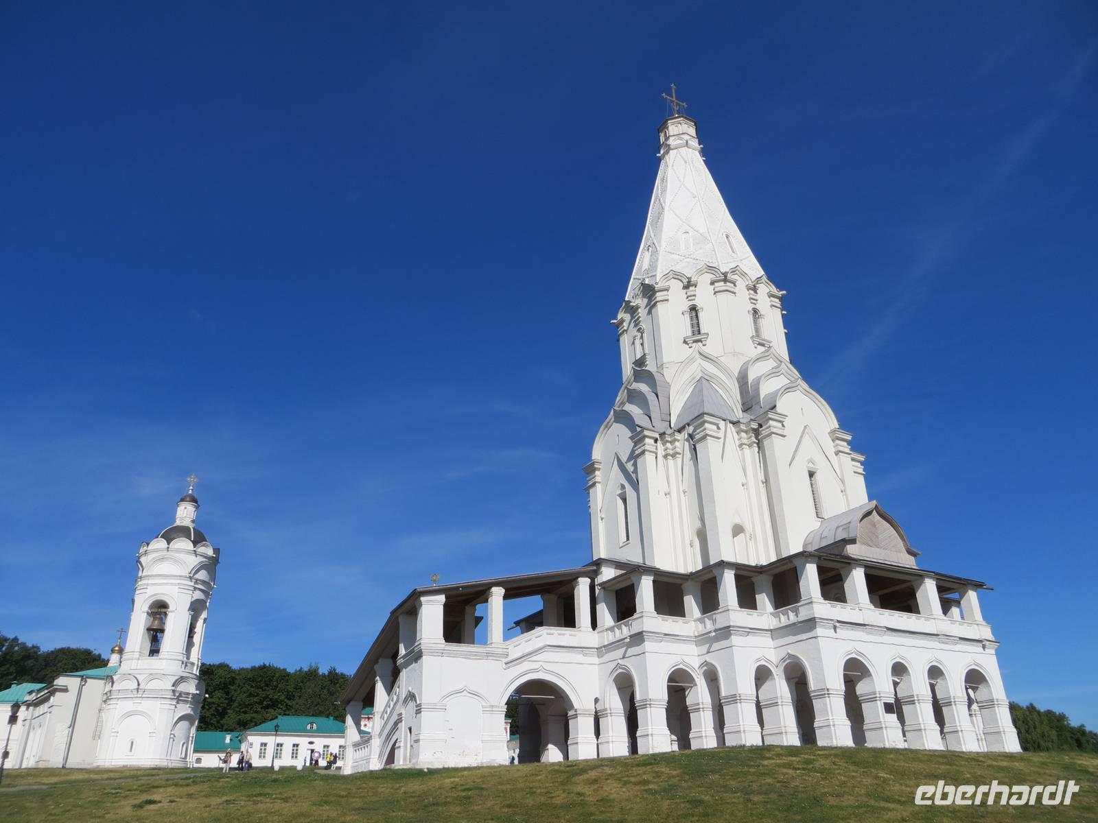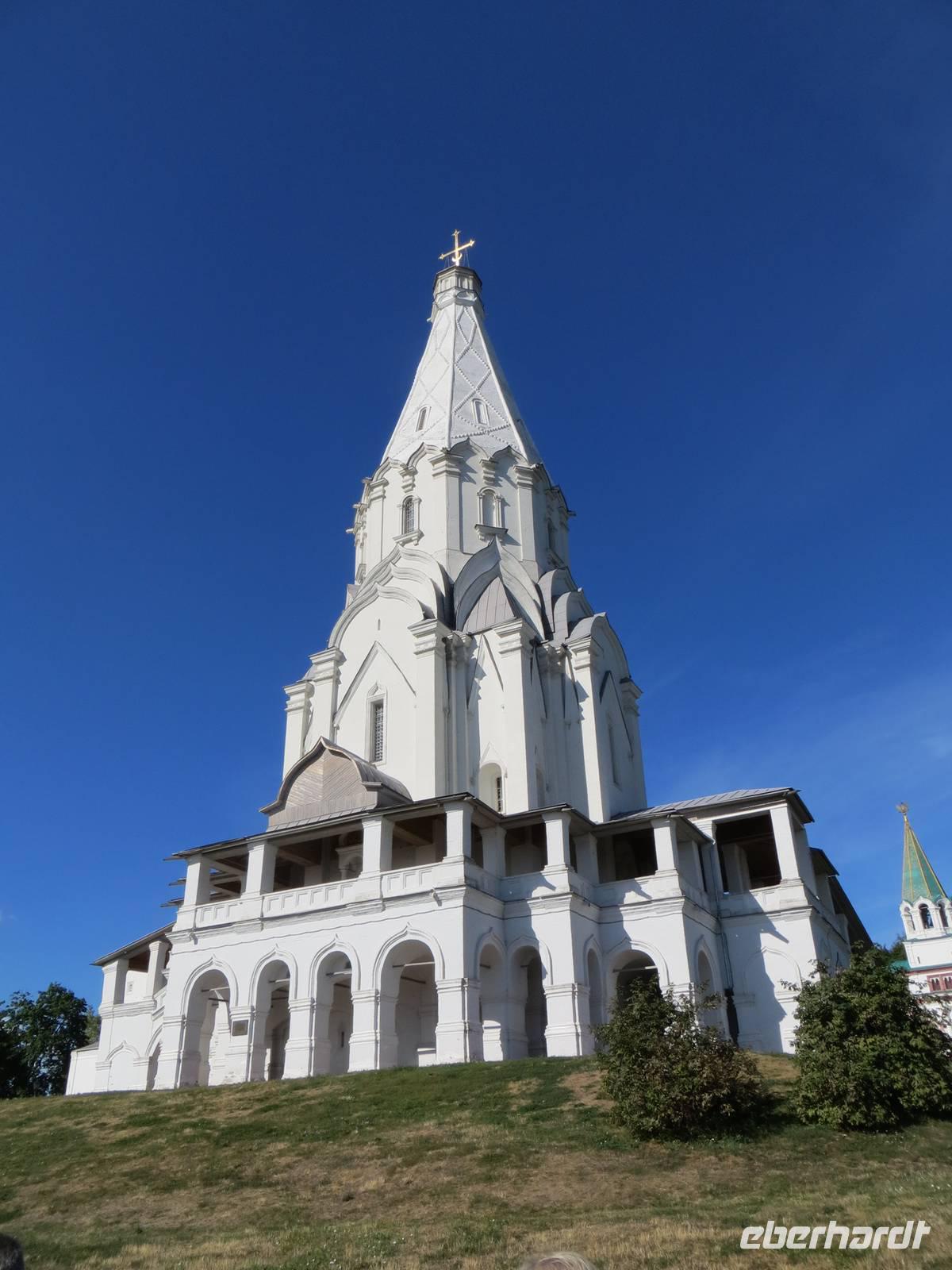 Am Sonnabend sind die meisten Moskauer bereits auf Ihren Datschen im Umland oder bleiben in der Wohnung; so war die Busfahrt nach Kolomenskoje recht zügig. Im alten Museumsteil, inmitten von Eichenbäumen befinden sich Relikte der Zarenanwesens aus dem 17. Jahrhundert, darunter eine der bedeutendsten weißen Zeltdachkirchen Russlands. Inmitten von Wiesen leuchten die Gebäude heute in der Sonne. Auch Zar Peter der Große weilte hier und wohnte in einem kleinen Holzhäuschen. Dies besuchten wir mit eingezogenen Köpfen. Das alte Areal von Kolomenskoje ist tatsächlich mit historischer Bebauung - weshalb wir uns dies anschauten. An anderer Stelle im Park befindet sich der Nachbau eines Holzpalastes des Zarenvaters von Peter I.: dies mutet ein wenig wie Disneyland an - wir fuhren nur mit Abstand daran vorbei. Zur individuellen Mittagspause fuhren wir in den Stadtteil Samoskworetschie (also: vor Moskau oder logistisch besser - unterhalb des Kreml). Am Vortage wurde hier die rekonstruierte Straße Pjatnitza übergeben. Überwiegend sind es Häuser des 19. Jahrhunderts, die diese Gegend prägen. Auch Lew Tolstoi wohnte hier. Viele rekonstruierte Kirchen prägen das Gebiet; für einfachere Bedürfnisse ist es eine Vielzahl von Cafes und Restaurant, die das Gebiet bestimmen - also Zeit für die Mittagspause. Zur Nachmittagszeit fuhren wir in den Stadtteil Zaryzino, also den Ort der Zarin. In einst grüner Landschaft lies Katarina II. ein Schloss errichten, das sie selbst nie bewohnte. Deren Nachfolger rissen es teilweise ab, weitere Mächtige ließen die Reste verkommen. Im ersten Jahrzehnt des 21. Jahrhunderts wurde das Schloss neu aufgebaut. Zwei prächtige Säle und zahlreiche Ausstellungsräume vermitteln nun ein Bild vom zaristischen Leben im 18. Jahrhundert. Der umliegende Park mit Fontänen war an diesem Sonnensonnabend voller Paare, die als frisch Verheiratete mit ihren Freunden durch den Park bummelten - das war nun typisches zeitgenössisches Moskau. Abendessen dann im Hotel Kolomenskoje und letzte Fahrt in Richtung Hotel: mit den Besichtigungen in Kolomenskoje , auf der Pjatnitza und in Zaryzino hatte sich nun der geschichtliche Weg unserer Reise vom 11. bis zum 19. Jahrhundert geschlossen.