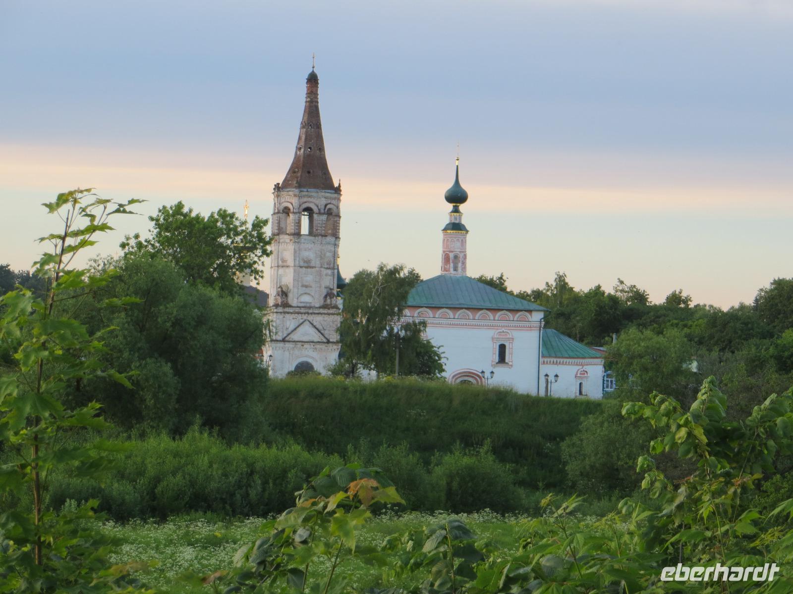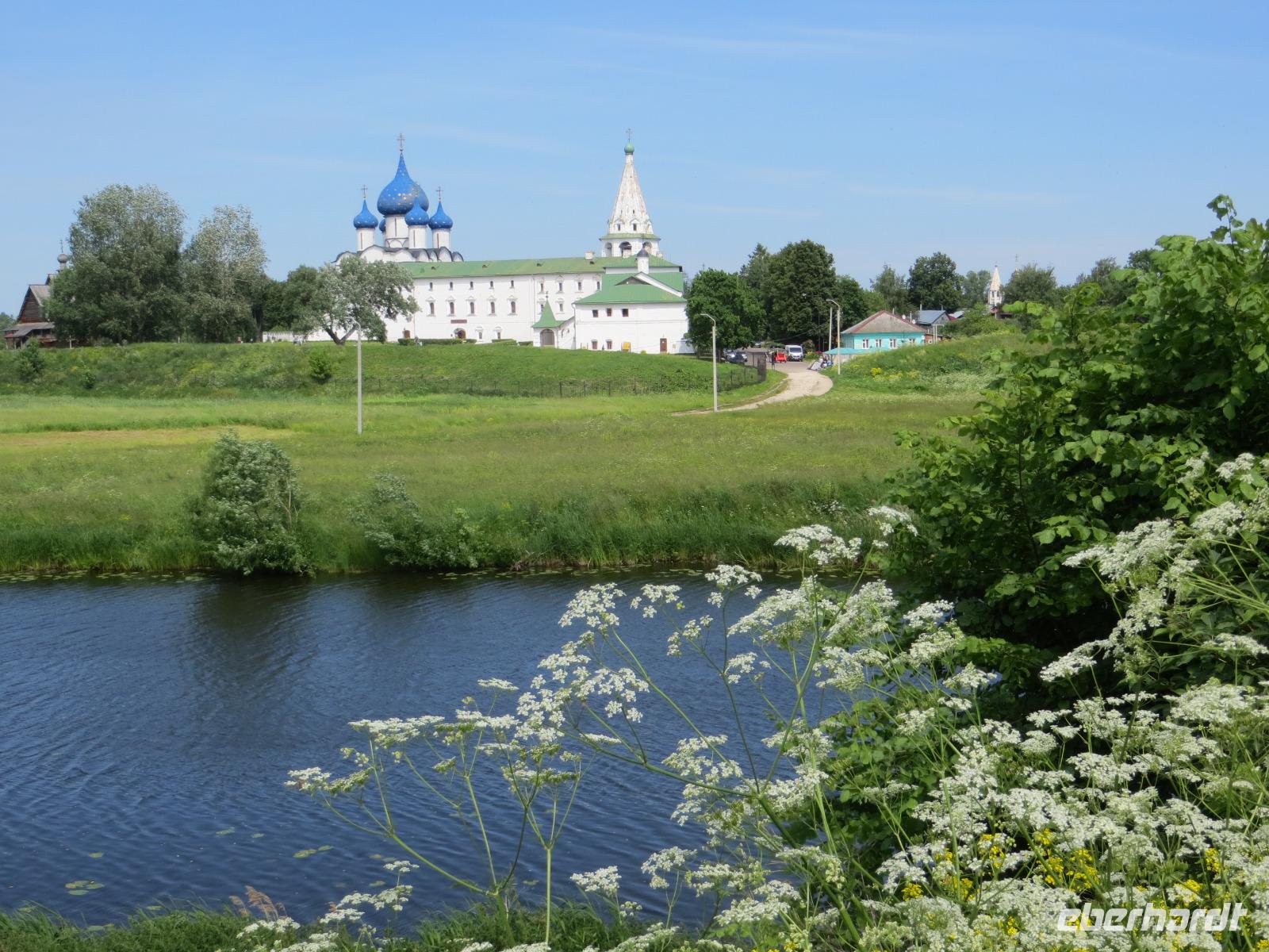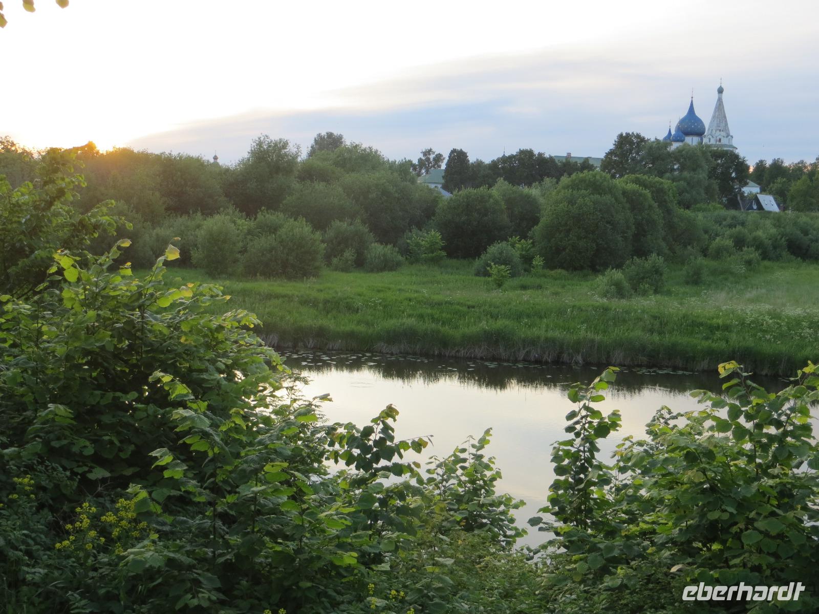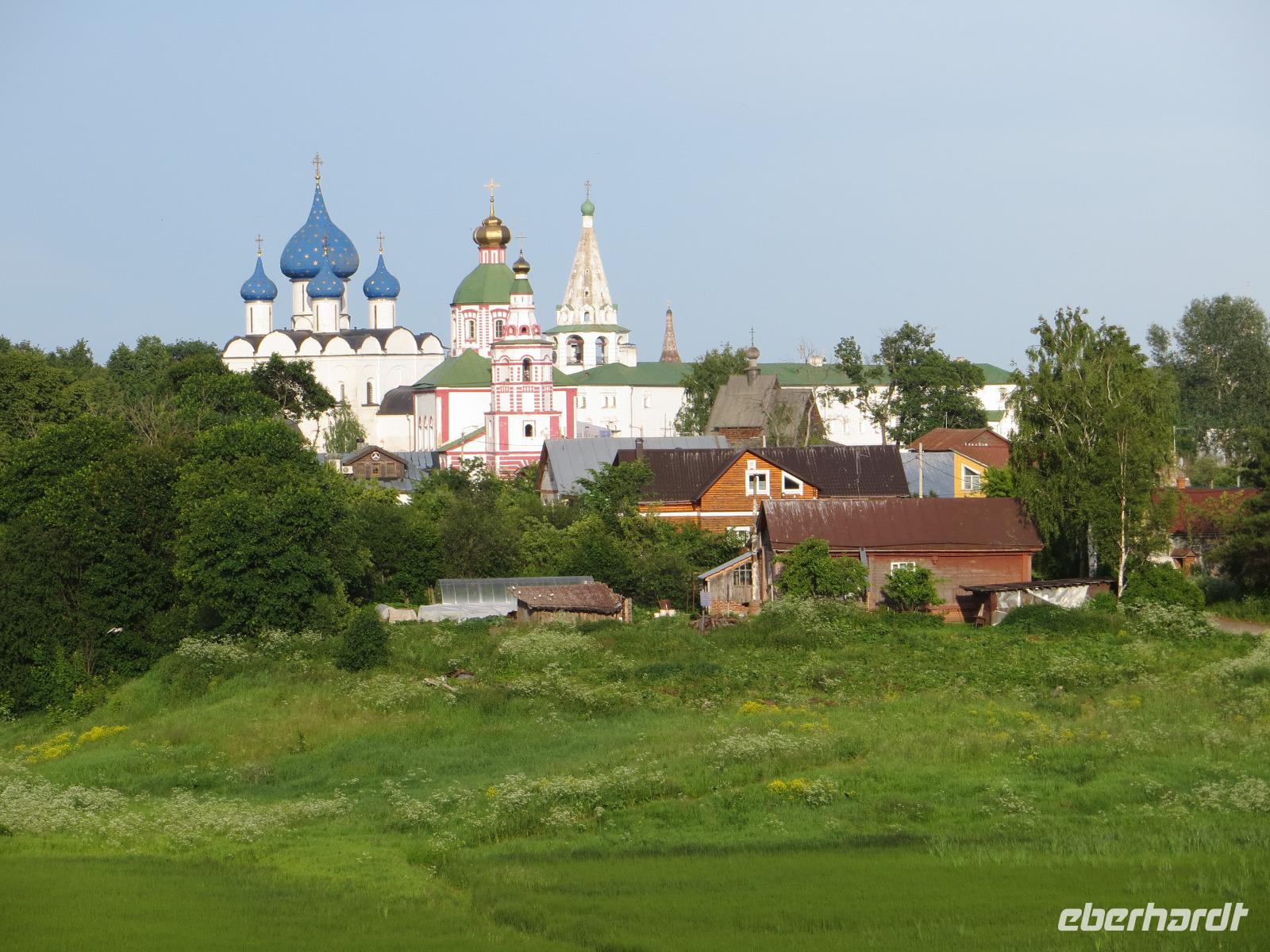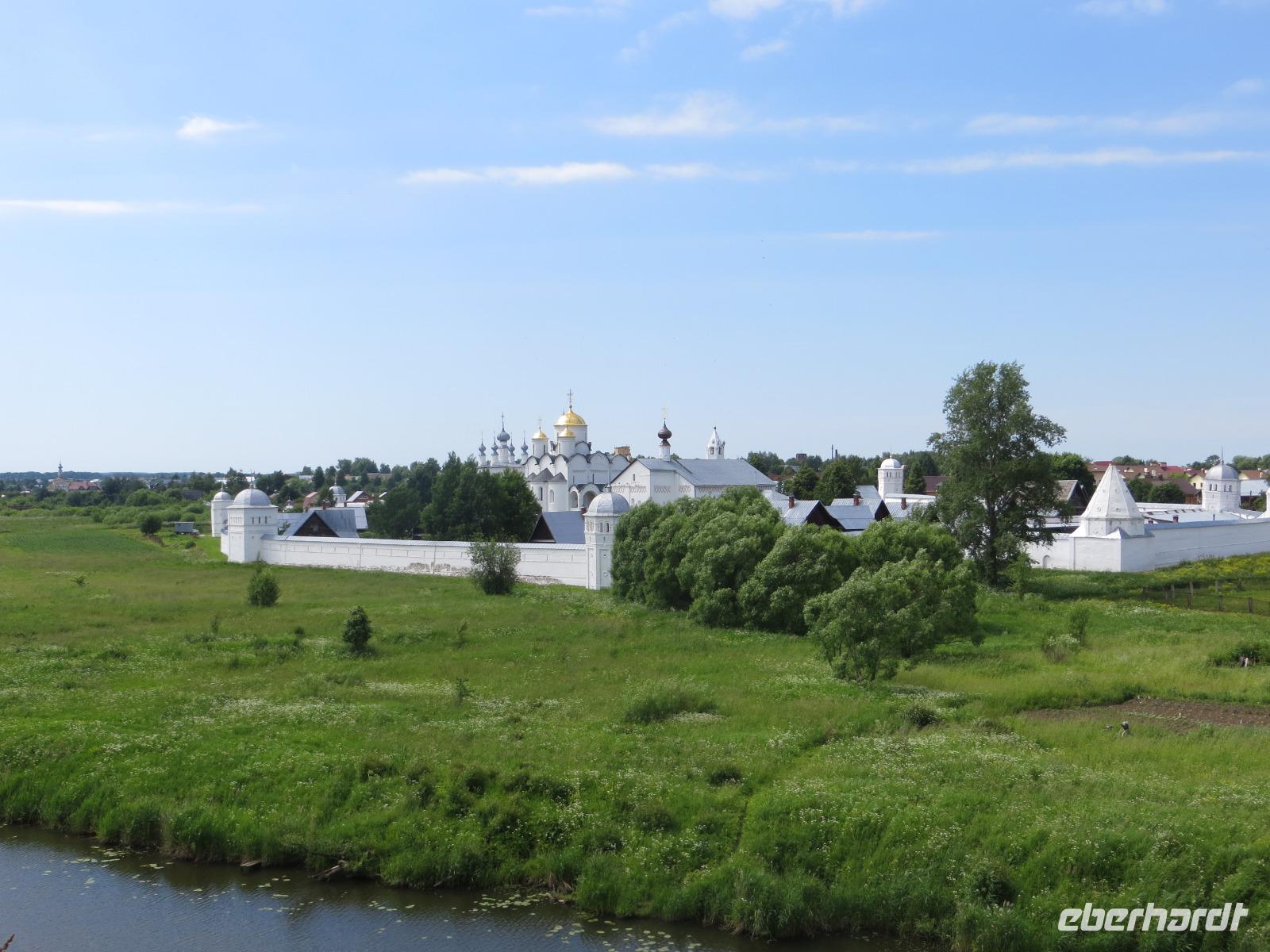 In kleiner Gruppe von nur sieben Gästen starteten wir am Morgen mit einem Mercedes Sprinter Richtung Wladimir, um einige Orte des Goldenen Ringes zu besuchen. Aus Moskau kamen wir recht zügig heraus. Ein Stück über den MKAD, der Moskau auf 108 km Länge als Autobahn umrundet und dann ging es auf der ziemlich neu hergerichteten vierspurigen Straße Richtung Wladimir. Die Stadt, knapp zweihundert km nordöstlich von Moskau hat immerhin 350.000 Einwohner. Uns interessierten jedoch vorrangig das Goldene Tor, die Dimitrius-Kirche und die Maria-Entschlafens-Kirche; Zeitzeugen der Entwicklung der Rus aus dem 12. Jahrhundert mit Unesco-Welterbestatus. Wenige Kilometer von Wladimir entfernt liegt Boguljubovo mit seinem weiß strahlenden Kloster mit blauen Kuppeln; ein aktives, sehr religiöses Kloster mit wohl einhundert Nonnen und Novizinnen sowie einem perfekt geführten Klostergarten zur Eigenversorgung. Mit Interesse sahen wir im alten Kirchengebäude aus dem 12. Jahrhundert auch noch Mauerreste der Anlagen, die Fürst Bogoljubow einst erbauen ließ. Ein Stück unterhalb des Klosters am Zusammenfluss von Kljasma und Nerl liegt die Pokrov-Kirche, die als schönste Kirche des Wladimirer Gebiets gilt. Bei schonstem Wetter bummelten wir durch die grünenden und blühenden Wiesen zum weißen Kirchlein, die sich malerisch im Wasser spiegelte. Nach einer Stunde gemächlichen Gehens stiegen wir in den Bus und fuhren nach Susdal. wo wir im - nun durch Eberhardt-Travel zum zweiten Mal genutzten Hotel Puschkarskaja Sloboda Quartier nahmen. Das Hotel ist eine Ansammlung bestens rekonstruierter Gebäude aus dem 19. Jahrhundert und neu erbauten Holzhäusern. Kaum einen Kilometer entfernt befindet sich der Kreml von Susdal, so dass Interessierte am späten Abend oder Morgen des kommenden Tages bummeln gehen konnten. Am Abend trafen wir uns zum Abendessen auf dem Hofe einer Künstlerfamilie: Salzgurken, eingelegte Tomaten und Kapusta, Salat Olivier, Hähnchenbrust, Dorsch, Tee und süße Piroggen - ein typisch russisches Mahl. Wer wollte, konnte Vodka, Moosbeeren- oder Ebereschenschnaps und russischen Wein aus dem Gebiet Krasnodar probieren.
