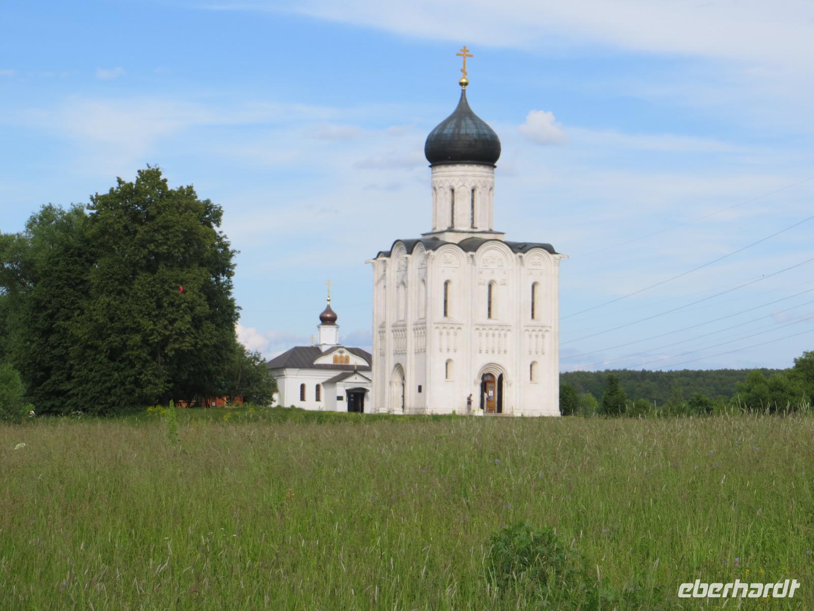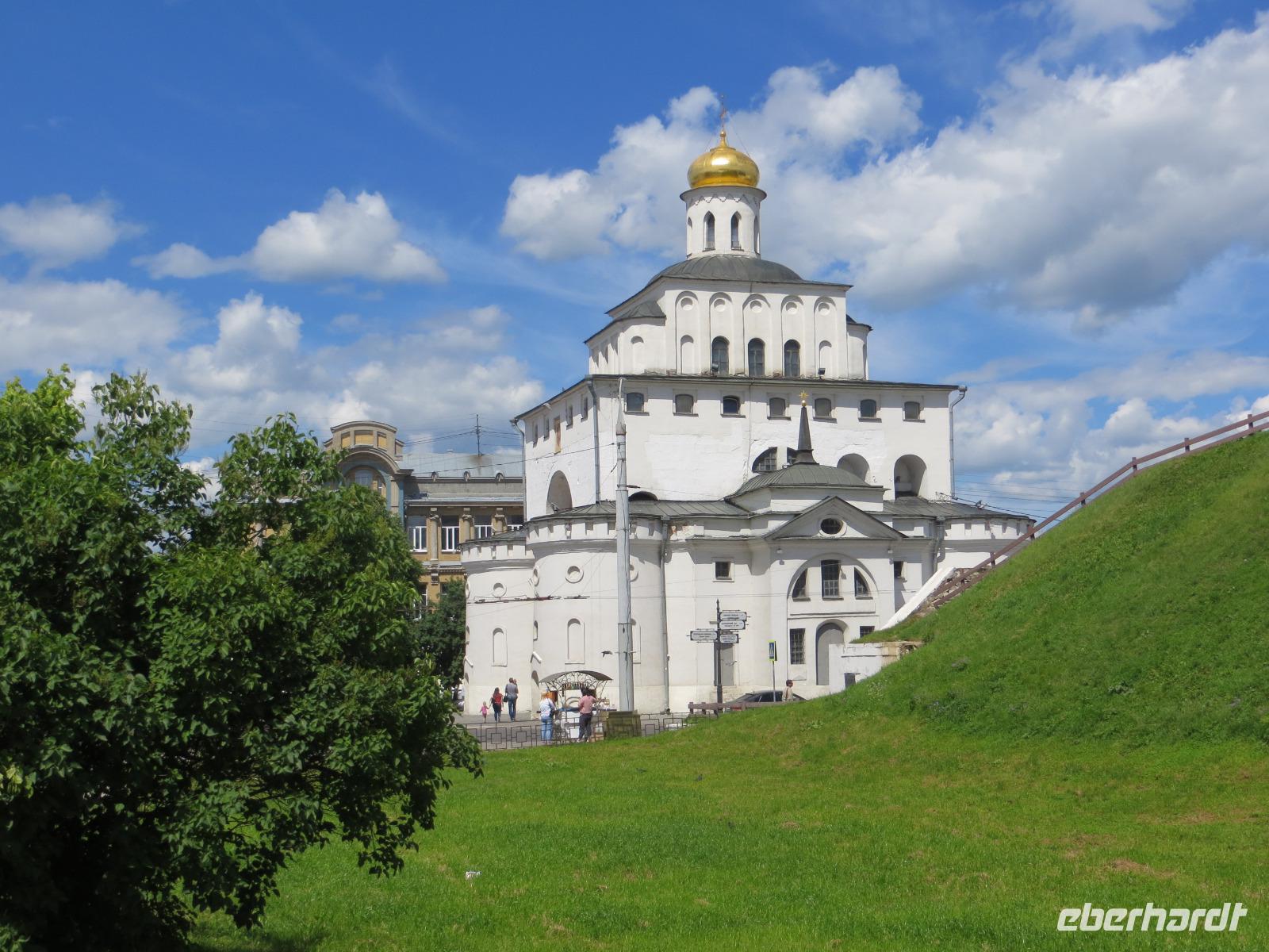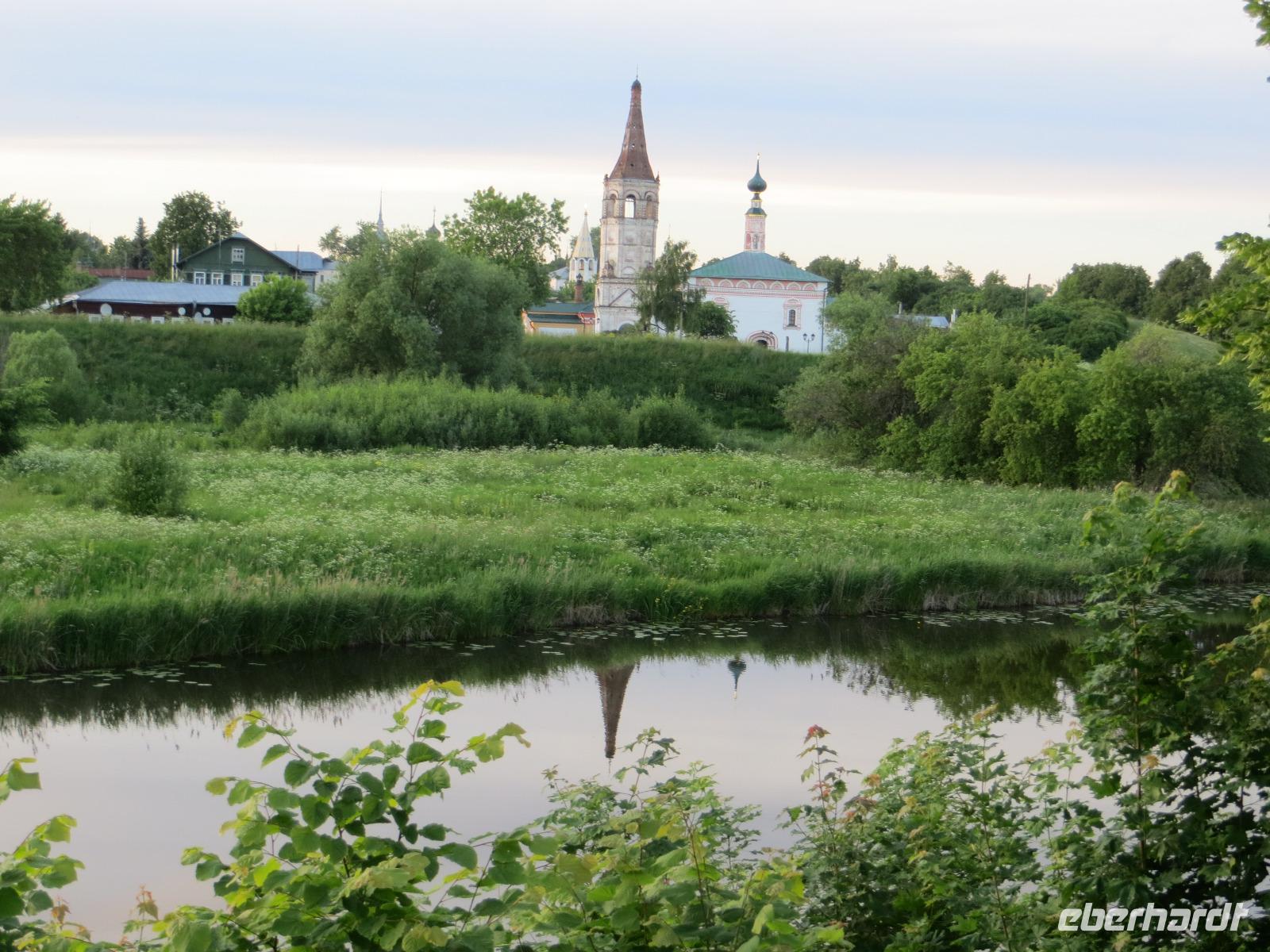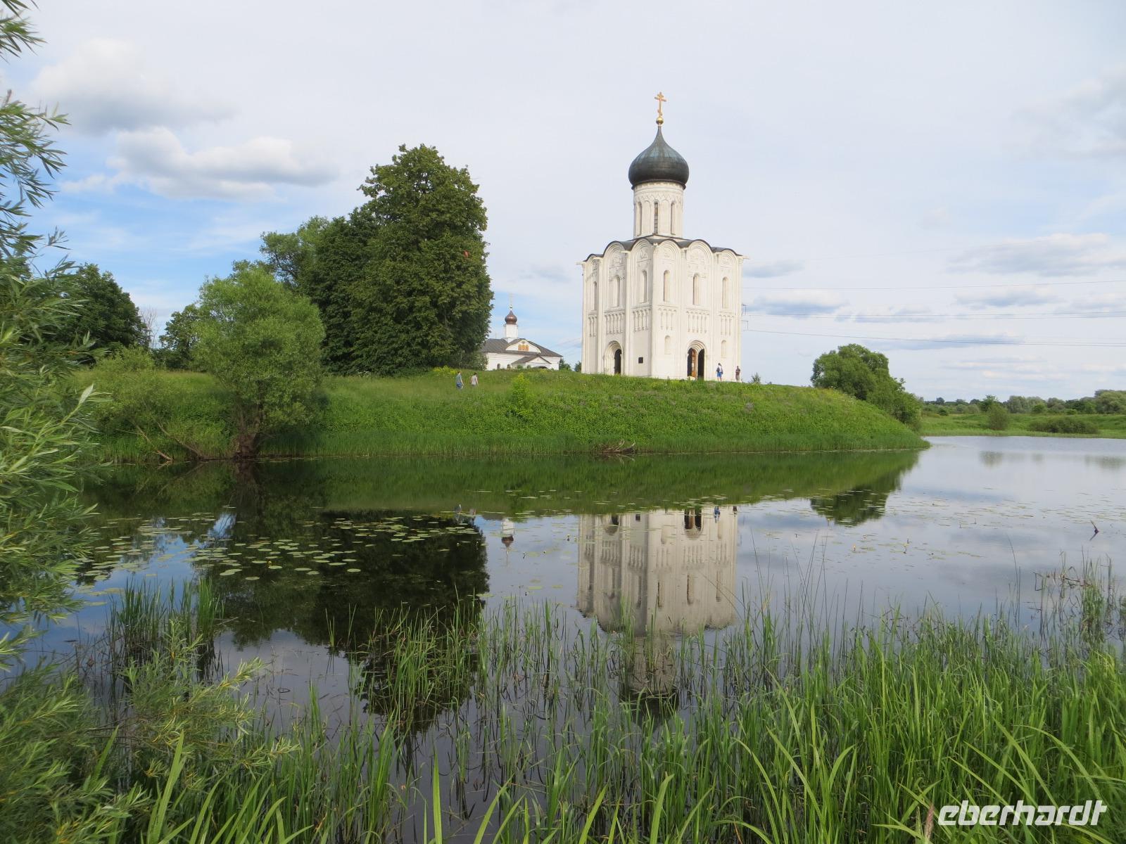 In kleiner Gruppe von nur sieben Gästen starteten wir am Morgen mit einem Mercedes Sprinter Richtung Wladimir, um einige Orte des Goldenen Ringes zu besuchen. Aus Moskau kamen wir recht zügig heraus. Ein Stück über den MKAD, der Moskau auf 108 km Länge als Autobahn umrundet und dann ging es auf der ziemlich neu hergerichteten vierspurigen Straße Richtung Wladimir. Die Stadt, knapp zweihundert km nordöstlich von Moskau hat immerhin 350.000 Einwohner. Uns interessierten jedoch vorrangig das Goldene Tor, die Dimitrius-Kirche und die Maria-Entschlafens-Kirche; Zeitzeugen der Entwicklung der Rus aus dem 12. Jahrhundert mit Unesco-Welterbestatus. Wenige Kilometer von Wladimir entfernt liegt Boguljubovo mit seinem weiß strahlenden Kloster mit blauen Kuppeln; ein aktives, sehr religiöses Kloster mit wohl einhundert Nonnen und Novizinnen sowie einem perfekt geführten Klostergarten zur Eigenversorgung. Mit Interesse sahen wir im alten Kirchengebäude aus dem 12. Jahrhundert auch noch Mauerreste der Anlagen, die Fürst Bogoljubow einst erbauen ließ. Ein Stück unterhalb des Klosters am Zusammenfluss von Kljasma und Nerl liegt die Pokrov-Kirche, die als schönste Kirche des Wladimirer Gebiets gilt. Bei schonstem Wetter bummelten wir durch die grünenden und blühenden Wiesen zum weißen Kirchlein, die sich malerisch im Wasser spiegelte. Nach einer Stunde gemächlichen Gehens stiegen wir in den Bus und fuhren nach Susdal. wo wir im - nun durch Eberhardt-Travel zum zweiten Mal genutzten Hotel Puschkarskaja Sloboda Quartier nahmen. Das Hotel ist eine Ansammlung bestens rekonstruierter Gebäude aus dem 19. Jahrhundert und neu erbauten Holzhäusern. Kaum einen Kilometer entfernt befindet sich der Kreml von Susdal, so dass Interessierte am späten Abend oder Morgen des kommenden Tages bummeln gehen konnten. Am Abend trafen wir uns zum Abendessen auf dem Hofe einer Künstlerfamilie: Salzgurken, eingelegte Tomaten und Kapusta, Salat Olivier, Hähnchenbrust, Dorsch, Tee und süße Piroggen - ein typisch russisches Mahl. Wer wollte, konnte Vodka, Moosbeeren- oder Ebereschenschnaps und russischen Wein aus dem Gebiet Krasnodar probieren.