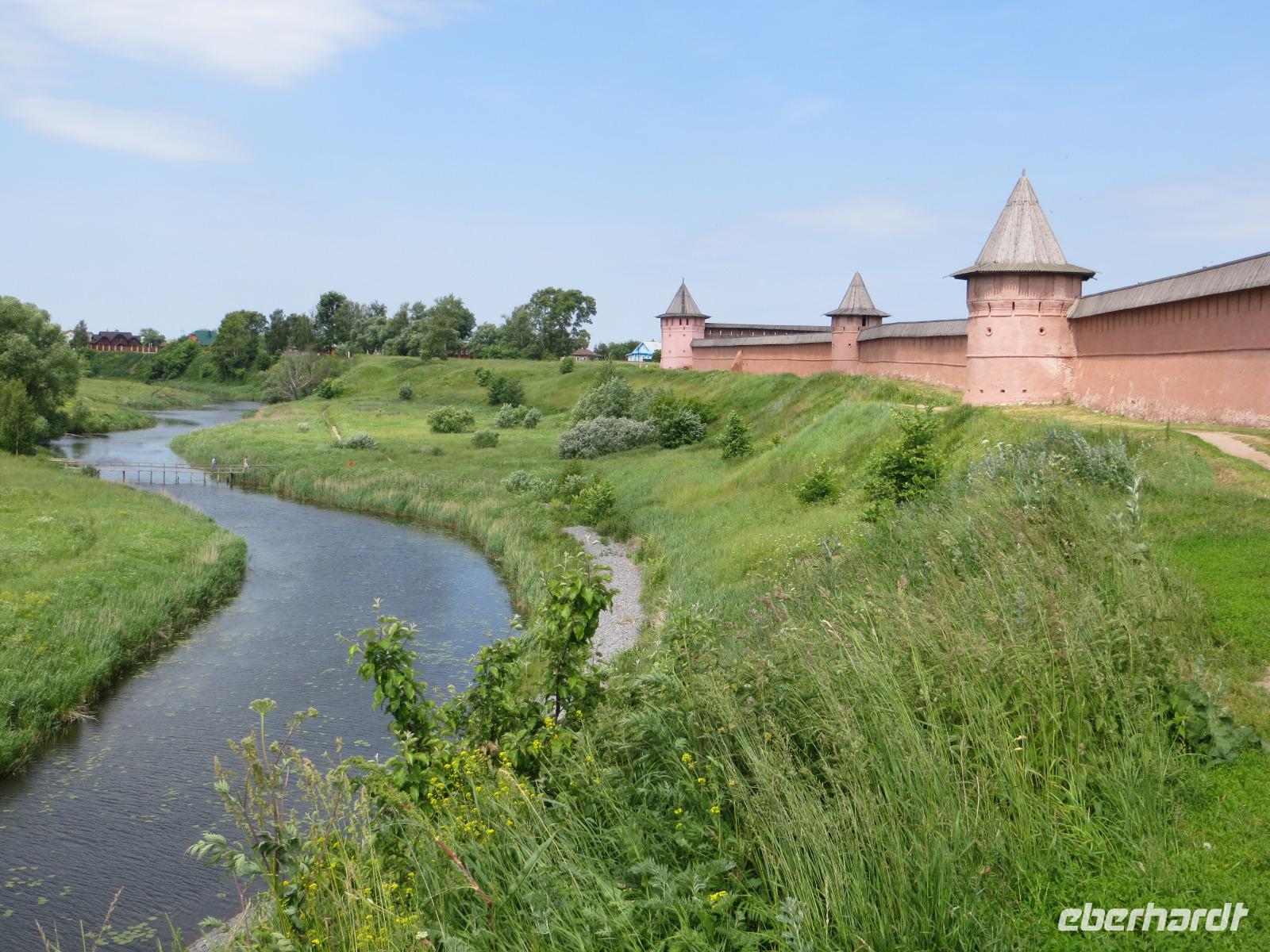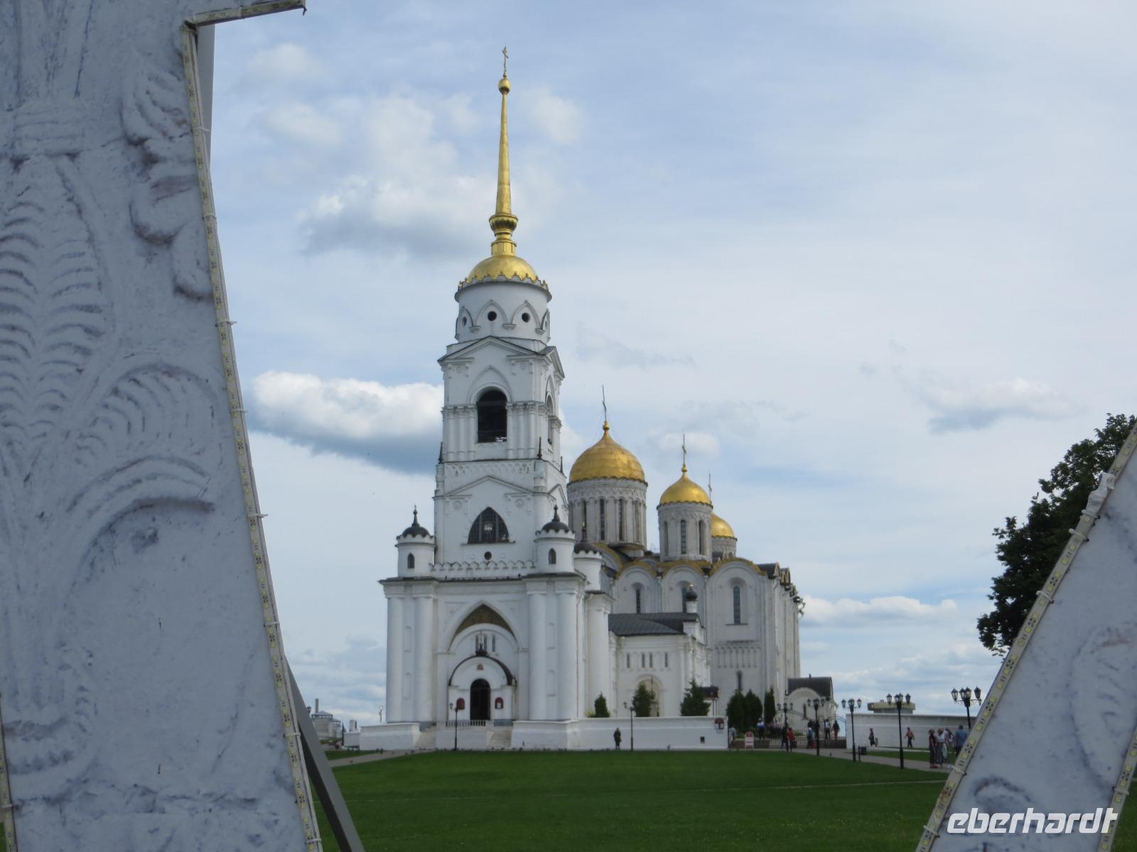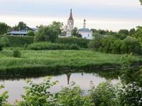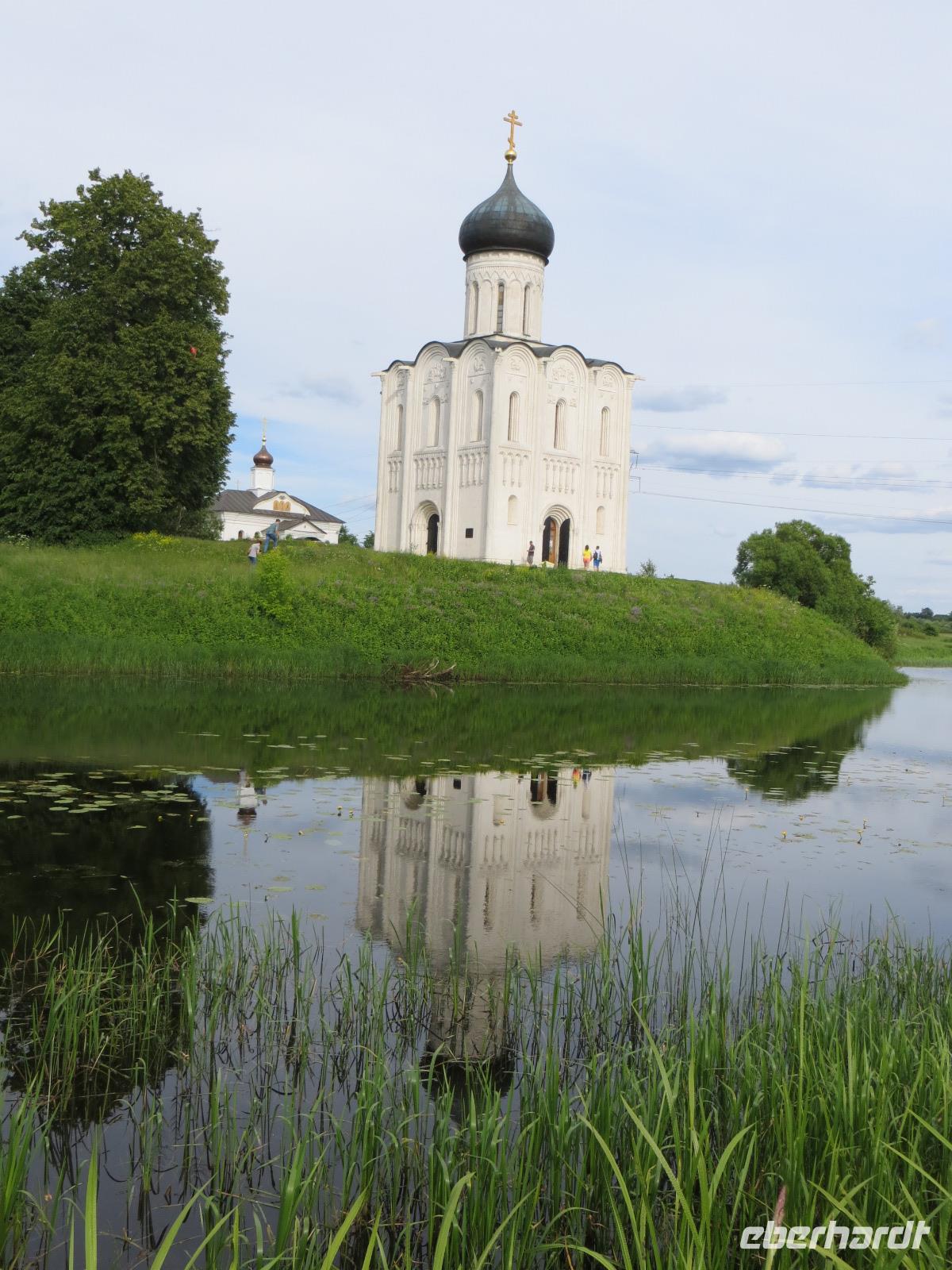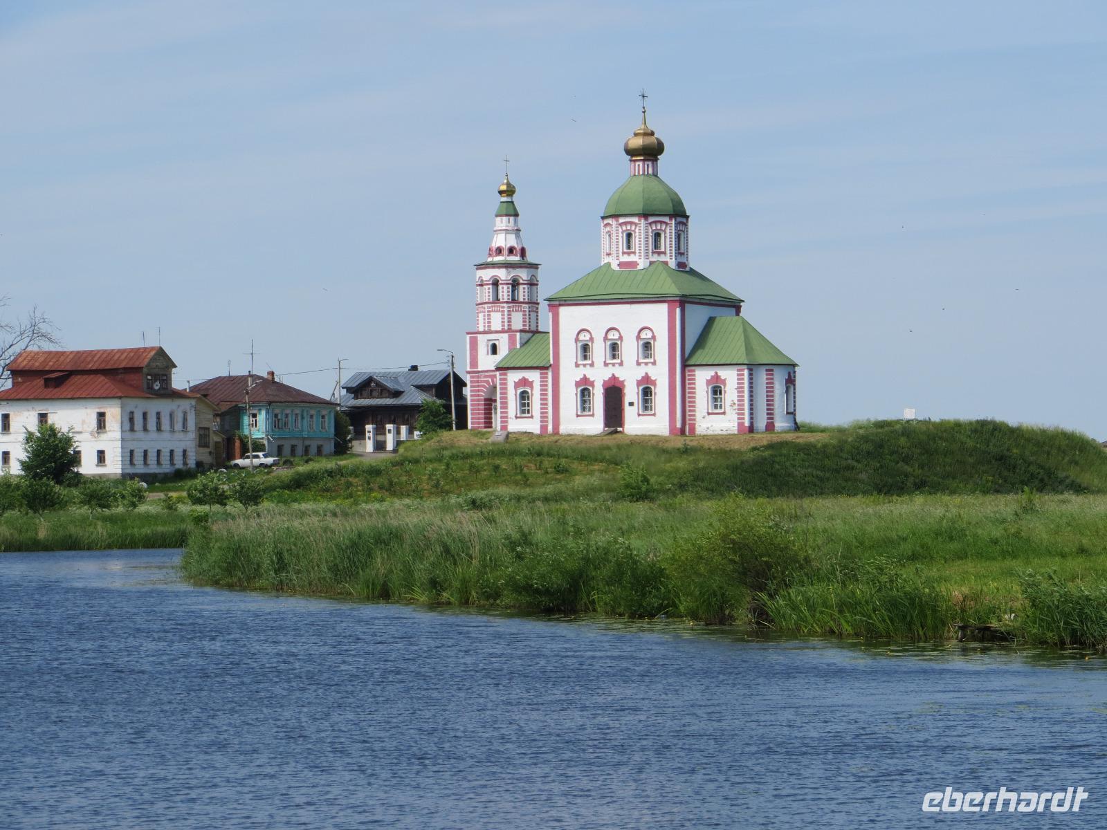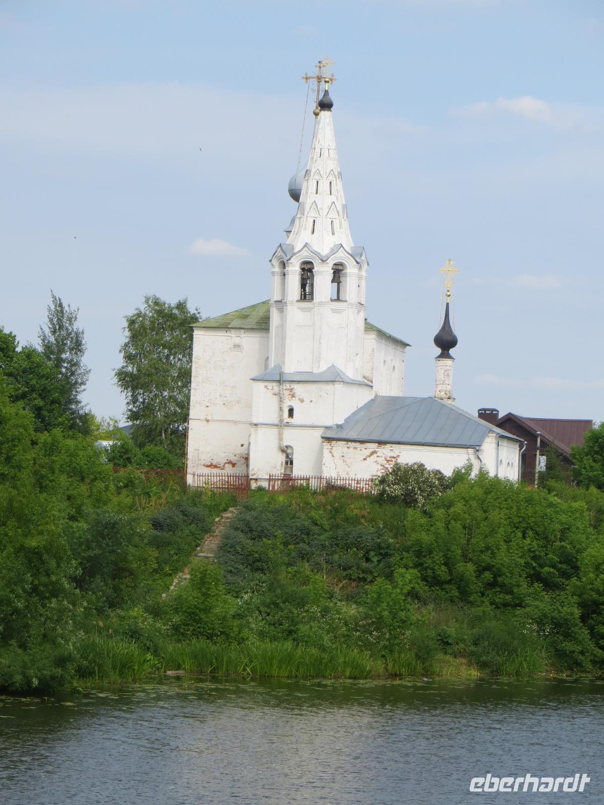 In kleiner Gruppe von nur sieben Gästen starteten wir am Morgen mit einem Mercedes Sprinter Richtung Wladimir, um einige Orte des Goldenen Ringes zu besuchen. Aus Moskau kamen wir recht zügig heraus. Ein Stück über den MKAD, der Moskau auf 108 km Länge als Autobahn umrundet und dann ging es auf der ziemlich neu hergerichteten vierspurigen Straße Richtung Wladimir. Die Stadt, knapp zweihundert km nordöstlich von Moskau hat immerhin 350.000 Einwohner. Uns interessierten jedoch vorrangig das Goldene Tor, die Dimitrius-Kirche und die Maria-Entschlafens-Kirche; Zeitzeugen der Entwicklung der Rus aus dem 12. Jahrhundert mit Unesco-Welterbestatus. Wenige Kilometer von Wladimir entfernt liegt Boguljubovo mit seinem weiß strahlenden Kloster mit blauen Kuppeln; ein aktives, sehr religiöses Kloster mit wohl einhundert Nonnen und Novizinnen sowie einem perfekt geführten Klostergarten zur Eigenversorgung. Mit Interesse sahen wir im alten Kirchengebäude aus dem 12. Jahrhundert auch noch Mauerreste der Anlagen, die Fürst Bogoljubow einst erbauen ließ. Ein Stück unterhalb des Klosters am Zusammenfluss von Kljasma und Nerl liegt die Pokrov-Kirche, die als schönste Kirche des Wladimirer Gebiets gilt. Bei schonstem Wetter bummelten wir durch die grünenden und blühenden Wiesen zum weißen Kirchlein, die sich malerisch im Wasser spiegelte. Nach einer Stunde gemächlichen Gehens stiegen wir in den Bus und fuhren nach Susdal. wo wir im - nun durch Eberhardt-Travel zum zweiten Mal genutzten Hotel Puschkarskaja Sloboda Quartier nahmen. Das Hotel ist eine Ansammlung bestens rekonstruierter Gebäude aus dem 19. Jahrhundert und neu erbauten Holzhäusern. Kaum einen Kilometer entfernt befindet sich der Kreml von Susdal, so dass Interessierte am späten Abend oder Morgen des kommenden Tages bummeln gehen konnten. Am Abend trafen wir uns zum Abendessen auf dem Hofe einer Künstlerfamilie: Salzgurken, eingelegte Tomaten und Kapusta, Salat Olivier, Hähnchenbrust, Dorsch, Tee und süße Piroggen - ein typisch russisches Mahl. Wer wollte, konnte Vodka, Moosbeeren- oder Ebereschenschnaps und russischen Wein aus dem Gebiet Krasnodar probieren.