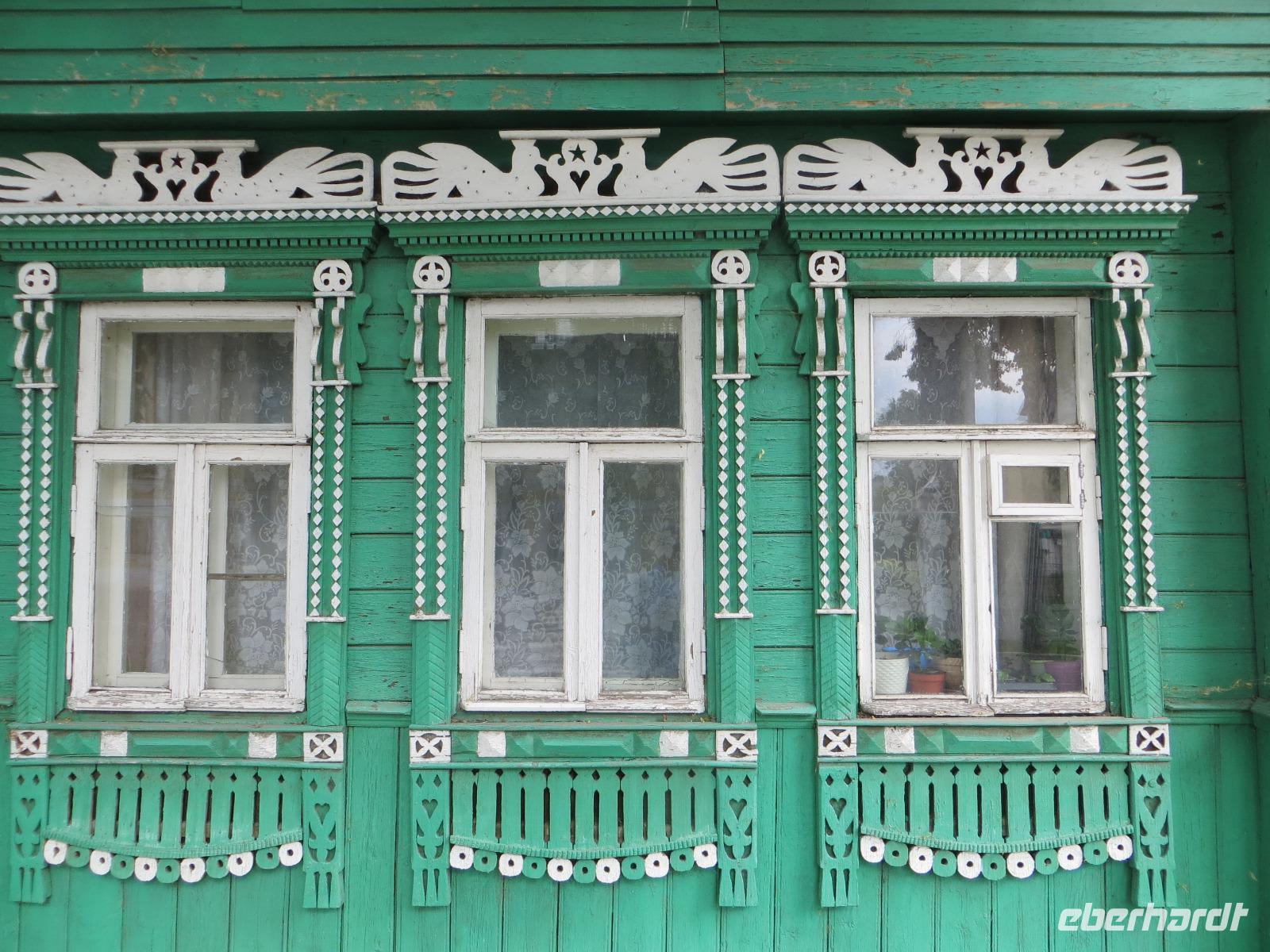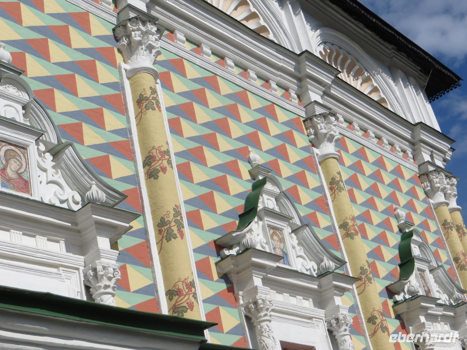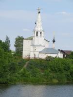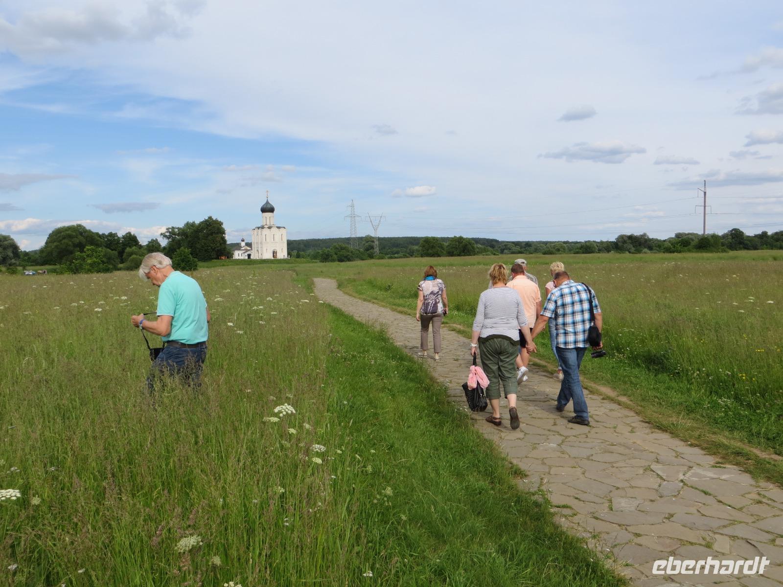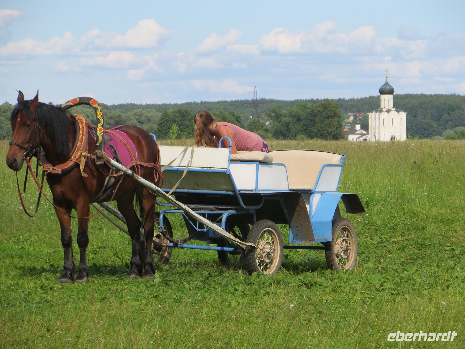 In kleiner Gruppe von nur sieben Gästen starteten wir am Morgen mit einem Mercedes Sprinter Richtung Wladimir, um einige Orte des Goldenen Ringes zu besuchen. Aus Moskau kamen wir recht zügig heraus. Ein Stück über den MKAD, der Moskau auf 108 km Länge als Autobahn umrundet und dann ging es auf der ziemlich neu hergerichteten vierspurigen Straße Richtung Wladimir. Die Stadt, knapp zweihundert km nordöstlich von Moskau hat immerhin 350.000 Einwohner. Uns interessierten jedoch vorrangig das Goldene Tor, die Dimitrius-Kirche und die Maria-Entschlafens-Kirche; Zeitzeugen der Entwicklung der Rus aus dem 12. Jahrhundert mit Unesco-Welterbestatus. Wenige Kilometer von Wladimir entfernt liegt Boguljubovo mit seinem weiß strahlenden Kloster mit blauen Kuppeln; ein aktives, sehr religiöses Kloster mit wohl einhundert Nonnen und Novizinnen sowie einem perfekt geführten Klostergarten zur Eigenversorgung. Mit Interesse sahen wir im alten Kirchengebäude aus dem 12. Jahrhundert auch noch Mauerreste der Anlagen, die Fürst Bogoljubow einst erbauen ließ. Ein Stück unterhalb des Klosters am Zusammenfluss von Kljasma und Nerl liegt die Pokrov-Kirche, die als schönste Kirche des Wladimirer Gebiets gilt. Bei schonstem Wetter bummelten wir durch die grünenden und blühenden Wiesen zum weißen Kirchlein, die sich malerisch im Wasser spiegelte. Nach einer Stunde gemächlichen Gehens stiegen wir in den Bus und fuhren nach Susdal. wo wir im - nun durch Eberhardt-Travel zum zweiten Mal genutzten Hotel Puschkarskaja Sloboda Quartier nahmen. Das Hotel ist eine Ansammlung bestens rekonstruierter Gebäude aus dem 19. Jahrhundert und neu erbauten Holzhäusern. Kaum einen Kilometer entfernt befindet sich der Kreml von Susdal, so dass Interessierte am späten Abend oder Morgen des kommenden Tages bummeln gehen konnten. Am Abend trafen wir uns zum Abendessen auf dem Hofe einer Künstlerfamilie: Salzgurken, eingelegte Tomaten und Kapusta, Salat Olivier, Hähnchenbrust, Dorsch, Tee und süße Piroggen - ein typisch russisches Mahl. Wer wollte, konnte Vodka, Moosbeeren- oder Ebereschenschnaps und russischen Wein aus dem Gebiet Krasnodar probieren.