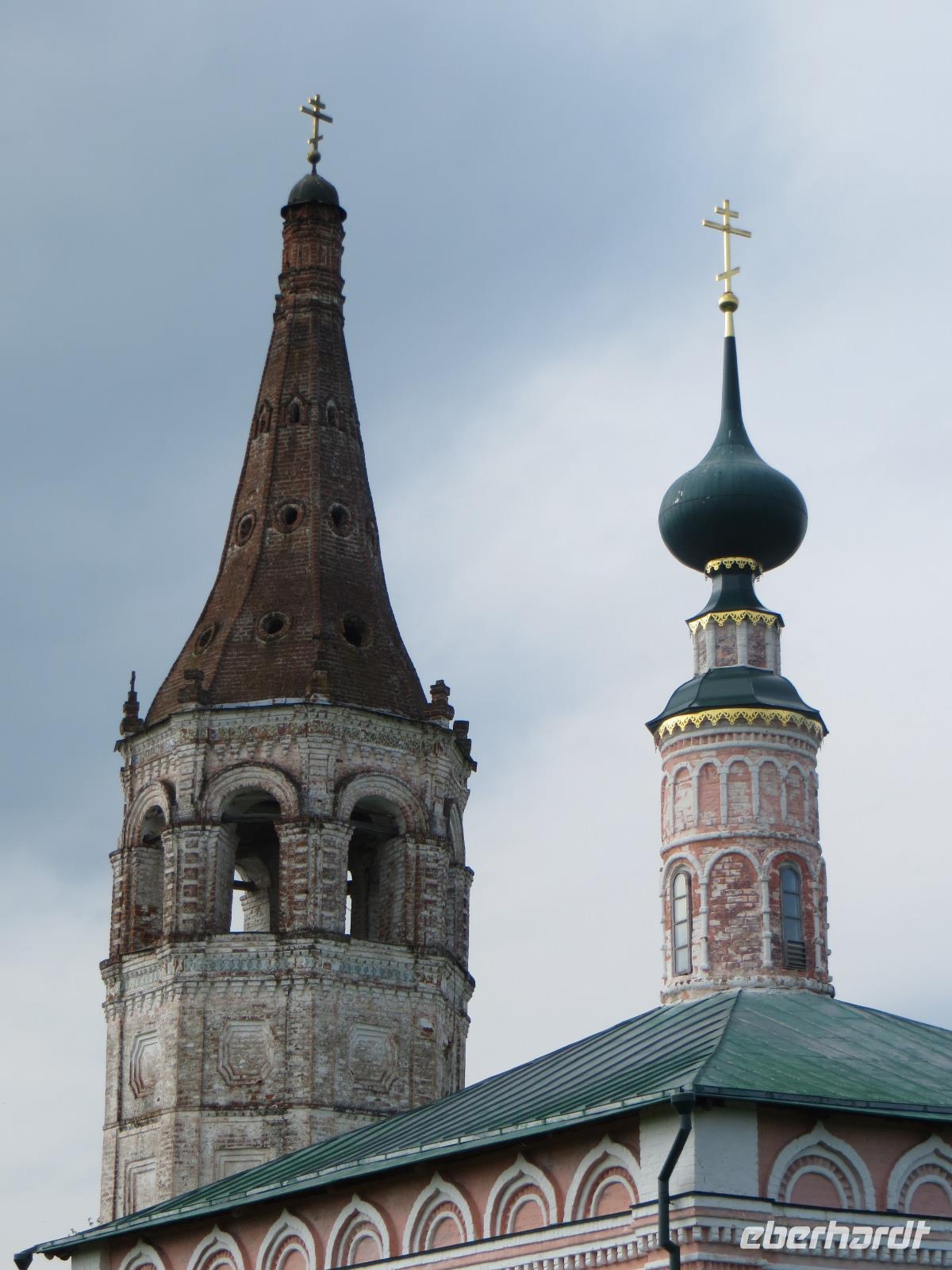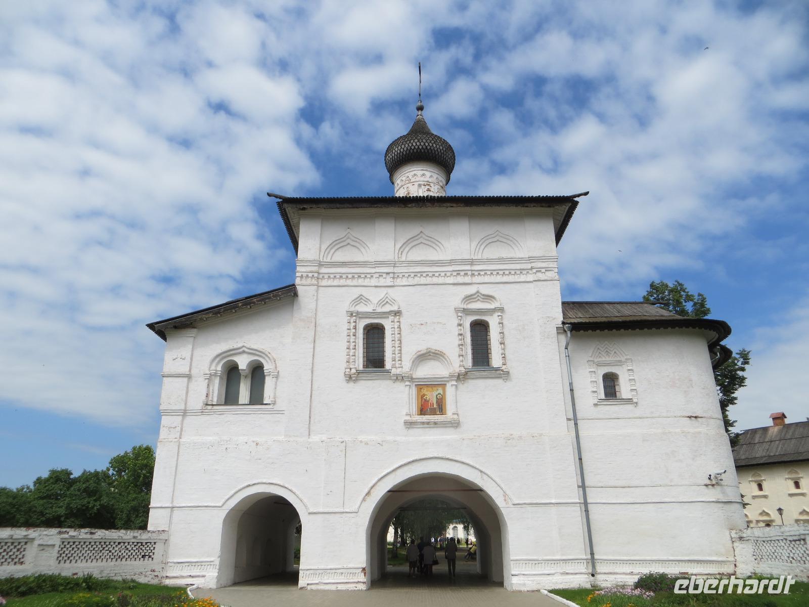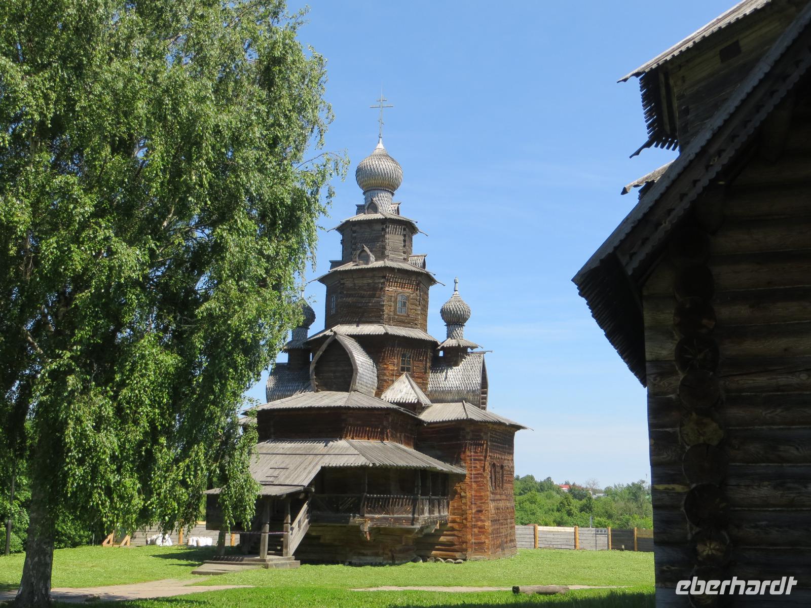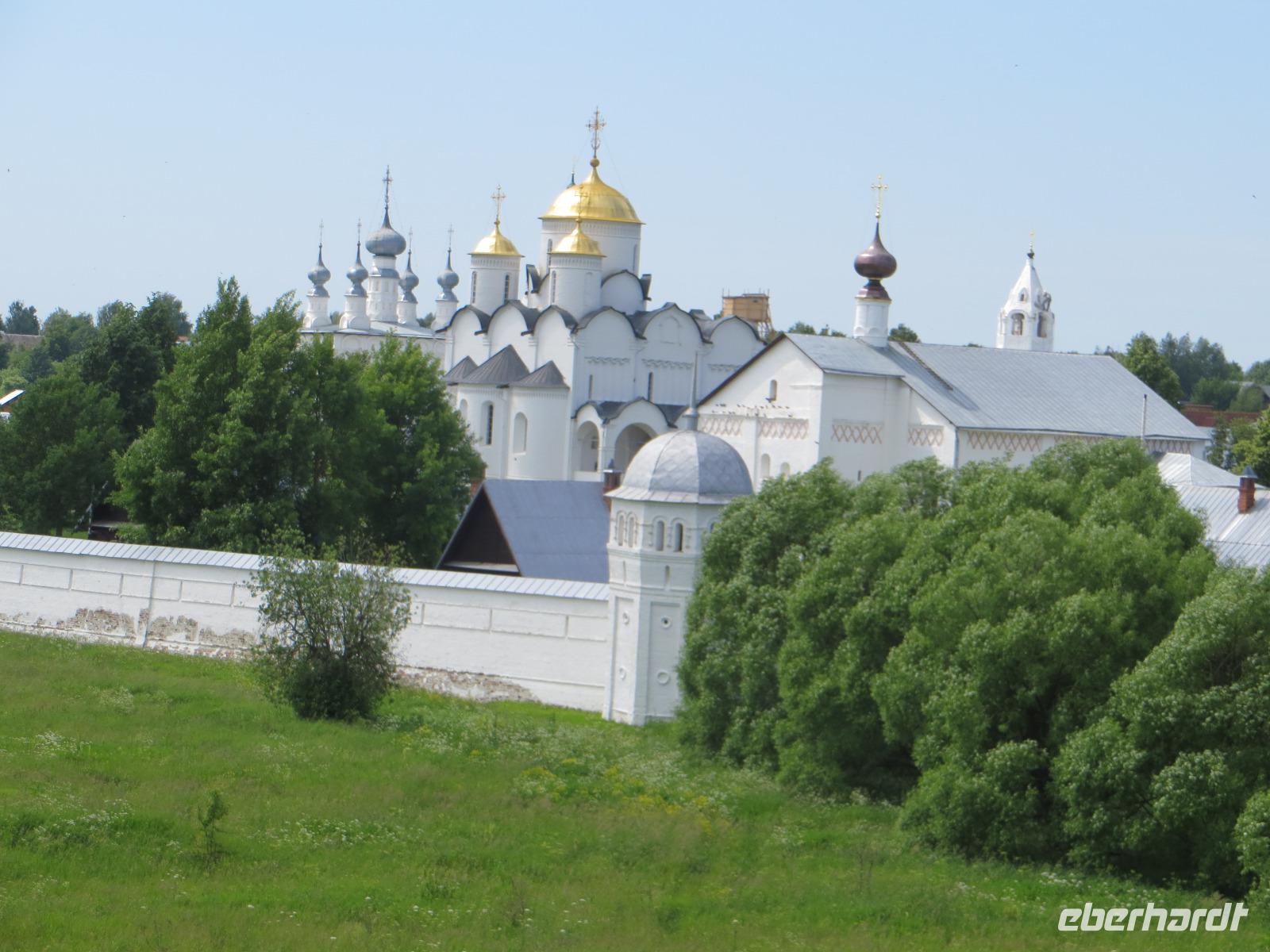 Interessiert verfolgten wir später den Darstellungen der Geschichte des Klosters auch als Haft- und Besserungsanstalt, sowie als Internierungslager für hohe Offiziere der Deutschen Wehrmacht. Vom Hang an der Wehrmauer des Klosters genossen wir den Blick in die grüne Landschaft und hinüber zum Pokrow-Kloster, das wir anschließend besichtigten. Dies ist seit einigen Jahren wieder ein aktives Kloster mit Nonnen. Einst war dies auch „Alterssitz" von Gattinnen russischer Großfürsten und Zaren, so sich die Herren eine neue Auserwählte gesucht hatten. Nicht weit entfernt befindet sich das Museum der regionalen Holzarchitektur, eine Ansammlung verschiedener bäuerlicher und dörflicher Gebäude.