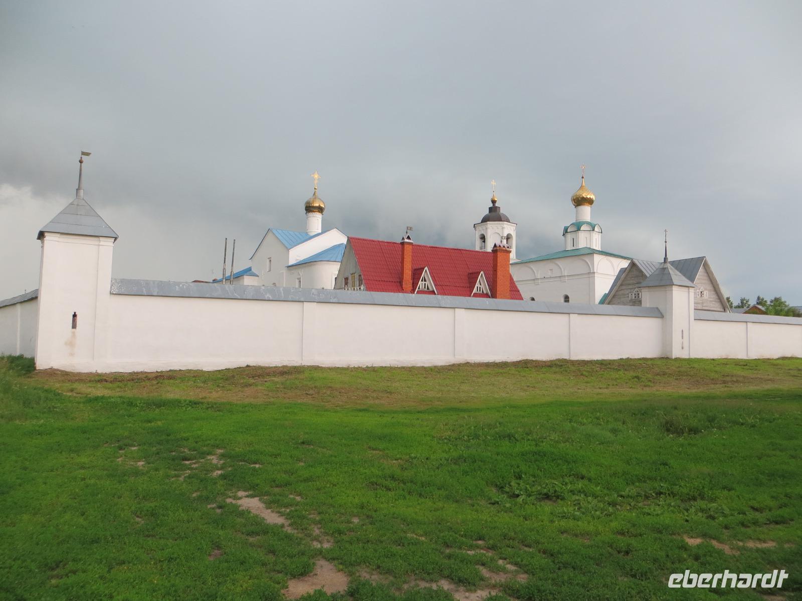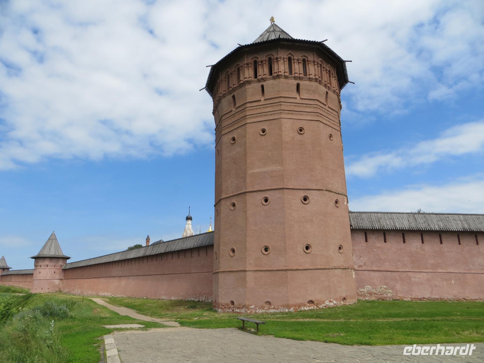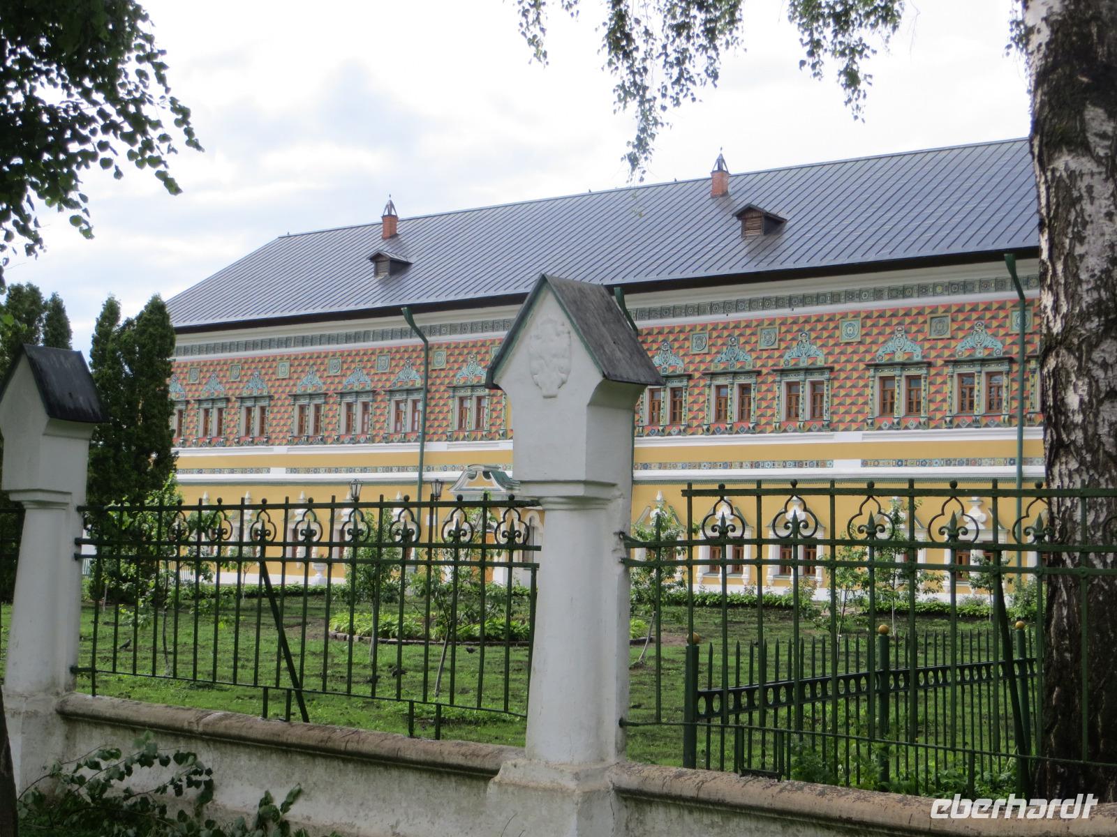 Interessiert verfolgten wir später den Darstellungen der Geschichte des Klosters auch als Haft- und Besserungsanstalt, sowie als Internierungslager für hohe Offiziere der Deutschen Wehrmacht. Vom Hang an der Wehrmauer des Klosters genossen wir den Blick in die grüne Landschaft und hinüber zum Pokrow-Kloster, das wir anschließend besichtigten. Dies ist seit einigen Jahren wieder ein aktives Kloster mit Nonnen. Einst war dies auch „Alterssitz" von Gattinnen russischer Großfürsten und Zaren, so sich die Herren eine neue Auserwählte gesucht hatten. Nicht weit entfernt befindet sich das Museum der regionalen Holzarchitektur, eine Ansammlung verschiedener bäuerlicher und dörflicher Gebäude.