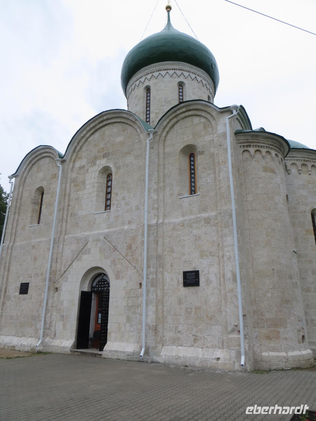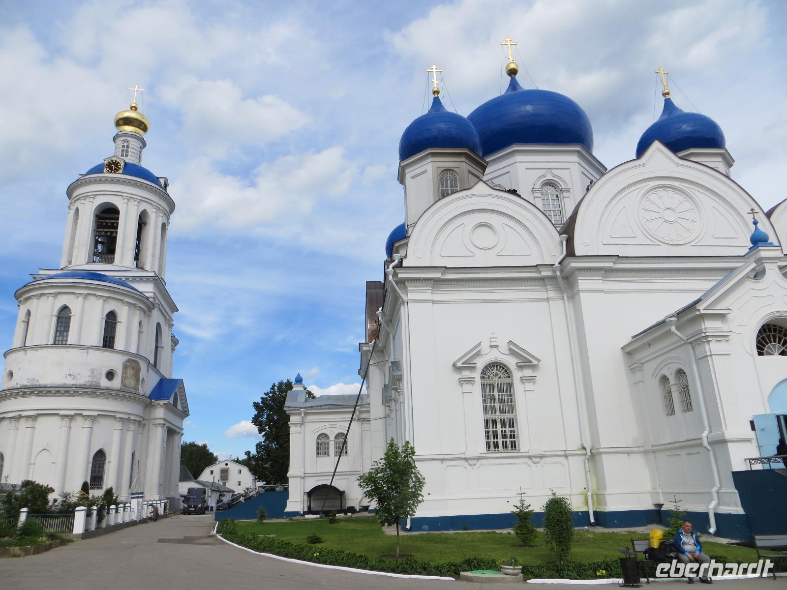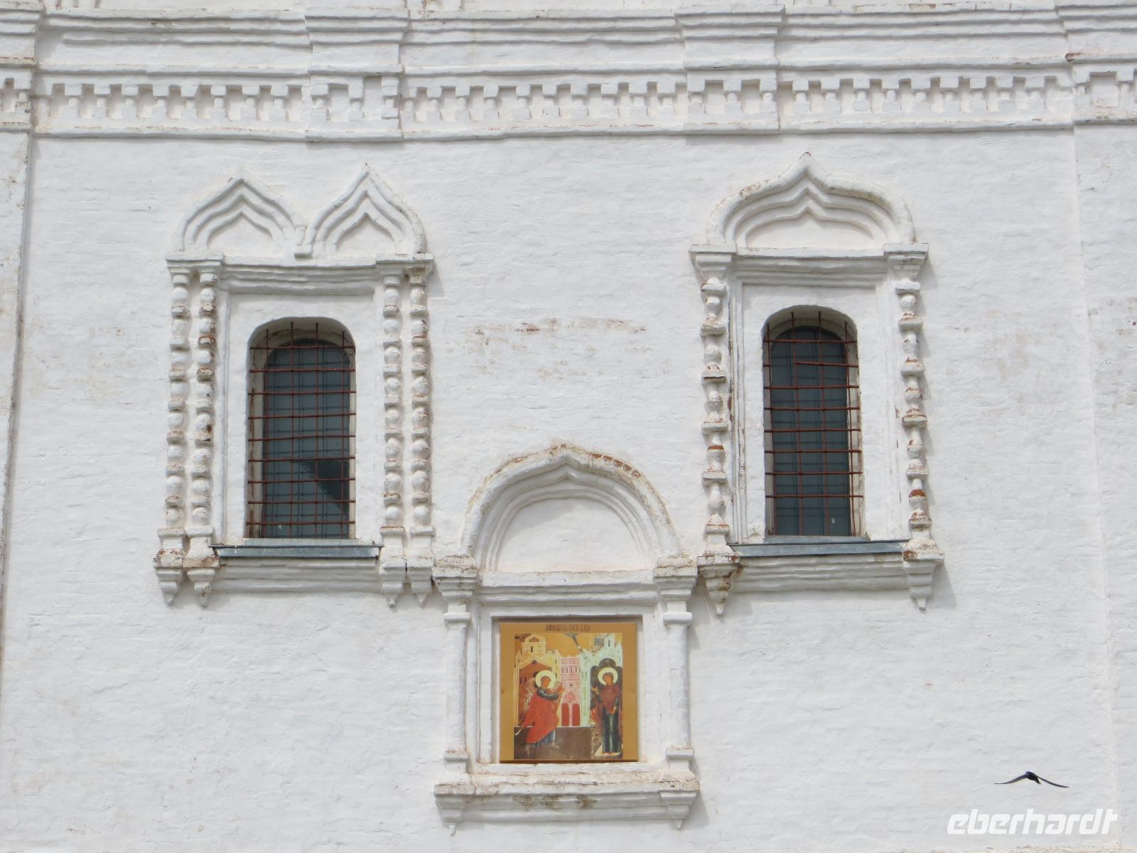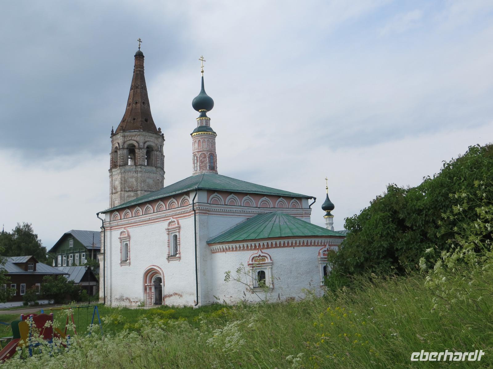 Interessiert verfolgten wir später den Darstellungen der Geschichte des Klosters auch als Haft- und Besserungsanstalt, sowie als Internierungslager für hohe Offiziere der Deutschen Wehrmacht. Vom Hang an der Wehrmauer des Klosters genossen wir den Blick in die grüne Landschaft und hinüber zum Pokrow-Kloster, das wir anschließend besichtigten. Dies ist seit einigen Jahren wieder ein aktives Kloster mit Nonnen. Einst war dies auch „Alterssitz" von Gattinnen russischer Großfürsten und Zaren, so sich die Herren eine neue Auserwählte gesucht hatten. Nicht weit entfernt befindet sich das Museum der regionalen Holzarchitektur, eine Ansammlung verschiedener bäuerlicher und dörflicher Gebäude.