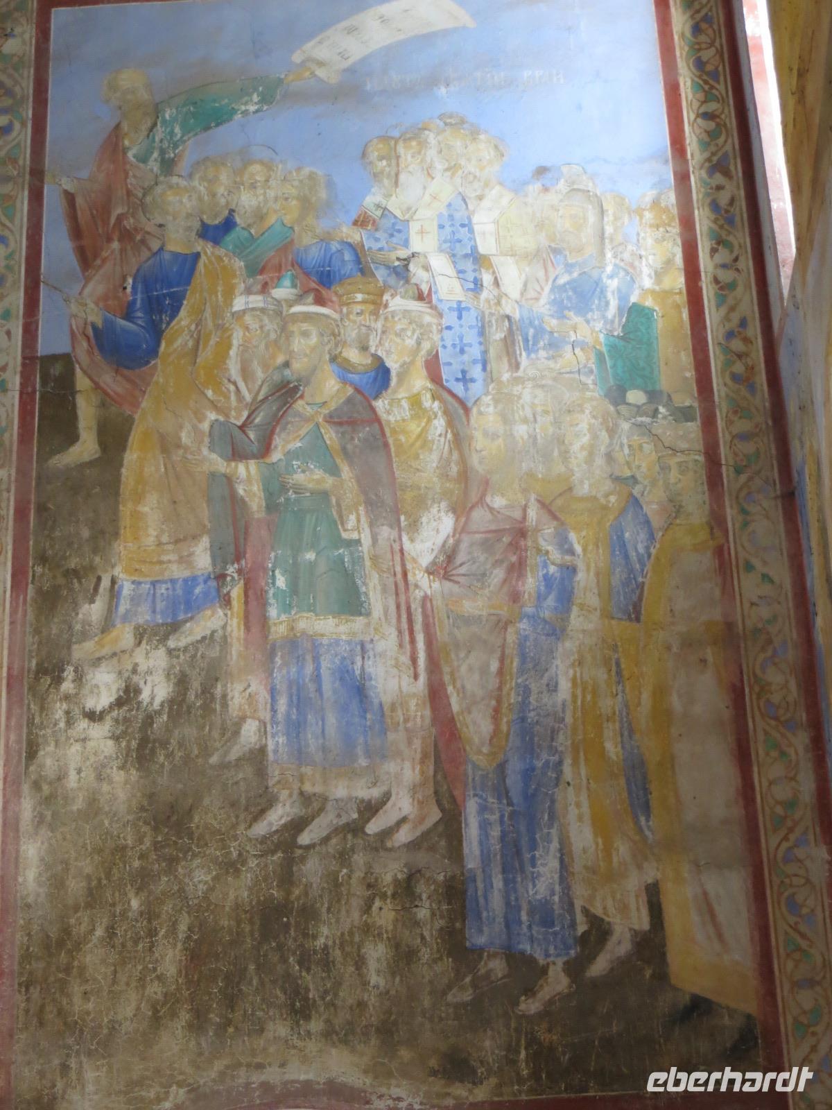 Zum gut ausgeschlafenen Vormittagsstart ging es mit einer kurzen Busfahrt zum Euthymios—Kloster. Hier begrüßte uns das Glockenspiel von 19 Glocken. Anschließend Besichtigung der Erlöser-Verklärungs-Kirche: die teilweise strahlend blauen Wandbilder - quasi die gemalte biblische Geschichte. Hier lauschten wir dem Gesang eines Männergesangsquartetts in beeindruckender Akustik.