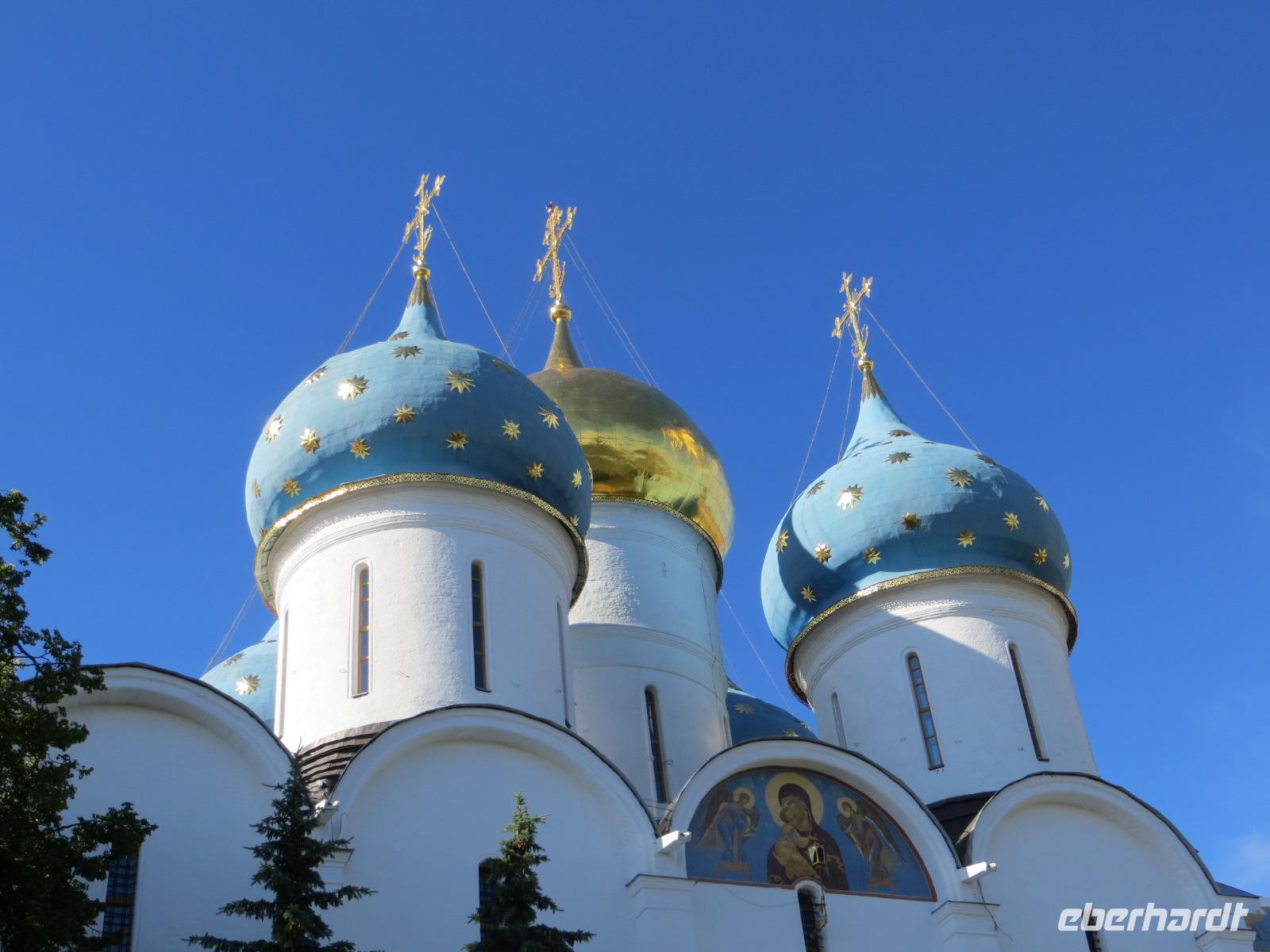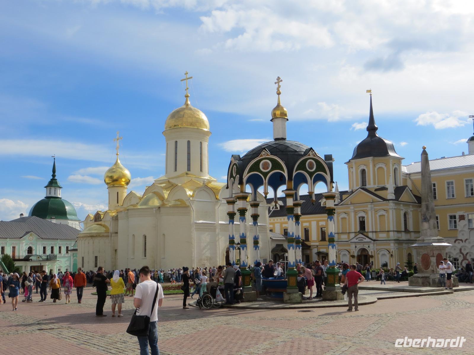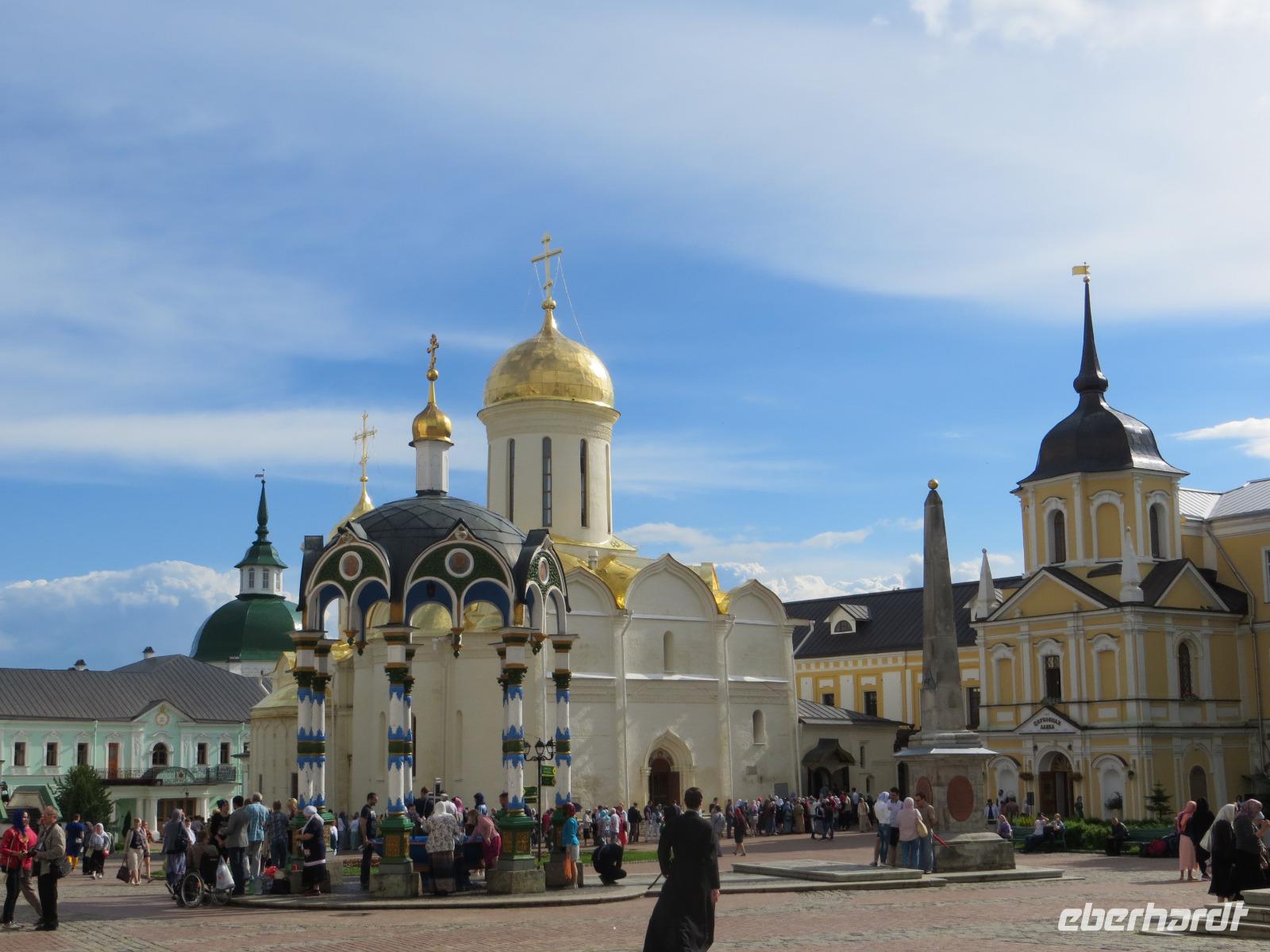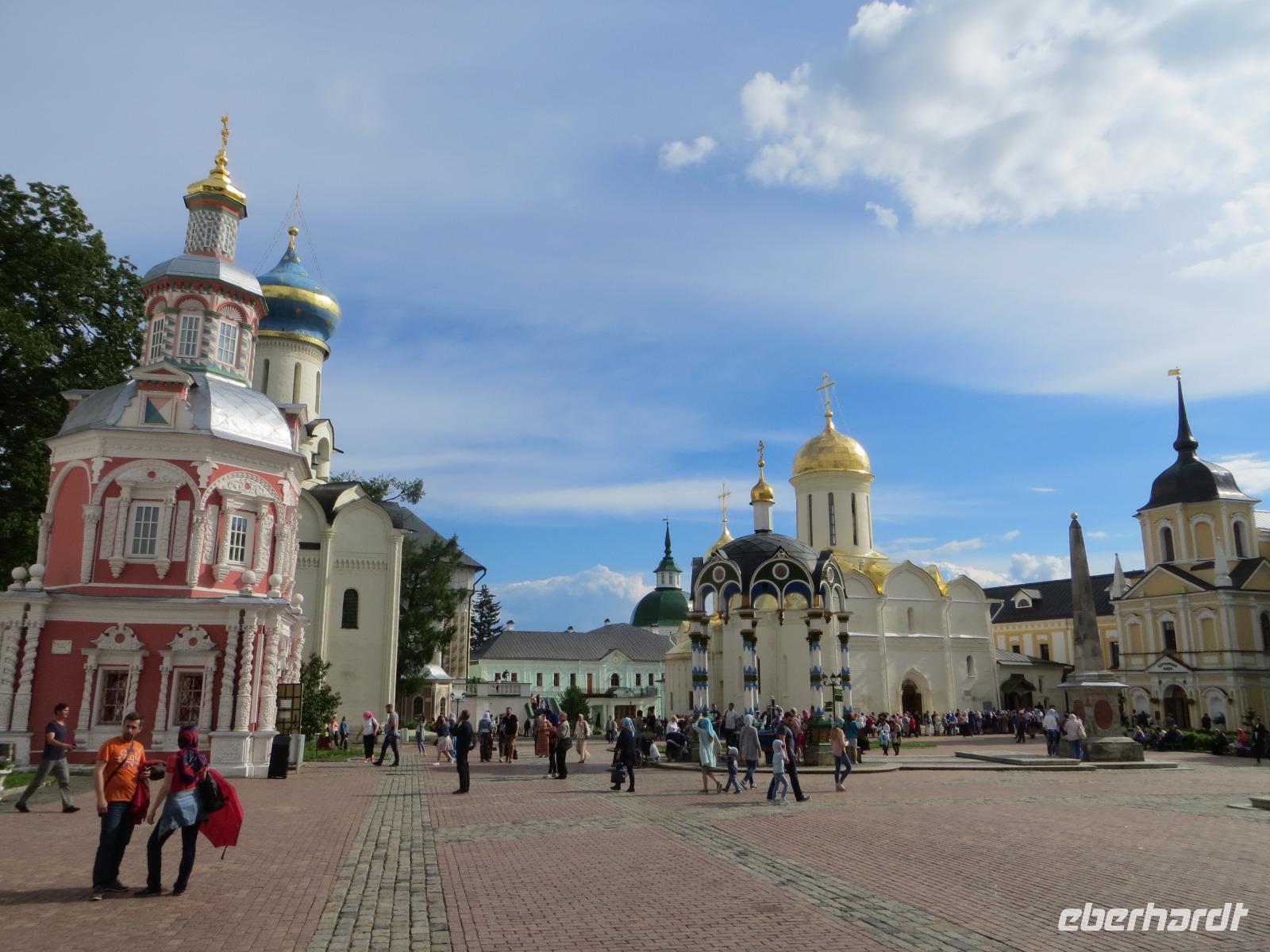 Durch touristisch völlig unerschlossenes Gebiet ging es von Susdal nach Pereslawl Salesski durch Felder, Wiesen und Wälder; vorbei an meist einstöckigen Holzhäusern, riesigen Pflanzen Kaukasischen Bärenklau und über manche Welle im Straßenbelag. Erkenntnis: Russland beginnt bereits vor den Toren Moskaus. Nach zwei Stunden Busfahrt trafen wir in Pereslawl Salesski ein, einer Ortschaft, die durch Juri Dolguruki gegründet wurde. Am Roten Platz befindet sich eine der ältesten weißen Steinkirchen des zentralrussischen Gebietes, die Christi Verklärungs-Kirche. Davor ein Denkmal des Sohnes der Stadt, Alexander Newski. Anschließend besichtigten wir das Bergkloster. Vom gewaltigen Bauwerk auf einem Hügel, das auf eine Rekonstruktion nach der Rückübertragung in kirchliches Eigentum wartet, besteht ein prächtiger Blick auf den Ort mit zahlreichen glitzernden Kirchtürmen bis hinüber zum Plewtschewo-See. Hier plante einst der jugendliche Peter I. den Aufbau einer russischen Marine. Weiterfahrt nach Sergiew Possad, wo Mitte des 14. Jahrhunderts Sergios ein Kloster gründete. Das Kloster gehört zu den bedeutendsten in Russland und besitzt seit Jahrhunderten den Status einer Lawra, eines Klosters 1. Ranges. Heute prägen die Hochschule für Theologie, hunderte Pilger und (zunehmend chinesische) Touristen das Bild, die vor allem in der Dreifaltigkeitskirche zur Grabstätte des Heiligen Sergius wollen. Zum Jubiläum des Heiligen Sergius im Jahr 2014 wurde das Kloster bestens geputzt - die goldenen und blauen Türme blinkten in der Sonne. Nach einhundert minütiger Fahrt, in der Nähe des russischen Raumfahrtzentrums in Koroljov vorbei, erreichten wir das uns bekannte Hotel Sunflower Park, verabschiedeten uns von Reiseleiterin Olga und Busfahrer Denis.