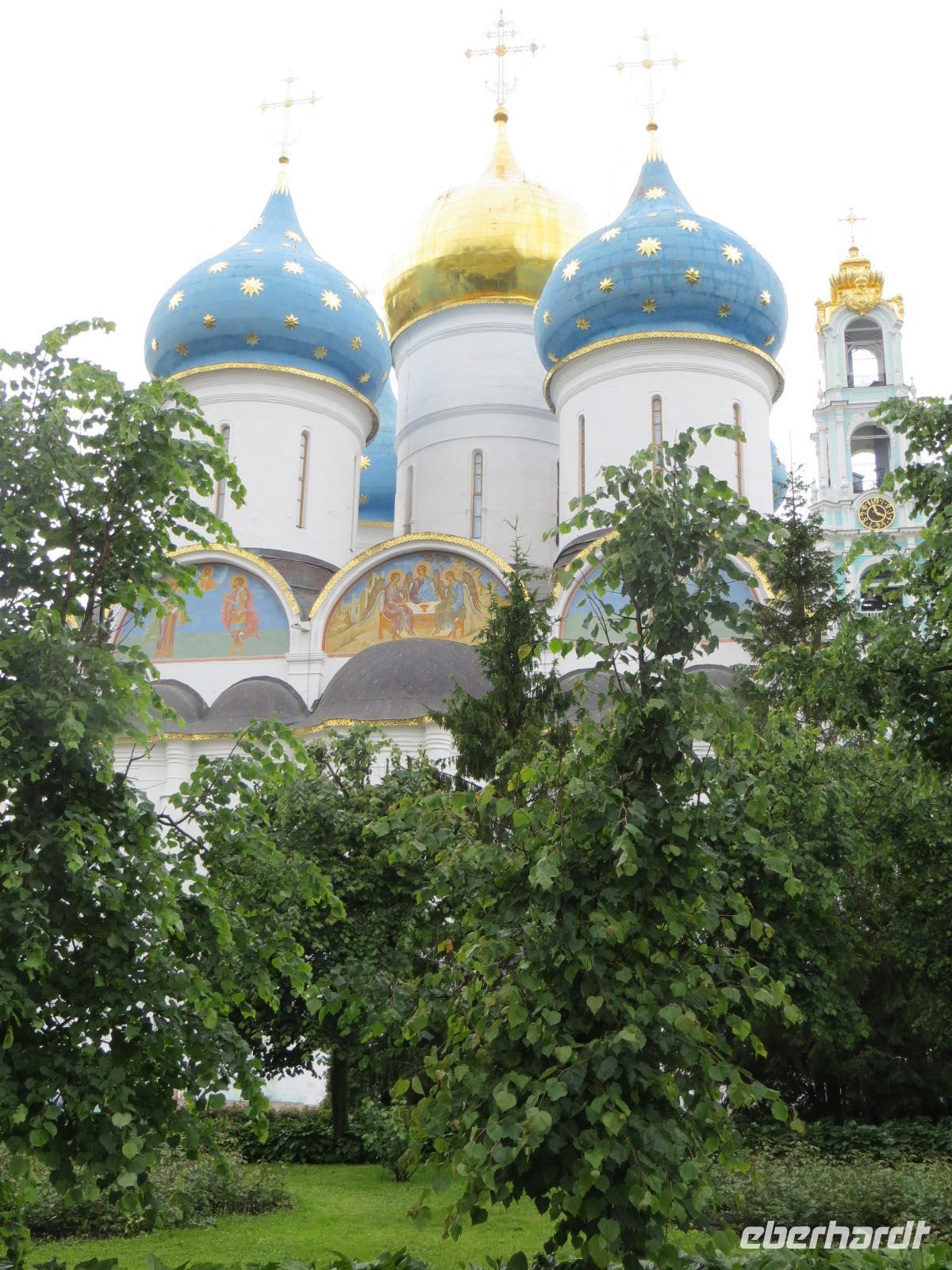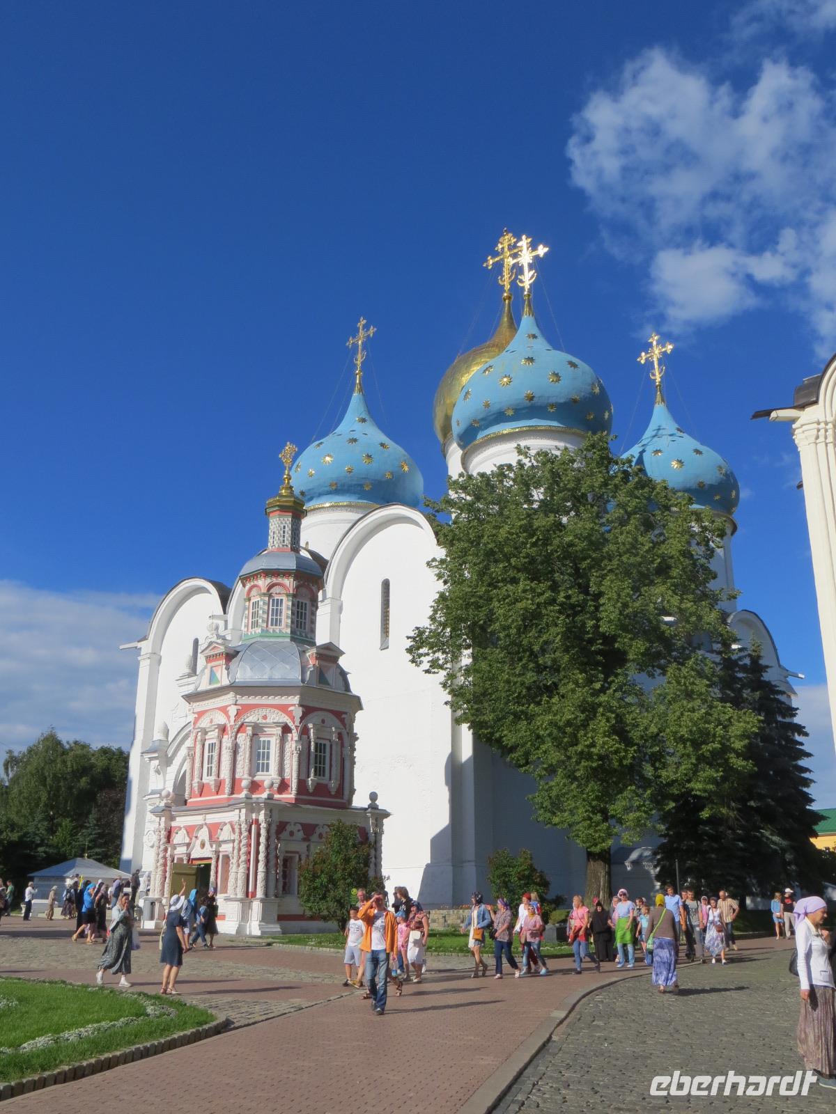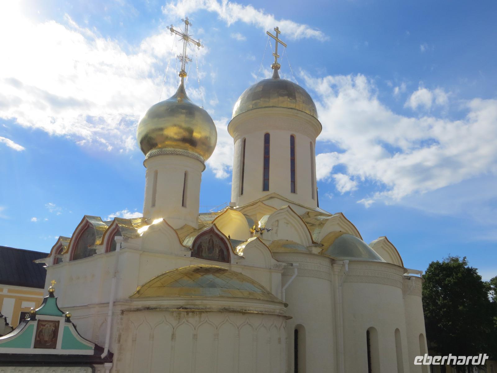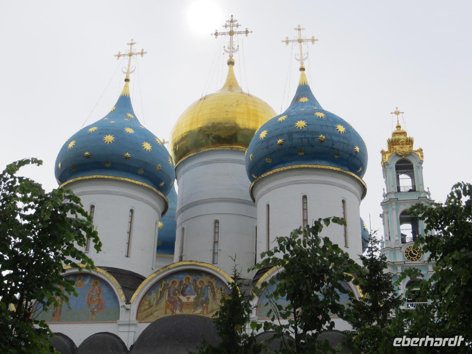 Durch touristisch völlig unerschlossenes Gebiet ging es von Susdal nach Pereslawl Salesski durch Felder, Wiesen und Wälder; vorbei an meist einstöckigen Holzhäusern, riesigen Pflanzen Kaukasischen Bärenklau und über manche Welle im Straßenbelag. Erkenntnis: Russland beginnt bereits vor den Toren Moskaus. Nach zwei Stunden Busfahrt trafen wir in Pereslawl Salesski ein, einer Ortschaft, die durch Juri Dolguruki gegründet wurde. Am Roten Platz befindet sich eine der ältesten weißen Steinkirchen des zentralrussischen Gebietes, die Christi Verklärungs-Kirche. Davor ein Denkmal des Sohnes der Stadt, Alexander Newski. Anschließend besichtigten wir das Bergkloster. Vom gewaltigen Bauwerk auf einem Hügel, das auf eine Rekonstruktion nach der Rückübertragung in kirchliches Eigentum wartet, besteht ein prächtiger Blick auf den Ort mit zahlreichen glitzernden Kirchtürmen bis hinüber zum Plewtschewo-See. Hier plante einst der jugendliche Peter I. den Aufbau einer russischen Marine. Weiterfahrt nach Sergiew Possad, wo Mitte des 14. Jahrhunderts Sergios ein Kloster gründete. Das Kloster gehört zu den bedeutendsten in Russland und besitzt seit Jahrhunderten den Status einer Lawra, eines Klosters 1. Ranges. Heute prägen die Hochschule für Theologie, hunderte Pilger und (zunehmend chinesische) Touristen das Bild, die vor allem in der Dreifaltigkeitskirche zur Grabstätte des Heiligen Sergius wollen. Zum Jubiläum des Heiligen Sergius im Jahr 2014 wurde das Kloster bestens geputzt - die goldenen und blauen Türme blinkten in der Sonne. Nach einhundert minütiger Fahrt, in der Nähe des russischen Raumfahrtzentrums in Koroljov vorbei, erreichten wir das uns bekannte Hotel Sunflower Park, verabschiedeten uns von Reiseleiterin Olga und Busfahrer Denis.
