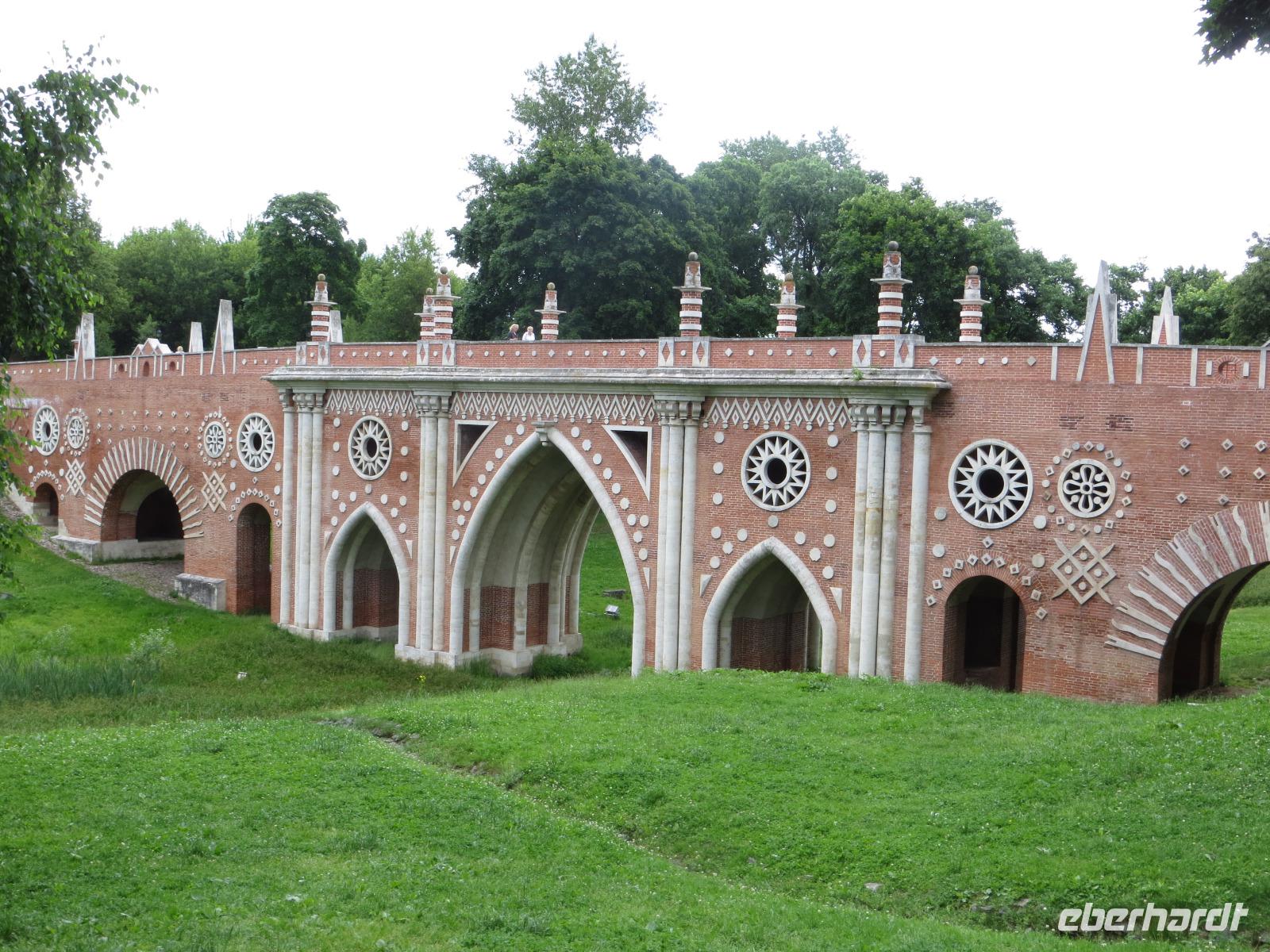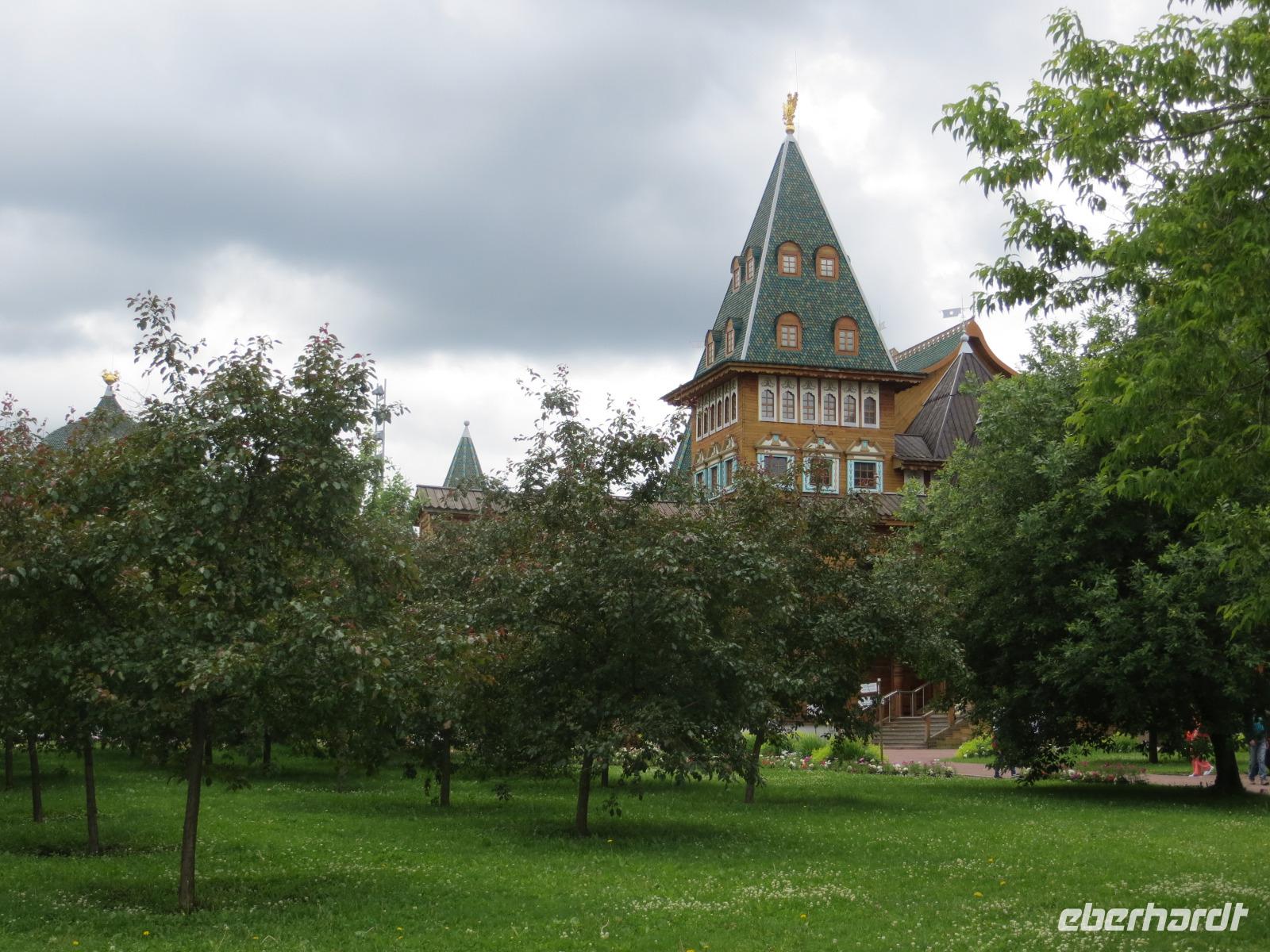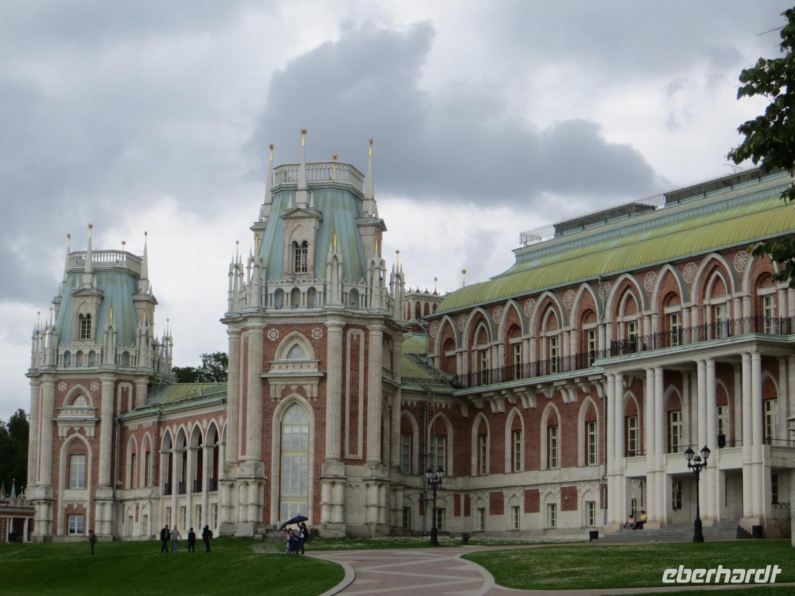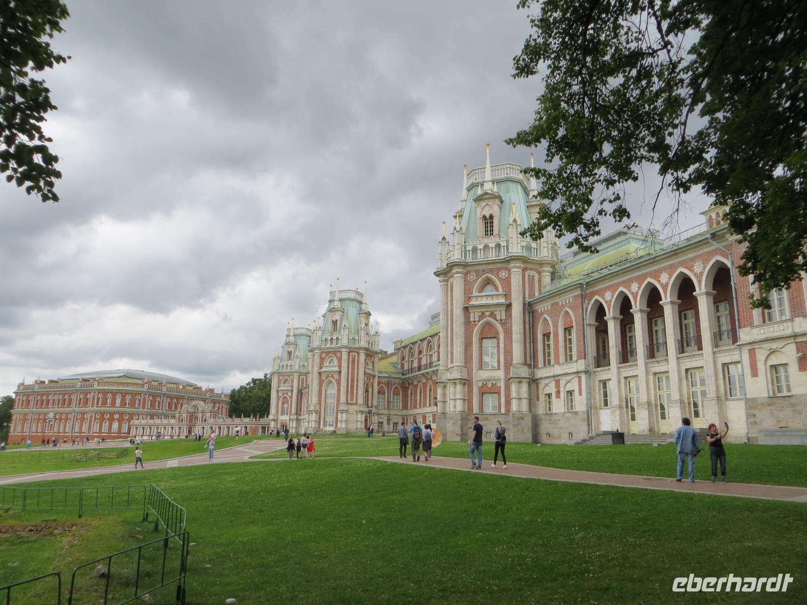 Vom Hotel benötigt man am Sonntag nur eine halbe Stunde, um mit dem Bus nach Kolomenskoje zu gelangen. Im alten Museumsteil, inmitten von Eichenbäumen befinden sich Relikte der Zarenanwesens aus dem 17. Jahrhundert, darunter eine der bedeutendsten weißen Zeltdachkirchen Russlands, die Christi-Himmelfahrt-Kirche. Inmitten von Wiesen leuchten die Gebäude selbst bei grauem Himmel. Wir bummelten hinunter zur Moskwa und hinauf zur Kirche Johannes des Täufers. In weitem Bogen erreichten wir - nicht geplant - den nachgebauten Zarenpalast von Alexej I., des Zarenvaters von Peter I.: es mutet ein wenig wie Disneyland an. Zur frühen Nachmittagszeit erreichten wir in den Stadtteil Zaryzino, also den Ort der Zarin. In grüner Landschaft zwischen Seen lies Katarina II. ein Schloss errichten, das sie selbst nie bewohnte. Sie selbst und deren Nachfolger rissen es teilweise ab, ließen es neu erbauen, dann kam einer der russisch-osmanischen Kriege und das Geld war alle ... jedenfalls wurde es nie fertig und war noch 2004 von zahlreichen Birken begrünt. Ab 2006 erfolgte der Wiederaufbau der Schlossanlagen, sowie eine großzügige Gestaltung des Parks. Zunächst besuchten wir das Brothaus, in dem sich gerade eine argentinische Organiostin für ein Konzert vorbereite. Im Schloss vermitteln zwei prächtige Säle und zahlreiche Ausstellungsräume ein Bild vom zaristischen Leben im 18. und 19. Jahrhundert.