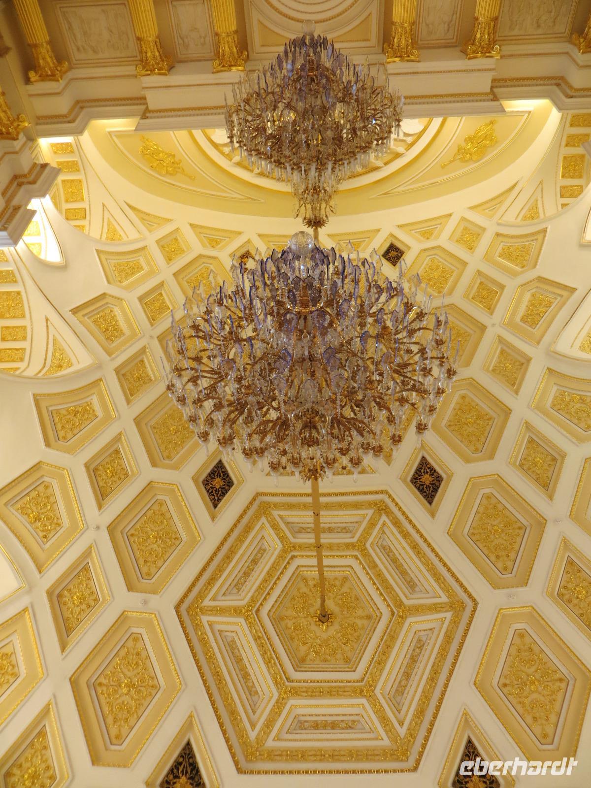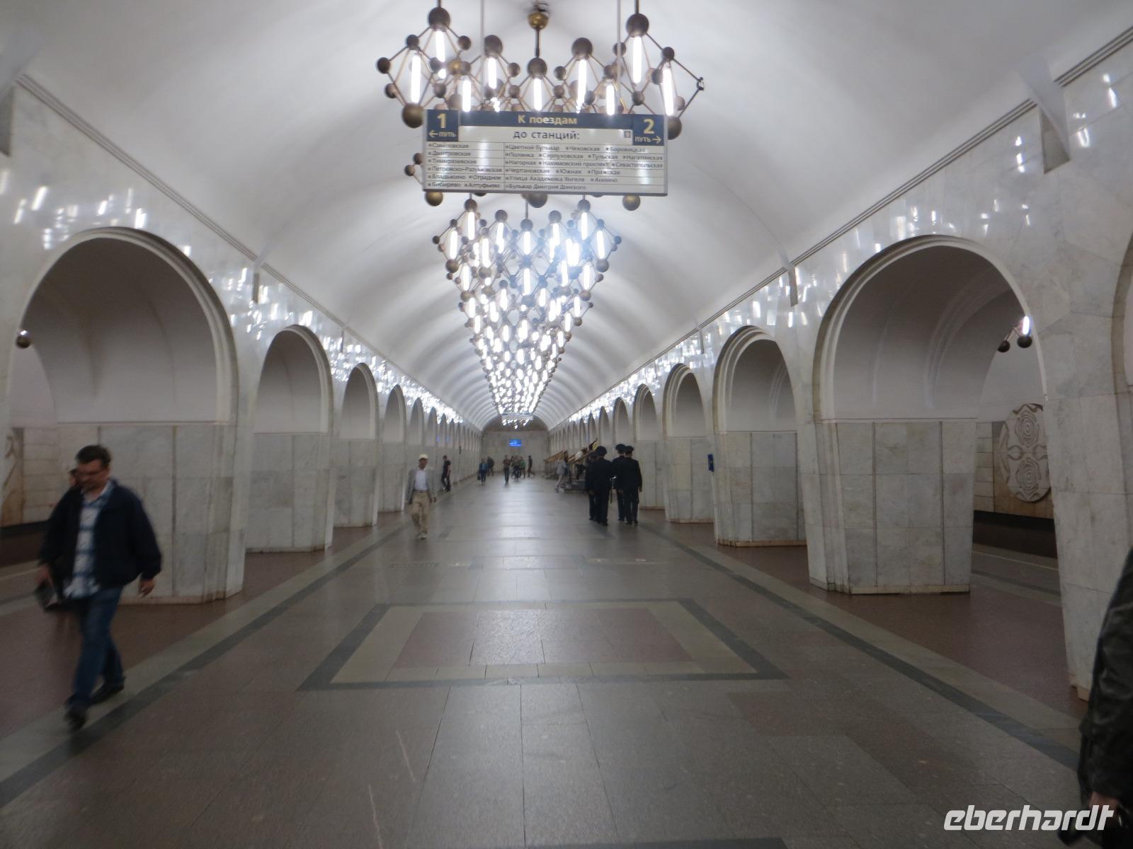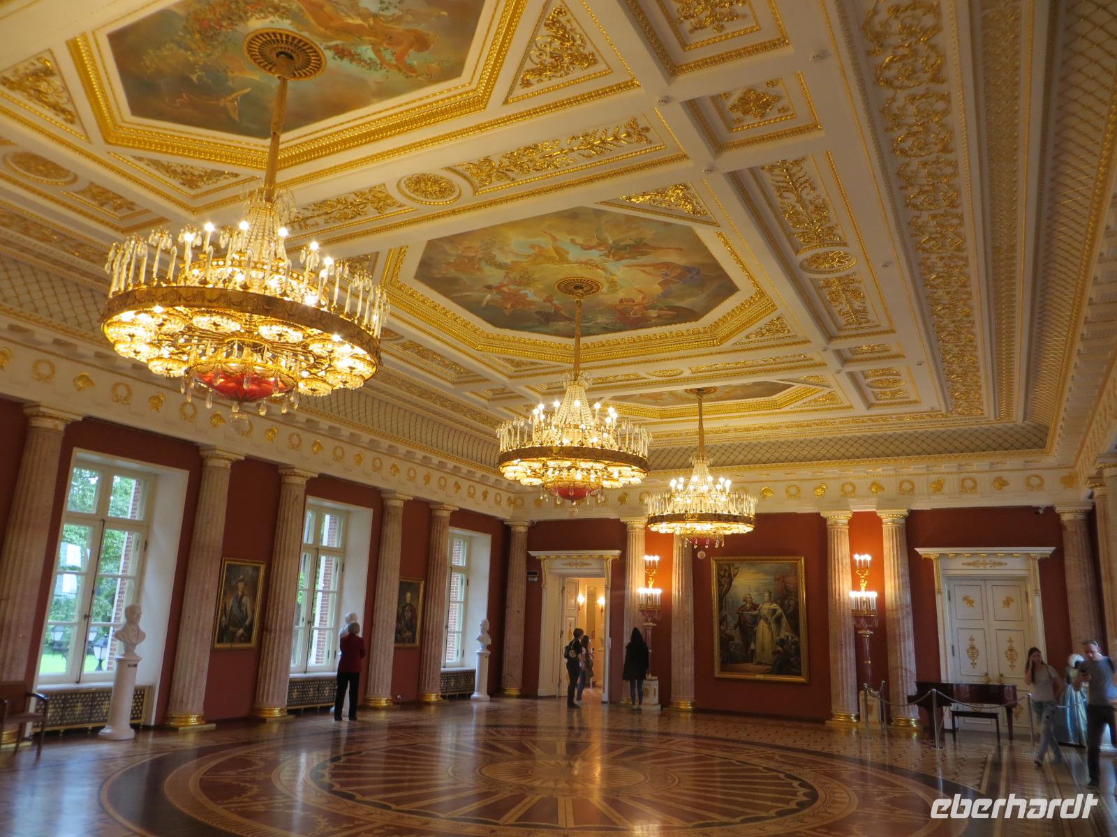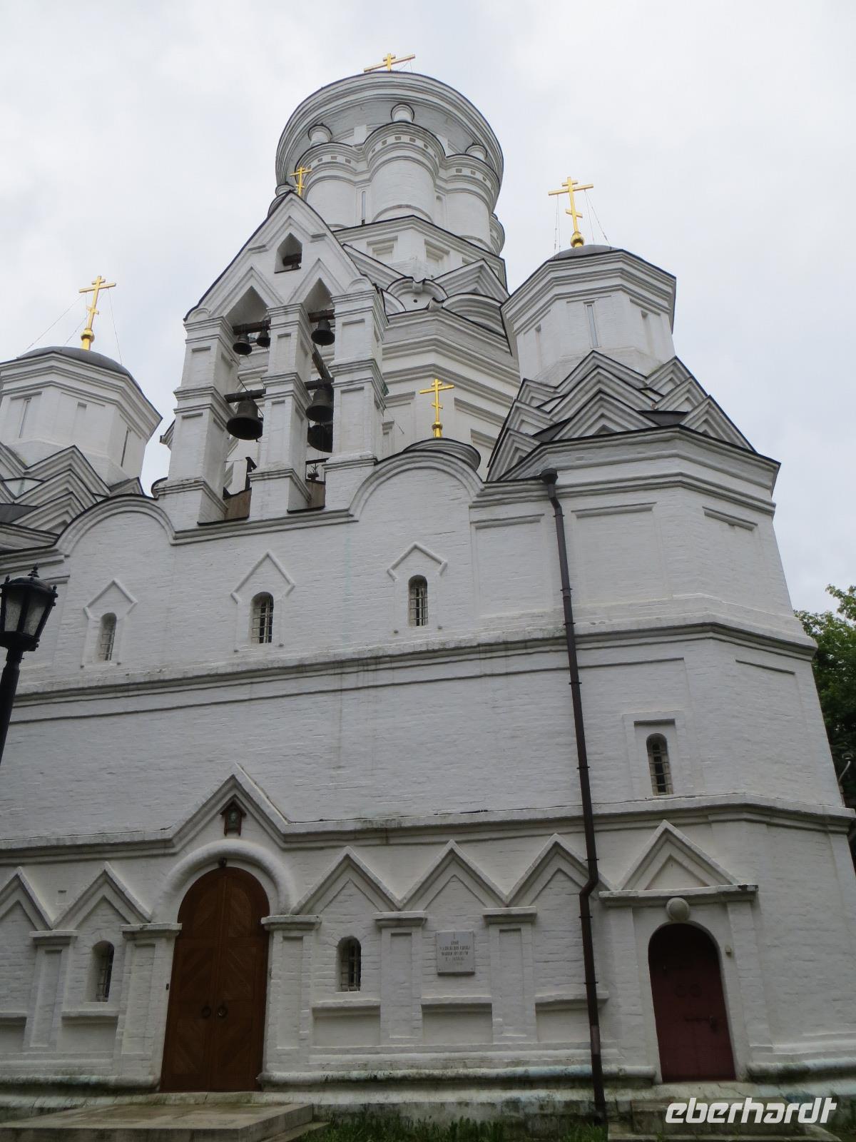 Vom Hotel benötigt man am Sonntag nur eine halbe Stunde, um mit dem Bus nach Kolomenskoje zu gelangen. Im alten Museumsteil, inmitten von Eichenbäumen befinden sich Relikte der Zarenanwesens aus dem 17. Jahrhundert, darunter eine der bedeutendsten weißen Zeltdachkirchen Russlands, die Christi-Himmelfahrt-Kirche. Inmitten von Wiesen leuchten die Gebäude selbst bei grauem Himmel. Wir bummelten hinunter zur Moskwa und hinauf zur Kirche Johannes des Täufers. In weitem Bogen erreichten wir - nicht geplant - den nachgebauten Zarenpalast von Alexej I., des Zarenvaters von Peter I.: es mutet ein wenig wie Disneyland an. Zur frühen Nachmittagszeit erreichten wir in den Stadtteil Zaryzino, also den Ort der Zarin. In grüner Landschaft zwischen Seen lies Katarina II. ein Schloss errichten, das sie selbst nie bewohnte. Sie selbst und deren Nachfolger rissen es teilweise ab, ließen es neu erbauen, dann kam einer der russisch-osmanischen Kriege und das Geld war alle ... jedenfalls wurde es nie fertig und war noch 2004 von zahlreichen Birken begrünt. Ab 2006 erfolgte der Wiederaufbau der Schlossanlagen, sowie eine großzügige Gestaltung des Parks. Zunächst besuchten wir das Brothaus, in dem sich gerade eine argentinische Organiostin für ein Konzert vorbereite. Im Schloss vermitteln zwei prächtige Säle und zahlreiche Ausstellungsräume ein Bild vom zaristischen Leben im 18. und 19. Jahrhundert.