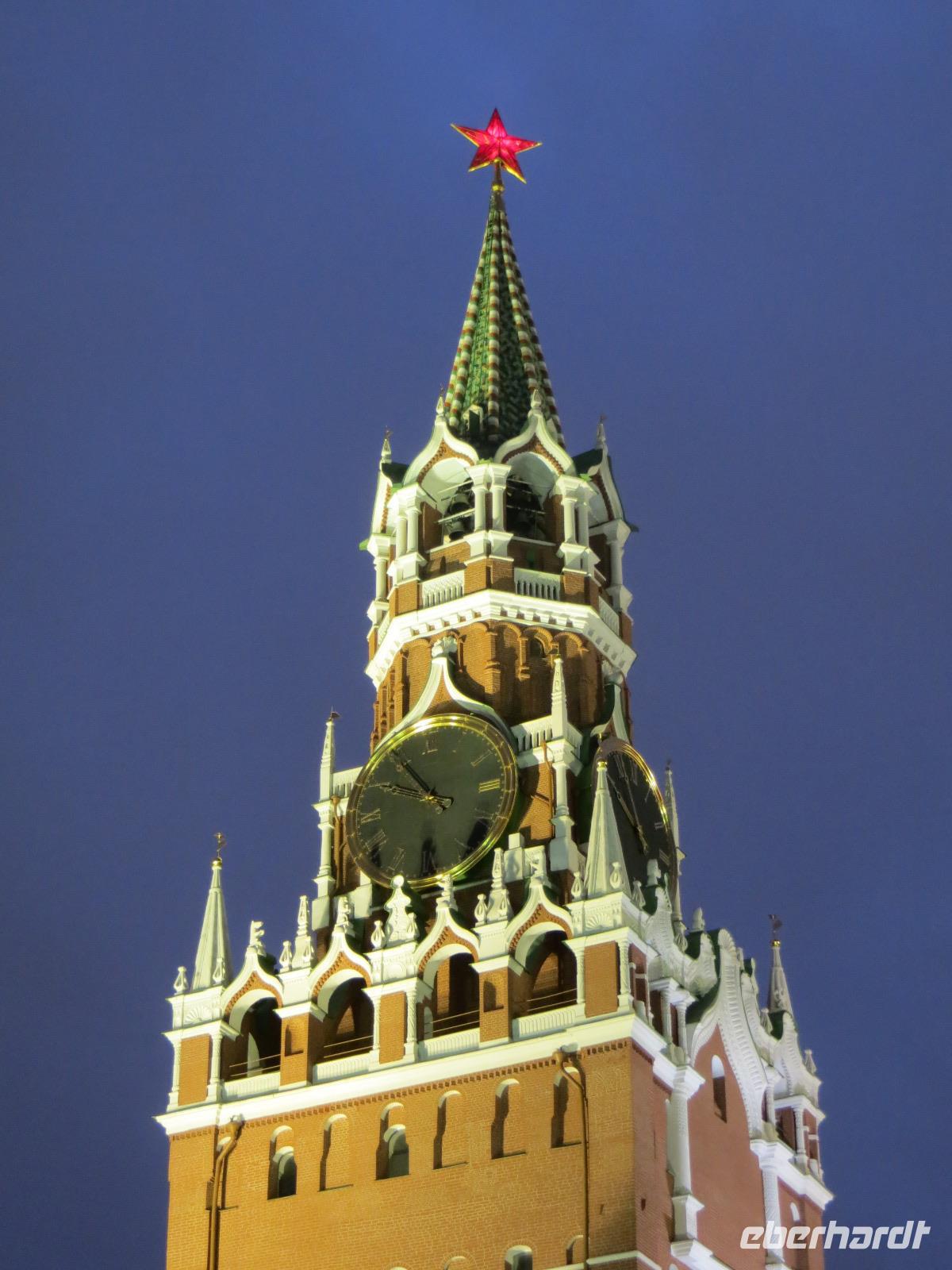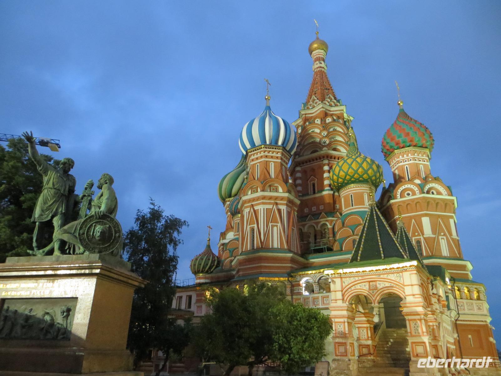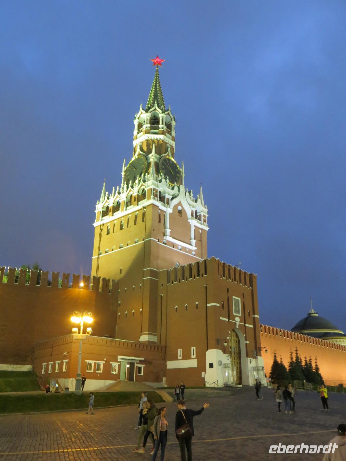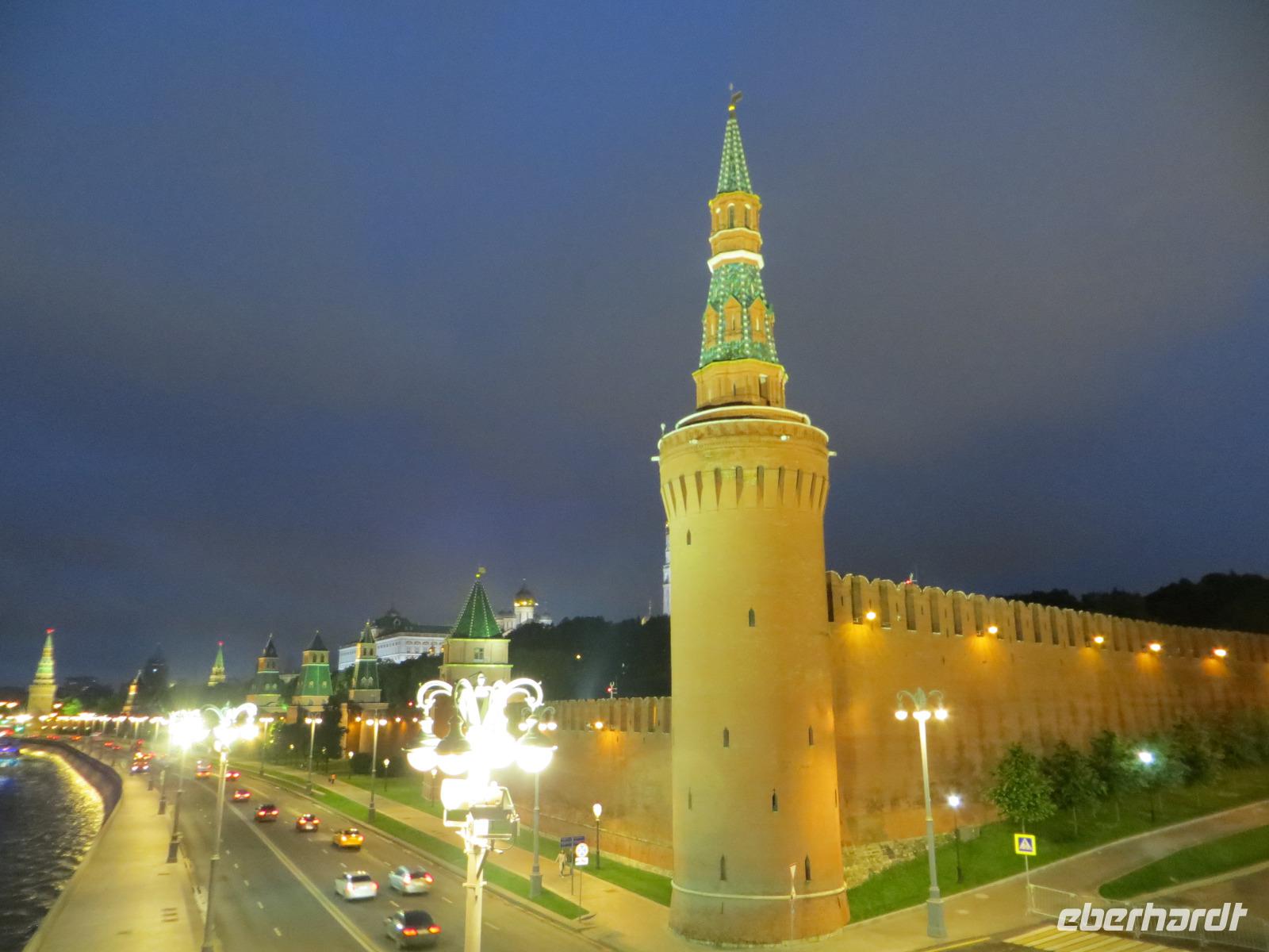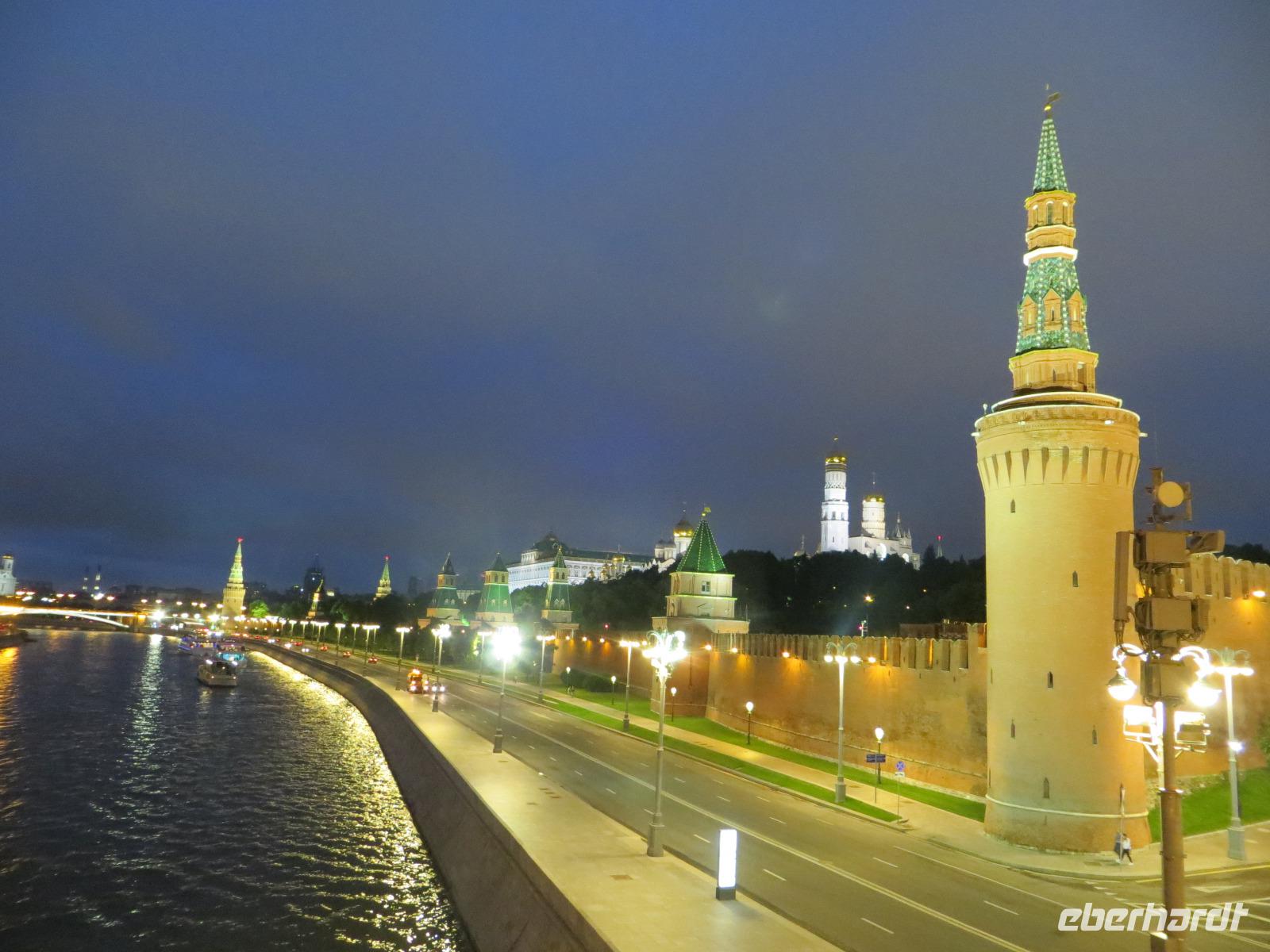 Das Abendessen im Hotel zoogen wir ein wenig vor, um einen langen Abend für die Metrofahrt und einen Besuch auf dem Roten Platz und im GUM zu haben. Das Wetter blieb trocken und so bummelten wir ein von der Basilius-Kathedrale ein Stück weiter bis auf eine Moskaubrücke: Blick auf die Kreml-Moskwa-Seite - die Kuppeln strahlten im Scheinwerferlicht, durch schüttere Wolken leuchtete der Halbmond.