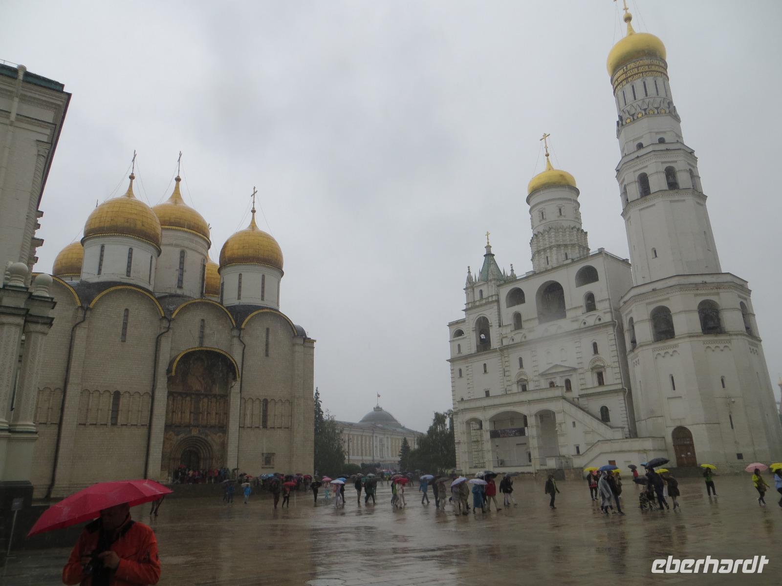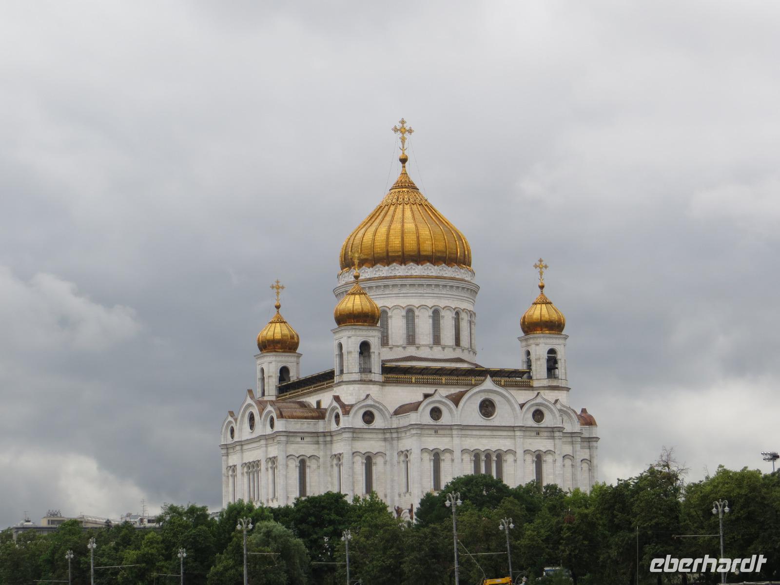Die Fahrt vom Hotel Sunflower zum Kreml nutzten wir bereits zu einigen Stadtrundfahrteindrücken. Aus den randstätischen Neubaugebieten kommend erreichten wir den Stadtteil Samoskworetschije. Der Stadtteil - frei übersetzt: auf der gegenüber dem Kreml / jenseits der Moskwa liegenden Seite - ist in den vergangenen Jahren aus einem tiefen Schlaf erwacht und hat mit der Pjatnizkaja heute sogar einender Bummelmeilen der Stadt. Am Moskwa-Kanal und dem Haus an der Moskwa vorbei erreichten wir mit dem Bus die Westseite des Kremls, seit einigen Wochen mit einem Denkmal für Wladimir (dem Heiligen!). Schon seit acht Uhr hatte uns Regen begleitet, nun aber entwickelte er sich zum Starkregen und war hässlich nasser Begleiter unseres Kreml-Besuchs. Bereits nach kurzem waren wir so durchnässt, dass alle Besichtigungen eher ein Mühsal waren. Durchnässt und ein wenig verfroren zitterten wir später im Bus und konnten kaum wahrnehmen, dass unser Fahrer eine unübliche, aber sehr interessante Strecke Richtung Gorki-Park fuhr. Im Gorkipark, der in den 90er Jahren eher in Verruf geraten war, konnten wir kaum die Rekonstruktion des Einganges und die wunderschönen Blumenflächen bestaunen. Auf dem Schiff der Radisson Cruise genossen wir dann ein durchaus gutes Mittagessen und ein wenig kam nun die Sonne gar heraus. Vom Gorki-Park fuhren wir an den innerstädtischen Bauten vorbei bis zur östlichen Teilung zwischen Moskwa und Moskwa-Lateral-Kanal. Auf der Rückfahrt wurden wir der tausenden Pilger am Frunse-Ufer gewahr, die Einlass in die Christi-Erlöser-Kirche begehrten.