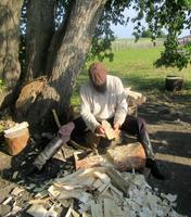 Alle Kirchen und Gebäude von Kischl sind ohne Fundament auf dicken Balken gebaut, so sind sie vor Feuchtigkeit geschützt. Auf dem Rückweg zum Schiff treffen wir noch auf einen Arbeiter der mit der Axt, dem Hauptarbeitsmittel hier aus Espenholz Schindeln fertigt.