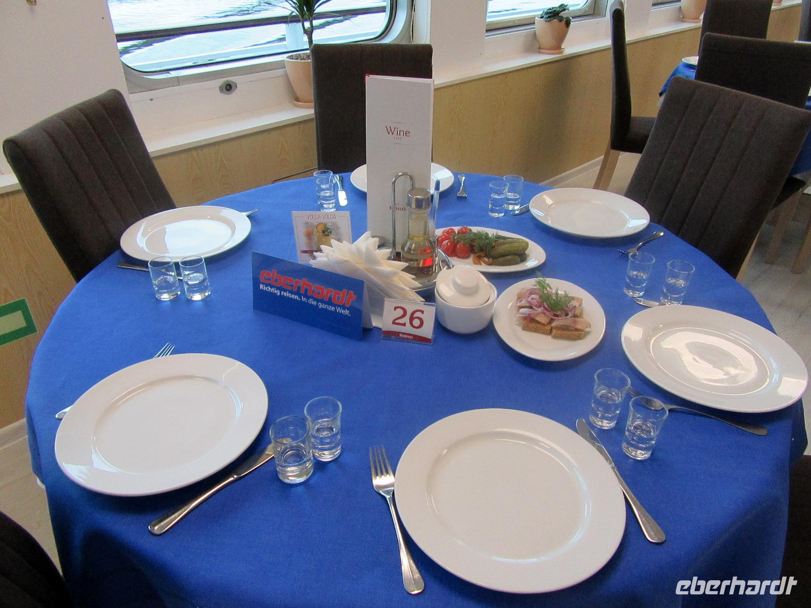 An Bord angekommen, können wir zügig unsere Kabinen beziehen und schon wartet das Restaurant Wolga mit einem ersten Abendessen auf uns.