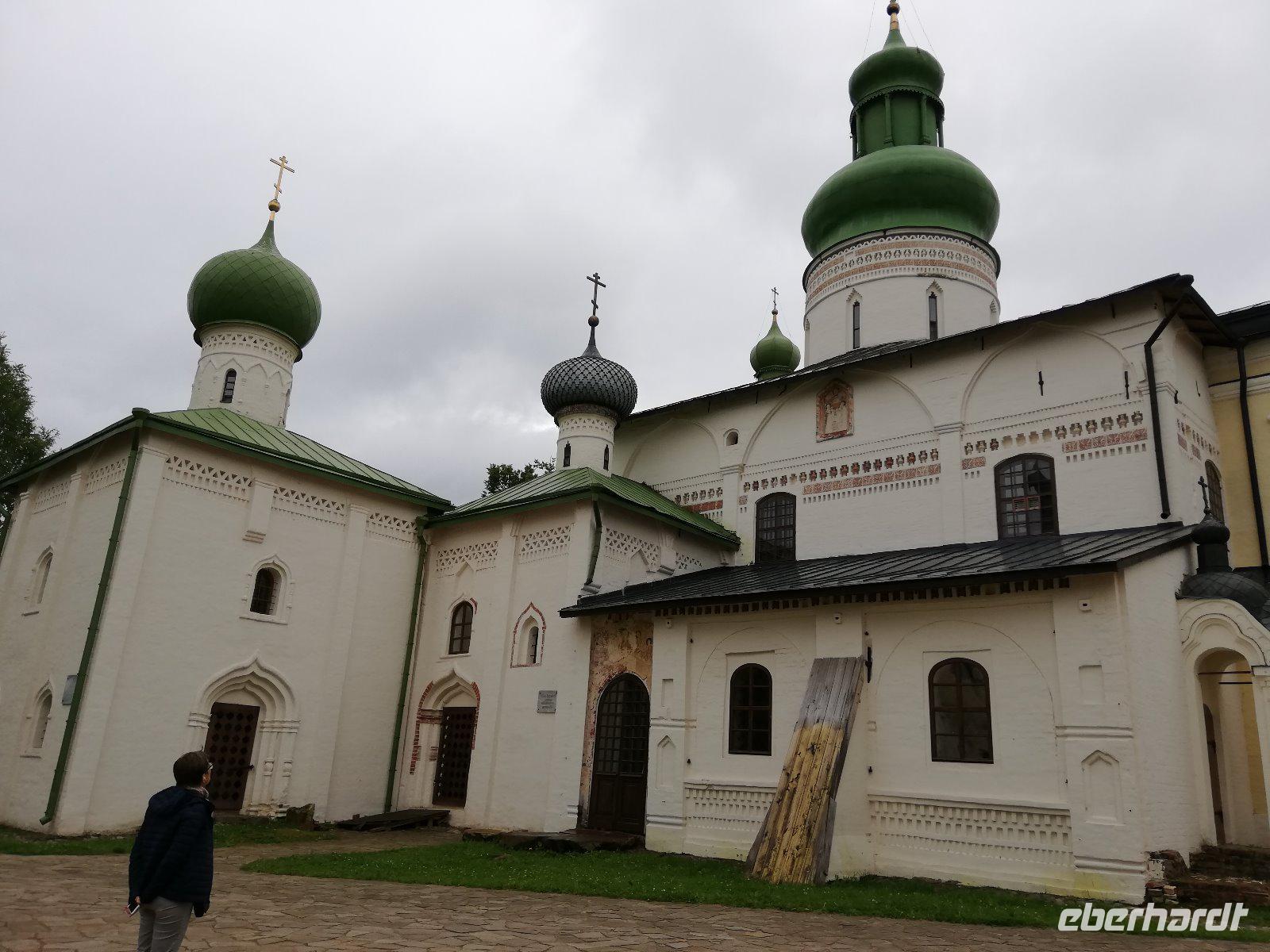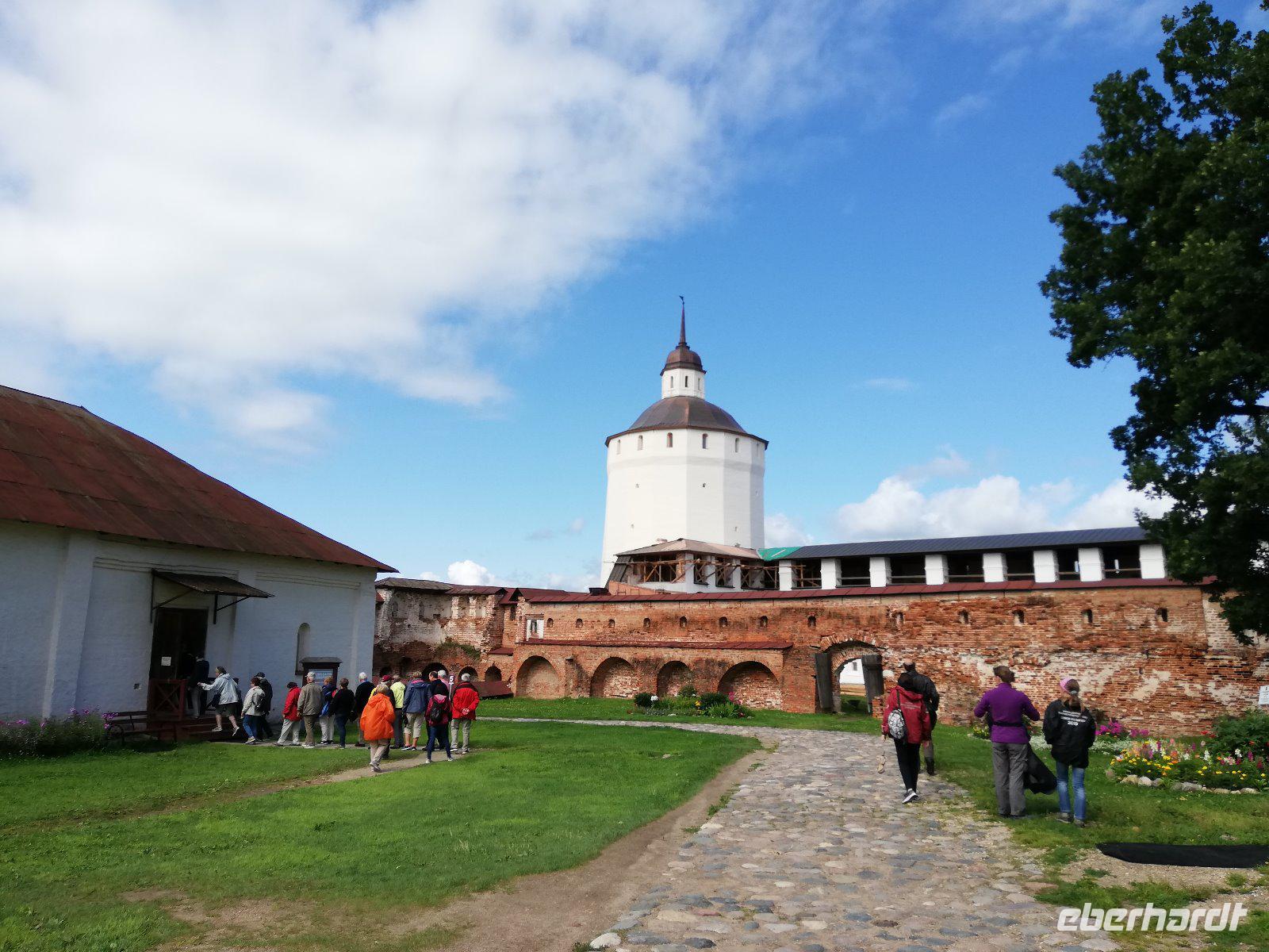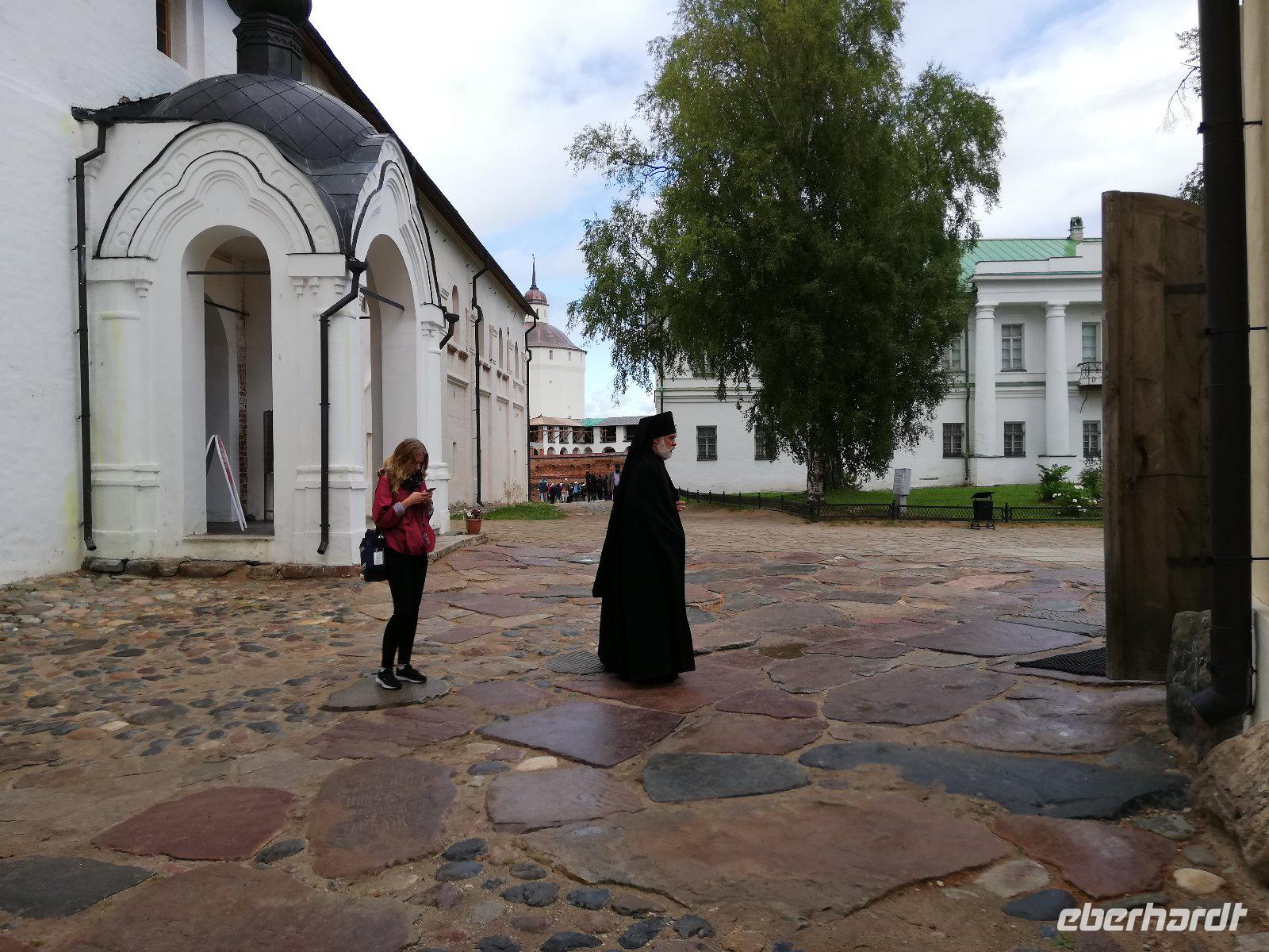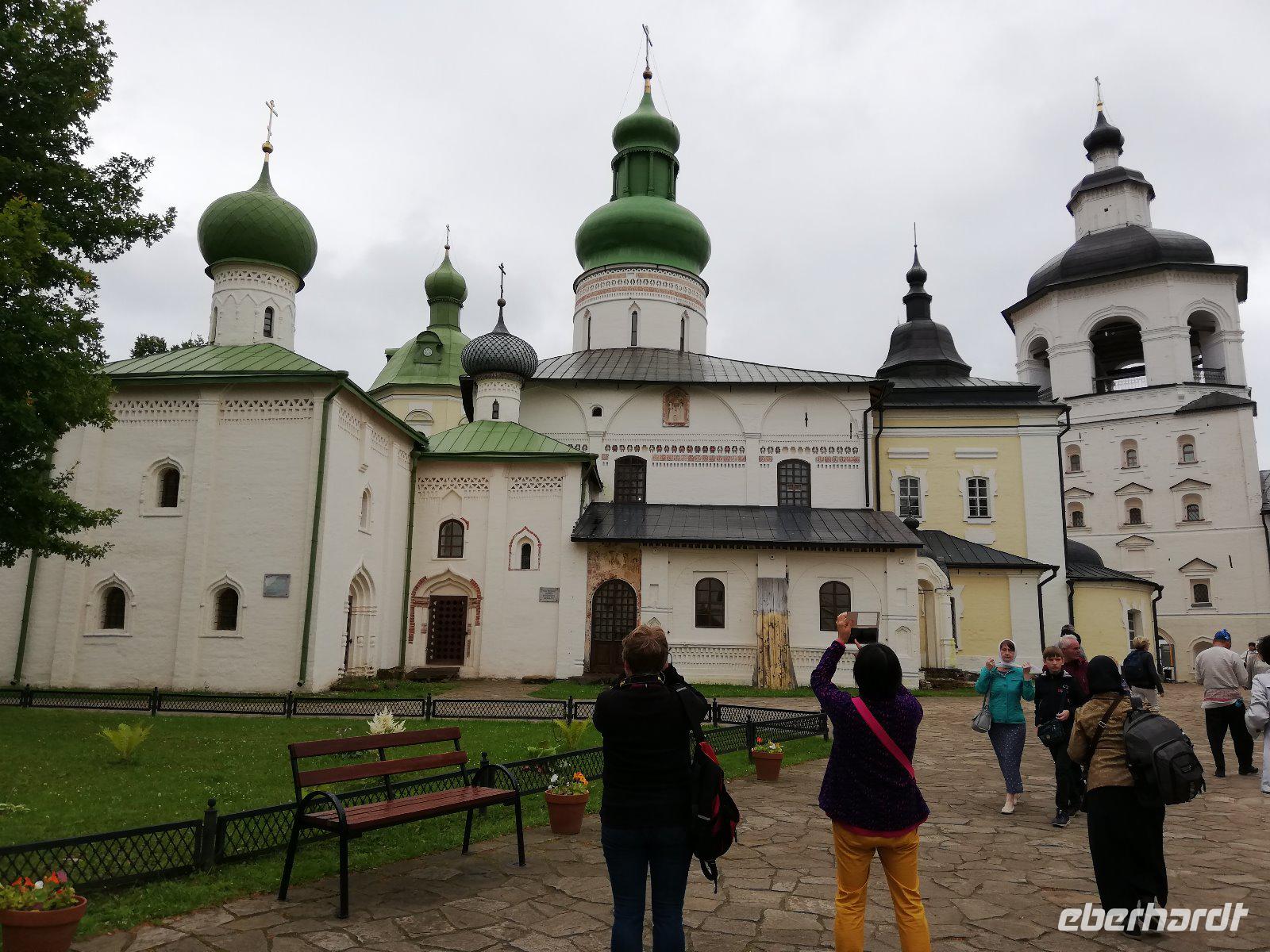 Nach dieser Stunde begrüßten wir Ludmilla, die mit uns in das 7 km entfernte Kloster bei Gorizy fuhr und uns durch das Kirillo-Beloserski-Kloster führte. Beeindruckend ist dieses Kloster, das 1397 gegründet wurde. Als Gründer zählt der Mönch Kirill, der auf einen Berg ein göttlichen Zeichen erhalten hat, wohin er ein Kloster bauen sollte. In den folgenden Jahrhunderten wurde das Kloster erweitert und war für seine Ikonenmalerei aber auch Stickereien bekannt. 1924 wurde das Kloster in ein Museum umgewandelt und seit 1998 wird das Kloster wieder von Mönchen bewohnt und schrittweise renoviert.