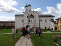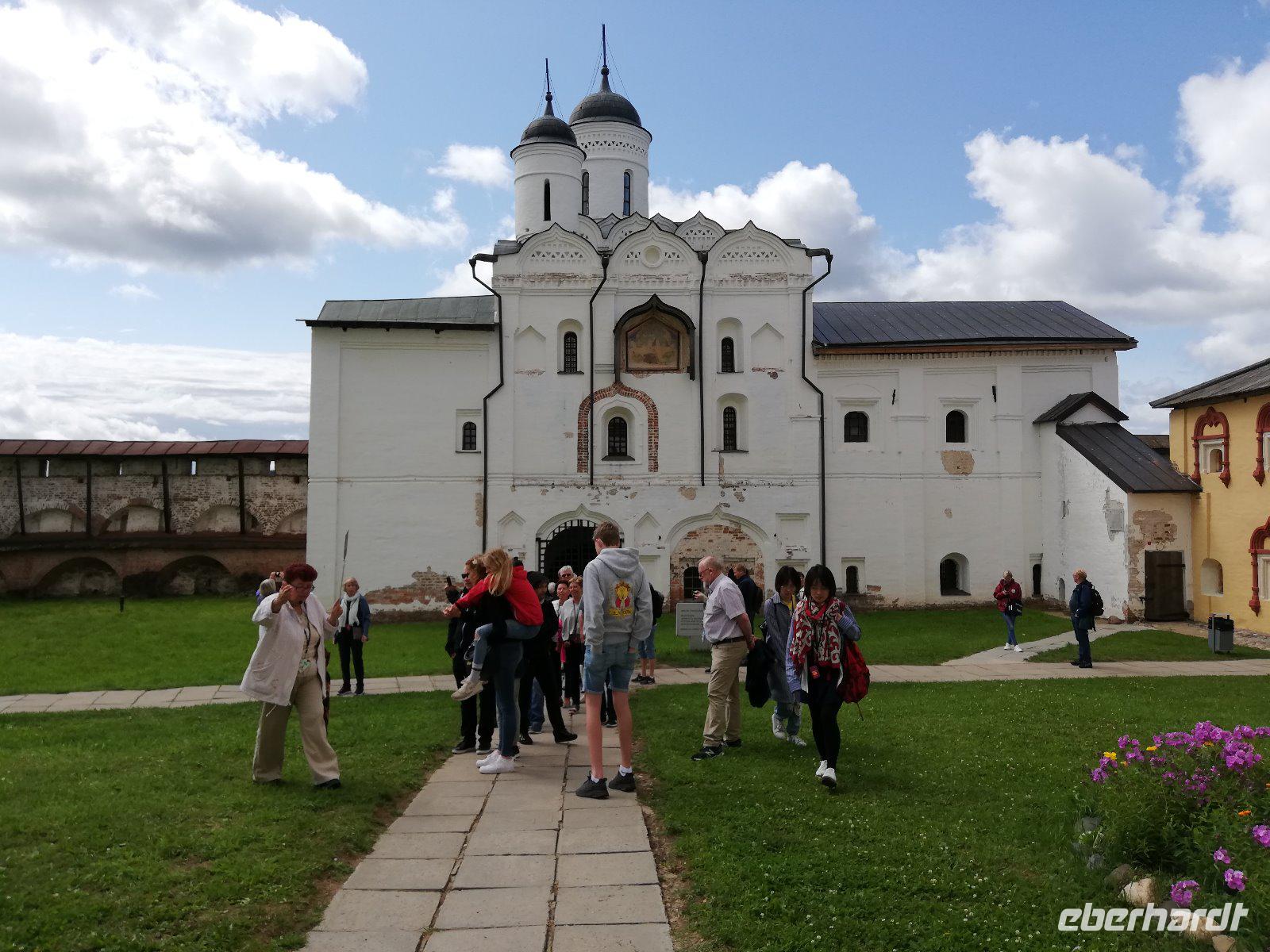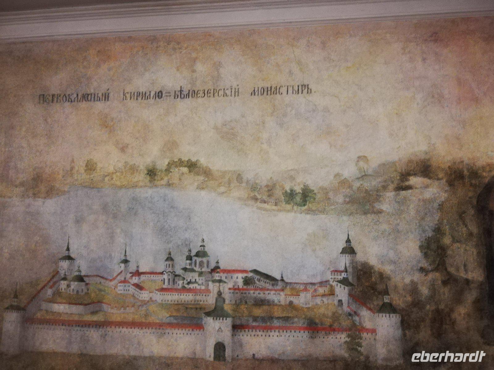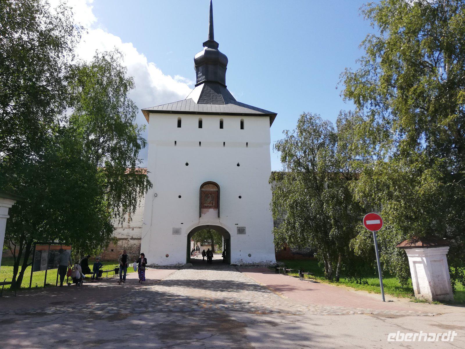 Nach dieser Stunde begrüßten wir Ludmilla, die mit uns in das 7 km entfernte Kloster bei Gorizy fuhr und uns durch das Kirillo-Beloserski-Kloster führte. Beeindruckend ist dieses Kloster, das 1397 gegründet wurde. Als Gründer zählt der Mönch Kirill, der auf einen Berg ein göttlichen Zeichen erhalten hat, wohin er ein Kloster bauen sollte. In den folgenden Jahrhunderten wurde das Kloster erweitert und war für seine Ikonenmalerei aber auch Stickereien bekannt. 1924 wurde das Kloster in ein Museum umgewandelt und seit 1998 wird das Kloster wieder von Mönchen bewohnt und schrittweise renoviert.