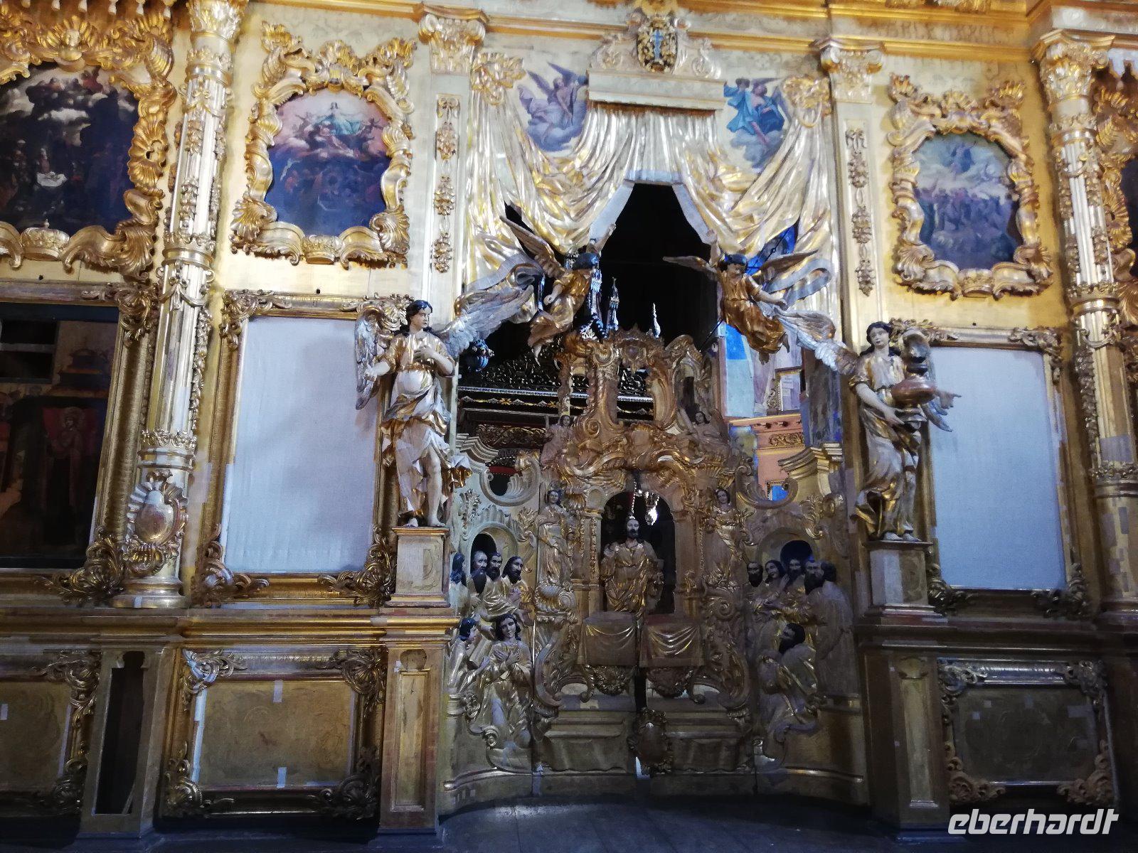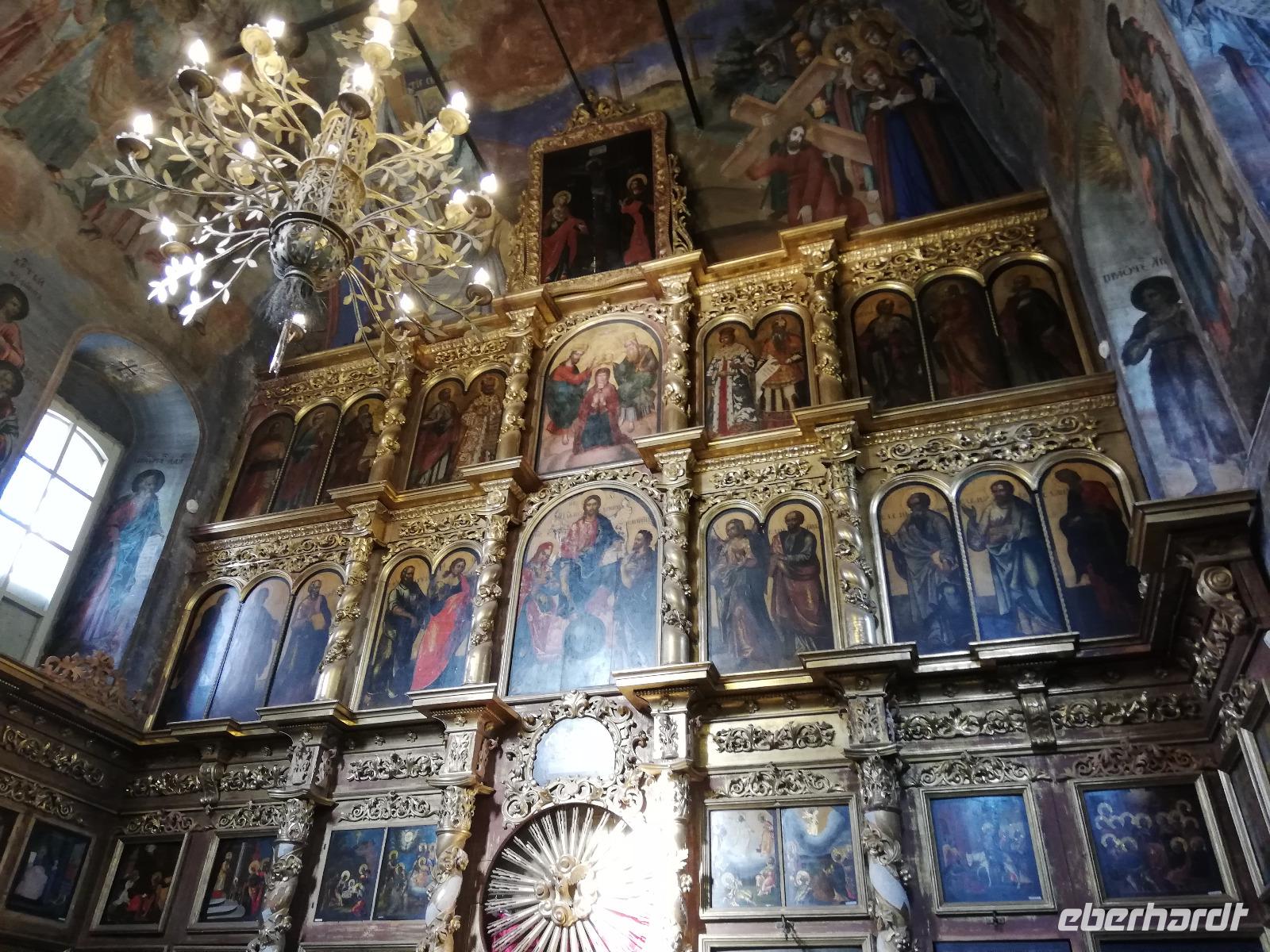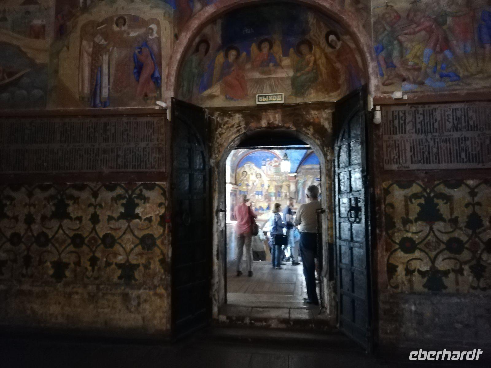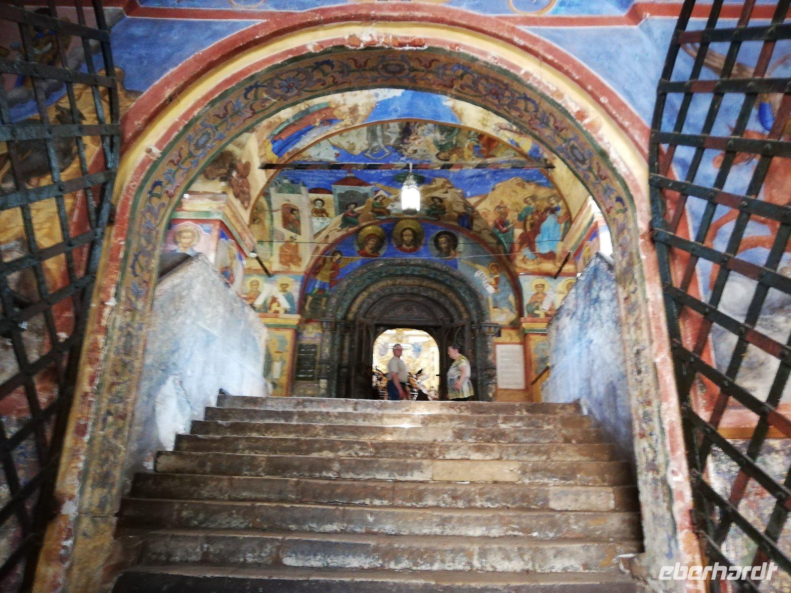 Nach dieser Stunde begrüßten wir Ludmilla, die mit uns in das 7 km entfernte Kloster bei Gorizy fuhr und uns durch das Kirillo-Beloserski-Kloster führte. Beeindruckend ist dieses Kloster, das 1397 gegründet wurde. Als Gründer zählt der Mönch Kirill, der auf einen Berg ein göttlichen Zeichen erhalten hat, wohin er ein Kloster bauen sollte. In den folgenden Jahrhunderten wurde das Kloster erweitert und war für seine Ikonenmalerei aber auch Stickereien bekannt. 1924 wurde das Kloster in ein Museum umgewandelt und seit 1998 wird das Kloster wieder von Mönchen bewohnt und schrittweise renoviert.