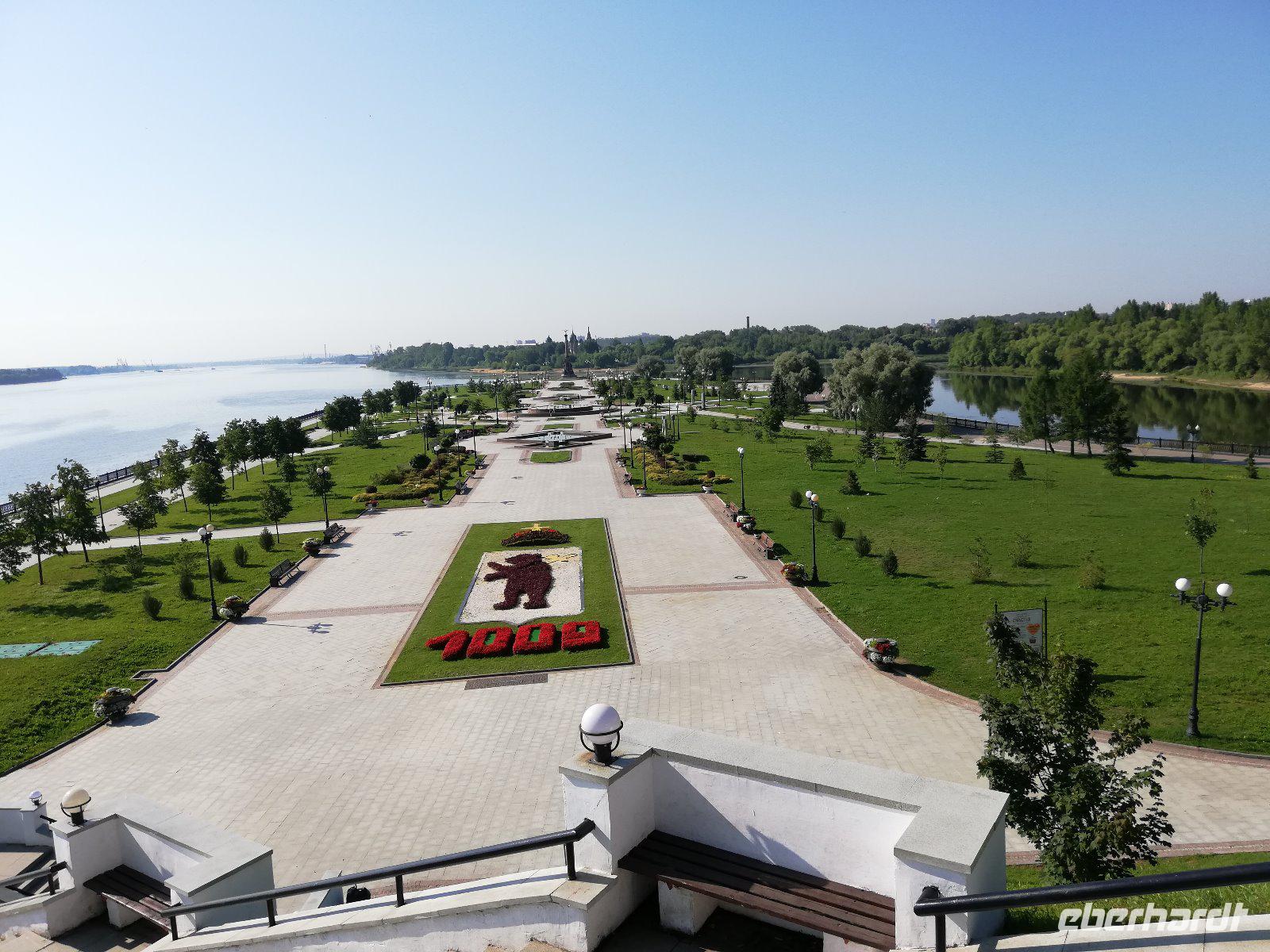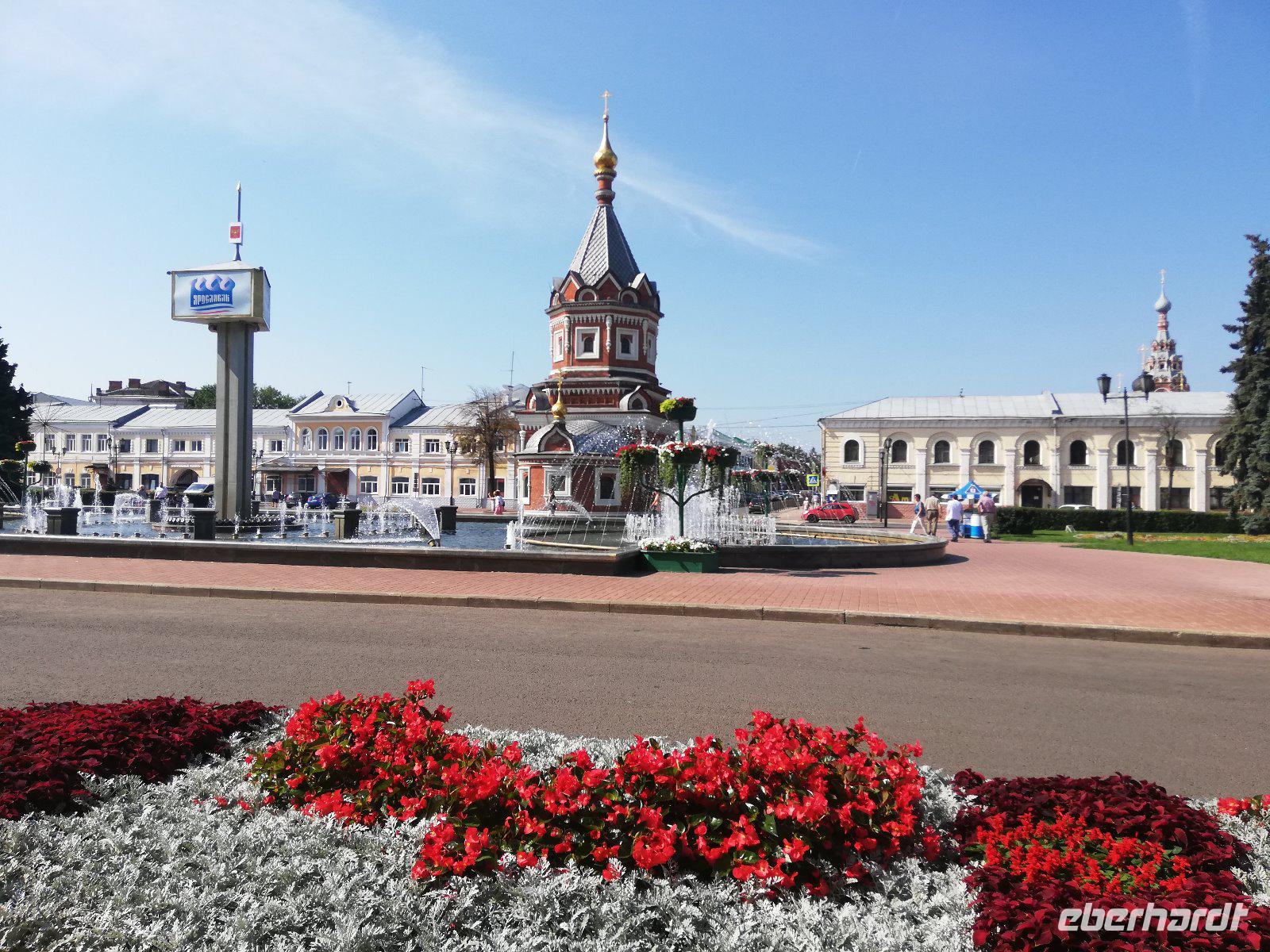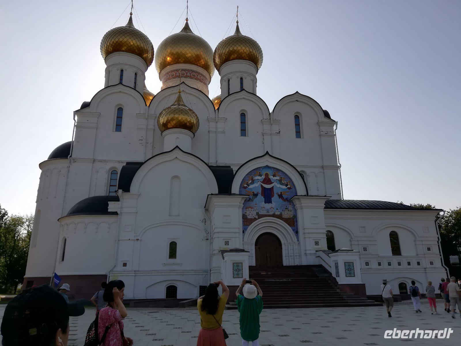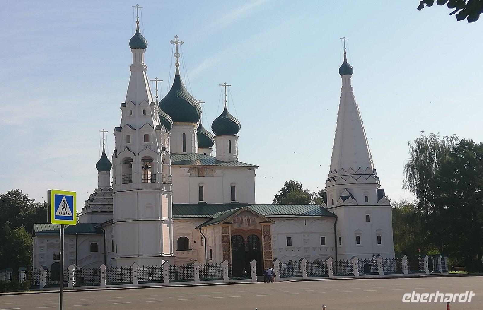 Zeitig beginnen wir unsere Stadtführung. Bereits 08.00 wartet unser Bus mit dem örtl. Reiseleiter auf uns und wir fahren in das Zentrum der rund 600 Tausend Einwohnern. Auf der Fahrt erfahren wir von der Geschichte der Stadt, die reich an Sagen und historischen Ereignissen ist. Sie beginnt mit einer slawischen Ansiedlung Medweshij Ugol (Bärenwinkel) die im 9.und 10. Jahrhundert an diesem Ort lag. Zur damaligen Zeit war in dieser Gegend der Kult des Heiligen Tieres (Bären) weit verbreitet. Fürst Jaroslawl der Weise unterwarf 1010 die Bewohner dieser Ansiedlung und gab ihn seinen Namen. Die Legende besagt, dass die Einwohner dieser Ansiedlung einen Bären auf den Fürsten hetzten , der diesen besiegte und mit einer Axt erschlagen konnte. Heute sehen wir auf dem Stadtwappen den Bären mit einer Streitaxt. In der Stadt halten wie am ewigen Feuer Memorial. Im Hintergrund sehen wir bereits die 2004 wieder erbaute Maria-Entschlafens Kathedrale.Die wir nach einem kurzen Spaziergang besuchen. Nach dem Besuch der Kirche laufen wir entlang der Wolgapromenade und haben einen schönen Blick auf den Strelkapark und der Mündung des Flusses Kotorosl in die Wolga. Anschließend besuchen wir die Nikolauskirche bevor wir zum ehemaligen Palast des Gouverneurs kommen. Olga, die Tochter des Gouverneurs ist zufällig zu Hause und führt uns durch das Haus. Sie erklärt uns einige Gemälde, überrascht uns auch mit einem Blumenstrauß und der Erklärung zur Bedeutung der einzelnen Blüten. Ein Jeder von uns hatte am Ende der Erläuterung eine Blume in der Hand. Sehr unterhaltsam.Anschließend führt Sie uns noch einmal in den Ballsaal und es ertönt Musik. Ein Trio spielt auf und wir sehen die unterschiedlichen Tänze. Beginnend mit einem Walzer hat ein mancher von uns Lust zu tanzen. Diese Erwartung erfüllt sich. Ob Frau oder Mann, es durfte getanzt werden und die Freude darüber stand allen Tänzern im Gesicht geschrieben. Nach einer herzlichen Verabschiedung steigen wir wieder in unseren Bus und fahren zur Prophet-Eliga Kirche, die durch ihre Innenbemalung bekannt ist. Wir haben noch etwas Freizeit und während es einige in die Markthalle zieht, besuchen andere die Prophet-Eliga Kirche.