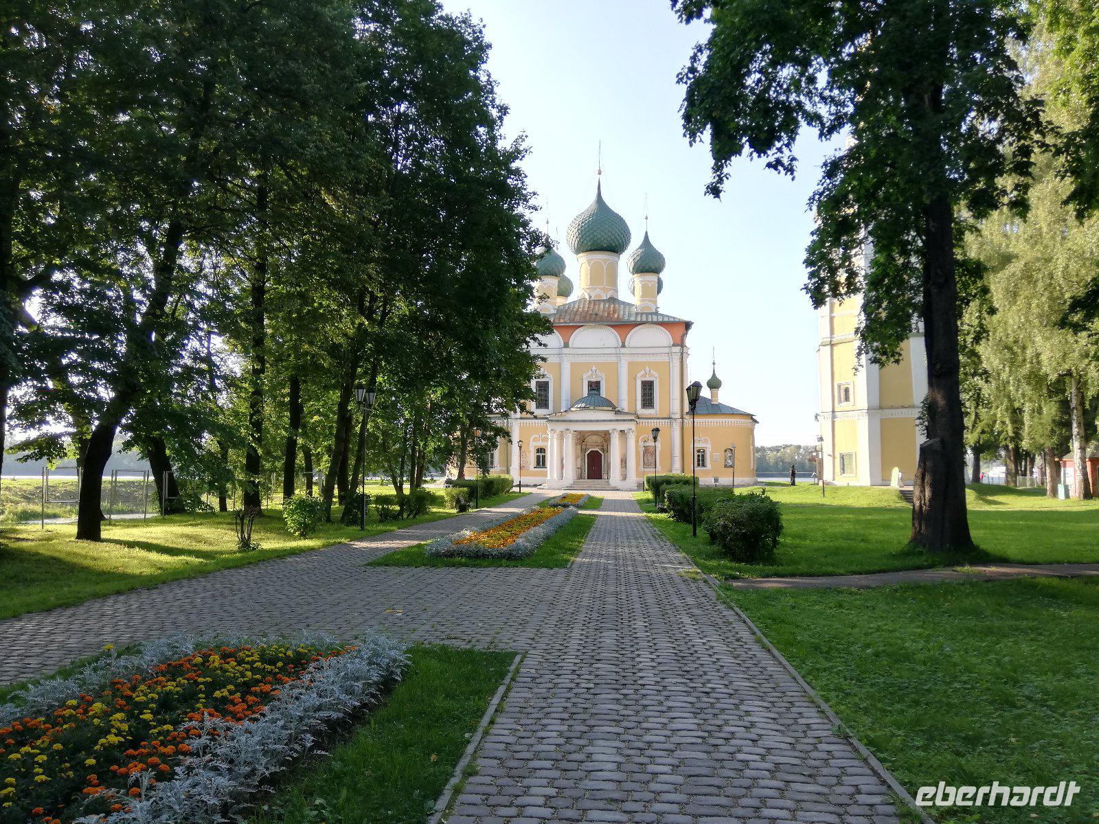 Vor dem Frühstück kommt der Frühsport . Nicht alle sind dabei aber die unterschiedlichsten Nationen die auf dem Schiff sind und so macht es Spaß jedes Gelenk zu bewegen. Vielen Dank an die Bordbegleiterin Inna, die uns motiviert. Danach geht es zum Frühstück. In Uglitsch werden wir erst heute Nachmittag ankommen bis dahin wird die Zeit genutzt. Heute wird uns das Kunstgewerbe Russlands vorgestellt. An erster Stelle steht natürlich die Matroschka. Andere sind beim Russischunterricht und auch Russische Lieder zu lernen ist möglich. Dabei fällt auf welch gute Sänger wir an Bord haben. Es macht einfach Spaß. Das Mittagessen gab es zwischendurch und gegen 16.30 Uhr kommen wir in Uglitsch an. Zwischenzeitlich sind wir bereits 200 km von Moskau entfernt und in einem Ort des Goldenen Rings angekommen.(Mit dem Goldenen Ring ist ein weitläufiges Gebiet nördlich von Moskau gemeint. Die altrussischen Städte geben einen Einblick in die Geschichte der Entstehung Russlands ) Uglisch wurde bereits 937 das erste Mal genannt und im 15. Jh. war diese Stadt ein bedeutendes Handelszentrum mit eigener Münze. Im 16.Jh. kamen nach demTode Iwans des Schrecklichen seine Frau Maria und sein Sohn Dmitri nach Uglitsch. Dort kam Dmitri 1591 unter ungeklärten Umständen ums Leben. An der Stelle, an der Dmitri starb, entstand die Demetrios-Kirche (Blutskirche). Das alles erfahren wir von unserer Stadtführerin, die uns vom Schiff abholte und mit uns durch die Stadt spazierte.