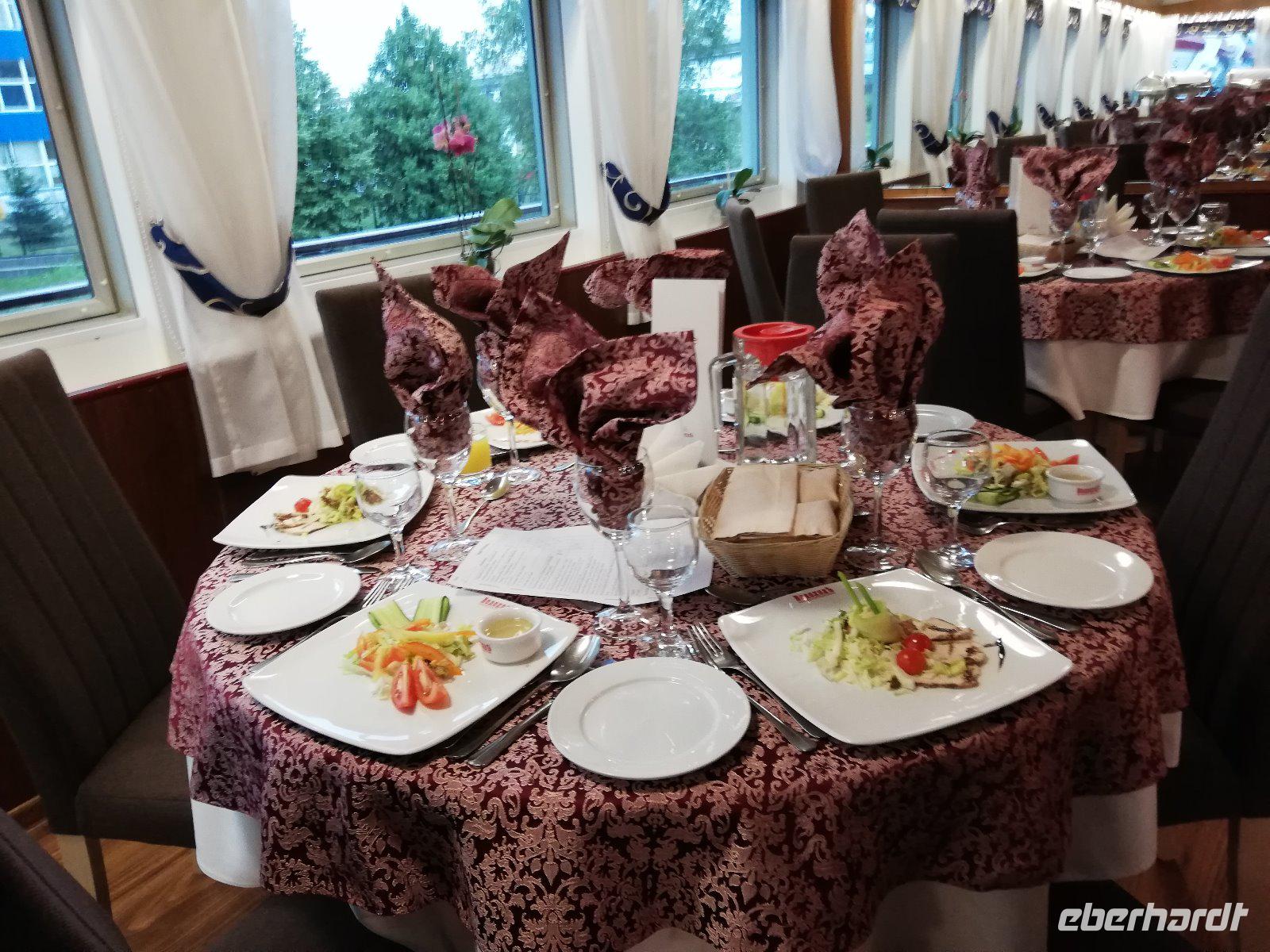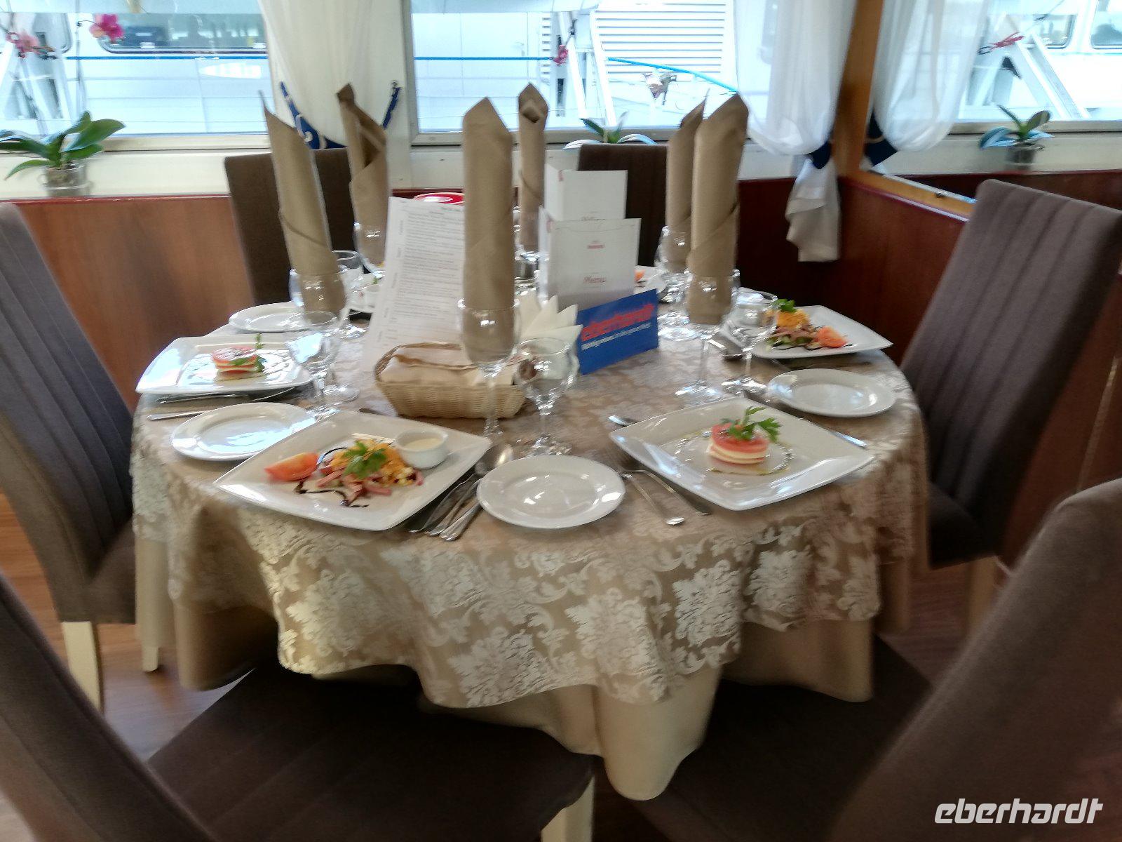 Gegen 19.00 Uhr sind wir wieder an Bord und freuen uns auf das Kapitänsabendessen mit Wladimir Kotin